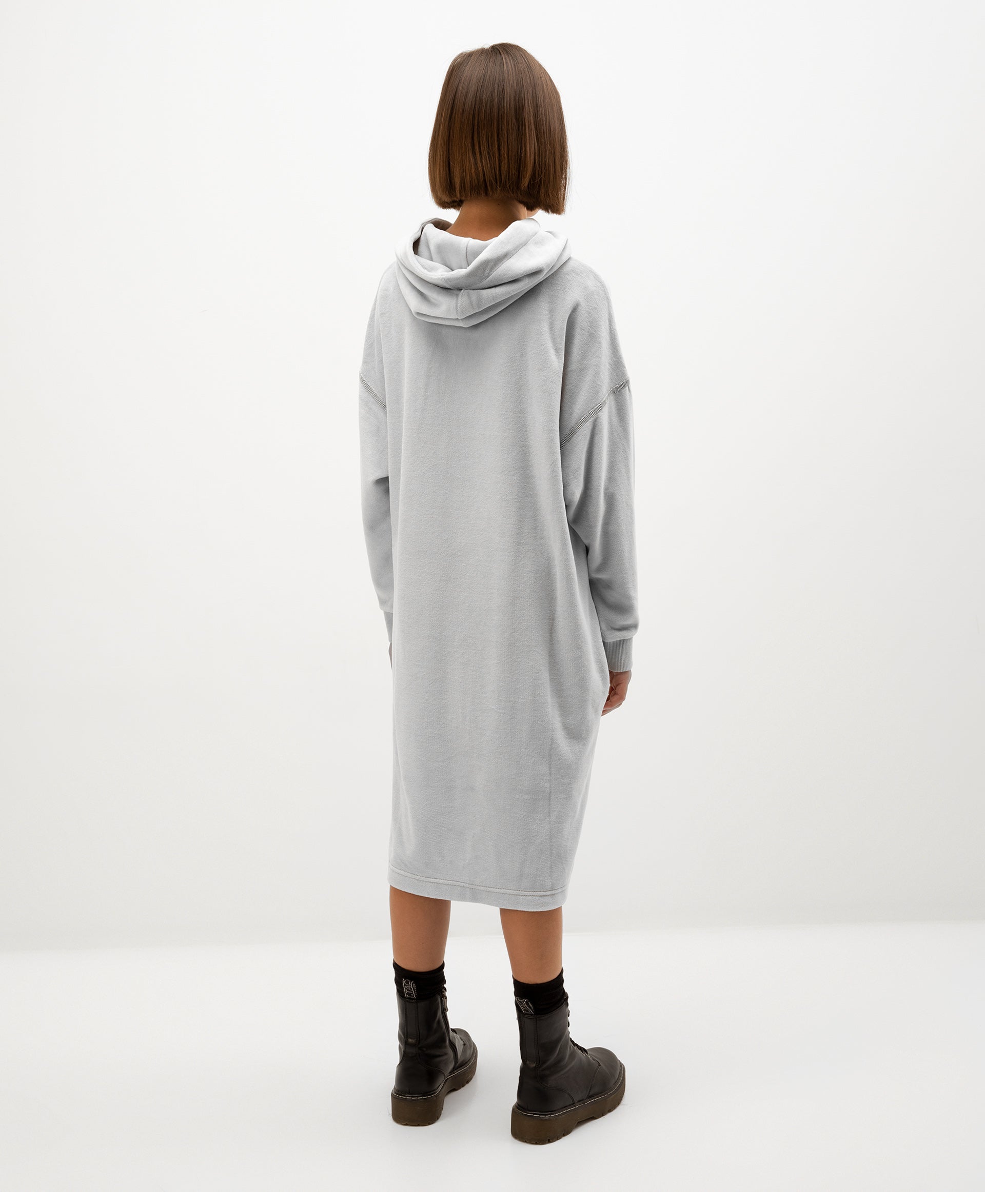 Сива рокля със силует овърсайз, изработена от велур. Мекият, еластичен и приятен на допир велур прави роклята изключително комфортна. Минималистичният дизайн допринася за стилна и лаконична визия. Джобовете в страничните шевове осигуряват удобство, а качулката с широки блестящи трикотажни връзки придава на роклята свободата на спортния стил. Използвани са и малки метални верижки като декорация.