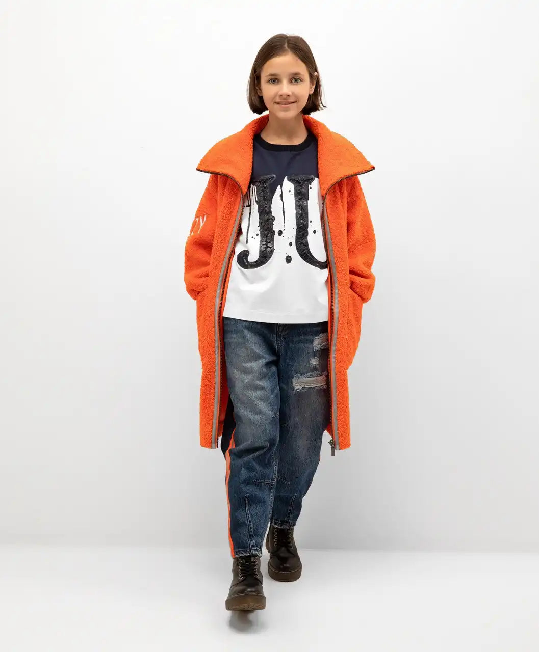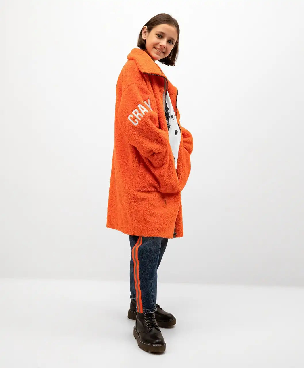 Paltonul subțire de toamnă din piele ecologică cu blană scurtă este cea mai bună alternativă la un palton clasic de toamnă, o geacă sau o jachetă subțire. Croiala voluminoasă modernă, culoarea intensă și buzunarele mari fac ca acest palton din piele să fie confortabil și ușor de purtat. Designul produsului include broderii și o margine reflectorizantă pe toată lungimea fermoarului. Produsul are o căptușeală subțire din material impermeabil, care facilitează alunecarea pe hainele din stratul inferior.
