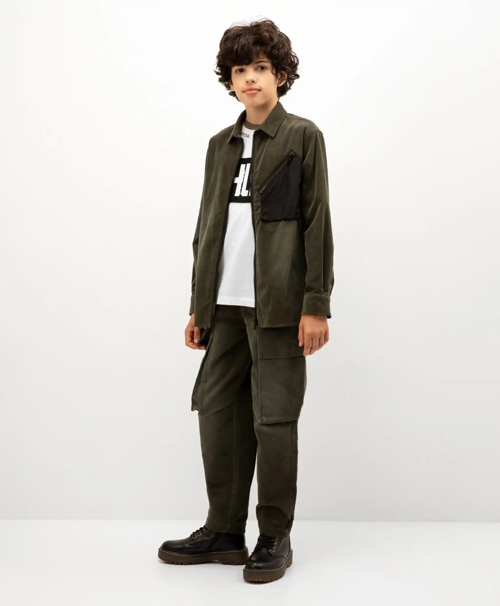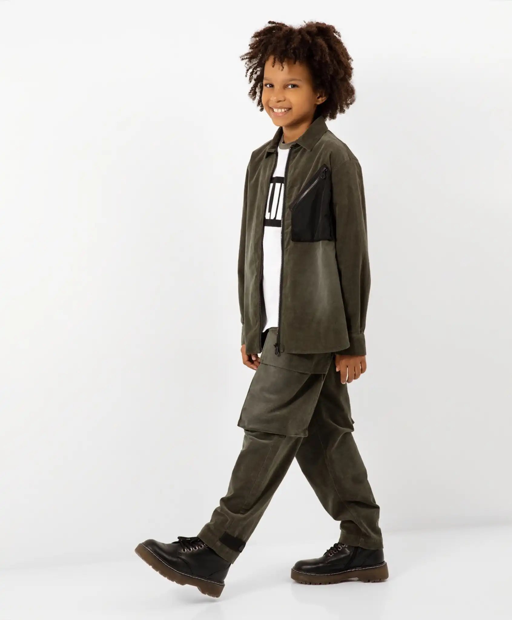 Pantalonii din microcatifea kaki sunt o opțiune stilată și confortabilă pentru sezonul rece. Materialul moale, rezistent la deformare, și detaliile mari, cum ar fi buzunarele cargo de pe cusăturile laterale, fac pantalonii perfecți atât pentru o ținută casual, cât și pentru una sportivă. Ușoara decolorare pe partea frontală și posterioară a genunchilor oferă pantalonilor un aspect vintage modern. Se potrivesc perfect cu orice jachetă sau palton, contribuind la crearea unui look adolescentin stilat și robust.