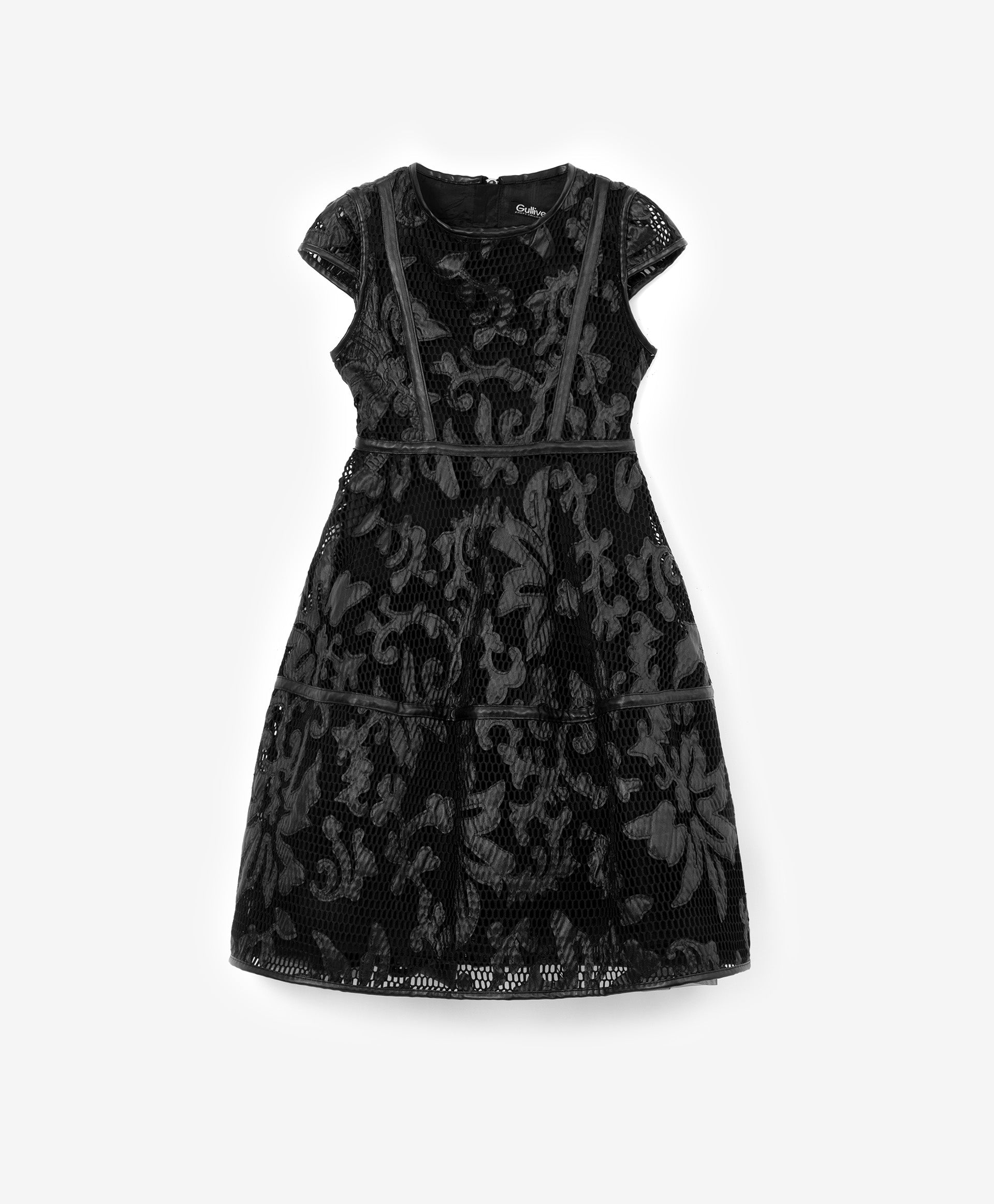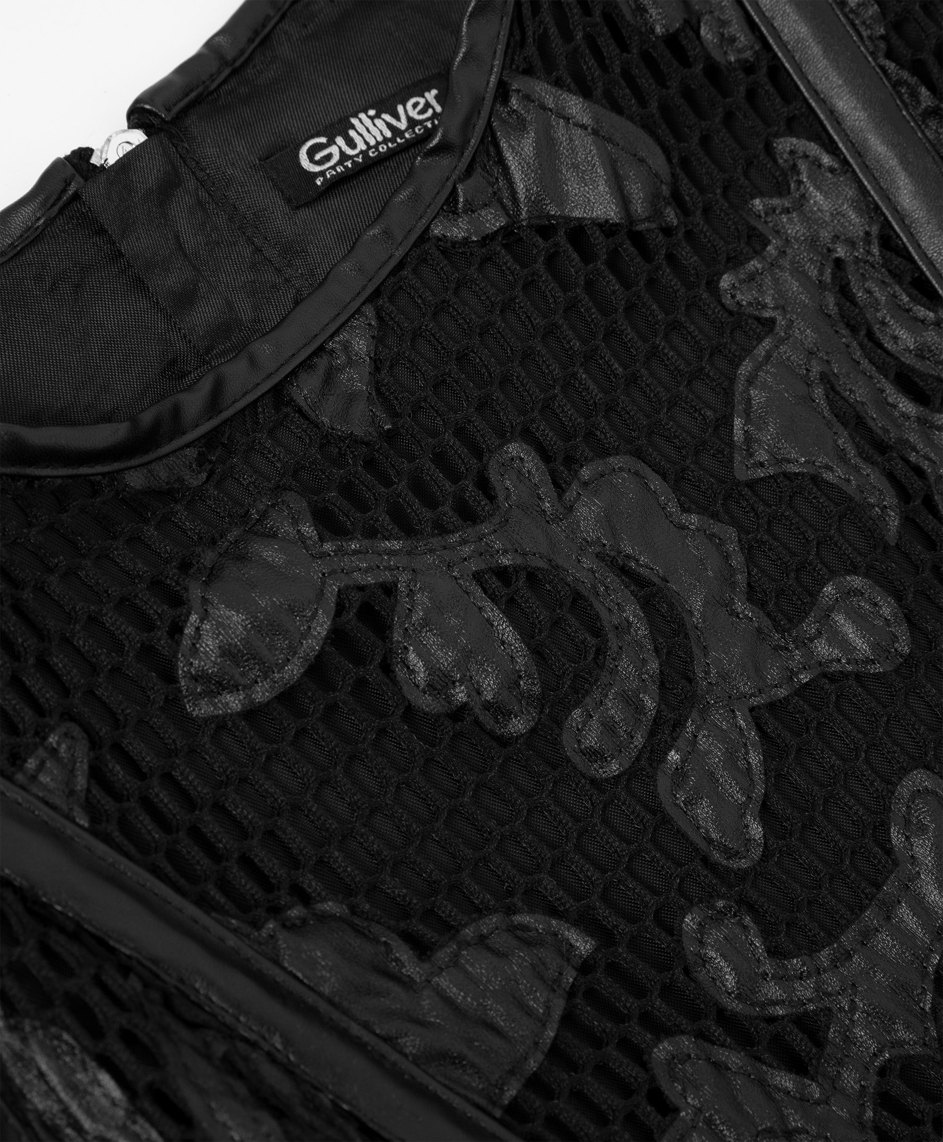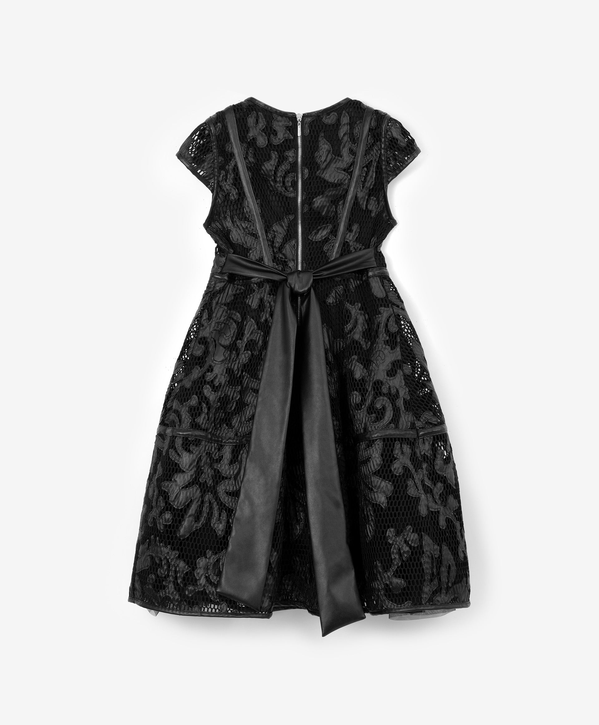 Елегантна рокля с втален лиф и пищна пола, изработена от интересен и необичаен материал: едра мрежа с пришити върху нея флорални елементи от най-фина еко кожа. Сложната и интересна текстура създава зашеметяващ ефект, правейки роклята изключително официална, елегантна и различна от другите модели. Извитият рисунък хармонира с тънките кожени кантове, преминаващи по всички конструктивни линии. Благодарение на няколкото слоя мрежа в подплатата, роклята поддържа отлично формата си. Тя със сигурност ще се хареса на момиче, което предпочита интересни и нестандартни решения както в делници, така и в празници. Роклята се закопчава със сребрист цип.