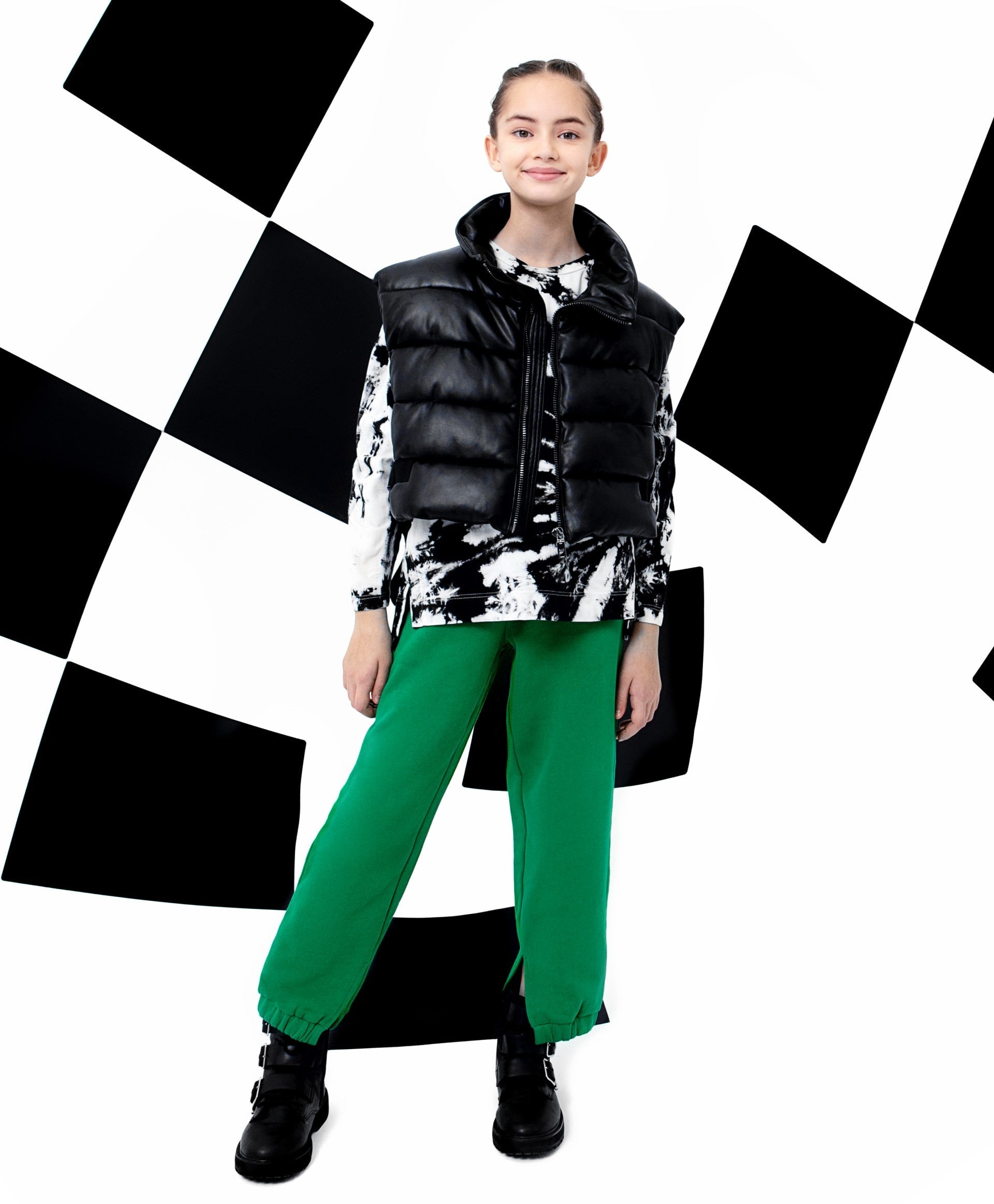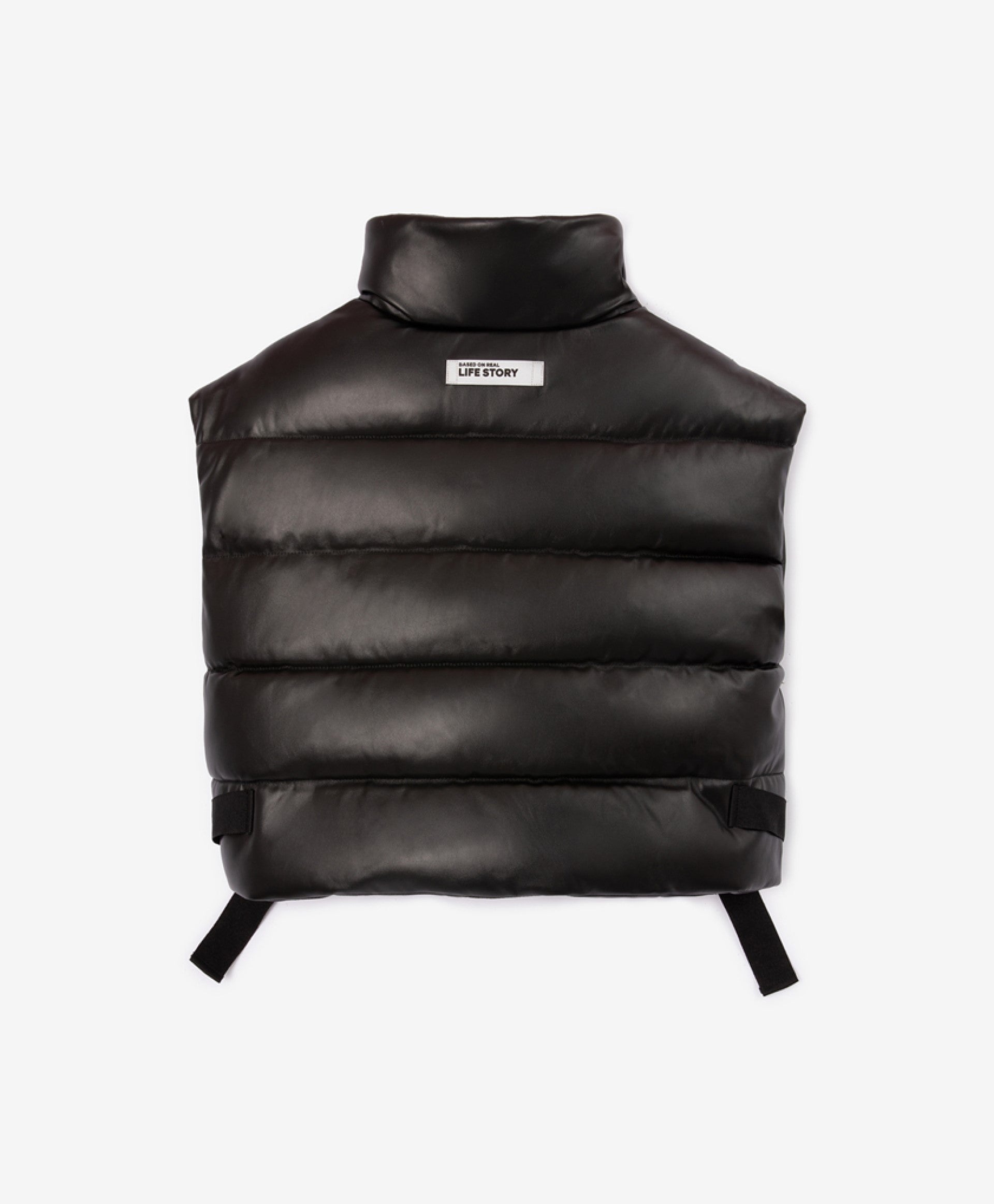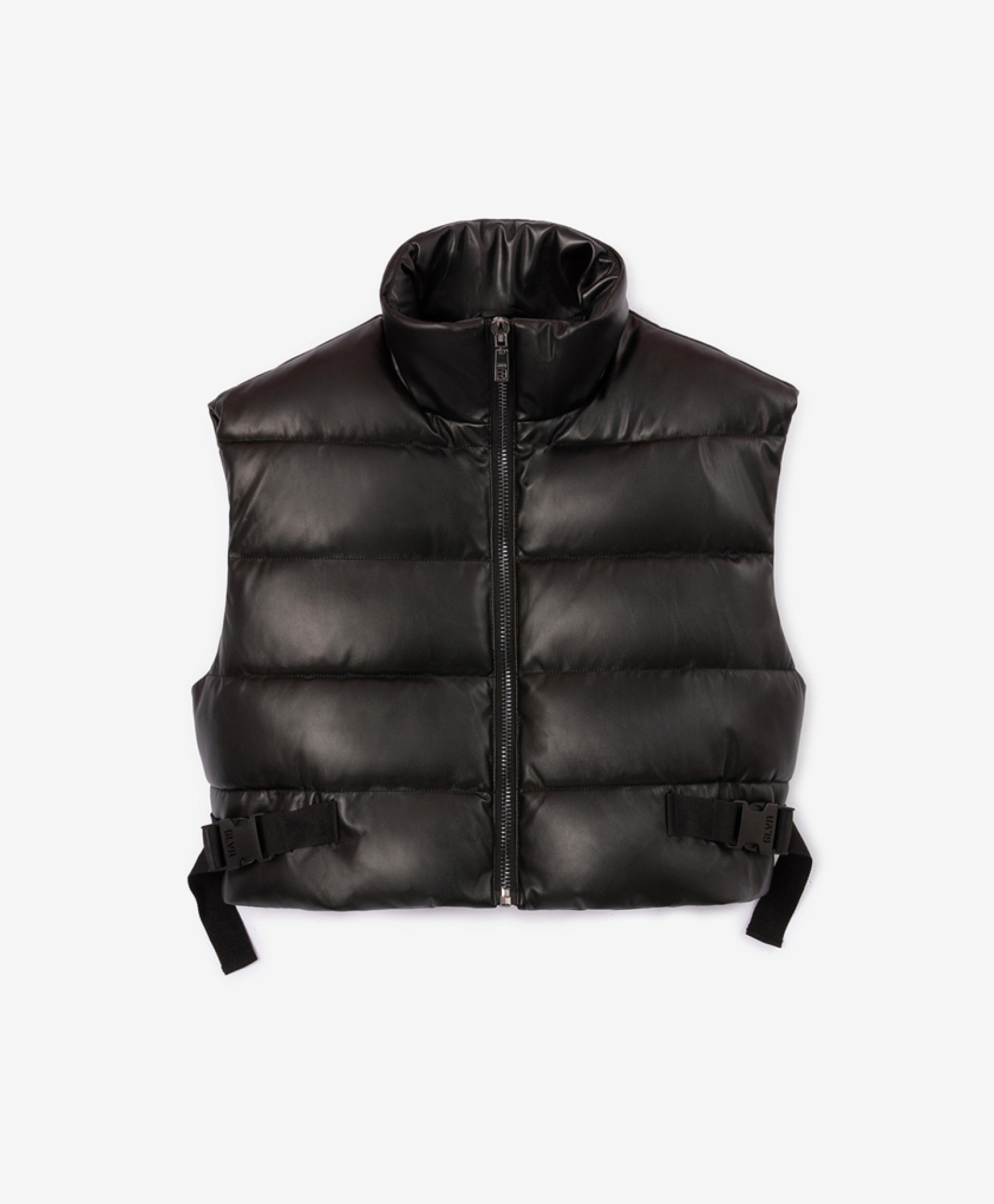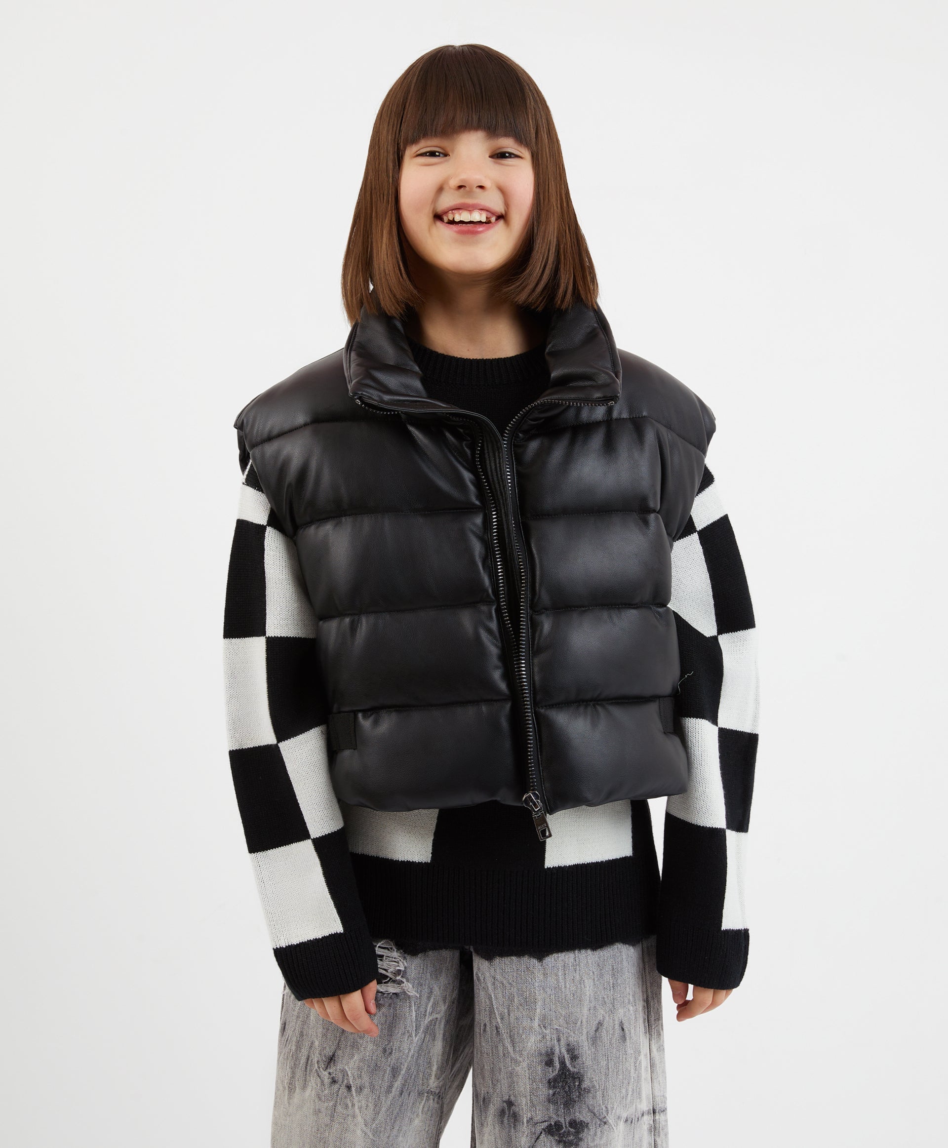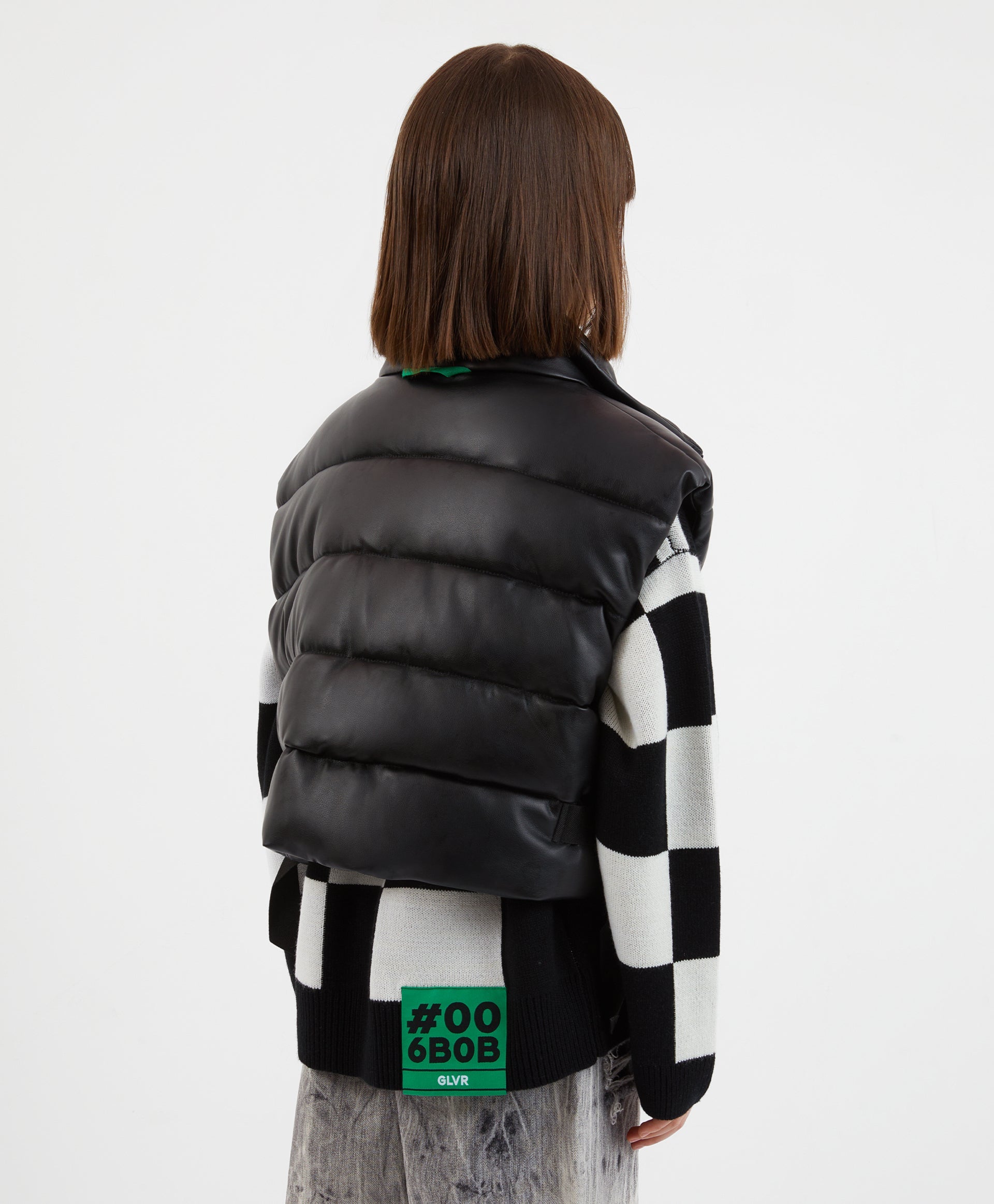 Скъсен елек от еко кожа – важна съставна част от гардероба на момичетата, склонни към модни експерименти. Актуалната дължина и увеличеният обем на елека формират съвременни пропорции. Меката изкуствена кожа създава тактилен и визуален контраст с другите предмети от облеклото в комплекта. В оформлението са използвани стилни регулатори на обема в долната част от широка текстилна лента с брандирани пластмасови катарами. Елекът няма джобове.