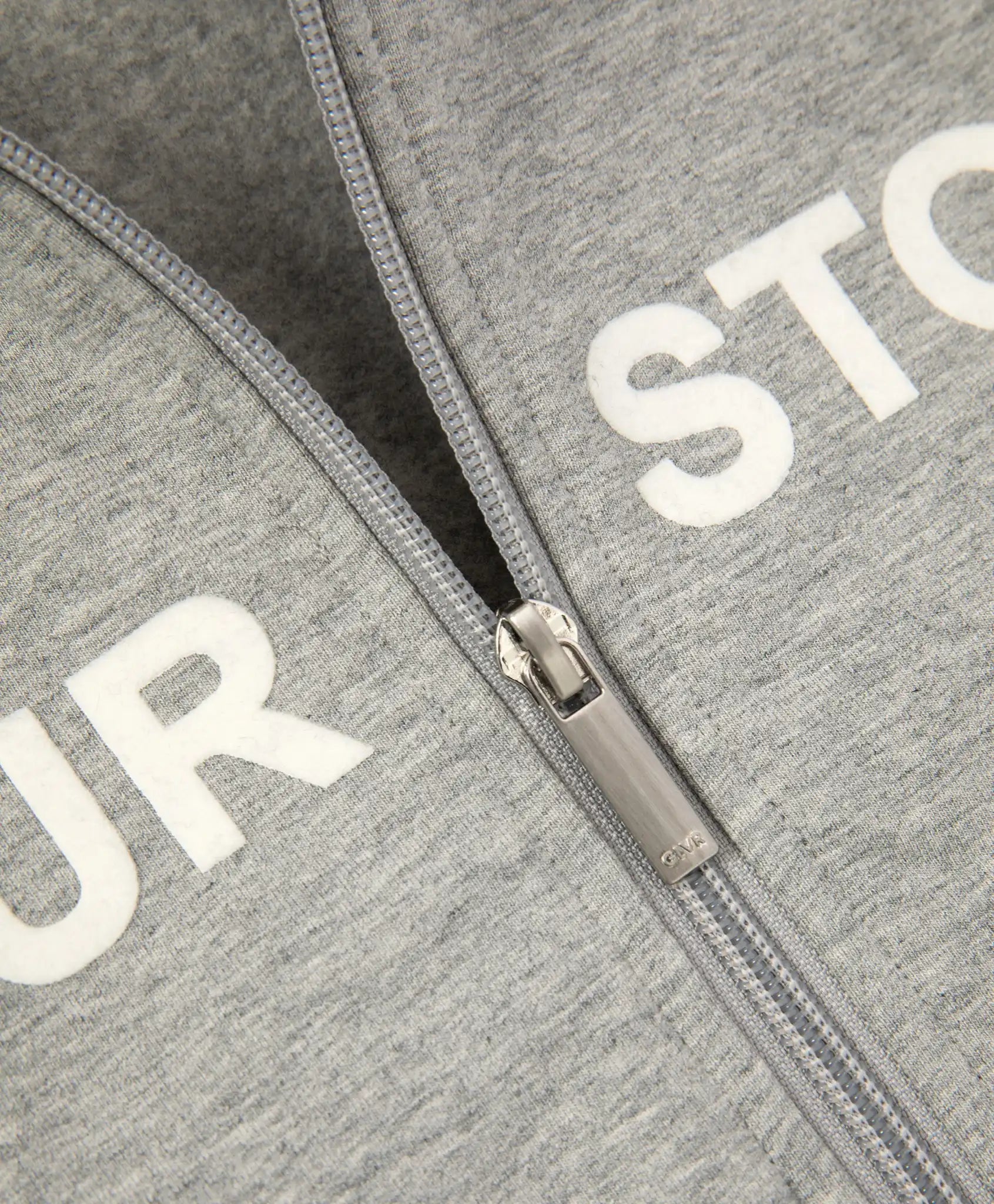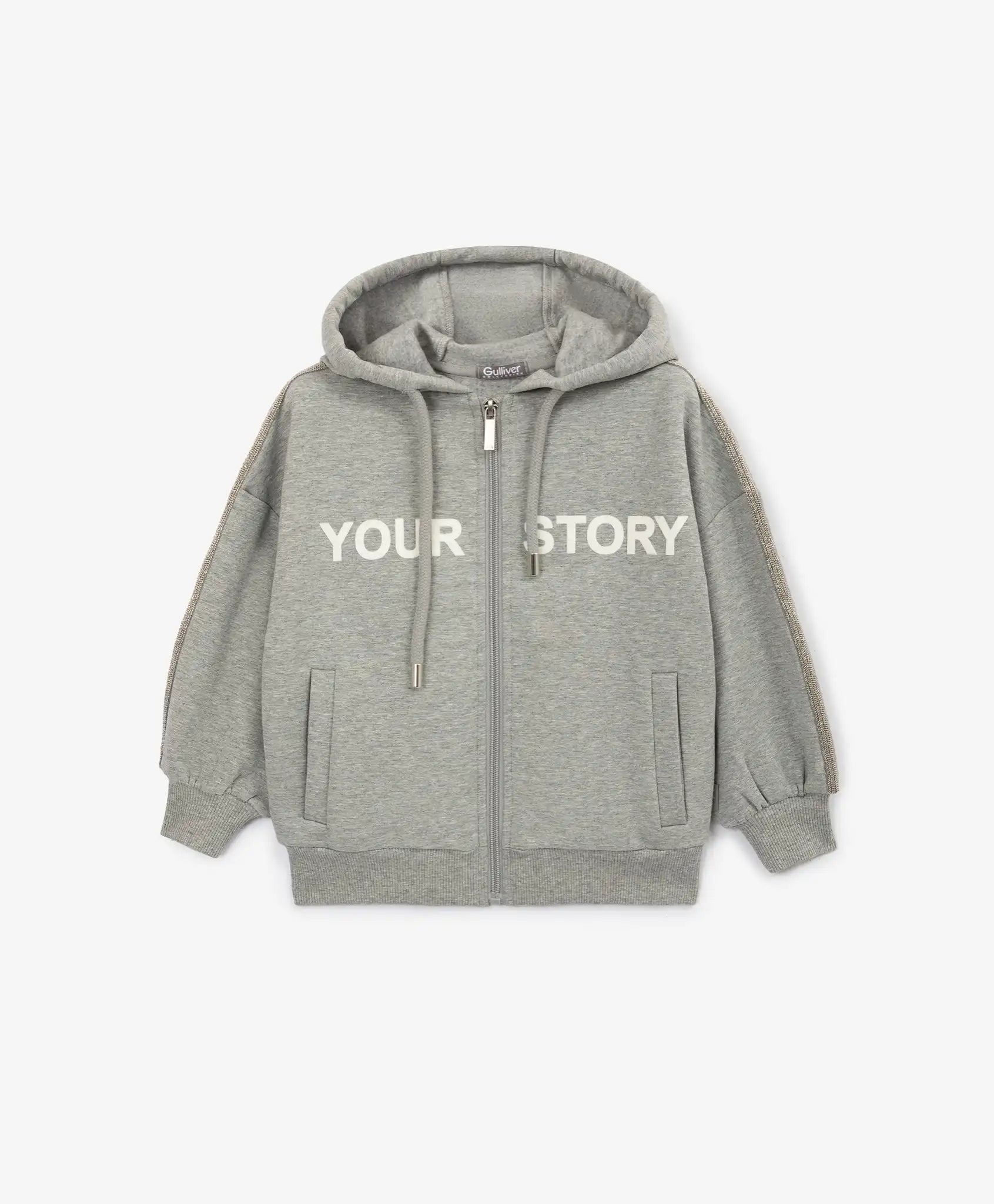 Hanoracul descheiat, gri și confortabil, cu croială lejeră și umeri căzuți, este un element de bază al garderobei de toamnă pentru fete. Poate fi purtat ca haină exterioară la începutul toamnei sau ca strat interior sub o geacă iarna – va rămâne mereu actual și preferat. Confectionat din French Terry cu interior din fleece, hanoracul este extrem de plăcut la atingere. Pe partea din față a modelului se află un imprimeu tipografic, iar pe spate – un imprimeu cu imaginea unui cățeluș și elemente tipografice în tehnica flock. Decorul include lanțuri mici argintii. Modelul are buzunare cu tăietură în formă de „frunză” și se închide cu fermoar. Se potrivește perfect într-un set sport-chic cu pantalonii gri 22402GMC5603.