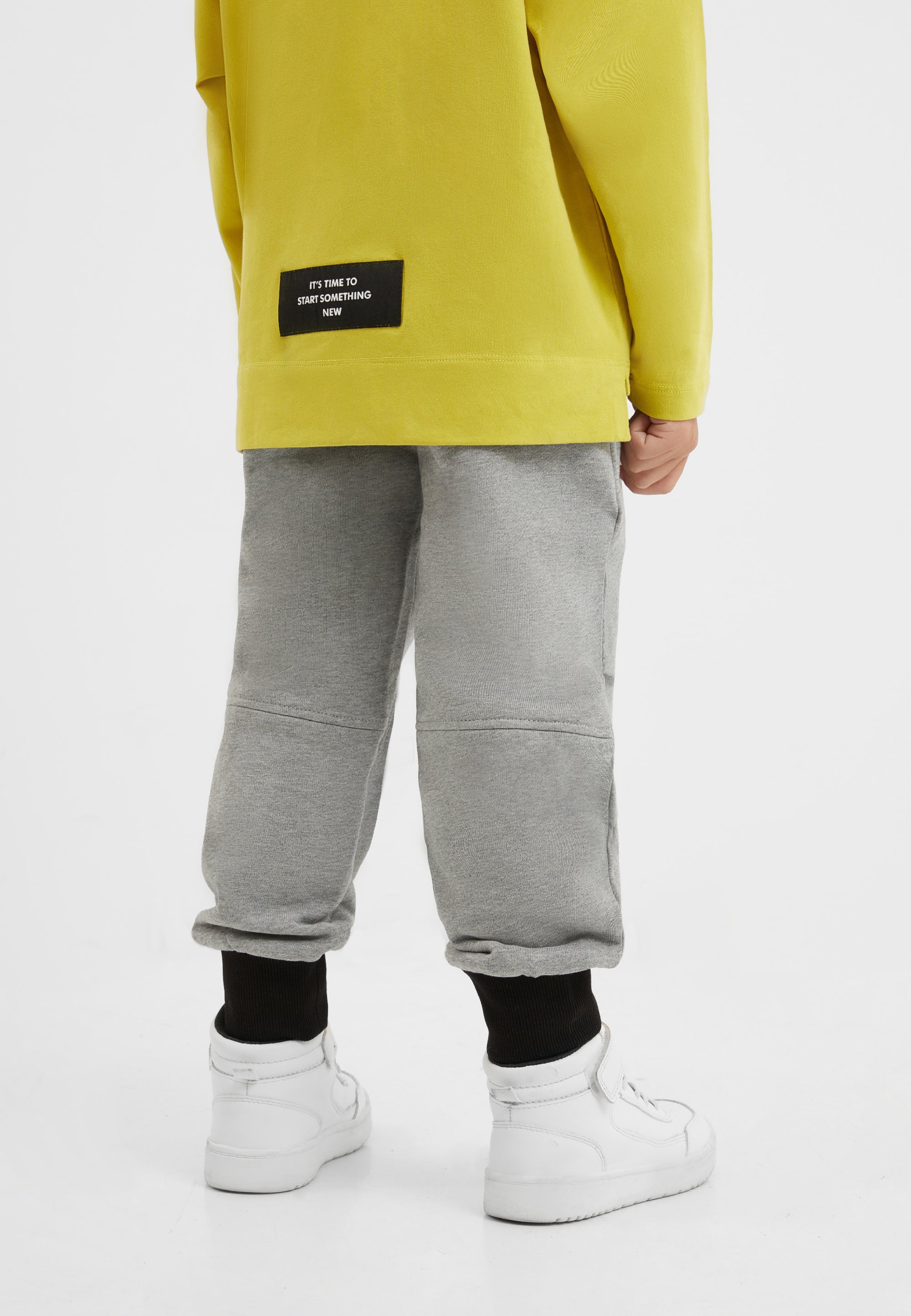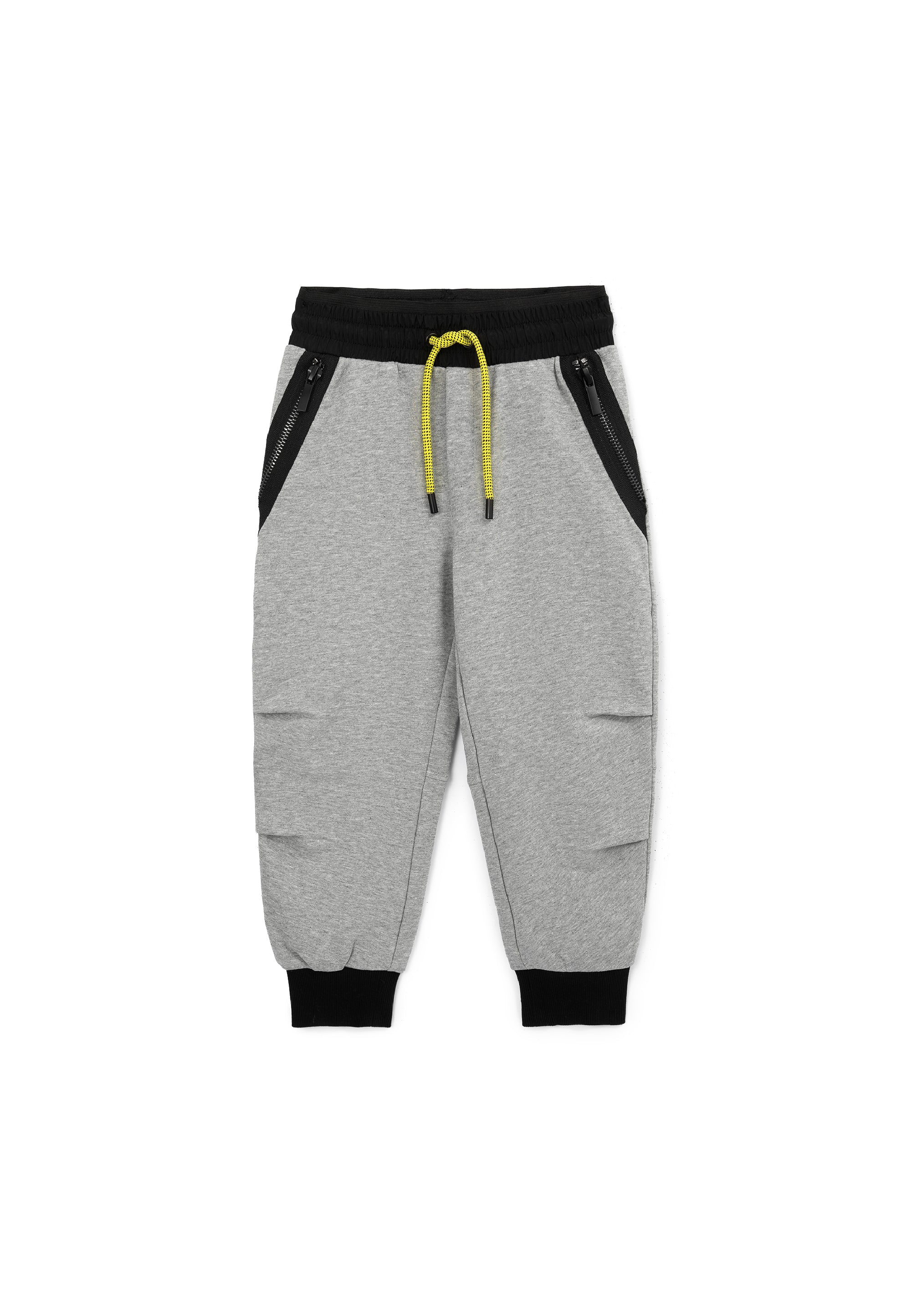 Сивите панталони джогър са един от най-комфортните и универсални елементи в гардероба на момчето, подходящи както за разходки и спокойно прекарване на времето у дома, така и за детска градина или часовете по физическо в училище. Панталоните са изработени от меко меланжирано 100% памучно трико. Материята е пластична, приятна на допир, притежава отлична устойчивост на деформация и е лесна за поддръжка. Панталоните имат акцентни странични джобове с ципове, контрастен еластичен колан с връзки и контрастни маншети.Моделът ще състави завършен лежерен комплект с горнище с цип 22406BMC1607.