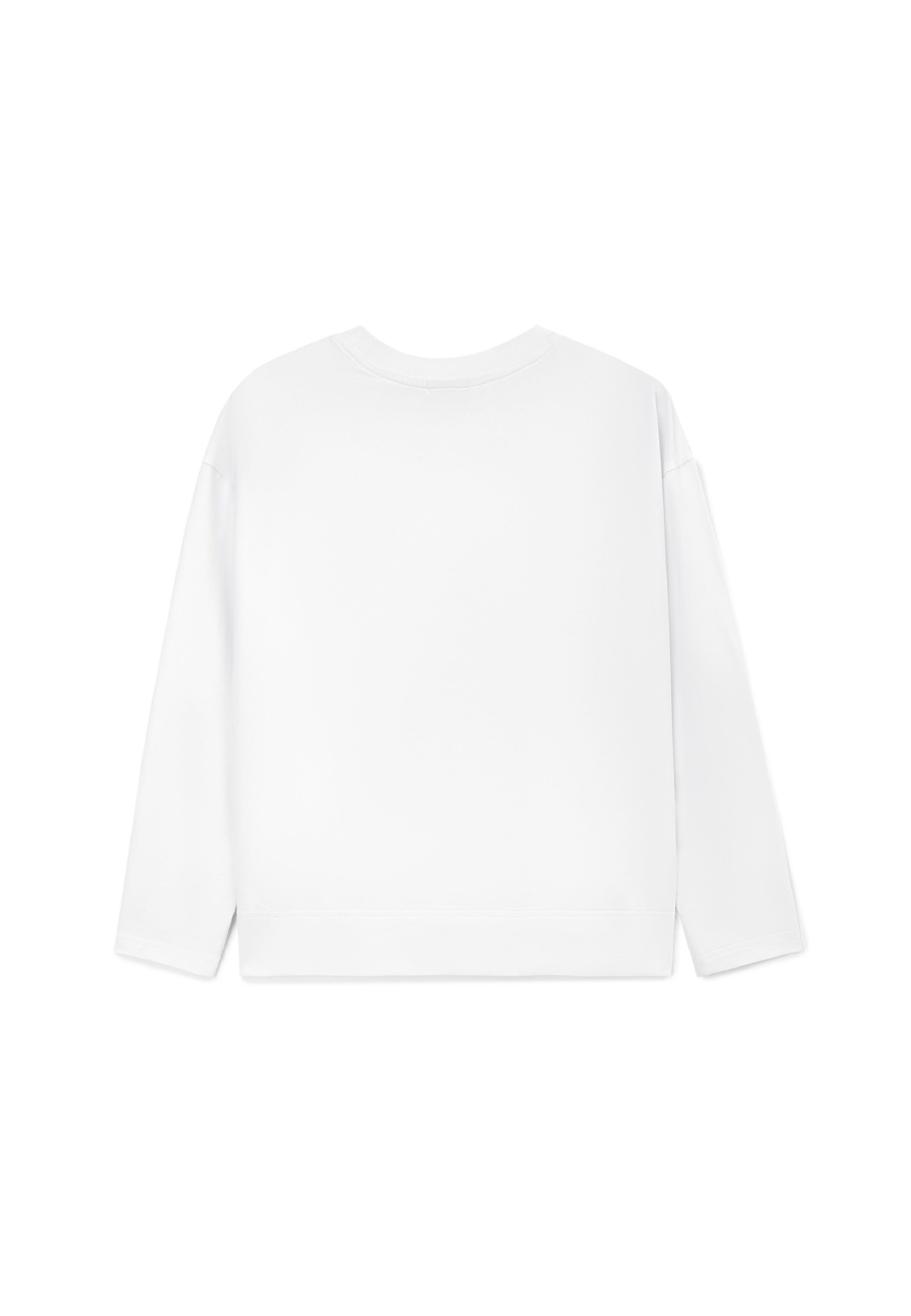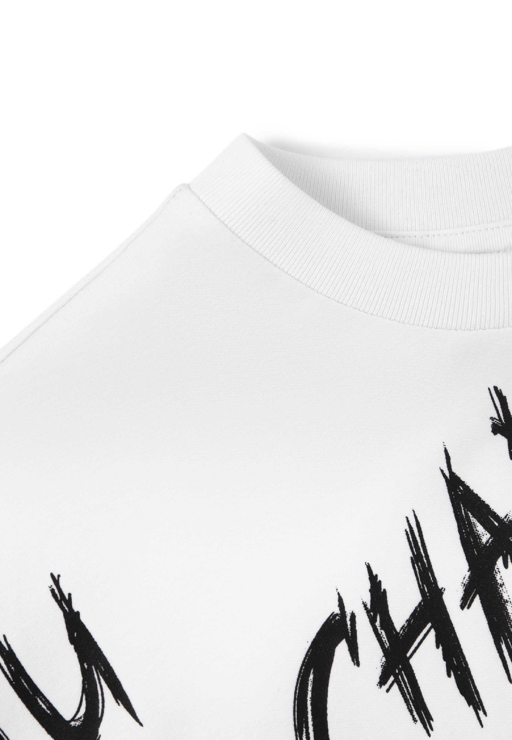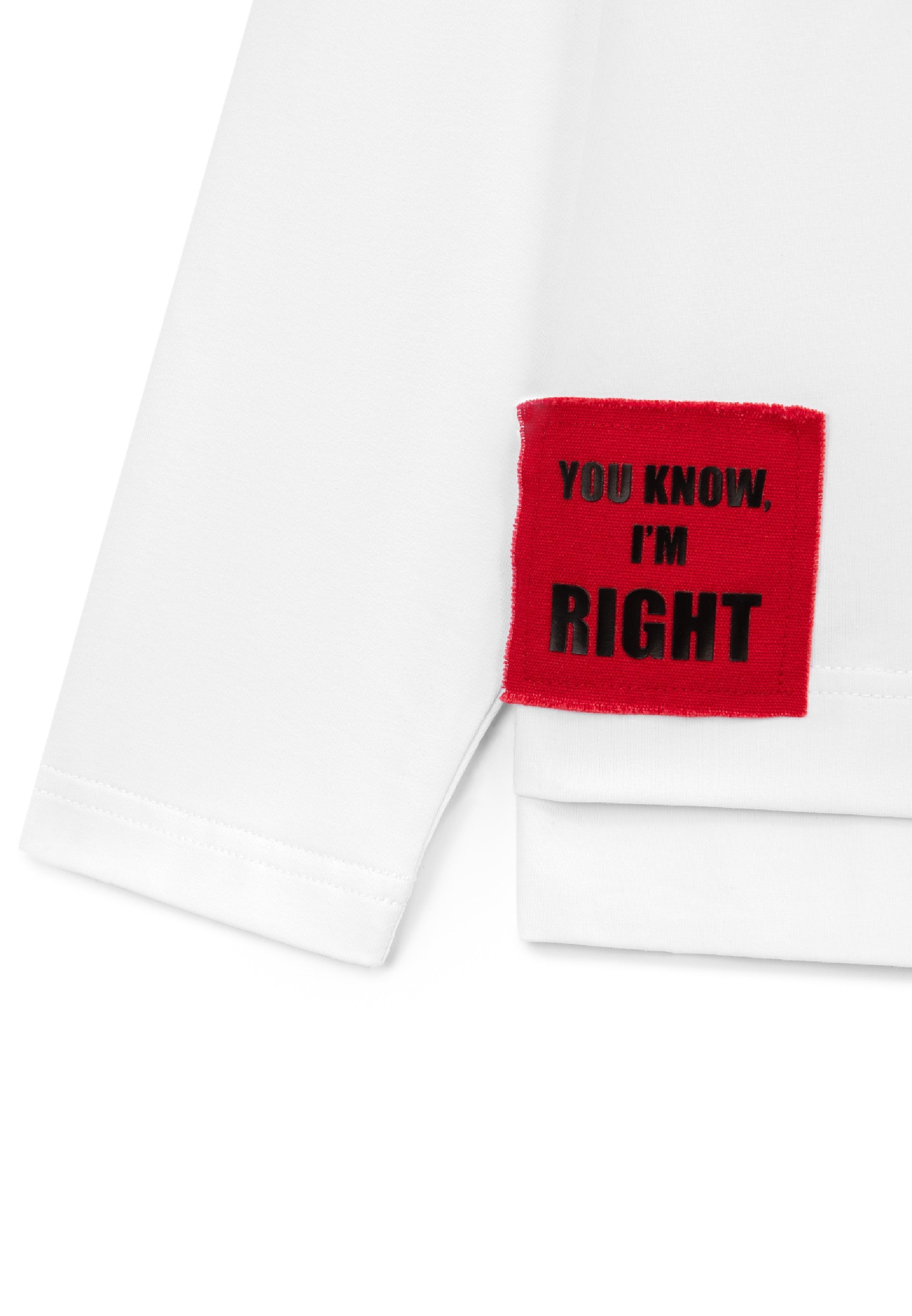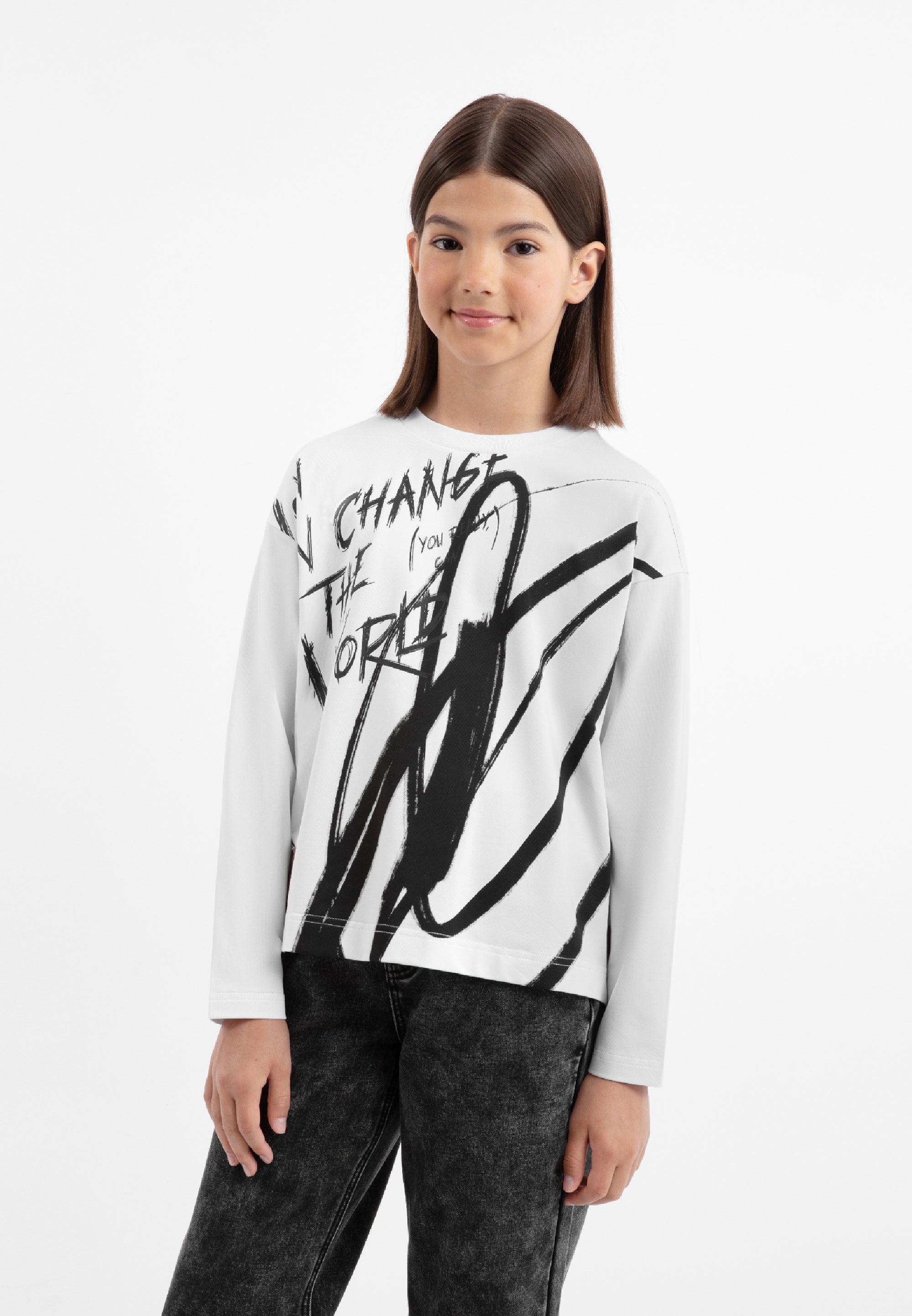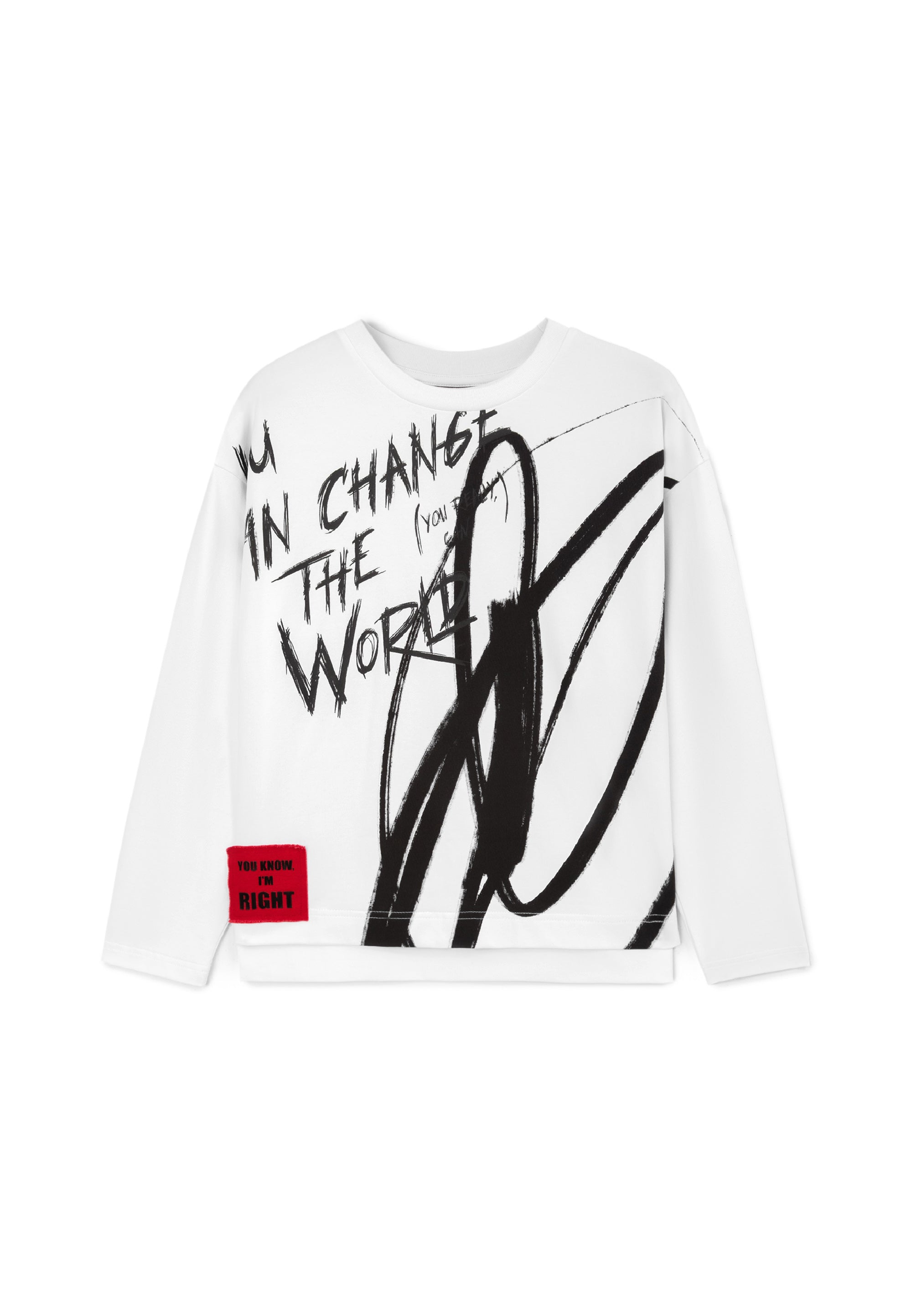 Бяла блуза с дълъг ръкав, удължен гръб и паднало рамо — прекрасен начин да изразиш своята индивидуалност! Изделието е изработено от еластично памучно трико. Материята е приятна на допир, притежава добра топлоизолация, запазва прекрасно формата си и е лесна за поддръжка. Големият принт, напомнящ абстрактна рисунка с маркер, и надписът „You can change the world“ („Ти можеш да промениш света“) правят модела наистина уникален. В долната част на блузата е разположена червена нашивка с текстови елементи.