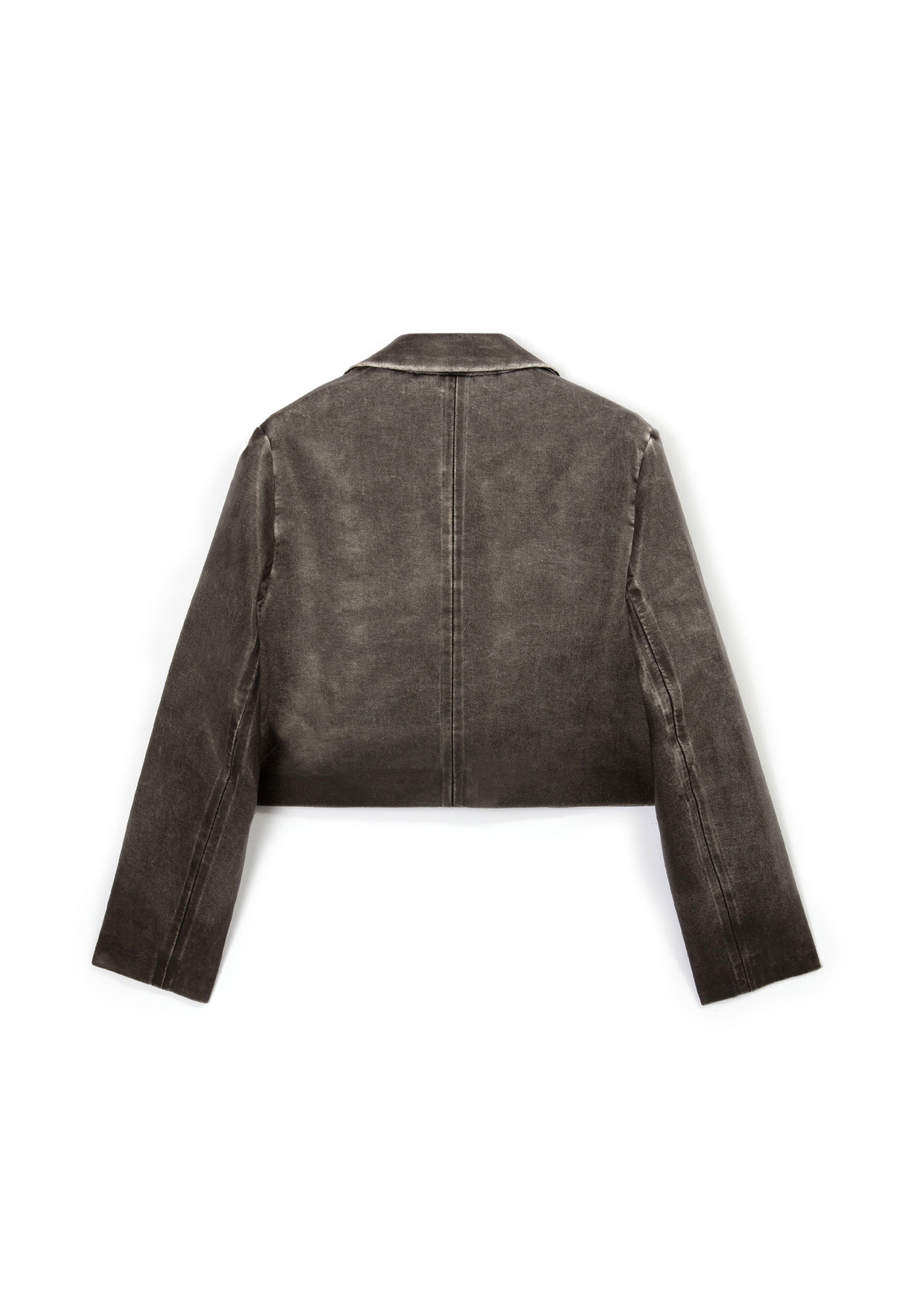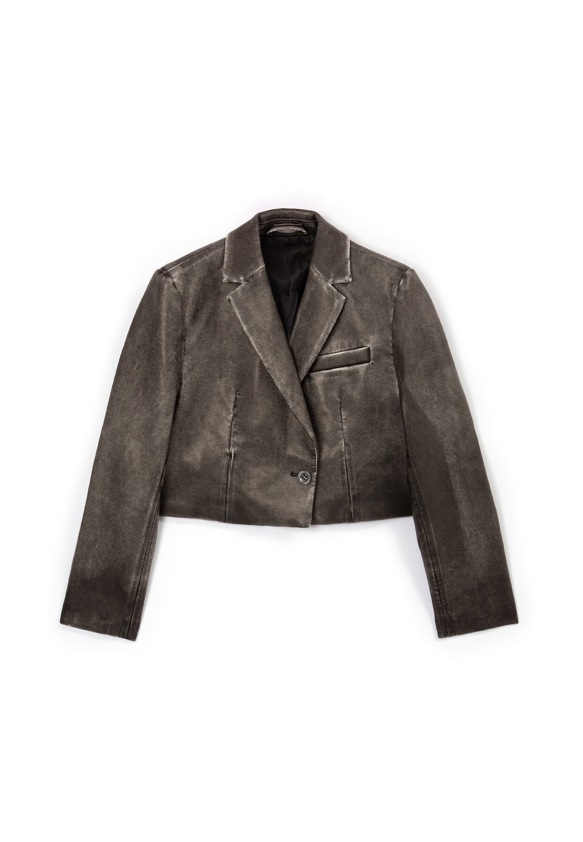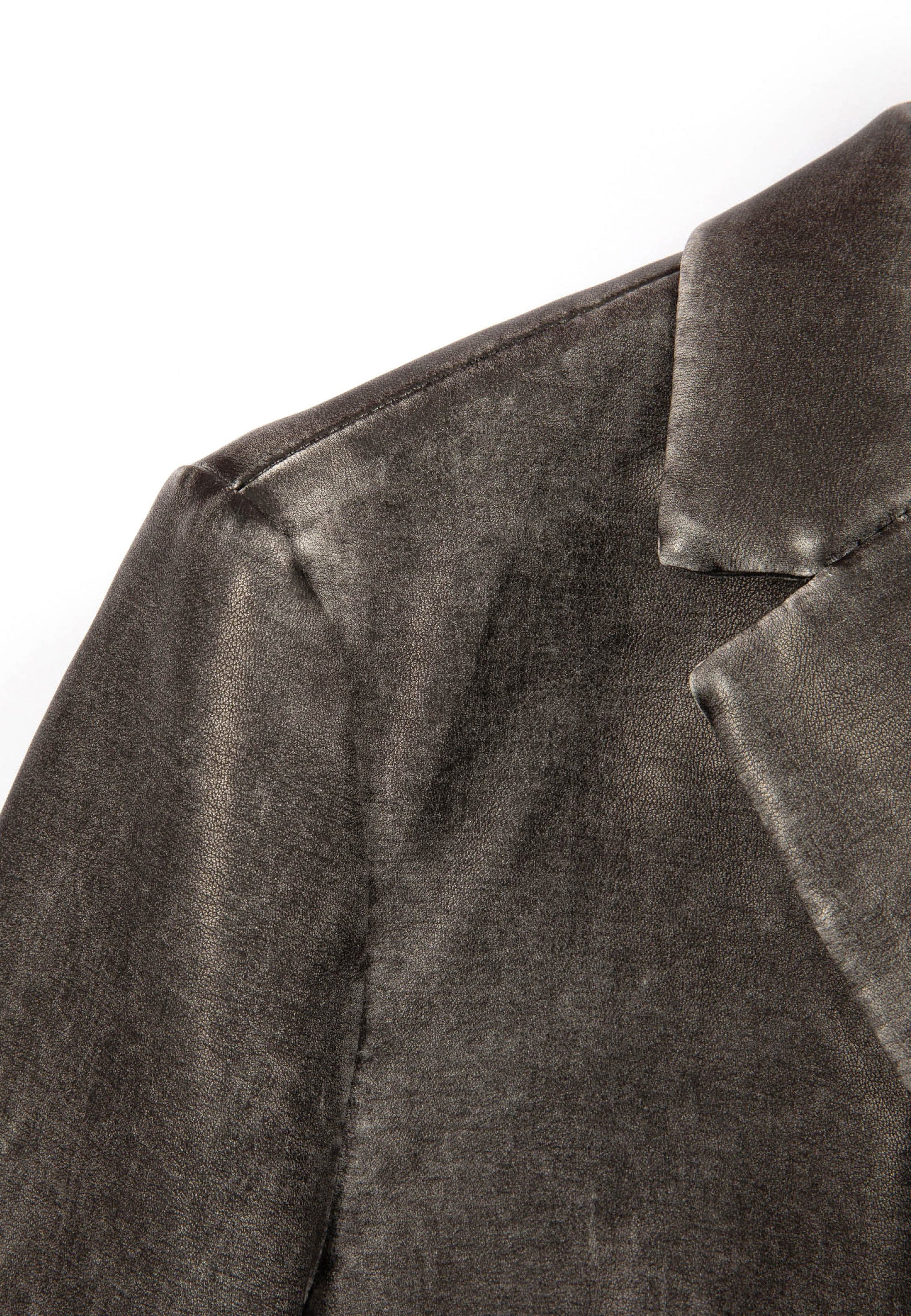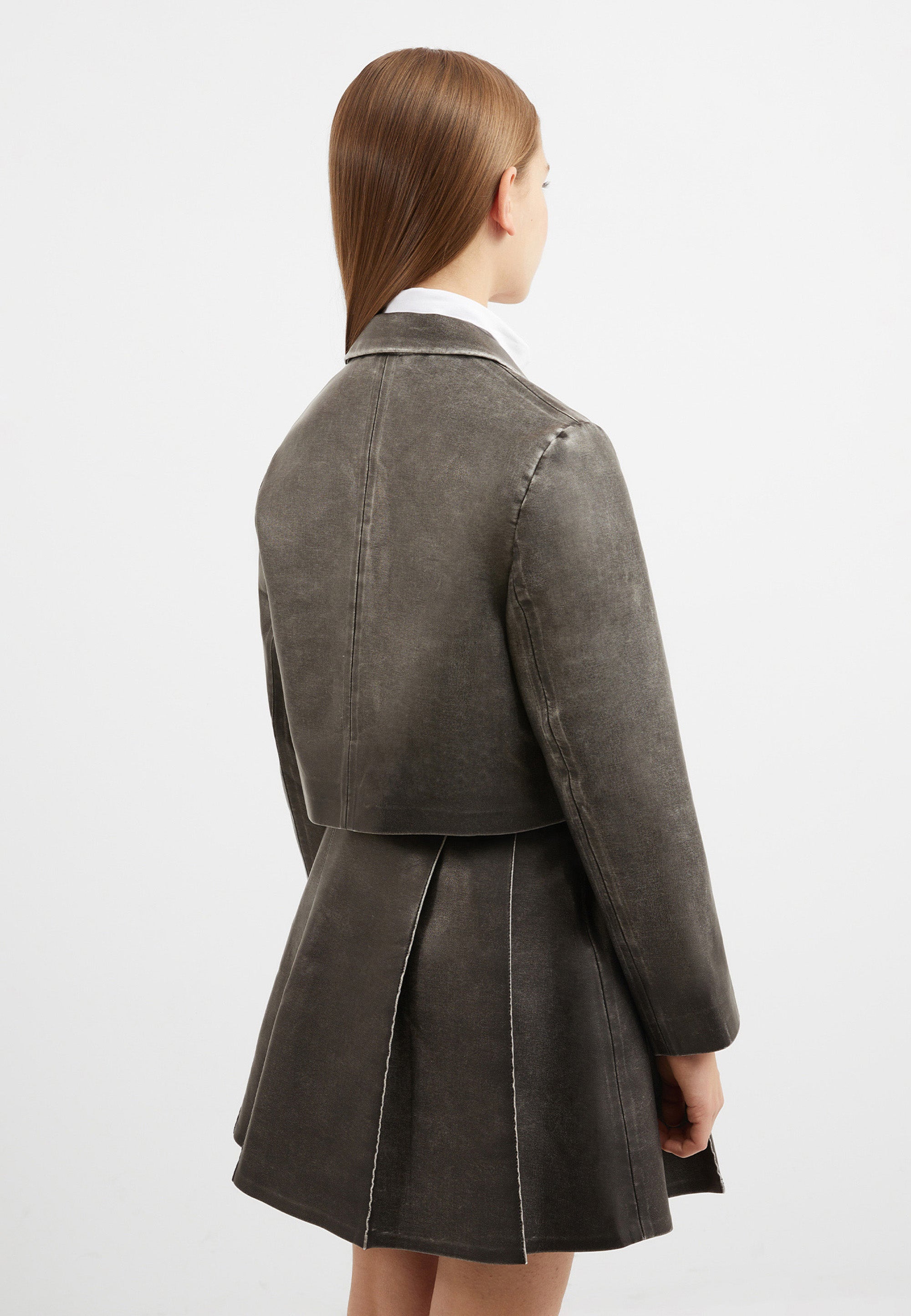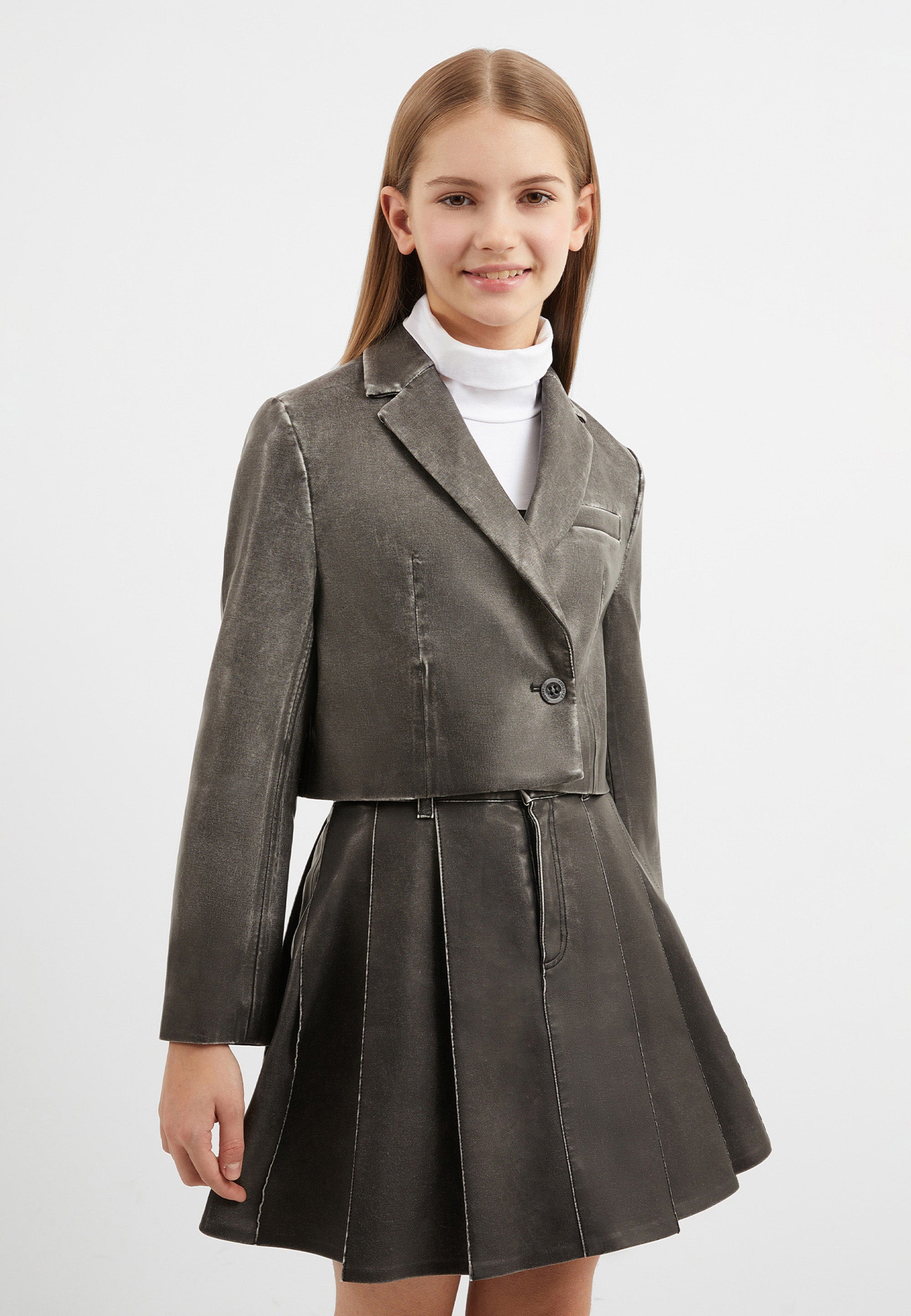 Сивото скъсено сако с винтидж излъчване ще се превърне в истинско стилно „Аз“ за смелите момичета, които не се страхуват да експериментират с визиите! Изделието с права кройка е изработено от екокожа с характерни тренди изтривания. Материята е плътна, запазва формата си и по своите характеристики и външен вид по нищо не отстъпва на естествената кожа. Сакото има имитация на джоб в предната част. На гърба е разположен текстов принт в стил графити. От вътрешната страна на гърба има червена нашивка с текстови елементи, подчертаваща принадлежността на модела към колекция „Дистрой“. Меката подплата от поливискоза осигурява приятни тактилни усещания. Сакото се закопчава с копче. Моделът ще състави завършен комплект във винтидж стил заедно с пола от същата материя 22407GJC6101, а също така може красиво да завърши комплект с едноцветни червени или черни панталони, превръщайки се в негов ярък акцент.