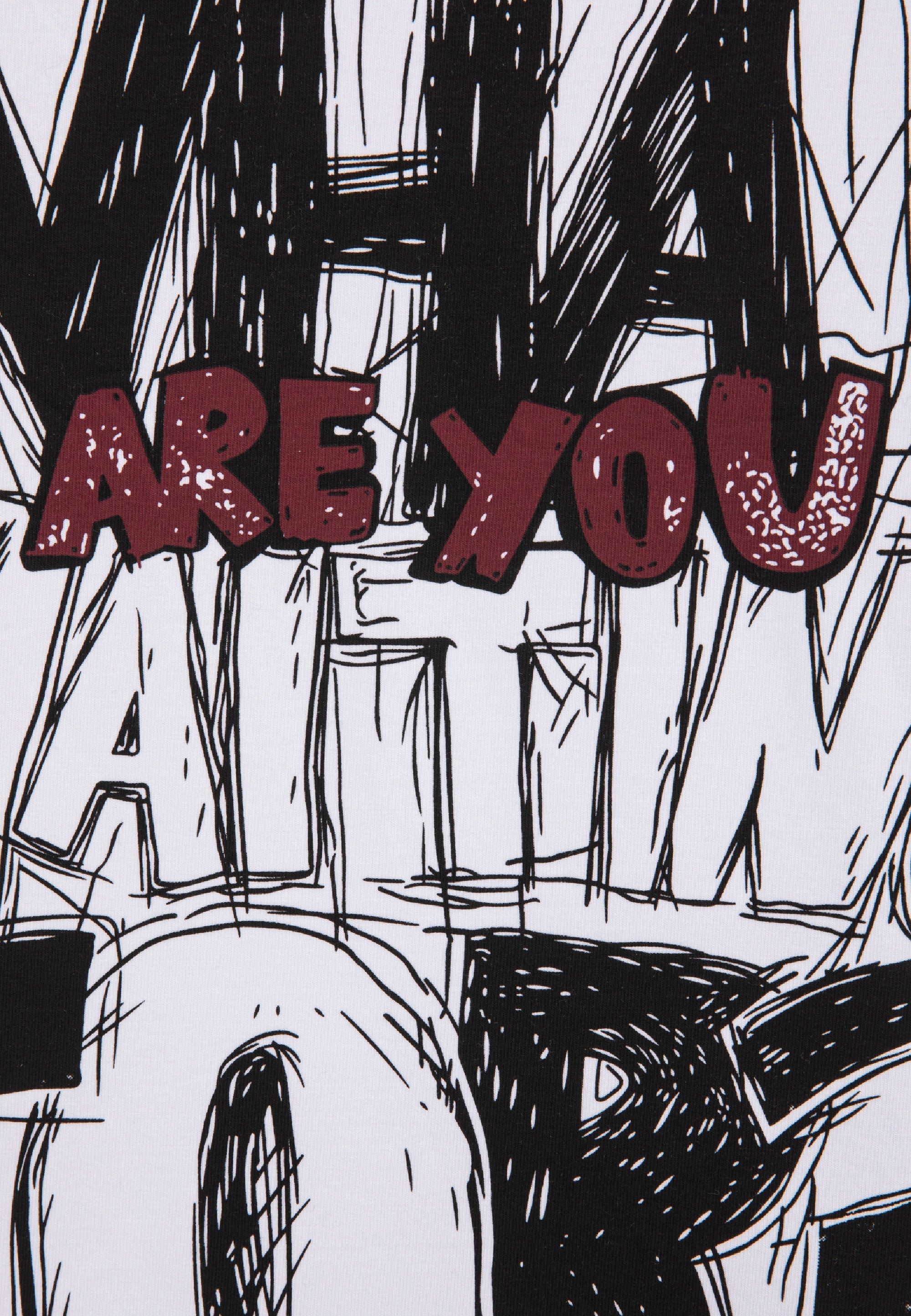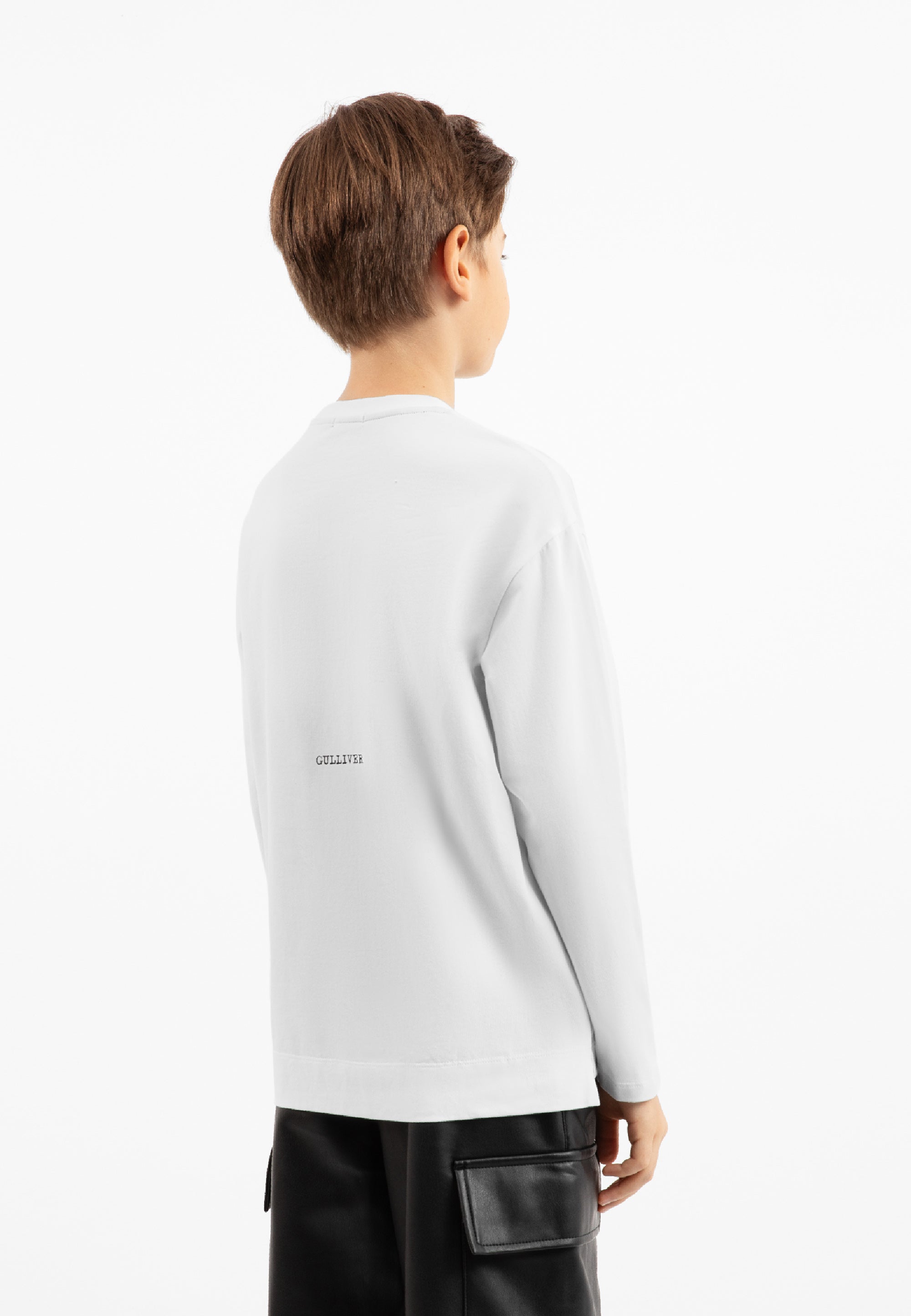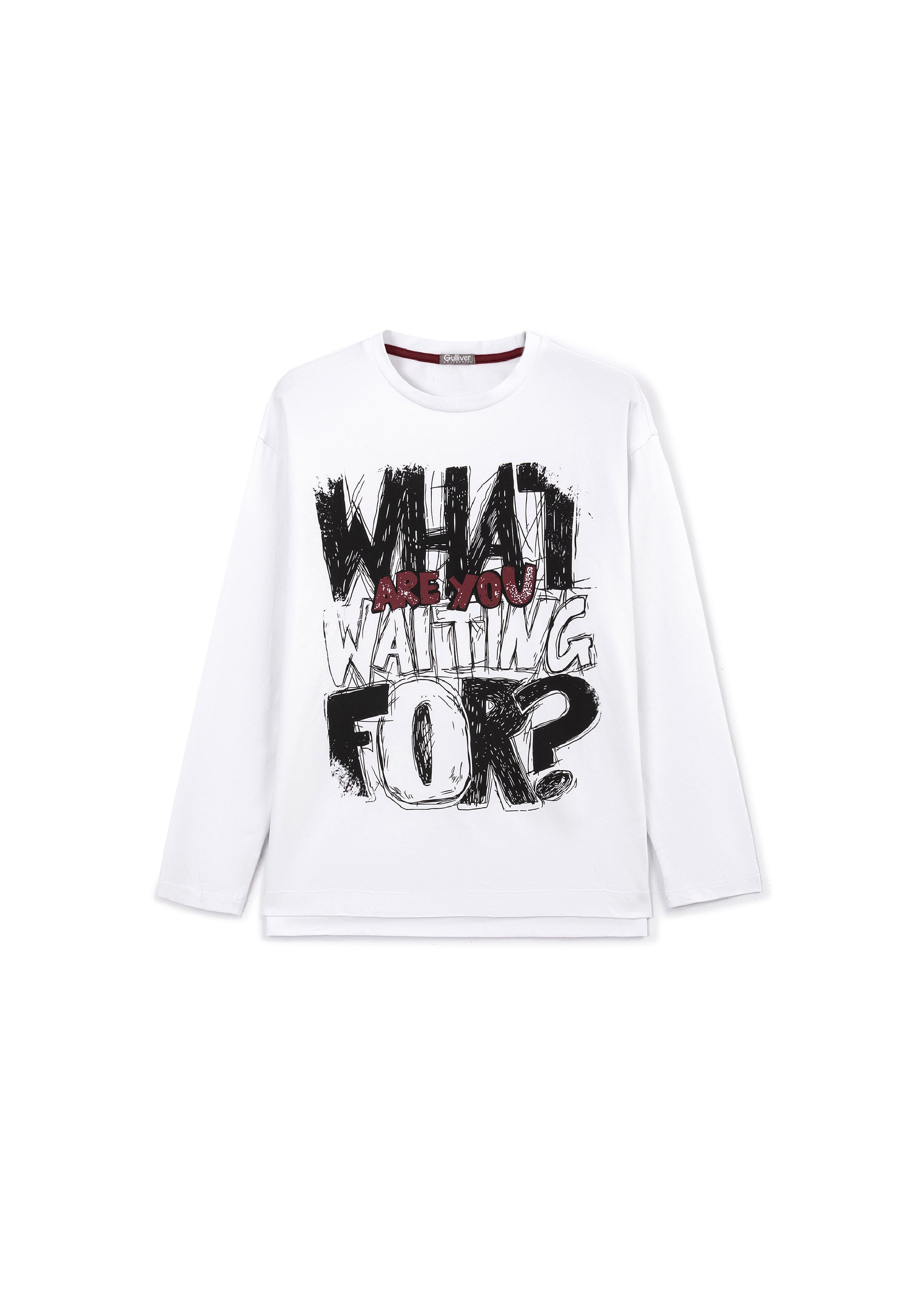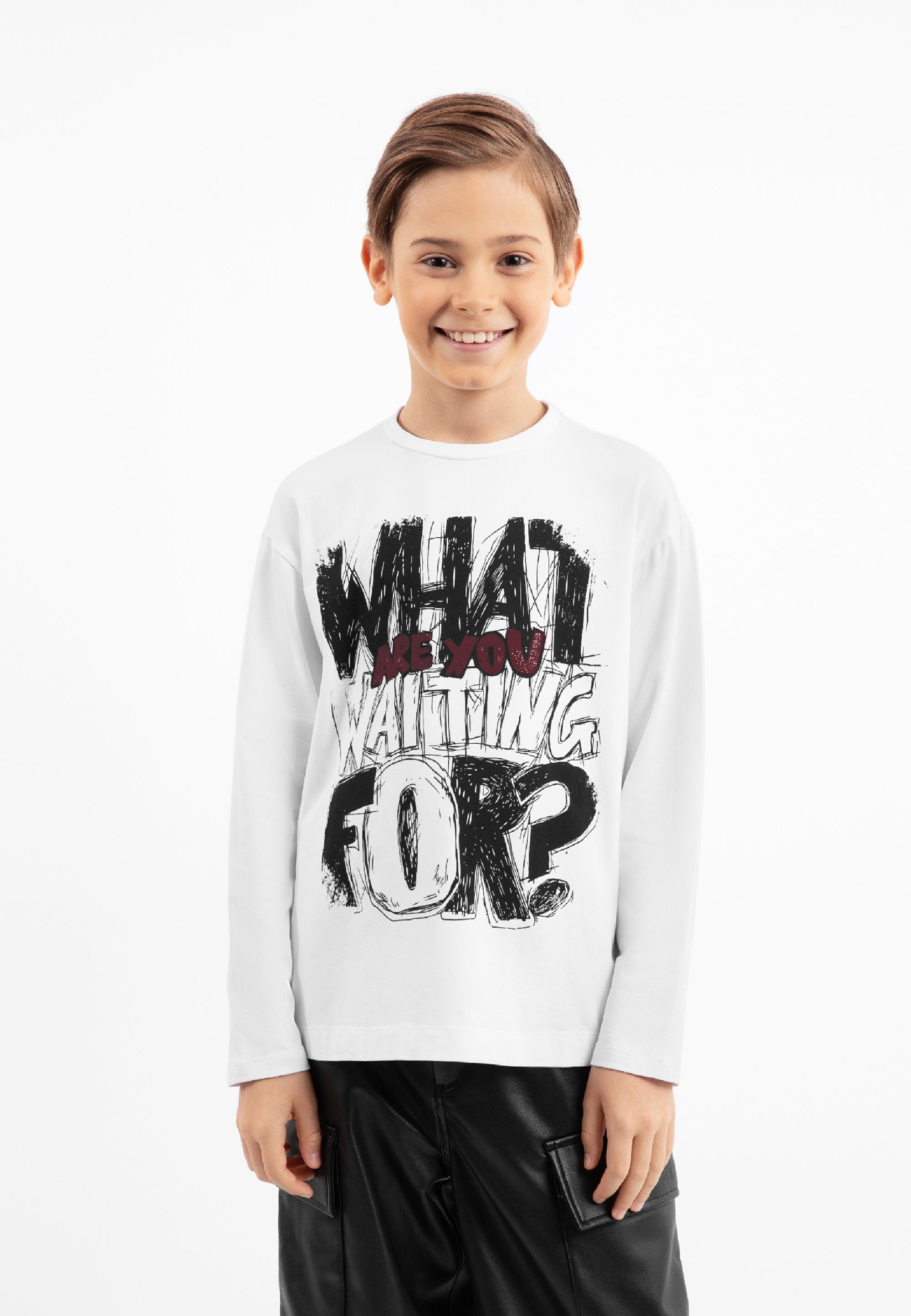 Само истинските рок фенове знаят от коя песен са тези редове! Бялата блуза с дълъг ръкав и умерено свободна кройка с многозначителния надпис „What are you waiting for?“ („Какво чакаш?“) ще се превърне в стилообразуващ елемент в гардероба на момчето, увлечено по рок културата. Изделието с удължен гръб и паднало рамо е изработено от меко и пластично памучно трико. В дизайна на блузата е използван голям текстов принт в предната част и малък минималистичен текстов принт на гърба.