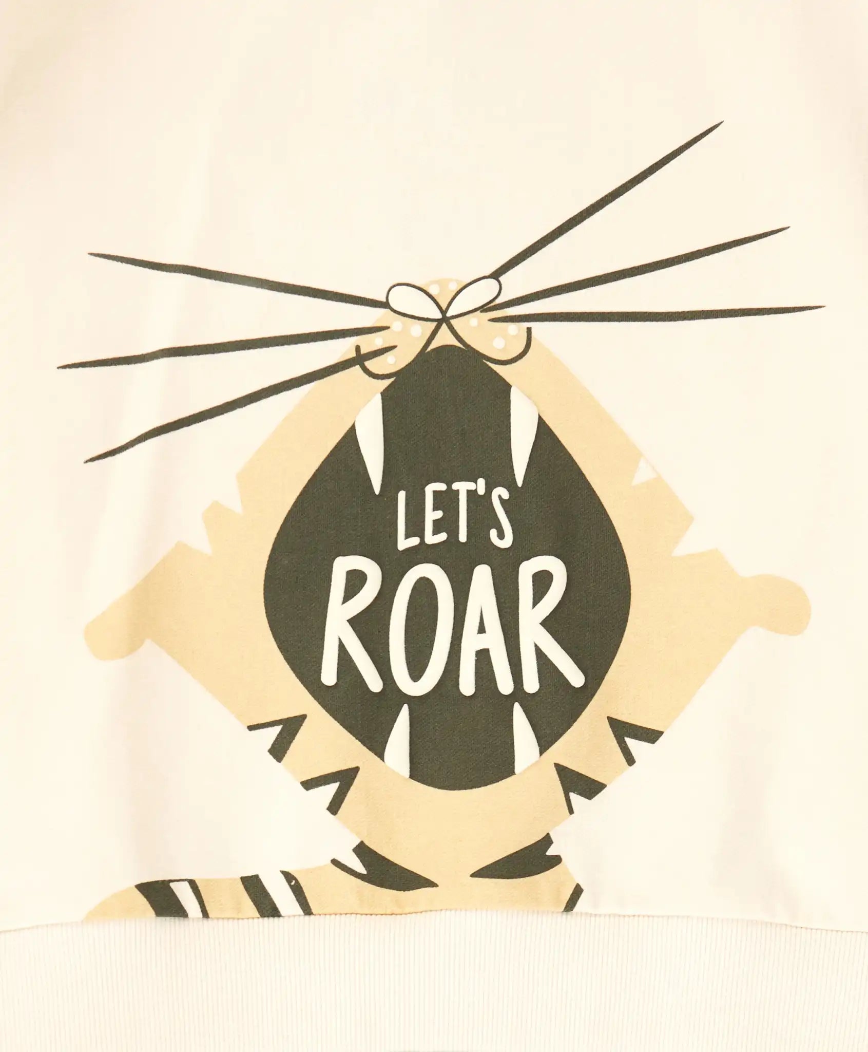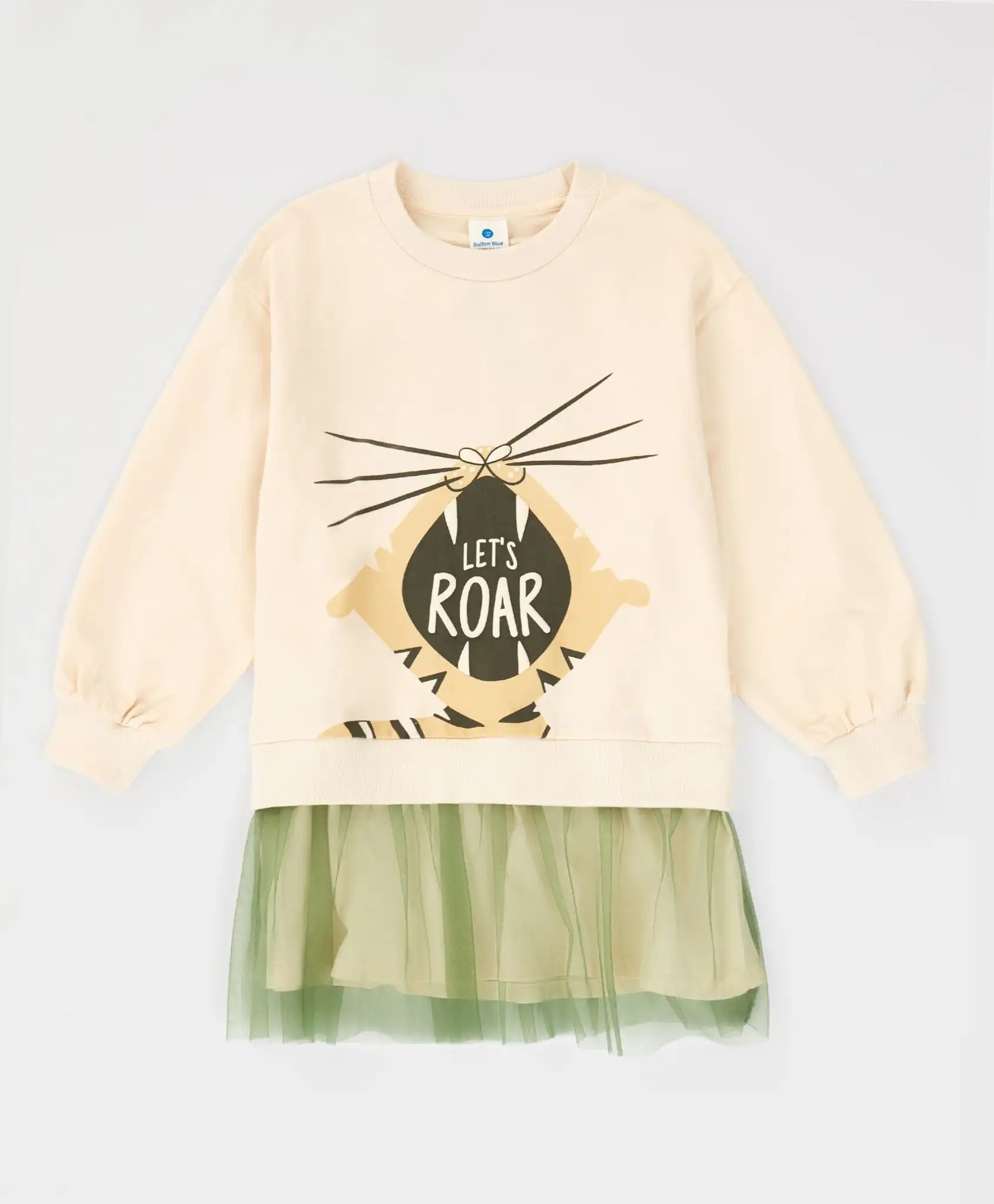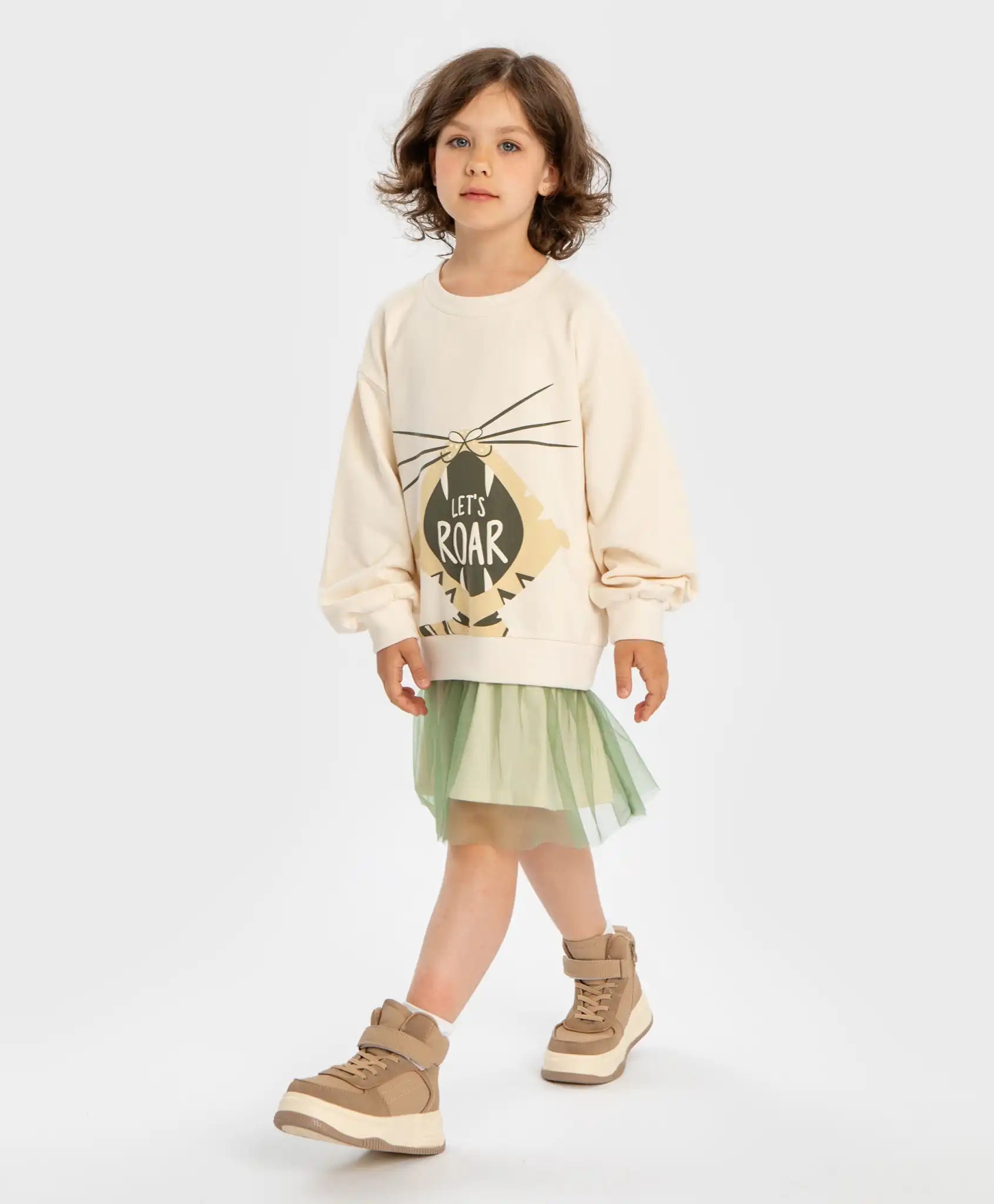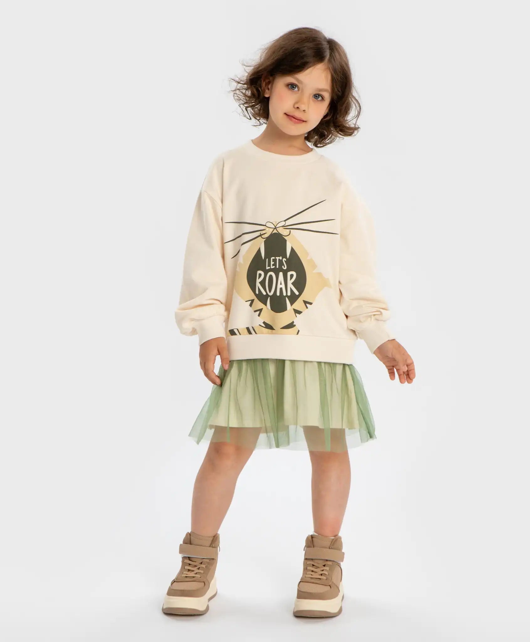 Rochie-sweatshirt cu fustă din tul în nuanță lăptoasă pentru fată de la Button Blue. Partea superioară este realizată din tricot buclat, având aspect de hanorac. Materialul este plăcut, neted, rezistent și respirabil. Decolteul clasic rotund este finisat cu țesătură elastică rib, la fel ca și manșetele mânecilor. Fusta este confecționată dintr-o plasă ușoară cu căptușeală din material mixt moale. Rochia arată original și interesant datorită imprimeului animalier mare de pe partea frontală. Aspectul modern este completat de jocul de culori din fustă – combinația dintre tonul lăptos delicat și tulul verde. Acest model este destinat fetelor care vor să arate șic, fără a sacrifica confortul. Urmați instrucțiunile de îngrijire indicate pe etichetă.