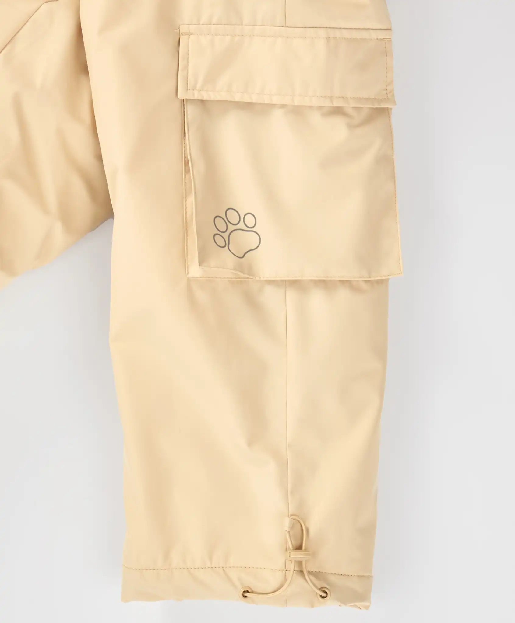 Pantaloni demi-sezon impermeabili căptușiți, cu ajustare la bază, pentru fete, de la Button Blue, în culoare bej. Partea exterioară este realizată din material hidrofug, care protejează copilul de noroi și umezeală. Pantalonii au o căptușeală din sintepon Silk Touch de 120 g/m² și sunt potriviți pentru temperaturi de până la -10 grade. În combinație cu lenjerie termică, pot fi purtați și în condiții mai reci. Buzunarele sunt perfecte pentru a încălzi mâinile. Talia pantalonilor este elastică în spate, iar în față se închid cu cârlig și fermoar. Au găici pentru curea și includ o curea elastică gri cu închidere branduită. Partea inferioară a cracilor are elastic cu opritori pentru ajustarea lățimii și fixării. Culoarea delicată oferă un aspect fresh, iar buzunarele mari cu clapetă și imprimeul cu lăbuțe adaugă un detaliu trendy. Elementele reflectorizante sporesc siguranța copilului pe timp de noapte. Urmați instrucțiunile de îngrijire indicate pe etichetă.