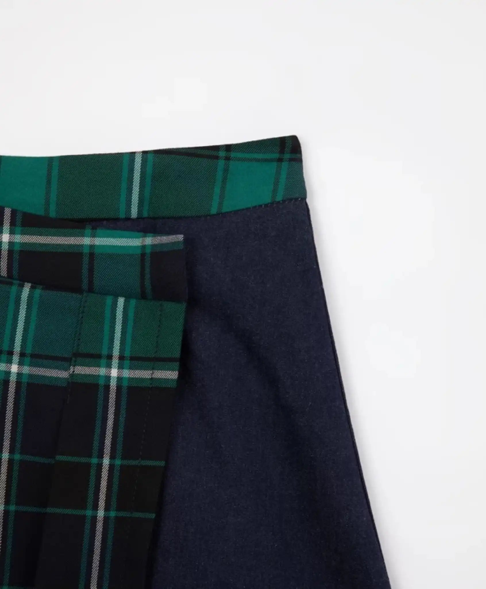 O combinație neașteptată de denim și carouri verzi scoțiene din această fustă mini cu croială trapezoidală va transforma orice elevă într-o adevărată icoană a stilului! Fusta arată grozav în combinație cu o cămașă albă și cravata asortată din colecția școlară Gulliver. Fusta cu închidere asimetrică adaugă prospețime și modernitate oricărei ținute! Închiderea este fixată cu un nasture pe o parte și o capsă pe cealaltă. Materialul principal este denim dens, confortabil și practic. În partea din spate, fusta are o betelie elastică ce asigură o potrivire perfectă pe talie.
