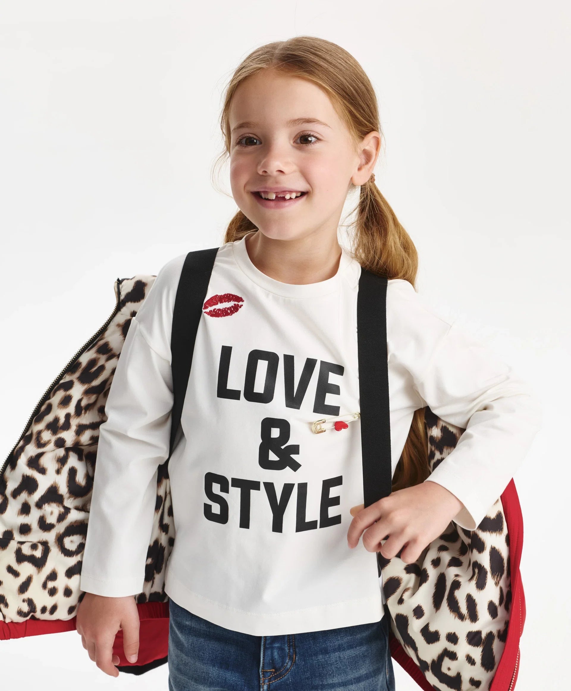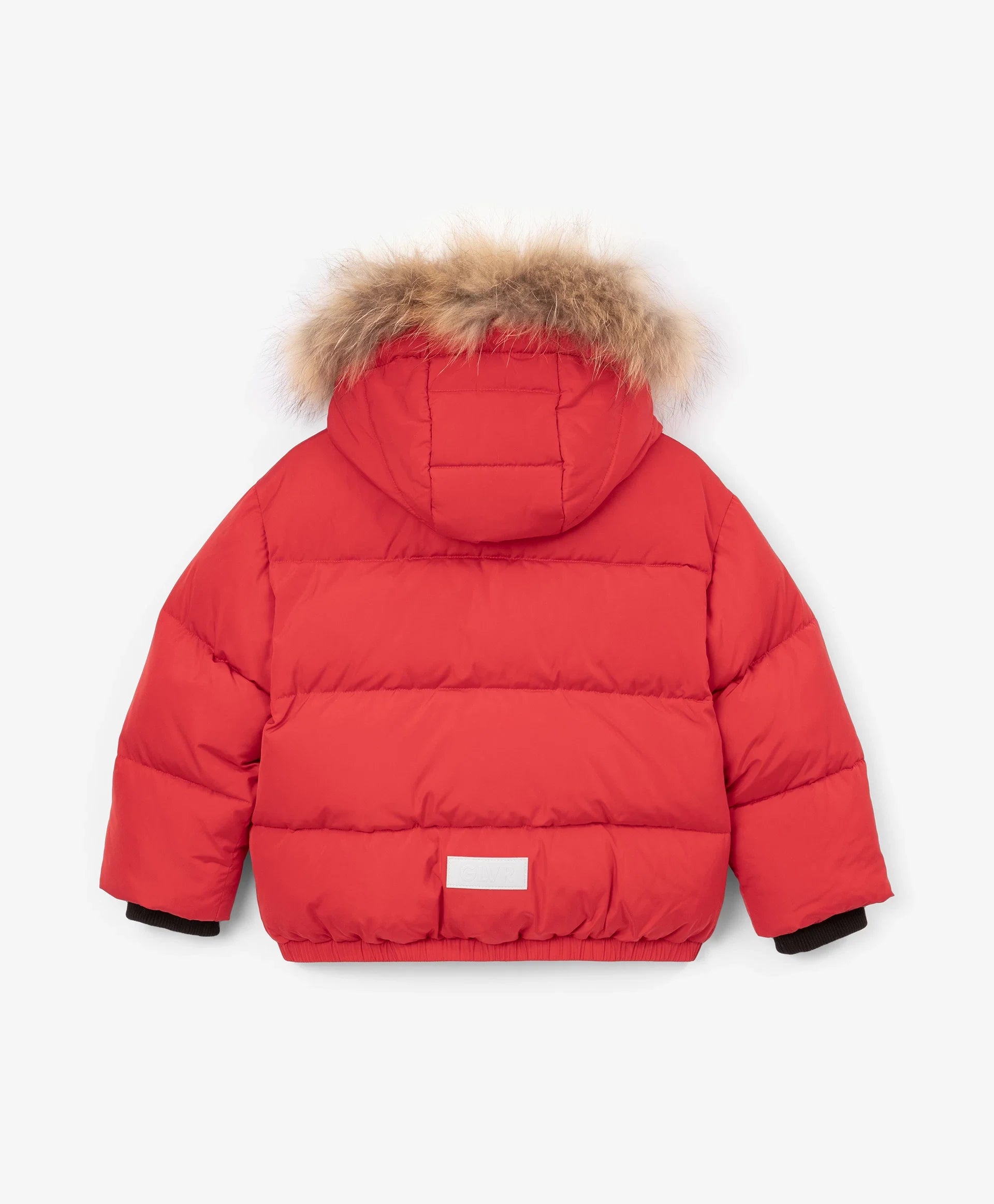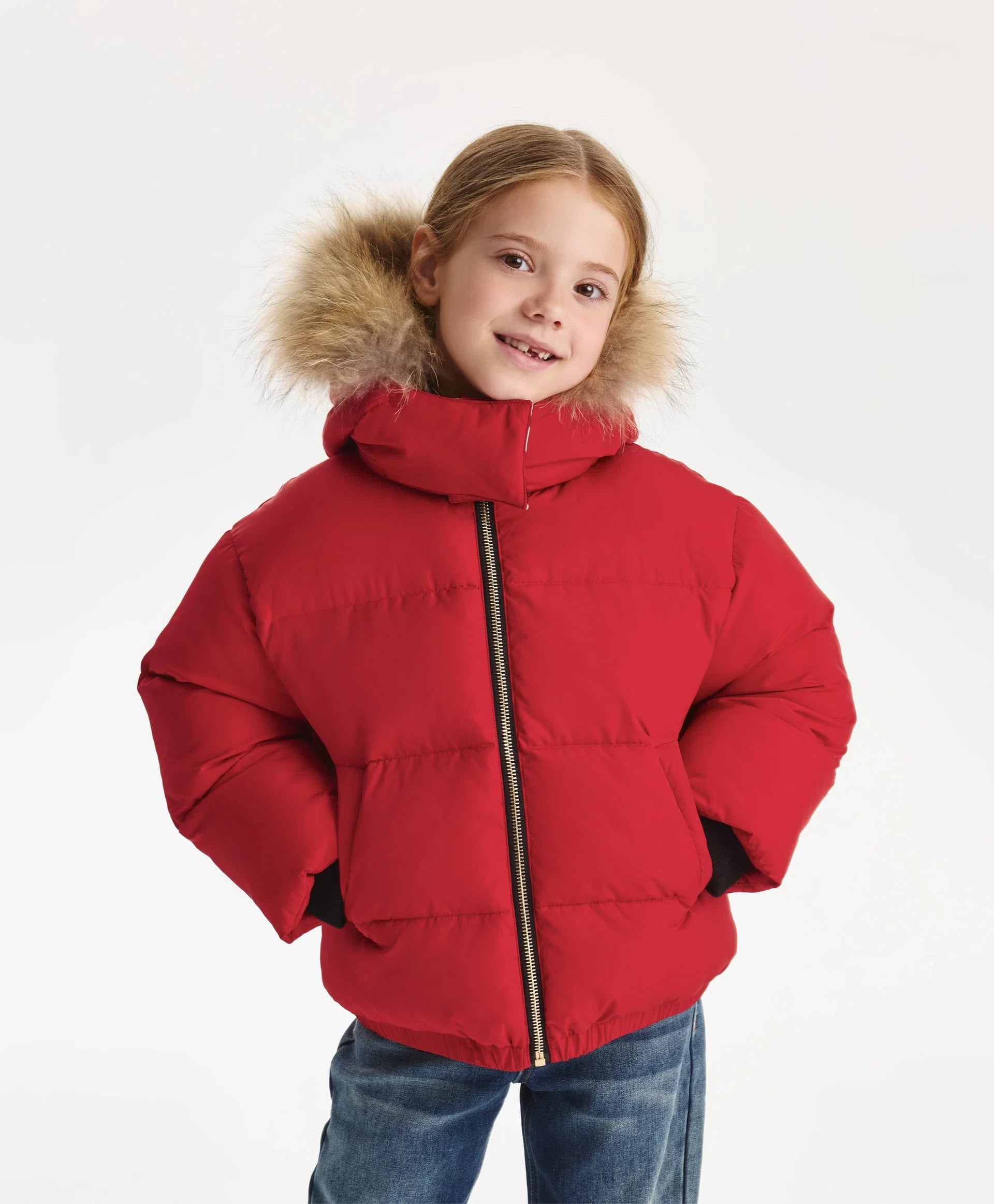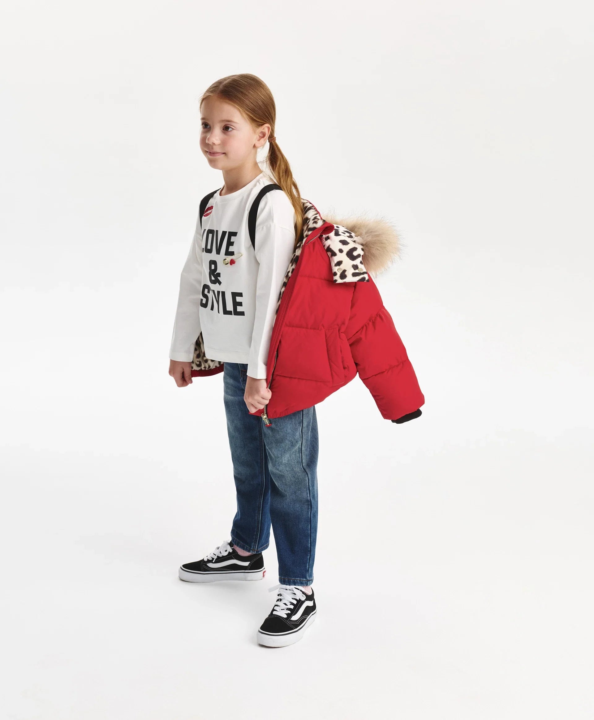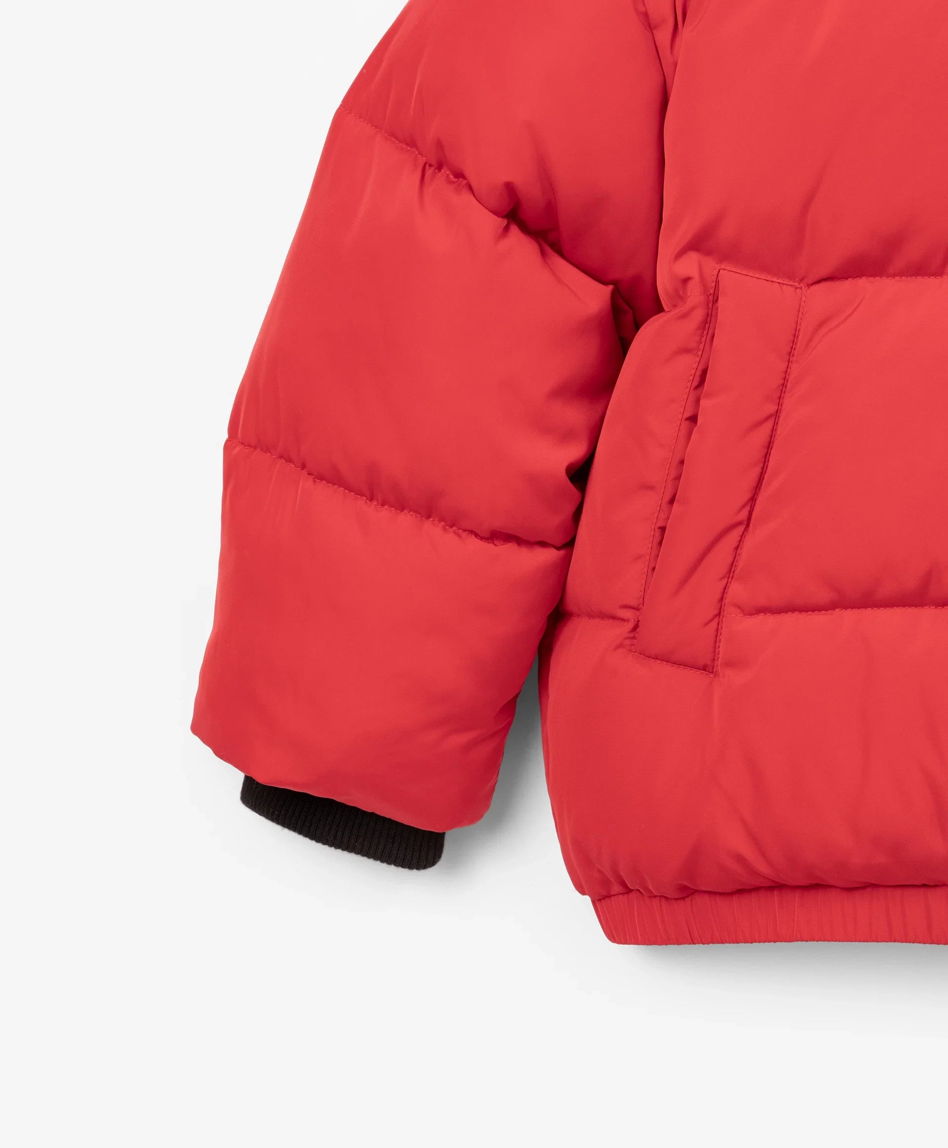 Geaca roșie matlasată, realizată din material impermeabil cu un ușor luciu satinat, este un accent puternic în garderoba de iarnă. Designul combină un material exterior uni cu o căptușeală leopard. Forma moale, voluminoasă de tip bomber, umplutura din puf artificial și manșetele din rib fac geaca extrem de confortabilă și rezistentă la vânt. Gluga detașabilă cu blană de raton detașabilă protejează în zilele cu zăpadă și ger. Bretelele elastice interioare permit purtarea pe spate ca un rucsac. Se închide cu fermoar cu cursor-inimioară, are buzunare tip paspoal și clapetă interioară anti-vânt. Pe spate este aplicat un chevron reflectorizant pentru siguranță pe întuneric.