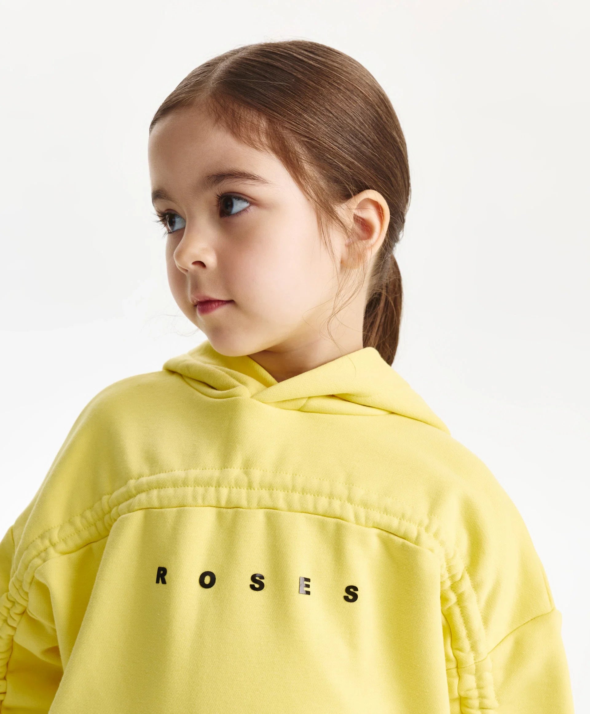 Hanoracul galben cu siluetă oversize moderată este creat pentru ținute de toamnă energice, stilate și dinamice. Este realizat din futter moale și flexibil, pe bază de bumbac, foarte plăcut la atingere. Elementul distinctiv îl reprezintă șnururile accent, care trec pe mâneci și pe partea frontală și se termină cu cordoane suspendate. Acestea nu sunt doar un detaliu de design, ci și o caracteristică funcțională, permițând reglarea drapajului și a lungimii mânecilor. Designul este completat de un print tipografic laconic.
