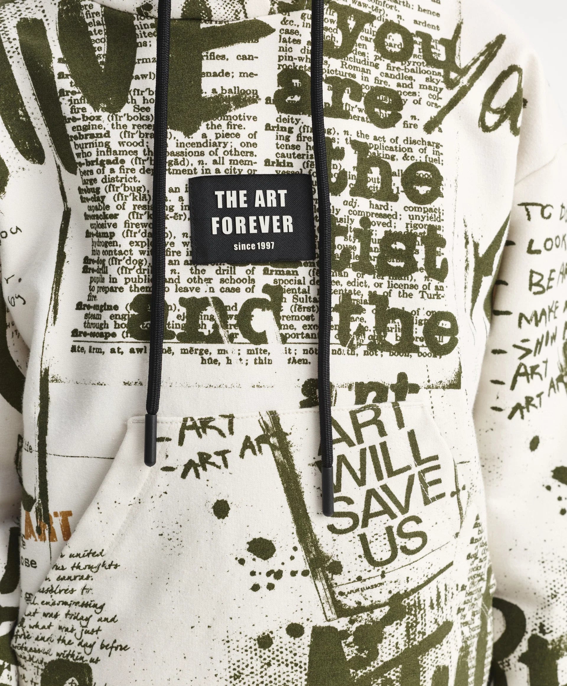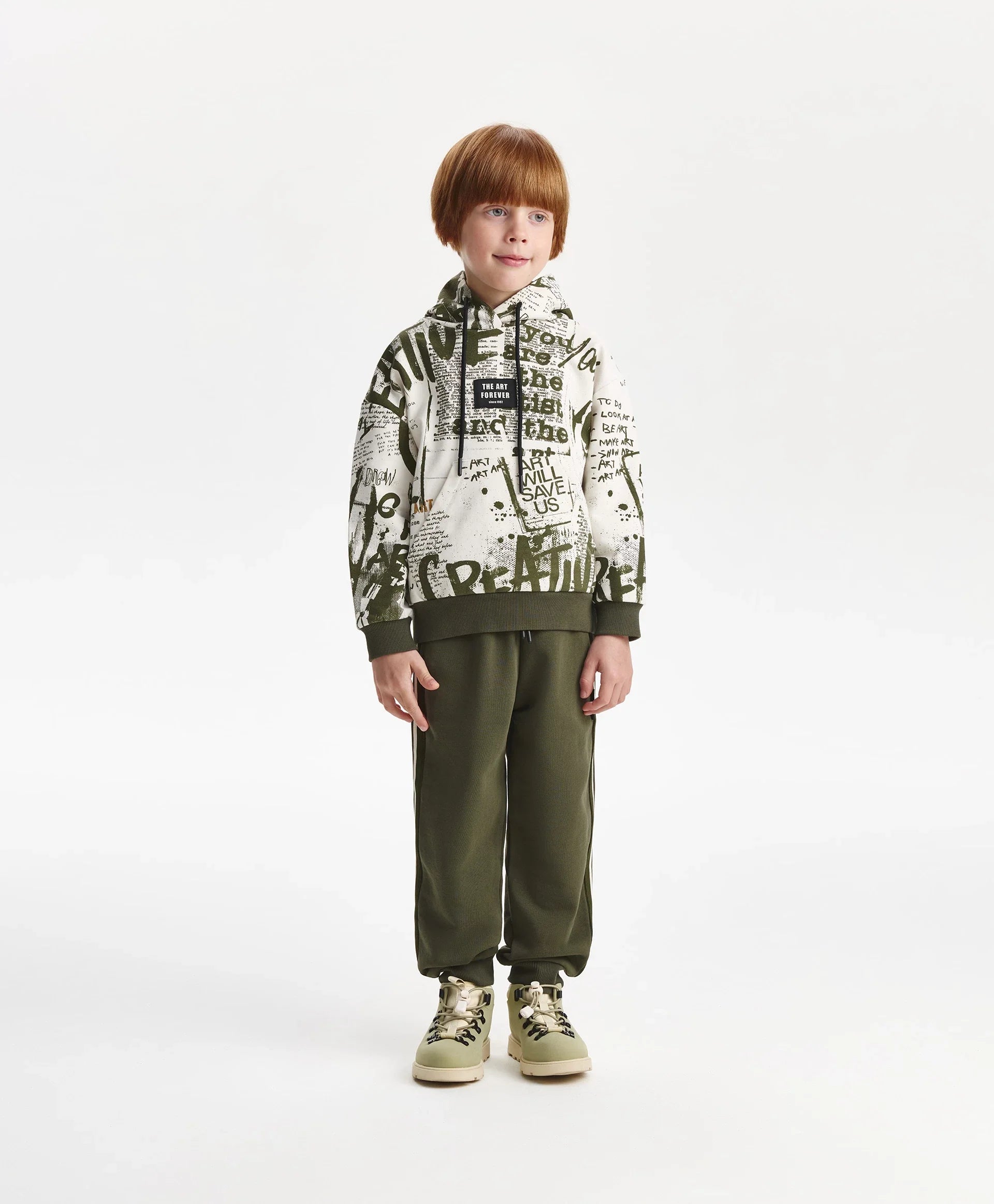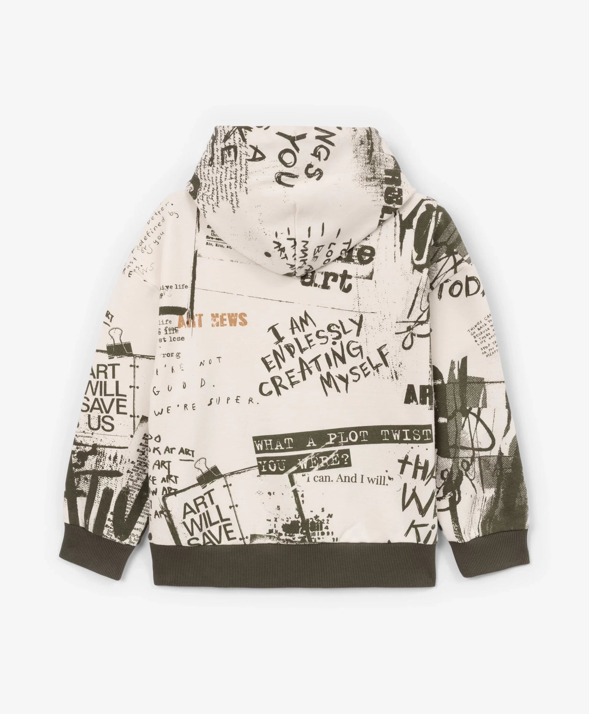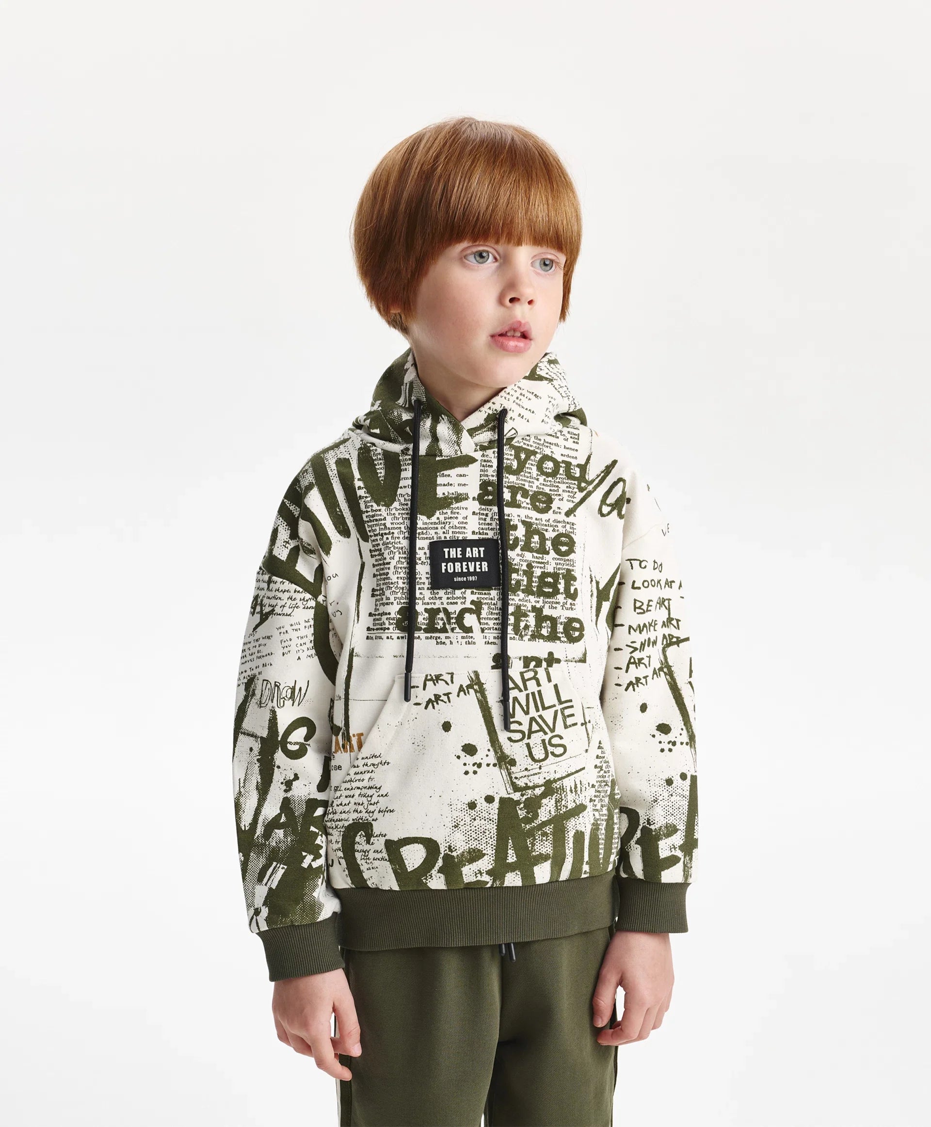 Hanoracul cu desen tipografic modern și dinamic, aplicat manual într-un stil îndrăzneț și expresiv, va conferi ținutei băiatului un caracter unic, făcând-o energică, stilată, practică și memorabilă. Hanorac cu linia umerilor coborâtă, realizat din french terry moale din bumbac, cu interior tip prosop. Detaliile clasice — gluga, buzunarul tip cangur, manșetele și tivul din rib — sunt completate de o aplicație originală, prin care pot fi trecute șnururi pentru accent.