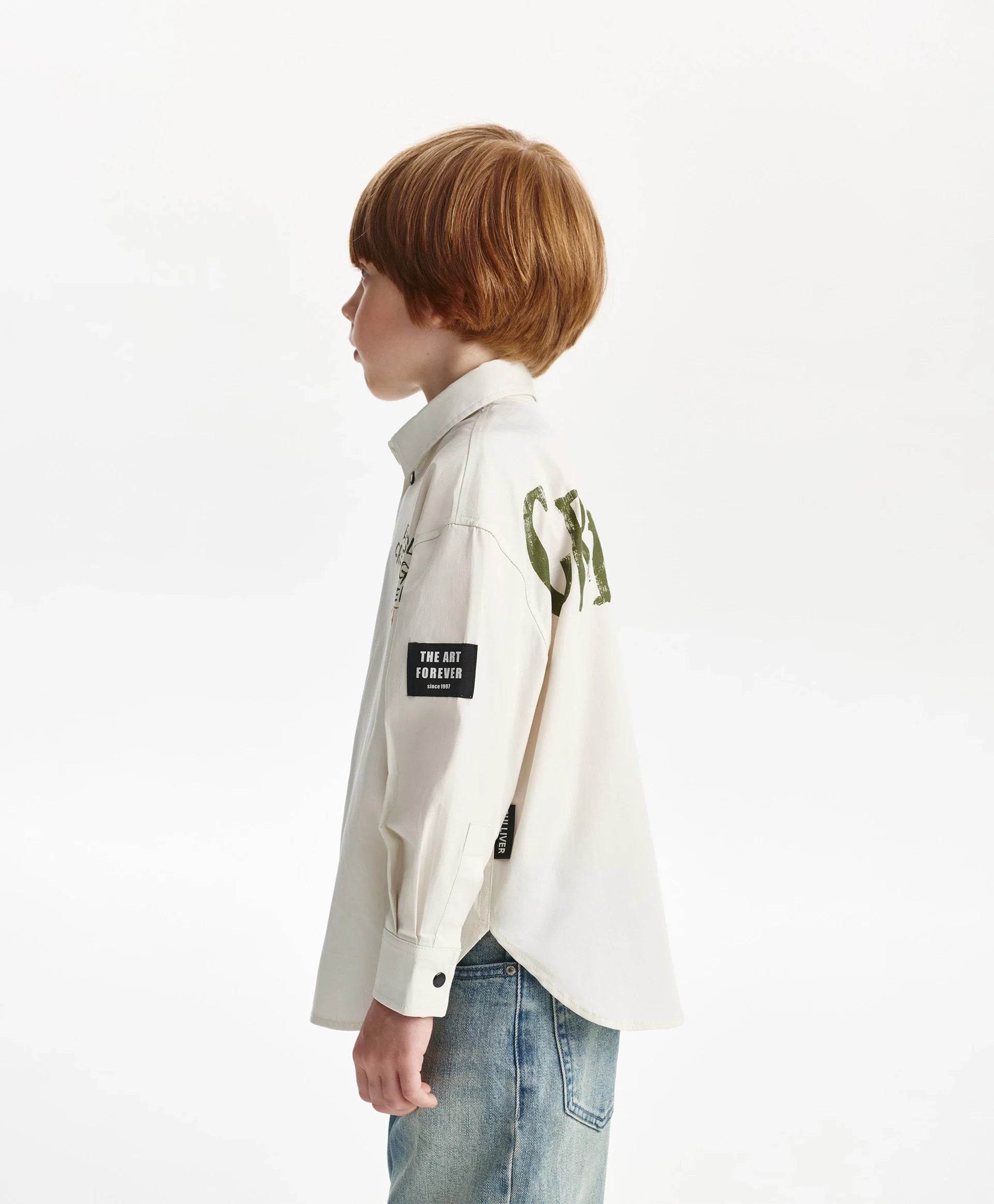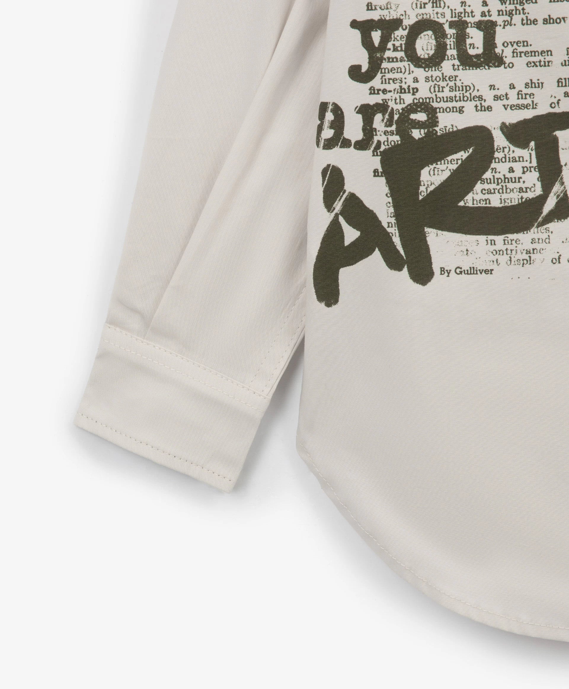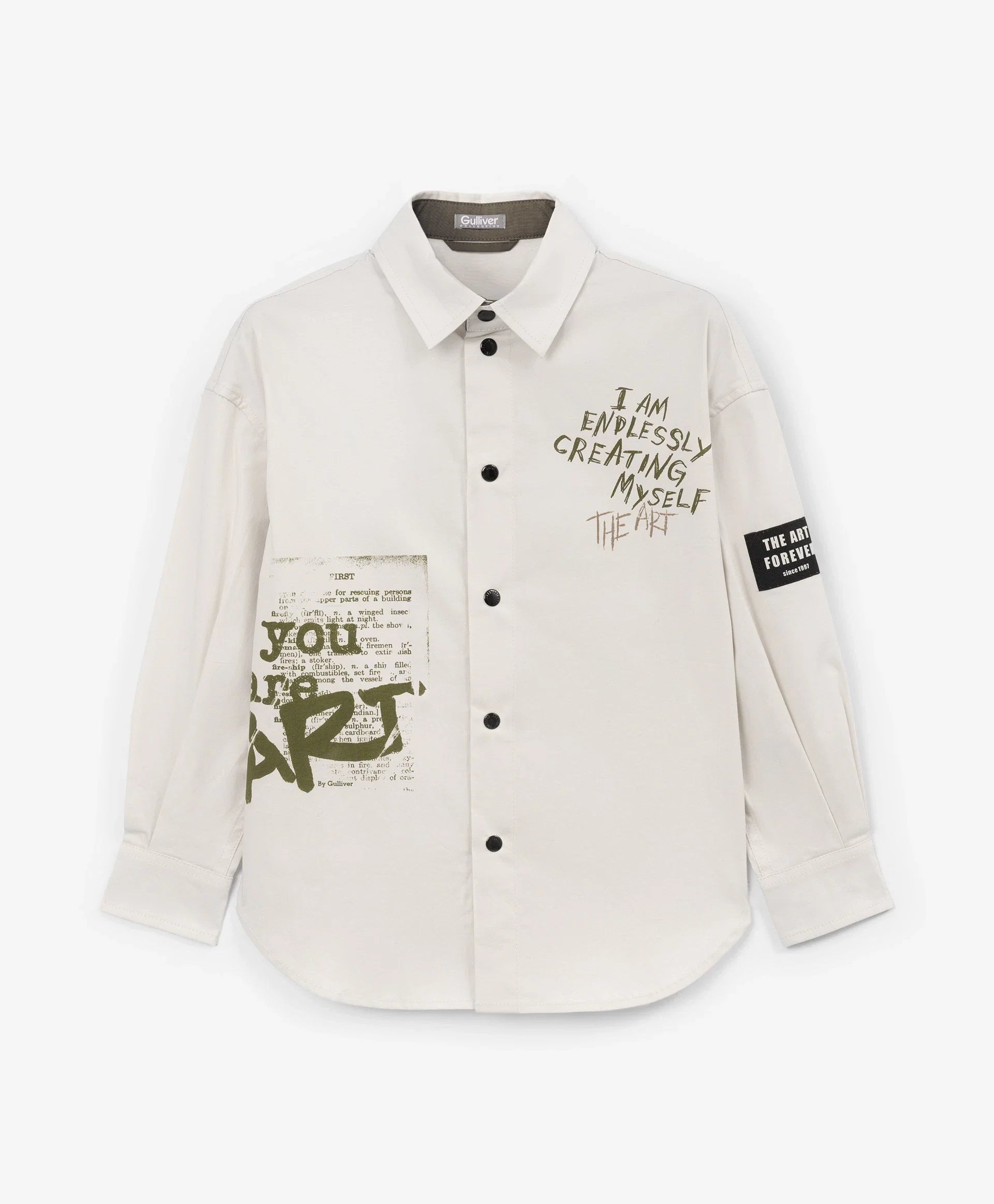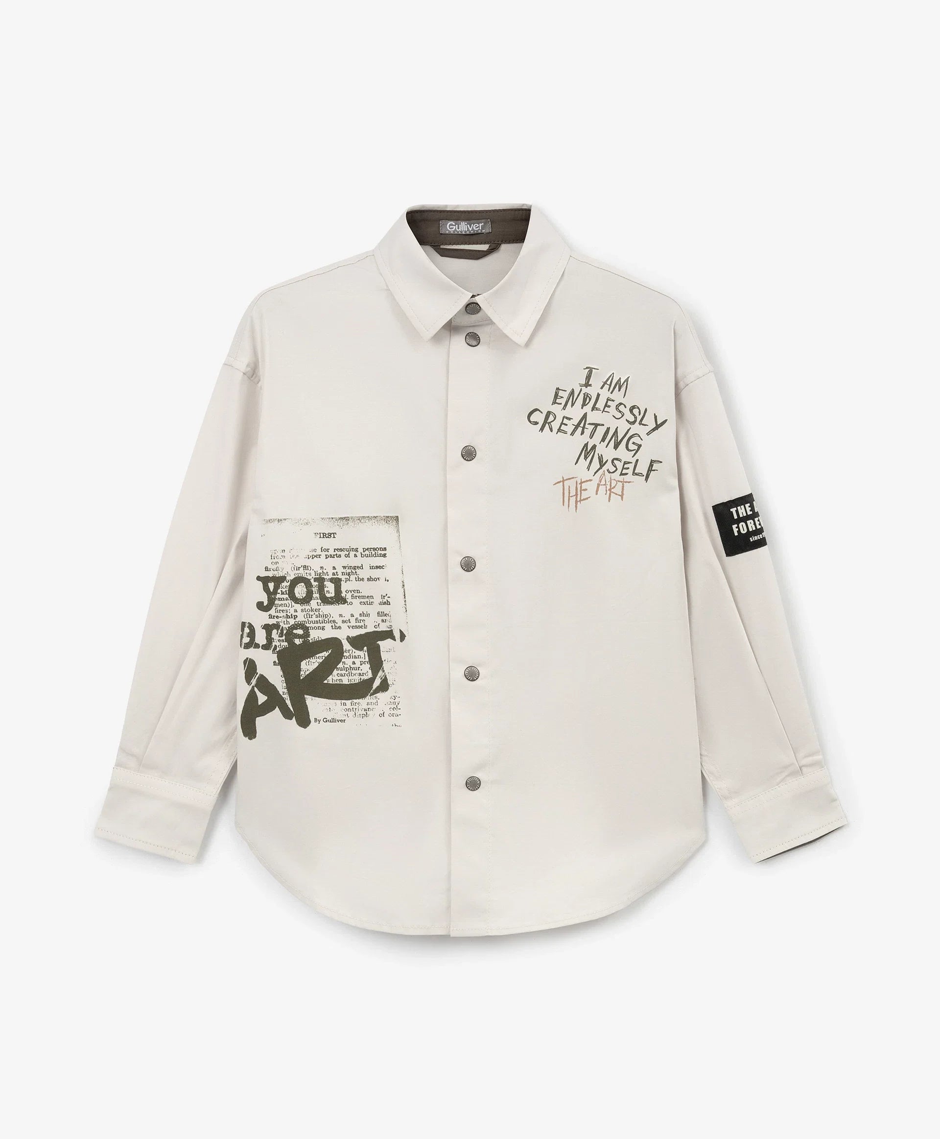 Cămașă pentru băiat cu mânecă lungă, siluetă dreaptă, gri cu print Gulliver