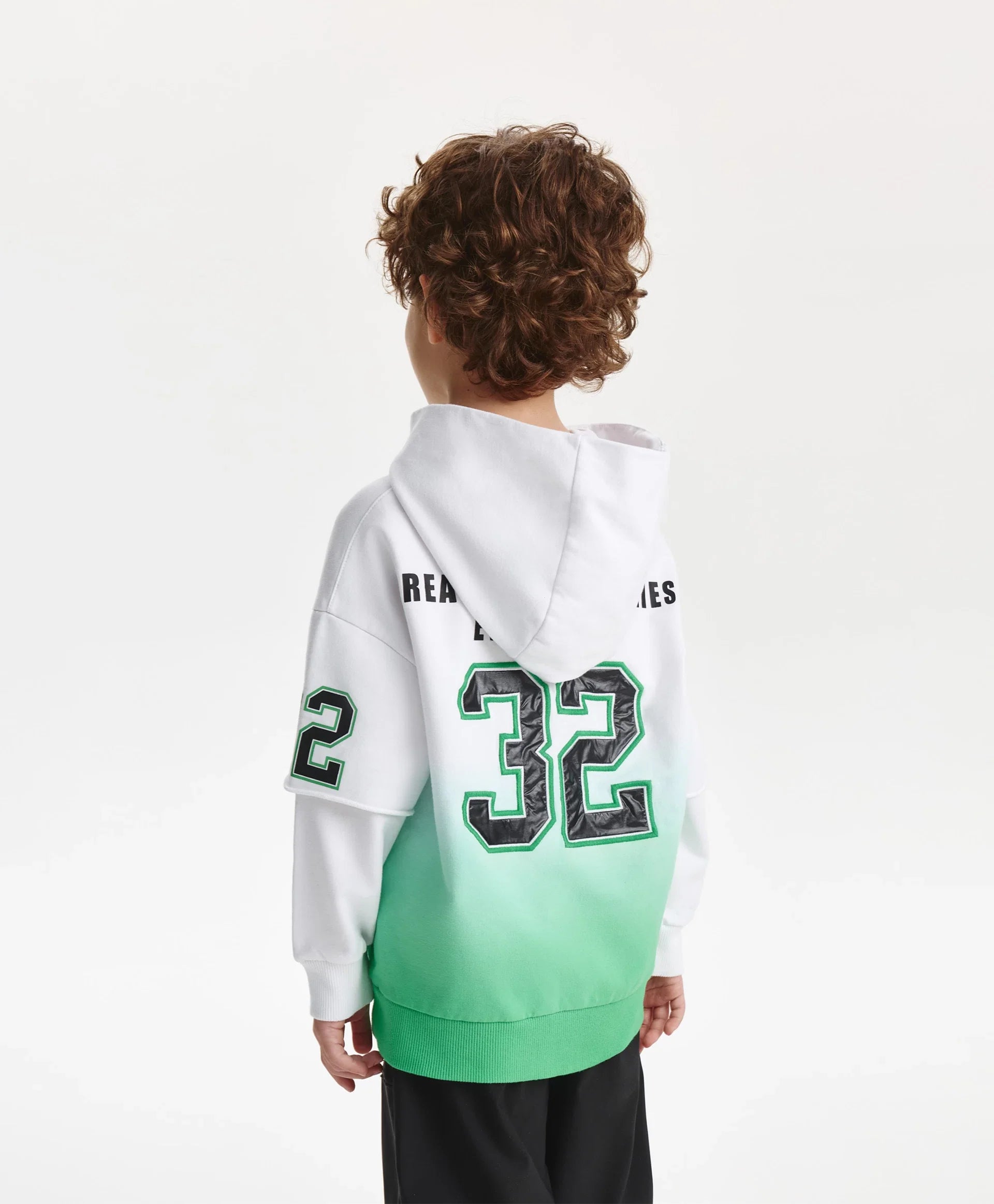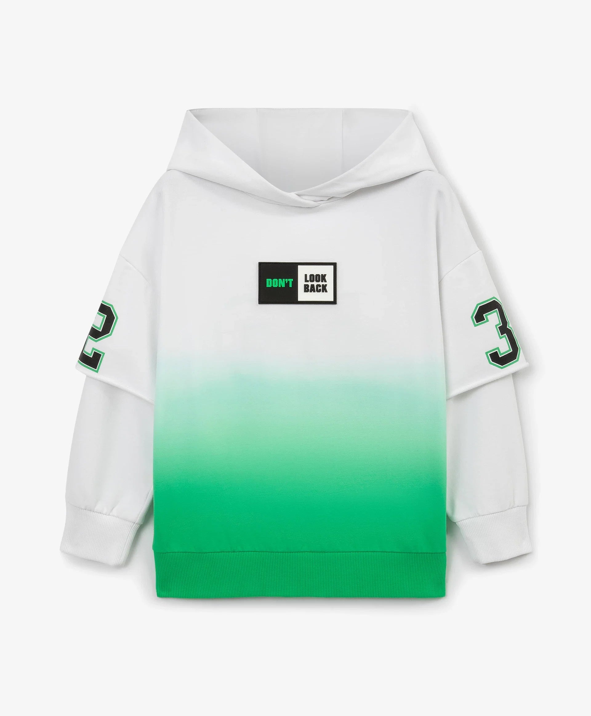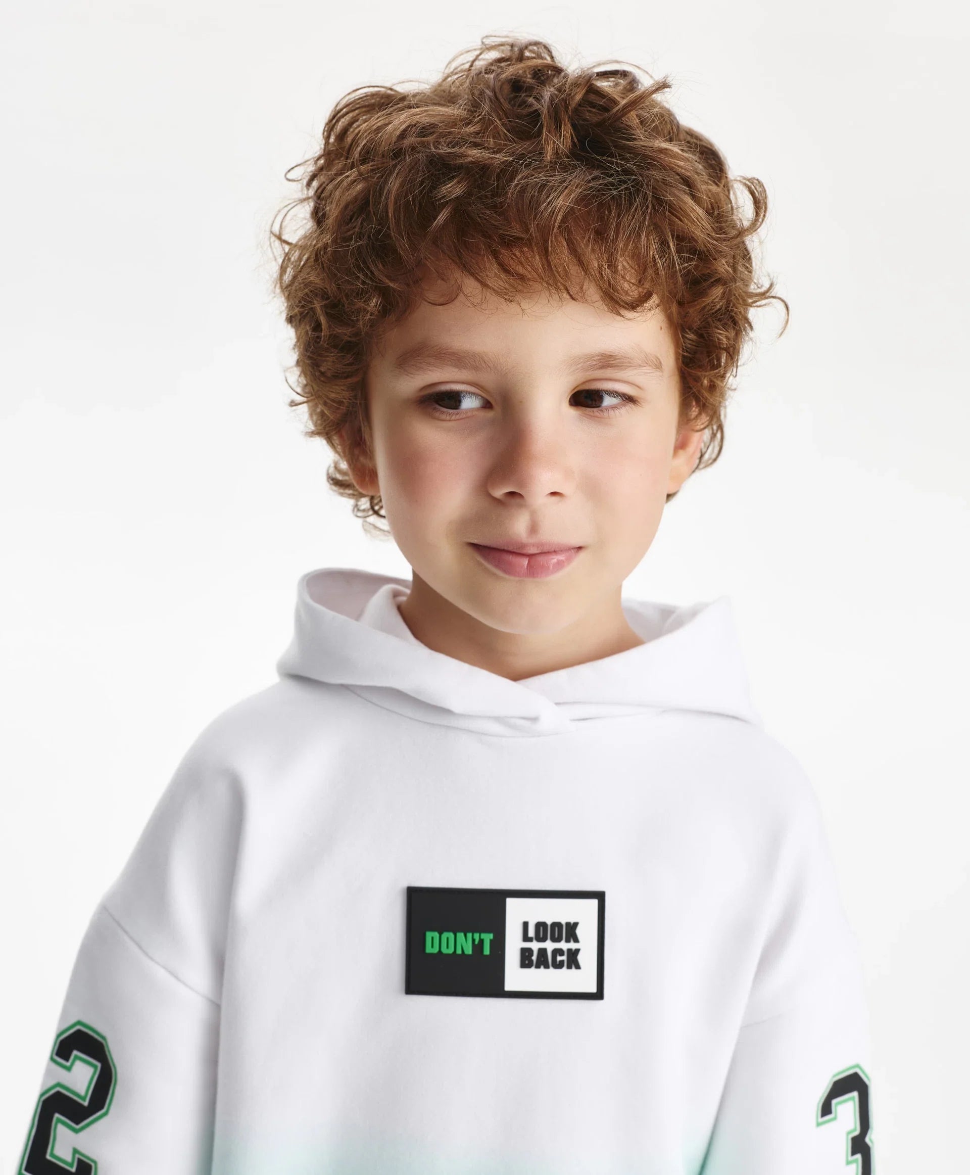 Hanoracul alb luminos va completa garderoba de toamnă-iarnă a băiatului, devenind baza unor ținute dinamice în stil sport. Hanoracul este realizat din french terry ușor din bumbac, cu interior moale tip prosop. Accentul special al modelului este tranziția cromatică în gradient, care îi conferă un caracter unic, precum și mânecile duble, ce creează iluzia unui efect modern de stratificare. Designul este completat de printuri tipografice mari, contrastante, și o aplicație discretă.