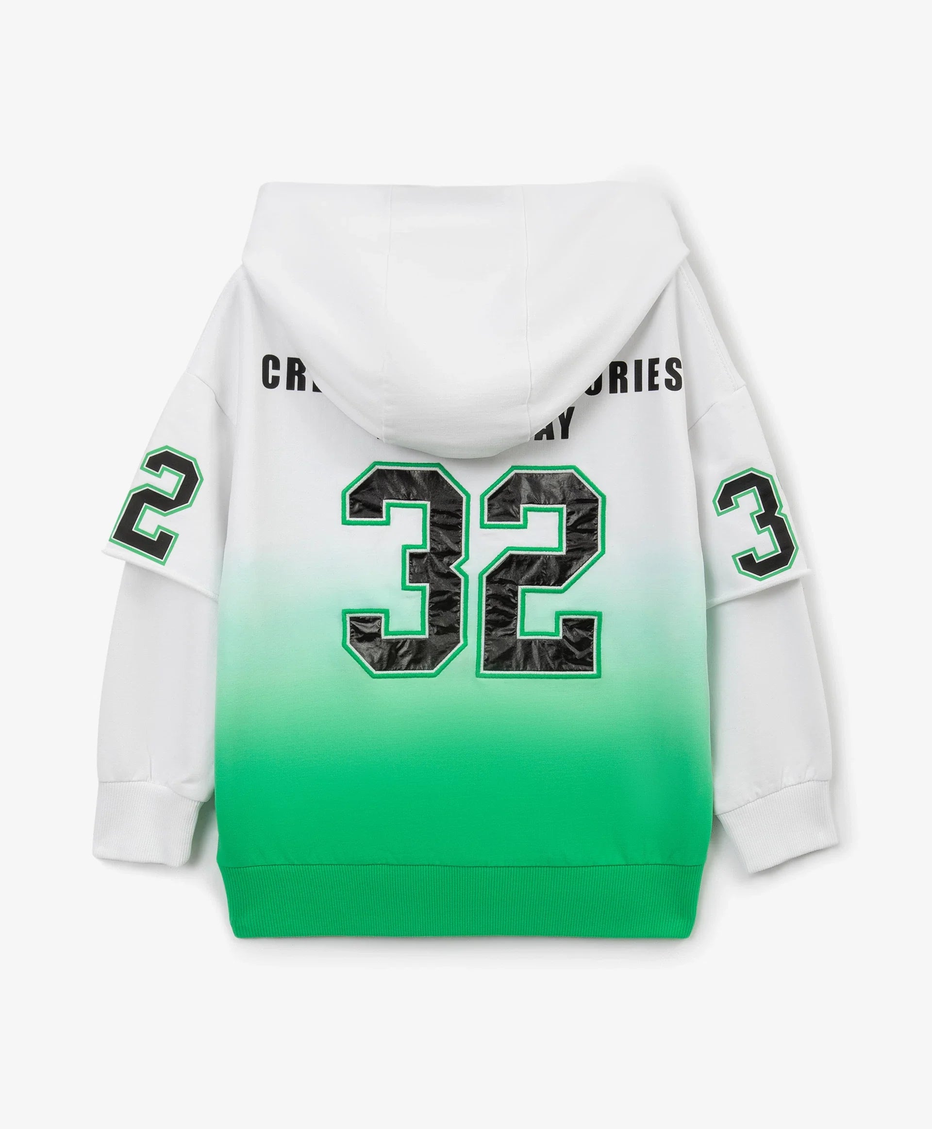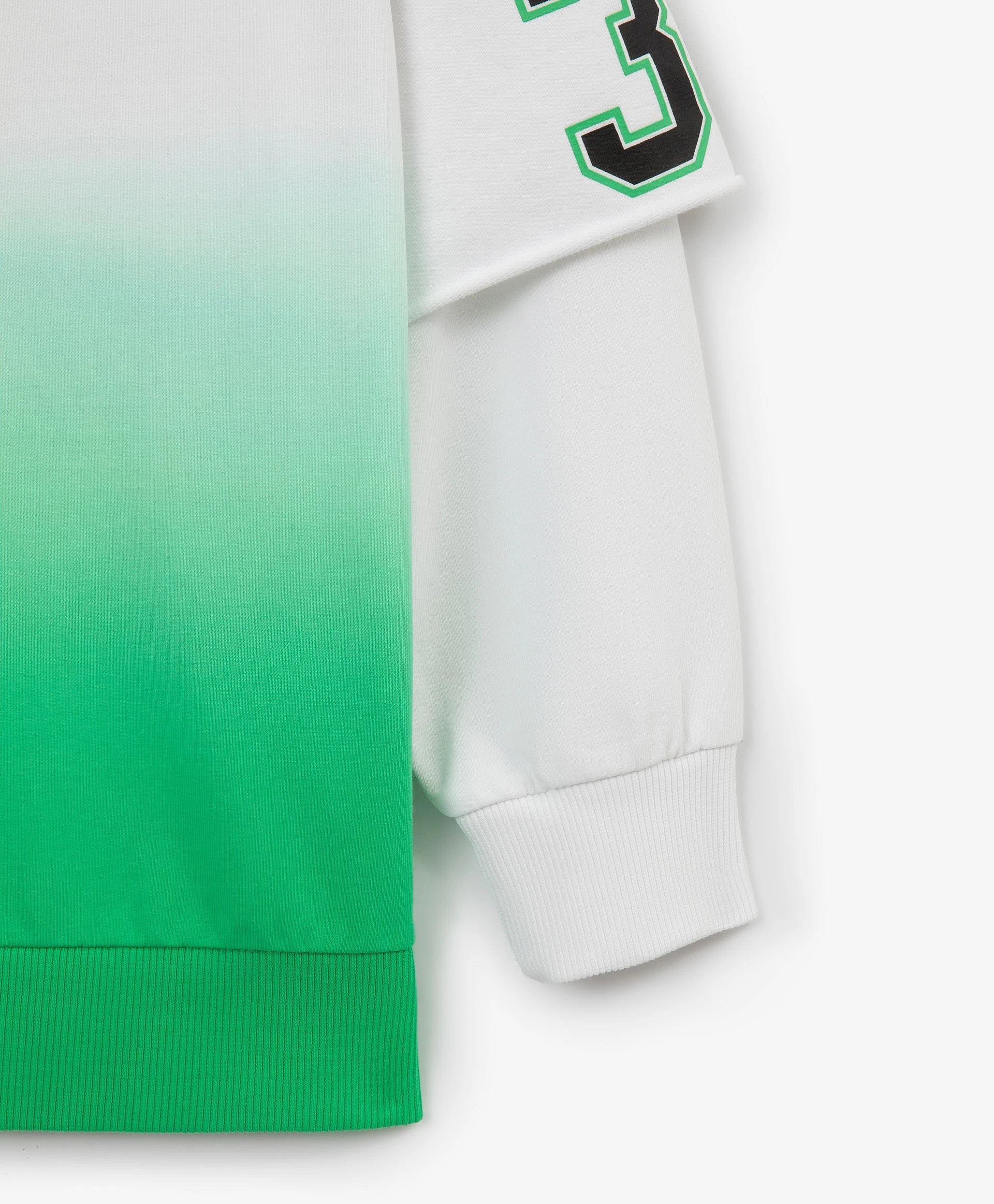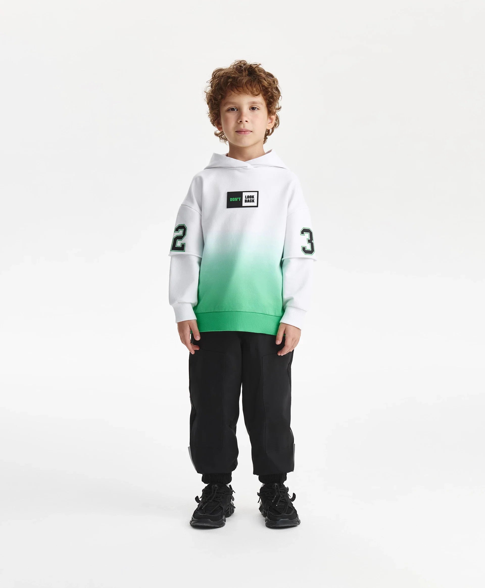 Hanoracul alb luminos va completa garderoba de toamnă-iarnă a băiatului, devenind baza unor ținute dinamice în stil sport. Hanoracul este realizat din french terry ușor din bumbac, cu interior moale tip prosop. Accentul special al modelului este tranziția cromatică în gradient, care îi conferă un caracter unic, precum și mânecile duble, ce creează iluzia unui efect modern de stratificare. Designul este completat de printuri tipografice mari, contrastante, și o aplicație discretă.