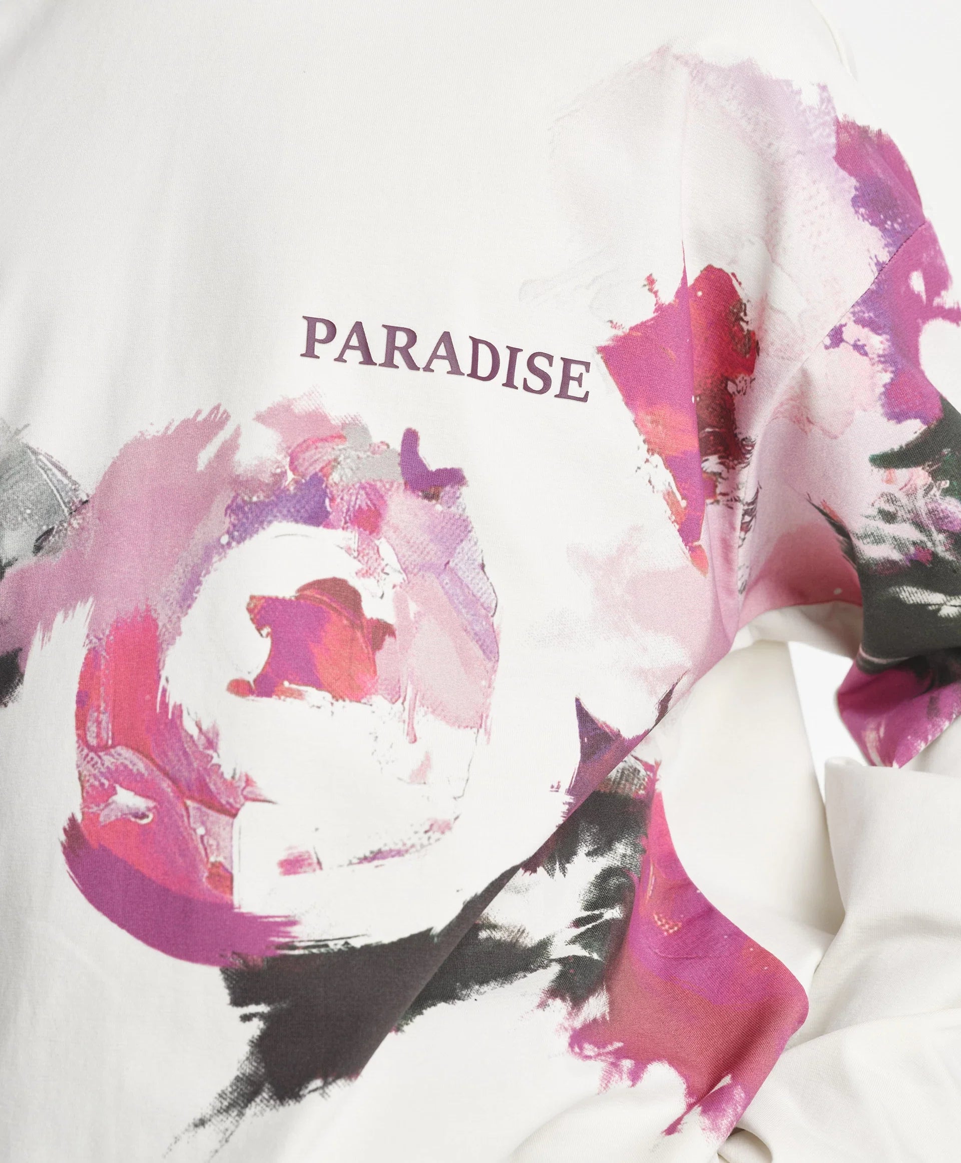 Bluză cu mânecă lungă, croială dreaptă lejeră și linia umerilor coborâtă – o piesă de bază stilată pentru timpul liber. Realizată din material moale din bumbac, plăcut la atingere. Accentul este un print abstract asimetric, care se continuă de pe partea frontală pe mânecă, completat de o grafică tipografică fină.