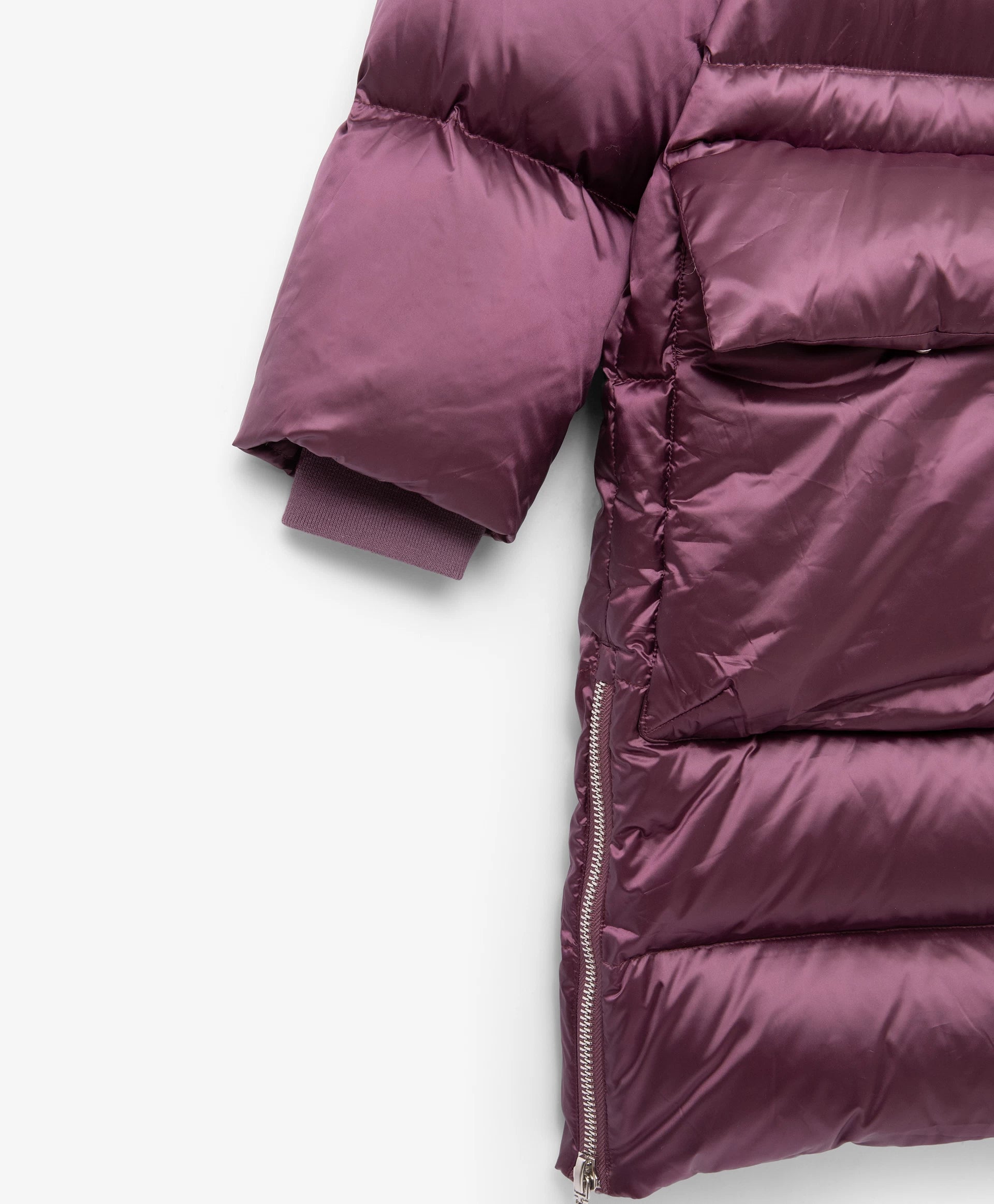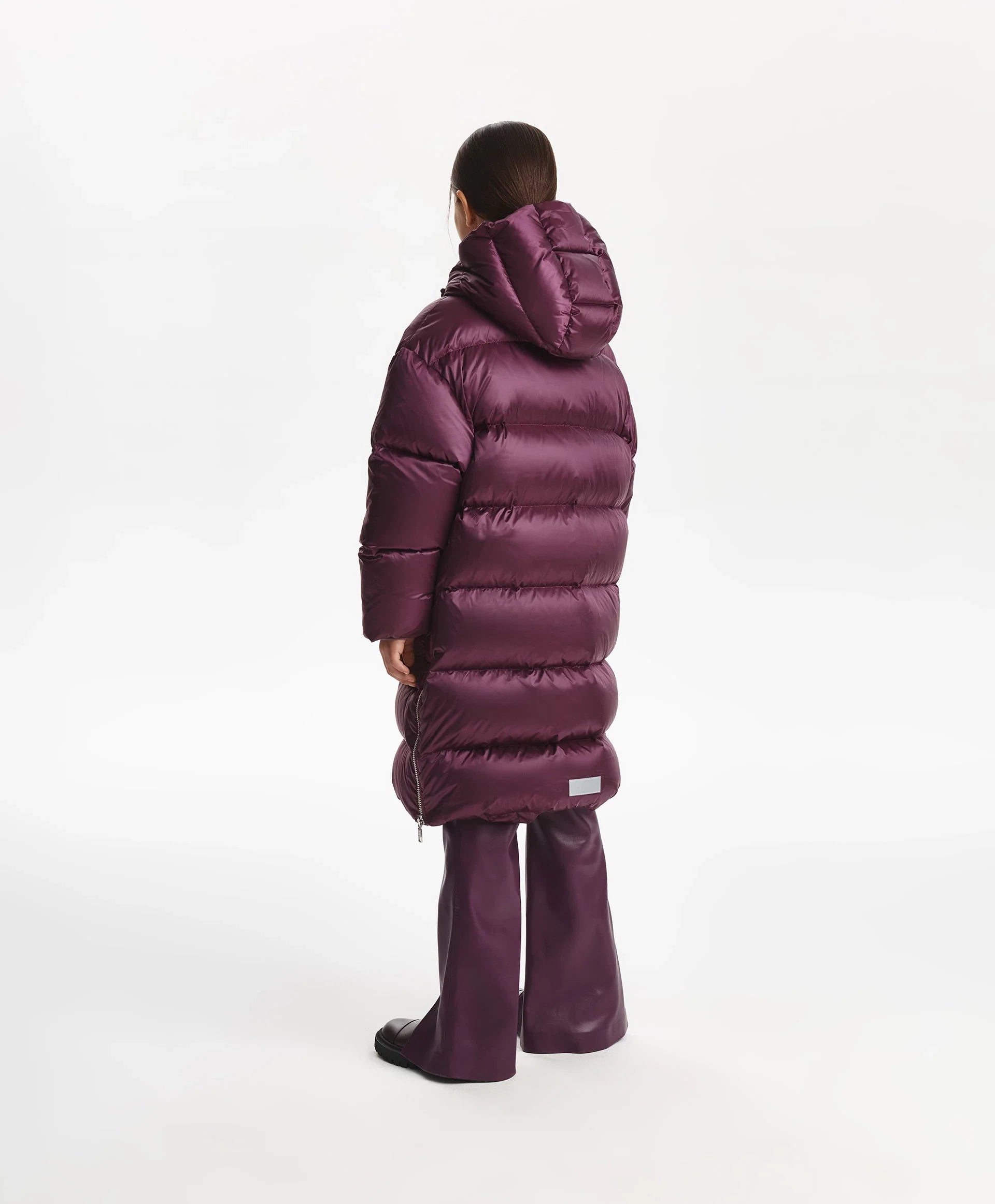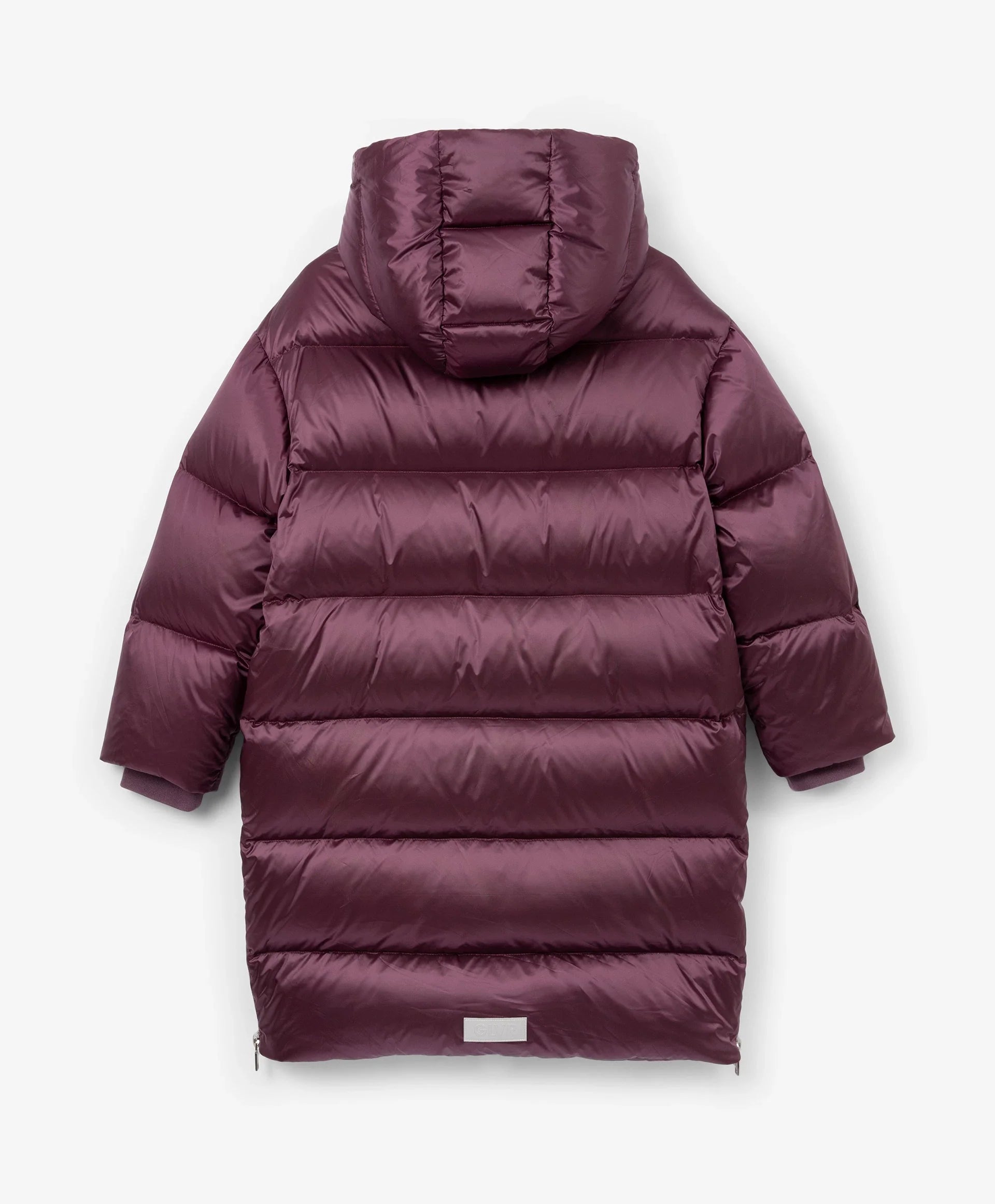Paltonul matlasat bordo din puf natural, realizat din material impermeabil lucios, va face față excelent condițiilor aspre de iarnă. Ușor și călduros, cu croială dreaptă lejeră și glugă confortabilă, este un exemplu de îmbrăcăminte exterioară stilată și practică. Două buzunare frontale mari cu clapă și capse, fermoare mici în cusăturile laterale pentru o mișcare mai ușoară, glugă adâncă cu șnururi, manșete din rib și clapetă exterioară anti-vânt cu capse asigură confortul. Se închide cu fermoar metalic cu cursoare branduite. Aplicația reflectorizantă de pe spate crește siguranța în întuneric.
