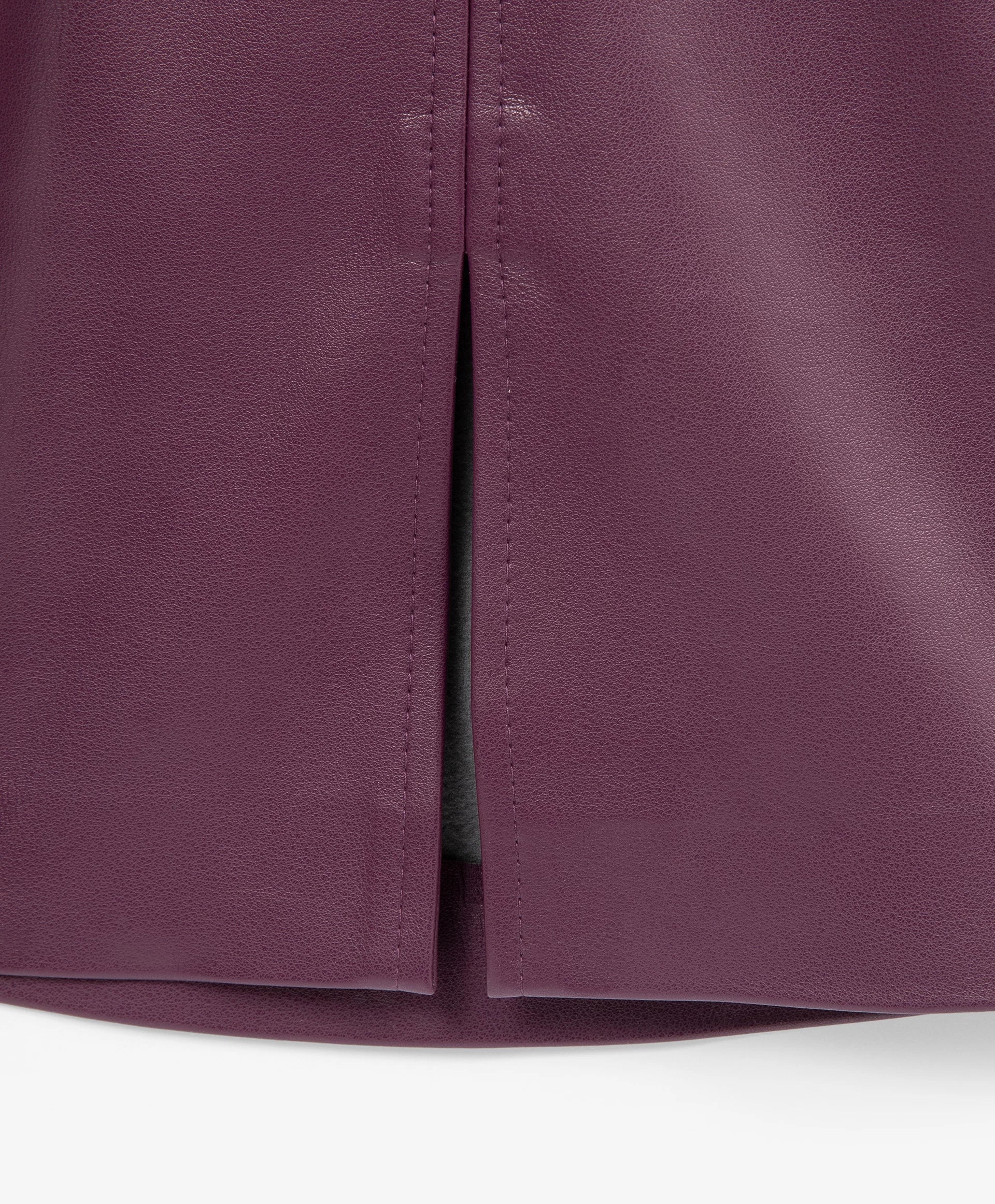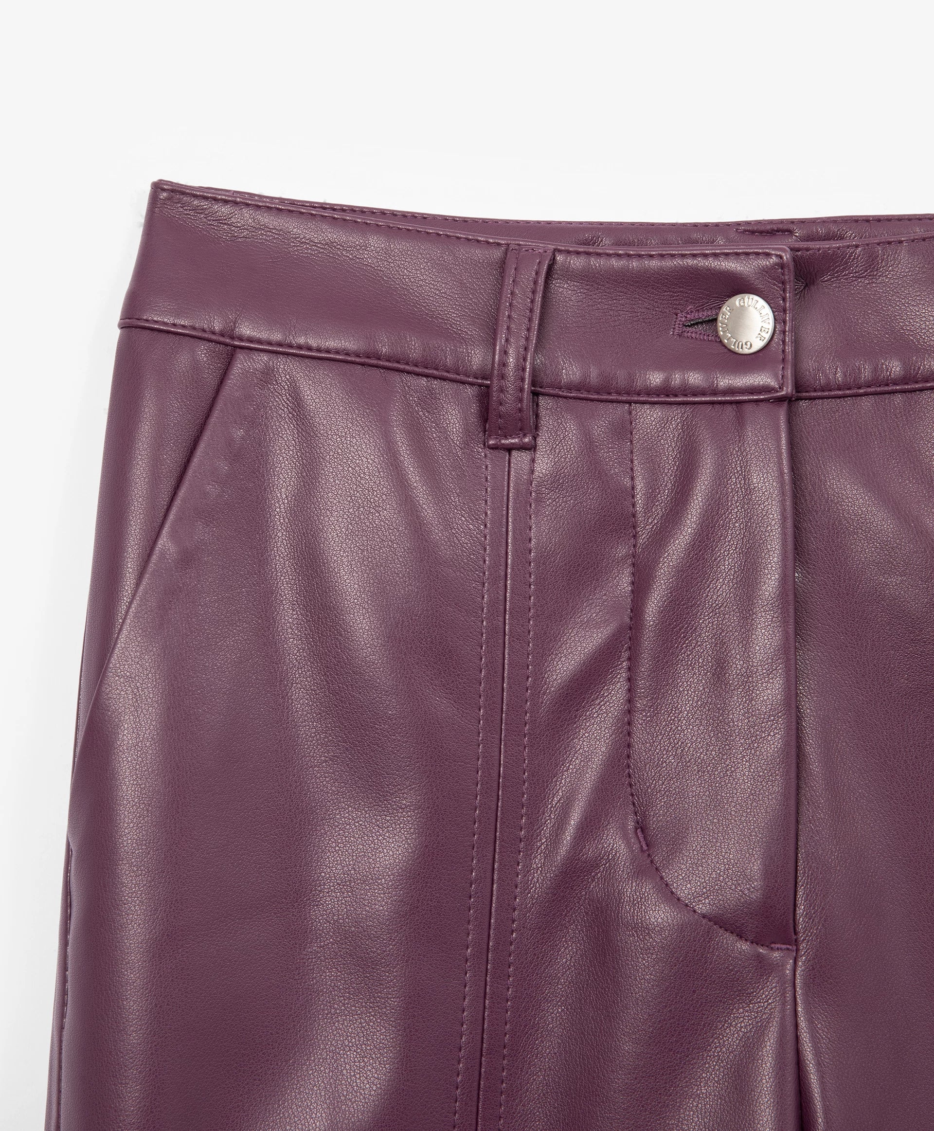 Pantalonii îndrăzneți și intens bordo din piele ecologică vor deveni un accent al ținutei de toamnă. Realizați din piele ecologică moale, care le conferă un aspect interesant și energic. Croiala dreaptă, cu ușoară evazare de la genunchi și despicături înalte în față, face pantalonii comozi și permite libertate de mișcare. Sunt prevăzuți cu buzunare laterale oblice și închidere cu nasture și fermoar, cu căptușeală din viscoză fină.