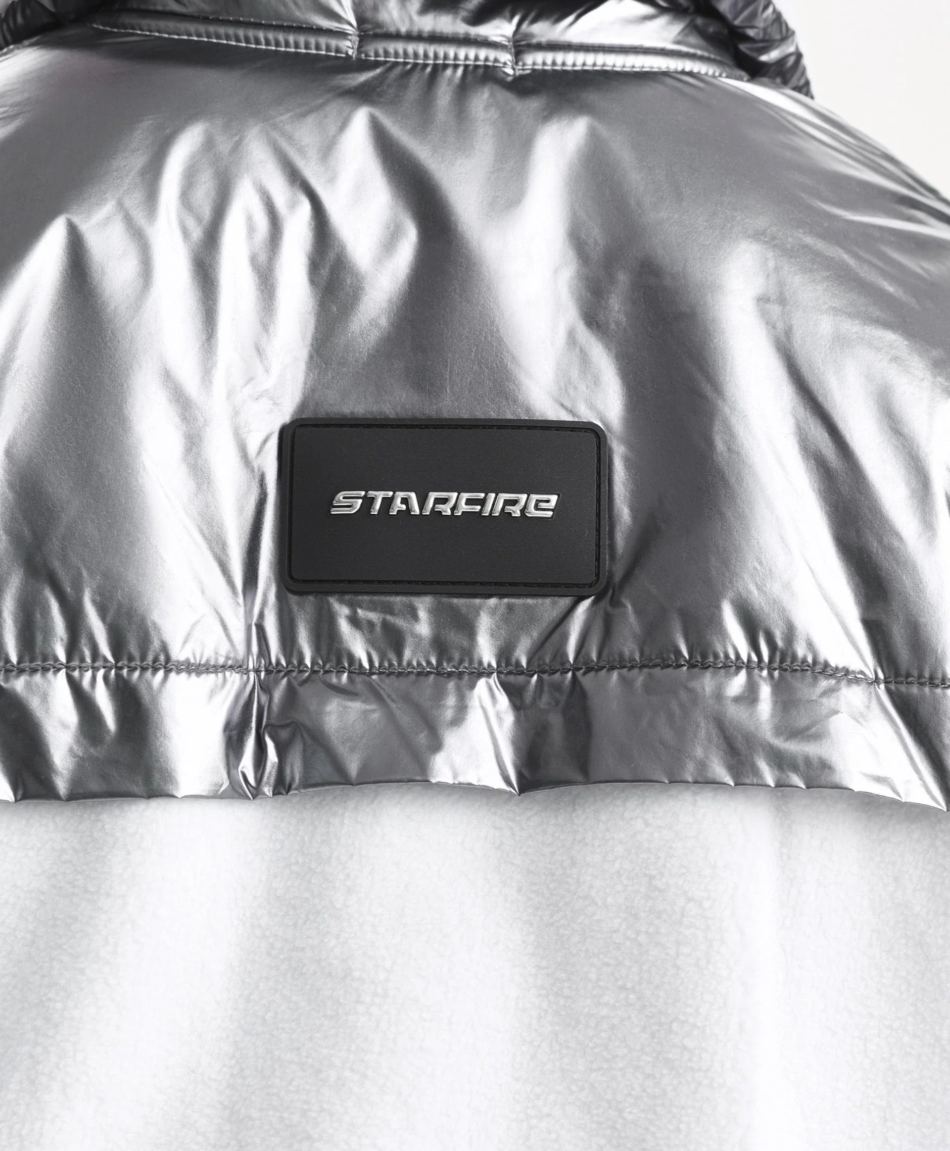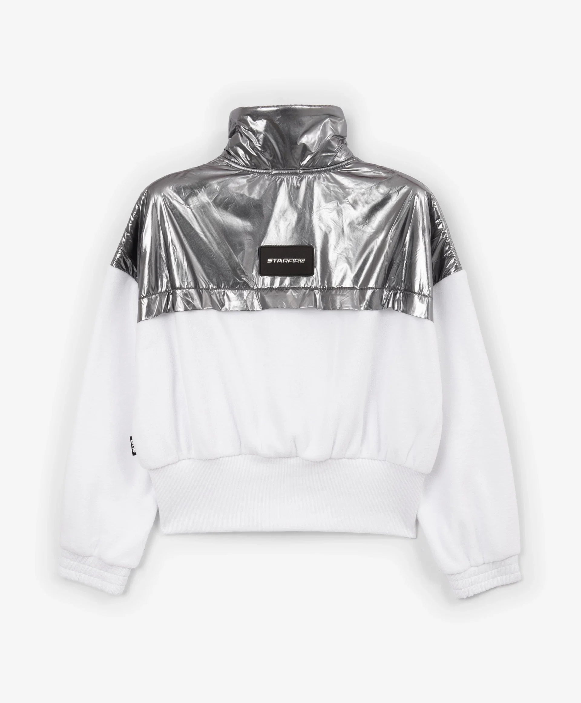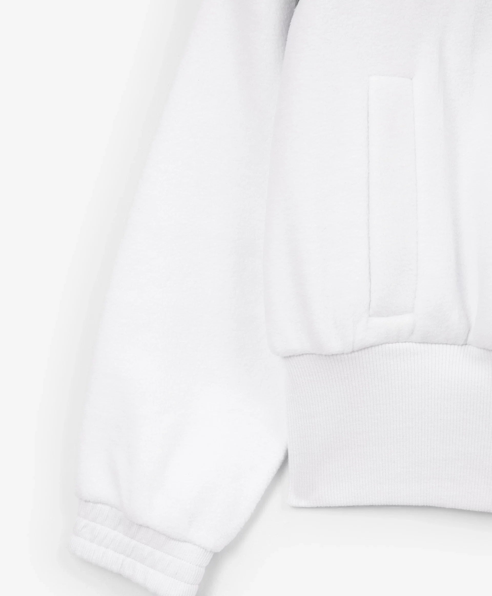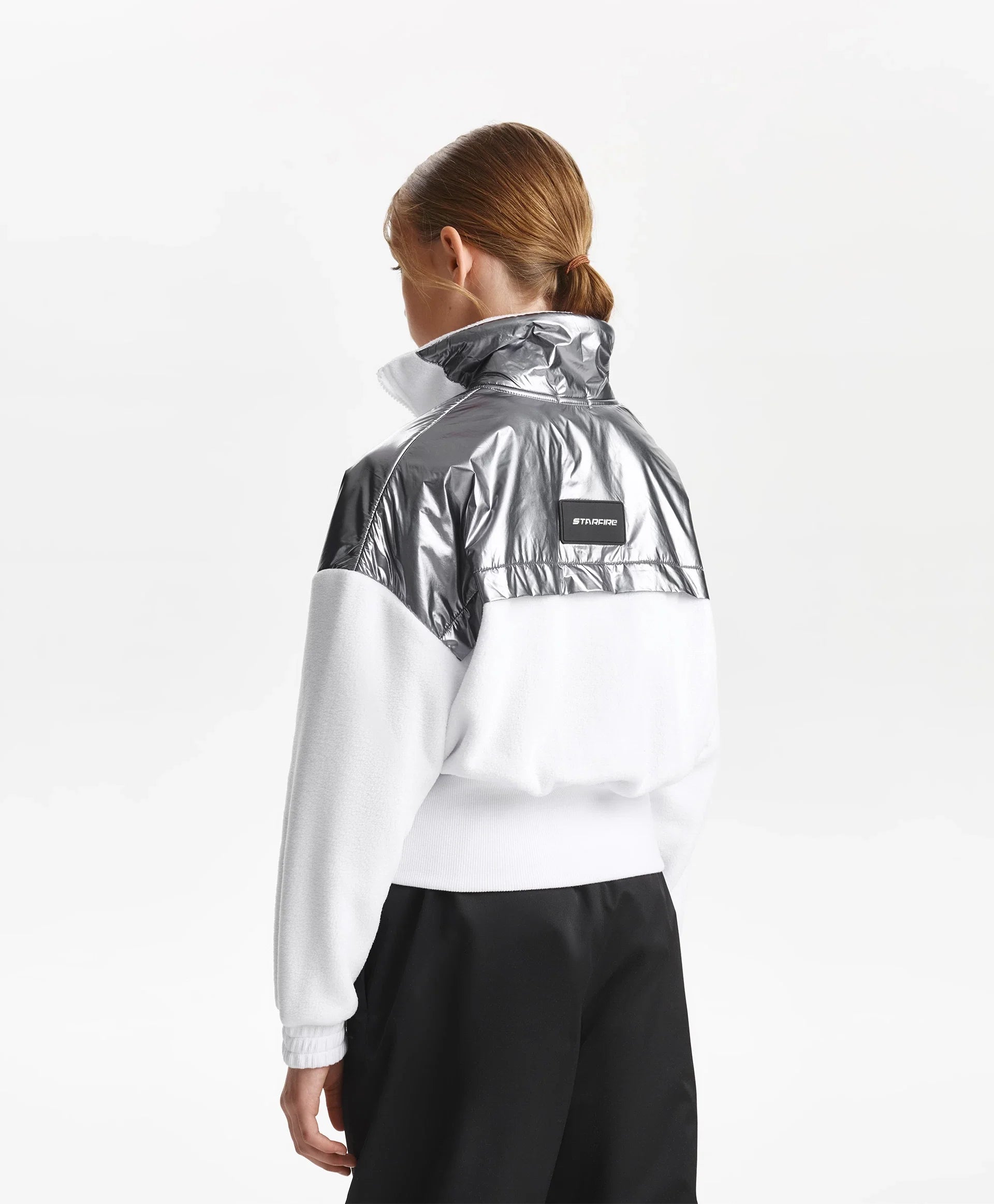 Hanoracul alb cu fermoar din polar este cheia unei ținute originale în stil sport! Inspirat de estetica futurismului, modelul combină un joc de texturi – polar moale și confortabil și material lucios cu finisaj argintiu. Talia largă din rib și gulerul înalt conferă modelului dinamism și expresivitate. Buzunarele tip paspoal asigură confort la purtare. Pe spate este aplicată o aplicație din cauciuc cu elemente tipografice. Hanoracul se închide cu fermoar.
