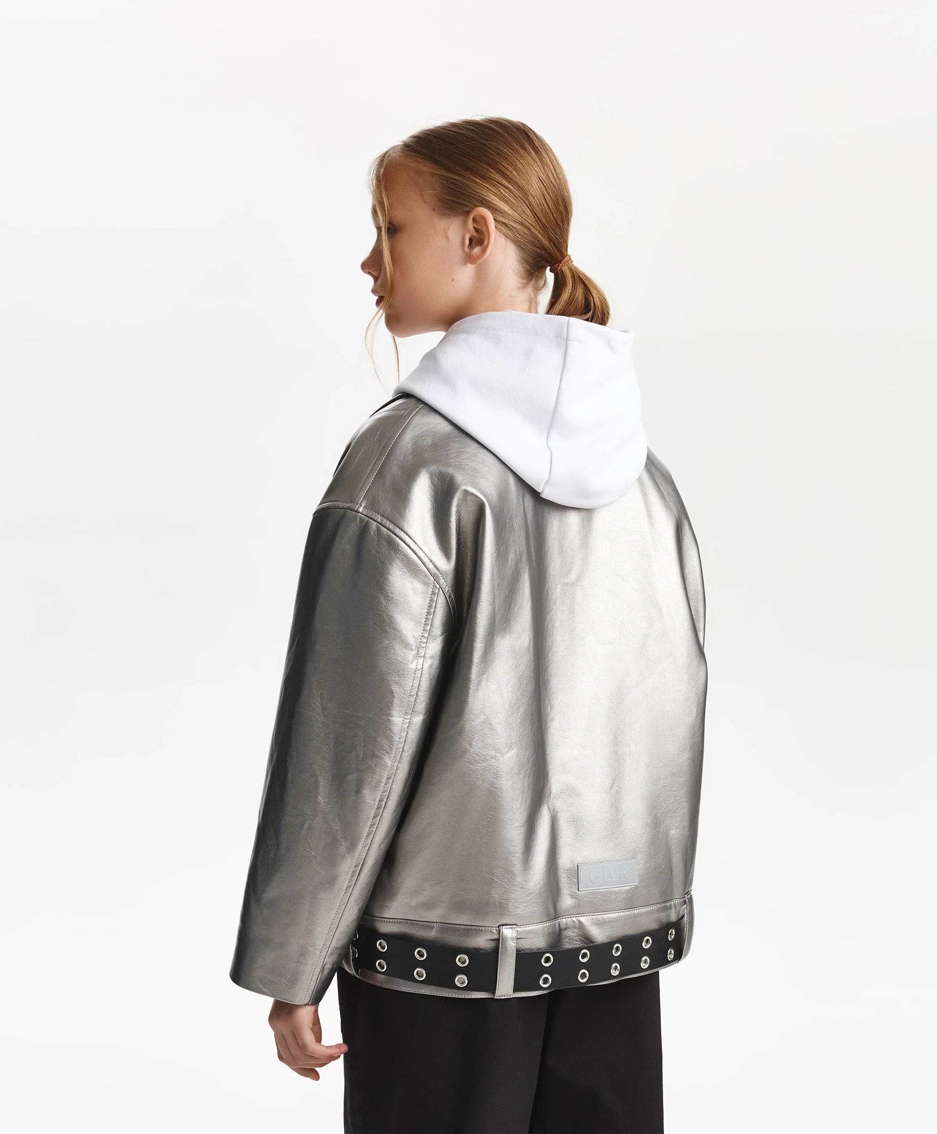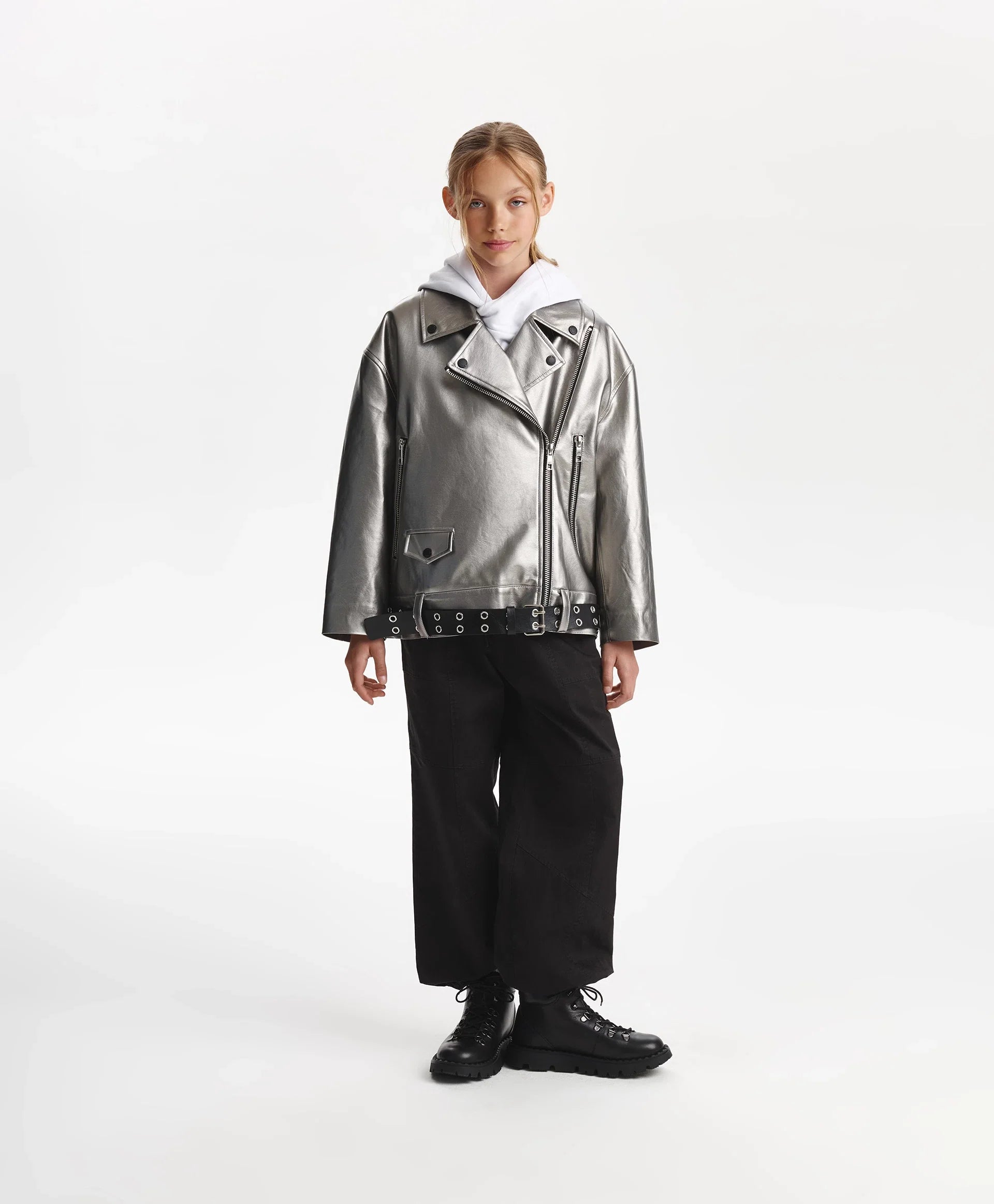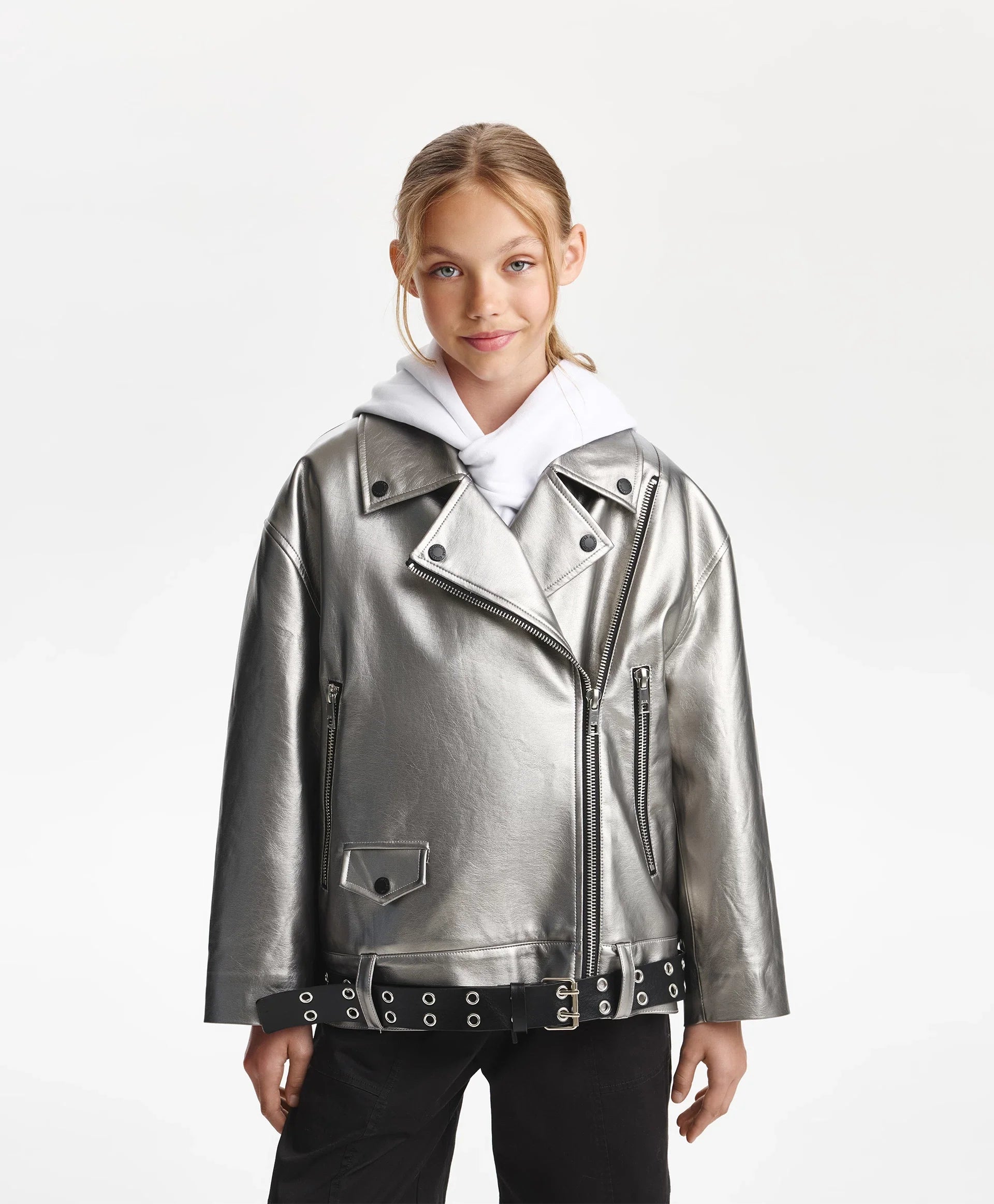 Culoarea argintie intensă și spiritul rebel, ușor de recunoscut, fac din geaca din piele o alegere excelentă pentru ținutele de toamnă ale fetei. Geaca, cu un strat subțire de vatelină și căptușeală moale, este realizată din piele ecologică impermeabilă, care ca aspect, plasticitate și atingere amintește de pielea naturală. Se potrivește perfect atât într-o garderobă sport, cât și casual, adăugând un plus de atitudine oricărei ținute. Modelul are toate atributele stilistice și funcționale ale unei jachete biker: guler tip rever, închidere asimetrică, buzunare cu fermoar, curea detașabilă – o adevărată descoperire pentru fetele care iubesc stilul biker rebel. Pe spate există o aplicație reflectorizantă pentru siguranță pe întuneric.