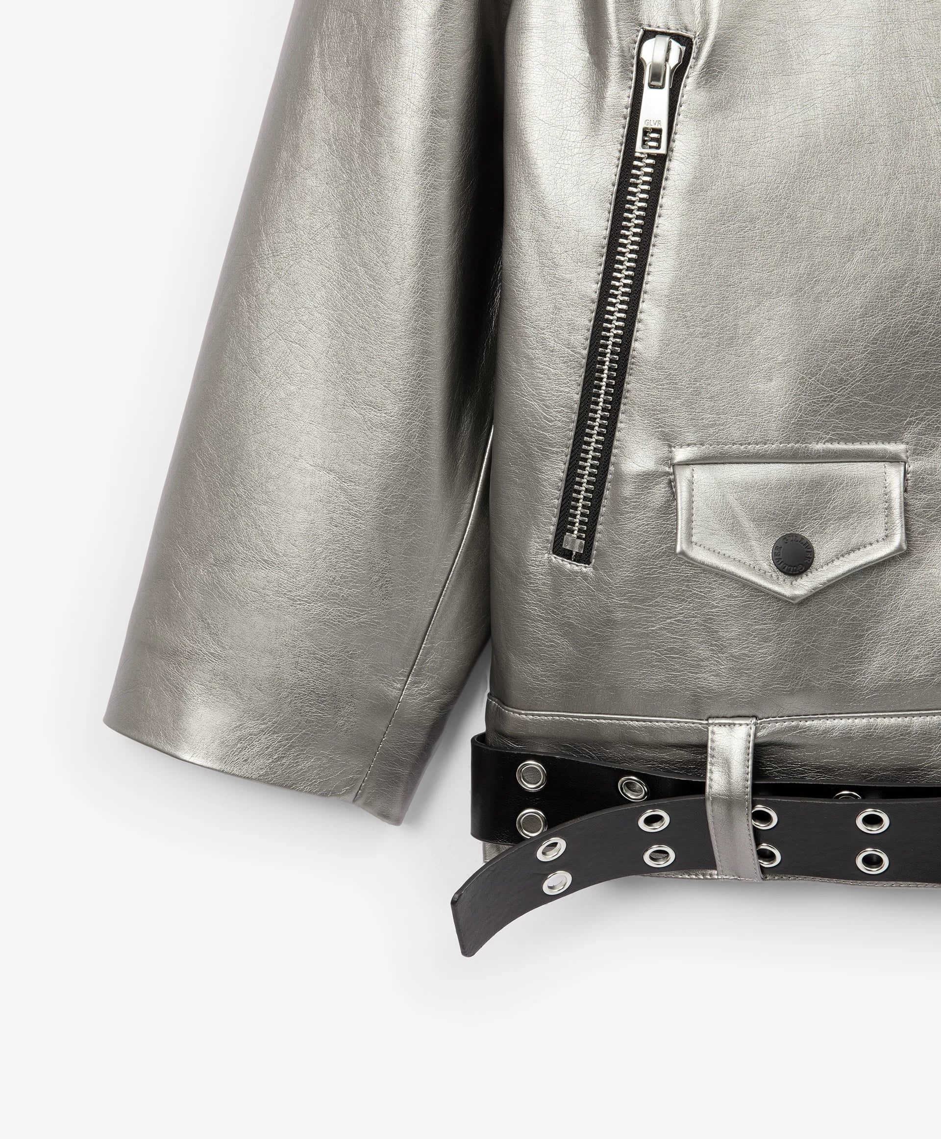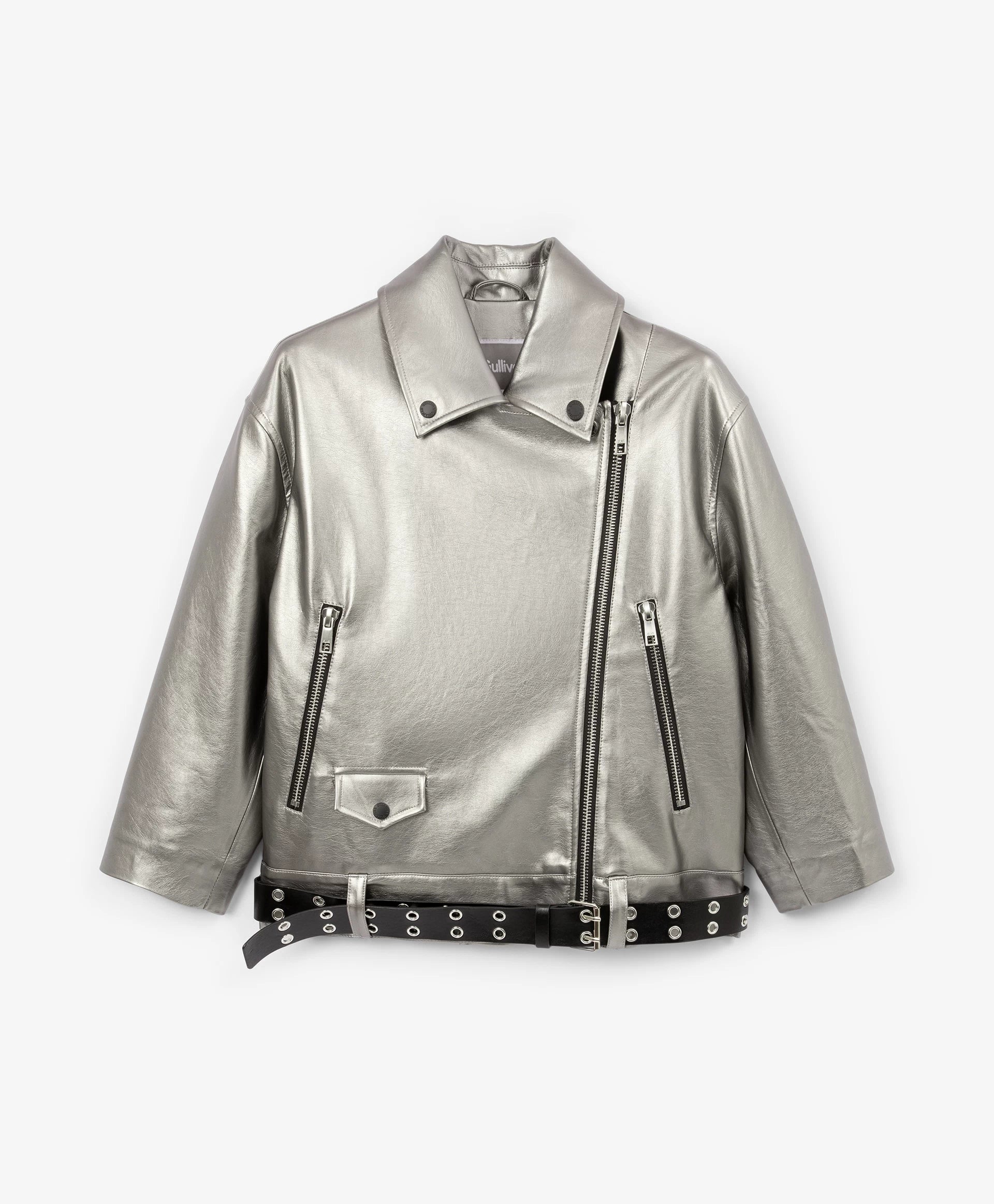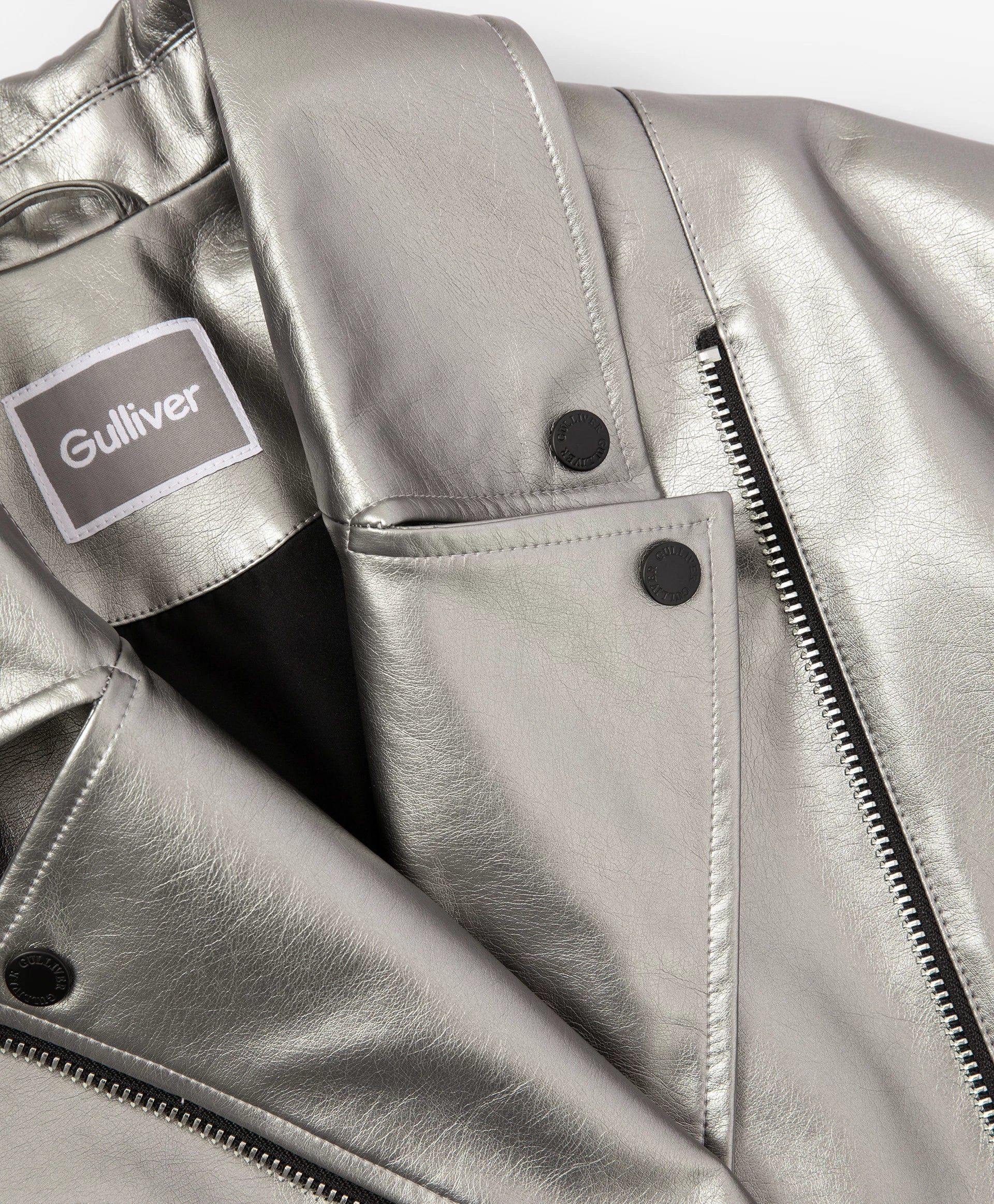Culoarea argintie intensă și spiritul rebel, ușor de recunoscut, fac din geaca din piele o alegere excelentă pentru ținutele de toamnă ale fetei. Geaca, cu un strat subțire de vatelină și căptușeală moale, este realizată din piele ecologică impermeabilă, care ca aspect, plasticitate și atingere amintește de pielea naturală. Se potrivește perfect atât într-o garderobă sport, cât și casual, adăugând un plus de atitudine oricărei ținute. Modelul are toate atributele stilistice și funcționale ale unei jachete biker: guler tip rever, închidere asimetrică, buzunare cu fermoar, curea detașabilă – o adevărată descoperire pentru fetele care iubesc stilul biker rebel. Pe spate există o aplicație reflectorizantă pentru siguranță pe întuneric.