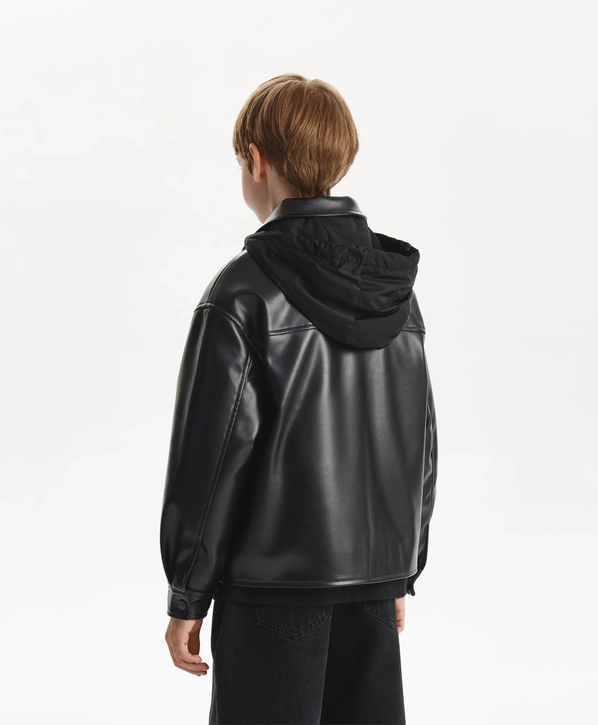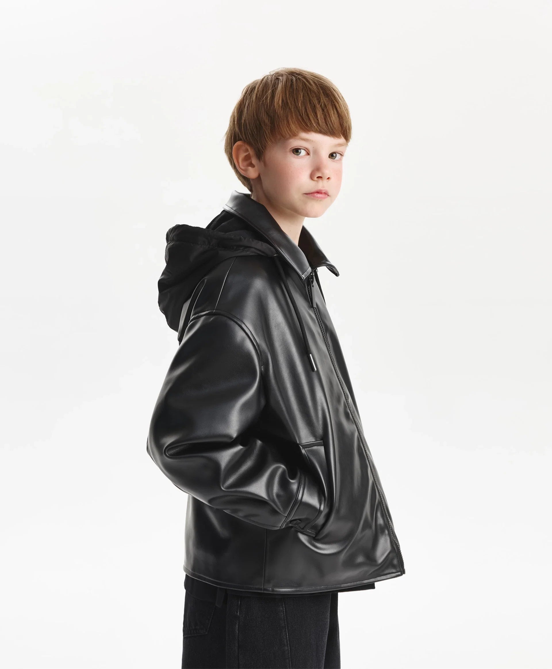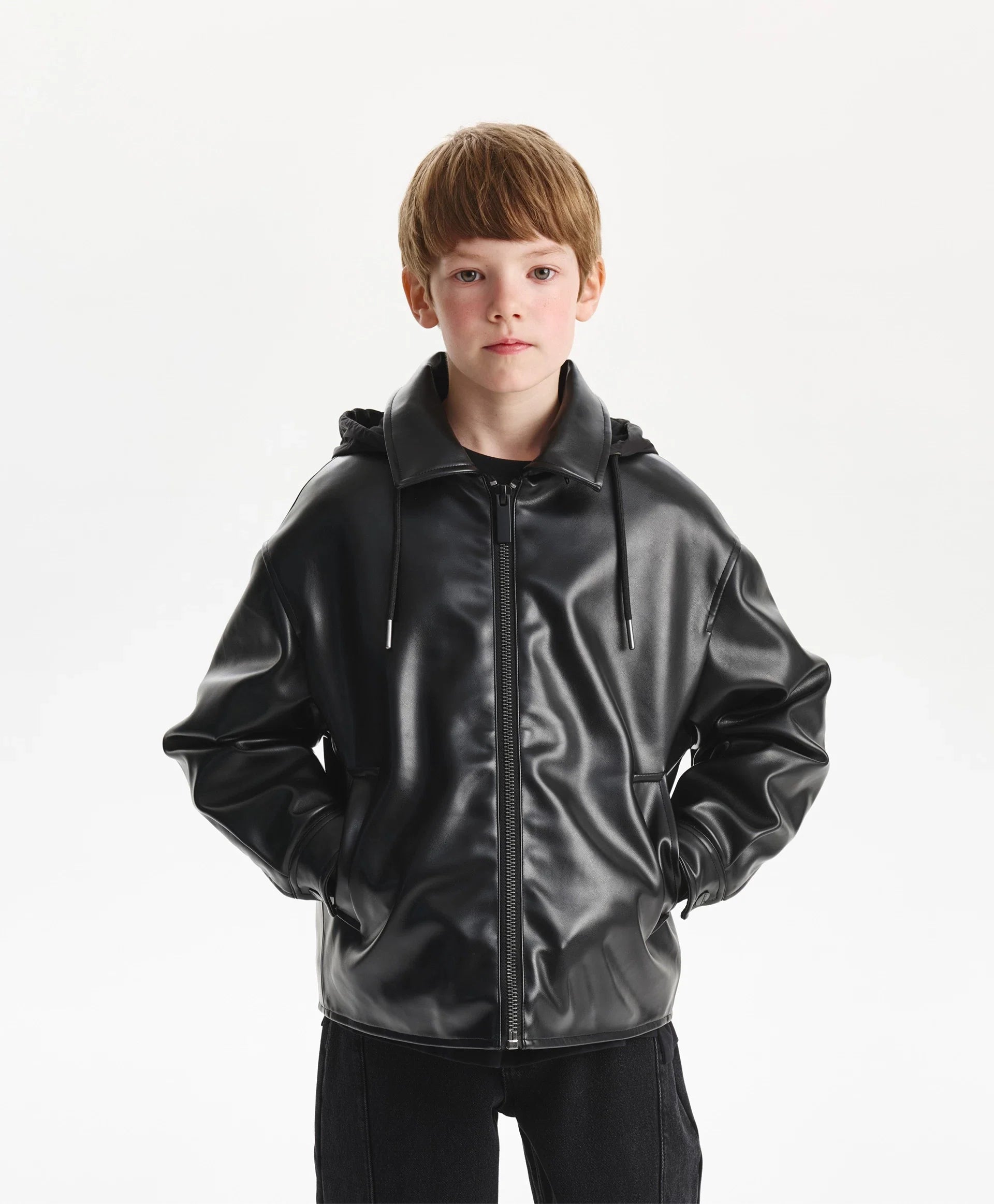 Geaca neagră, cu croială lejeră și confortabilă, din piele ecologică, cu un strat subțire de vatelină, va adăuga dinamism și energie ținutei de toamnă a băiatului. Designul minimalist o face stilată, cu atitudine rebelă, și reflectă gustul adolescentului. Gluga detașabilă din material impermeabil, cu șnururi, completează gulerul și creează un joc interesant de texturi, sporind funcționalitatea. Buzunarele tip paspoal și manșetele cu capse oferă confort. Se închide cu fermoar.