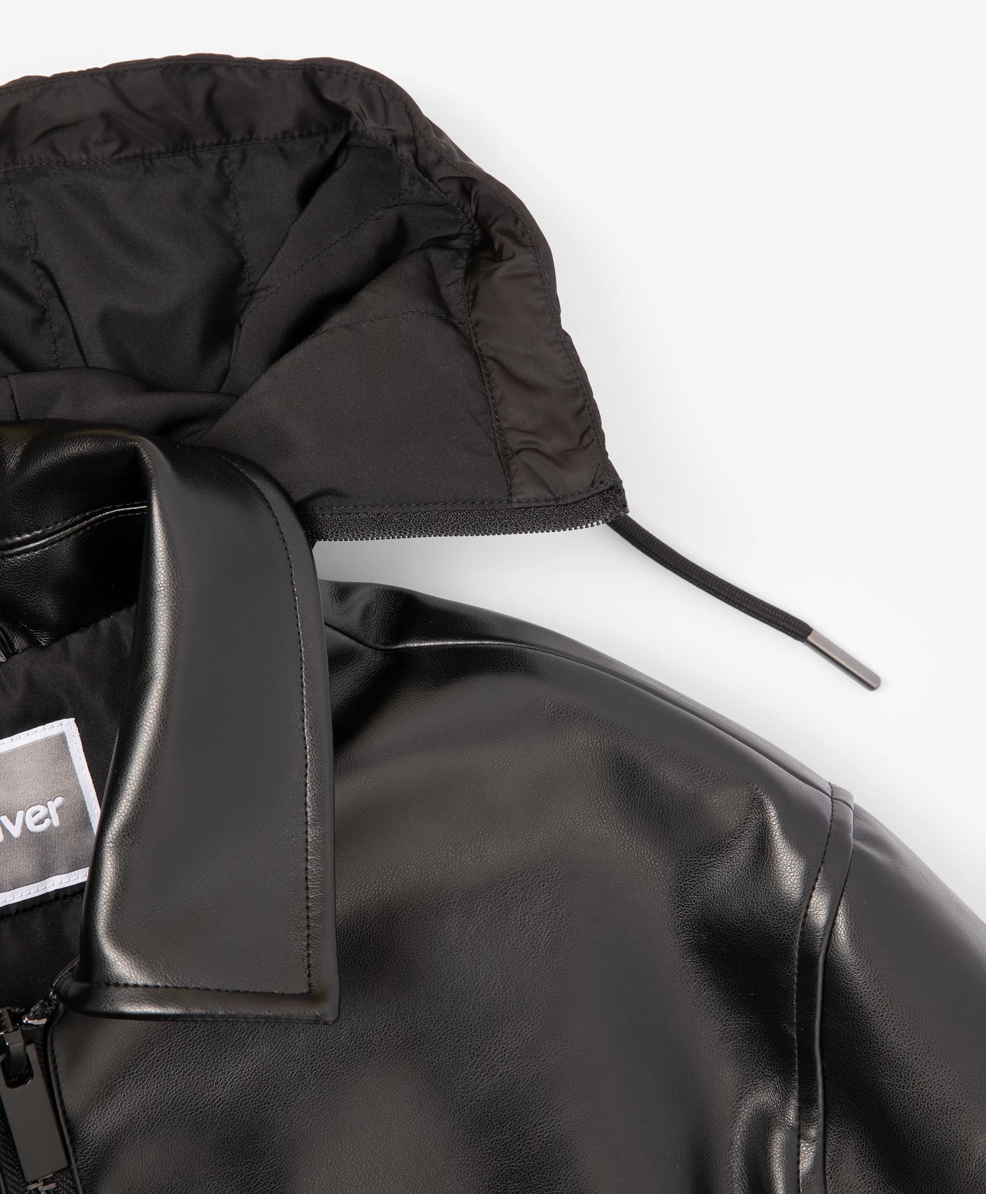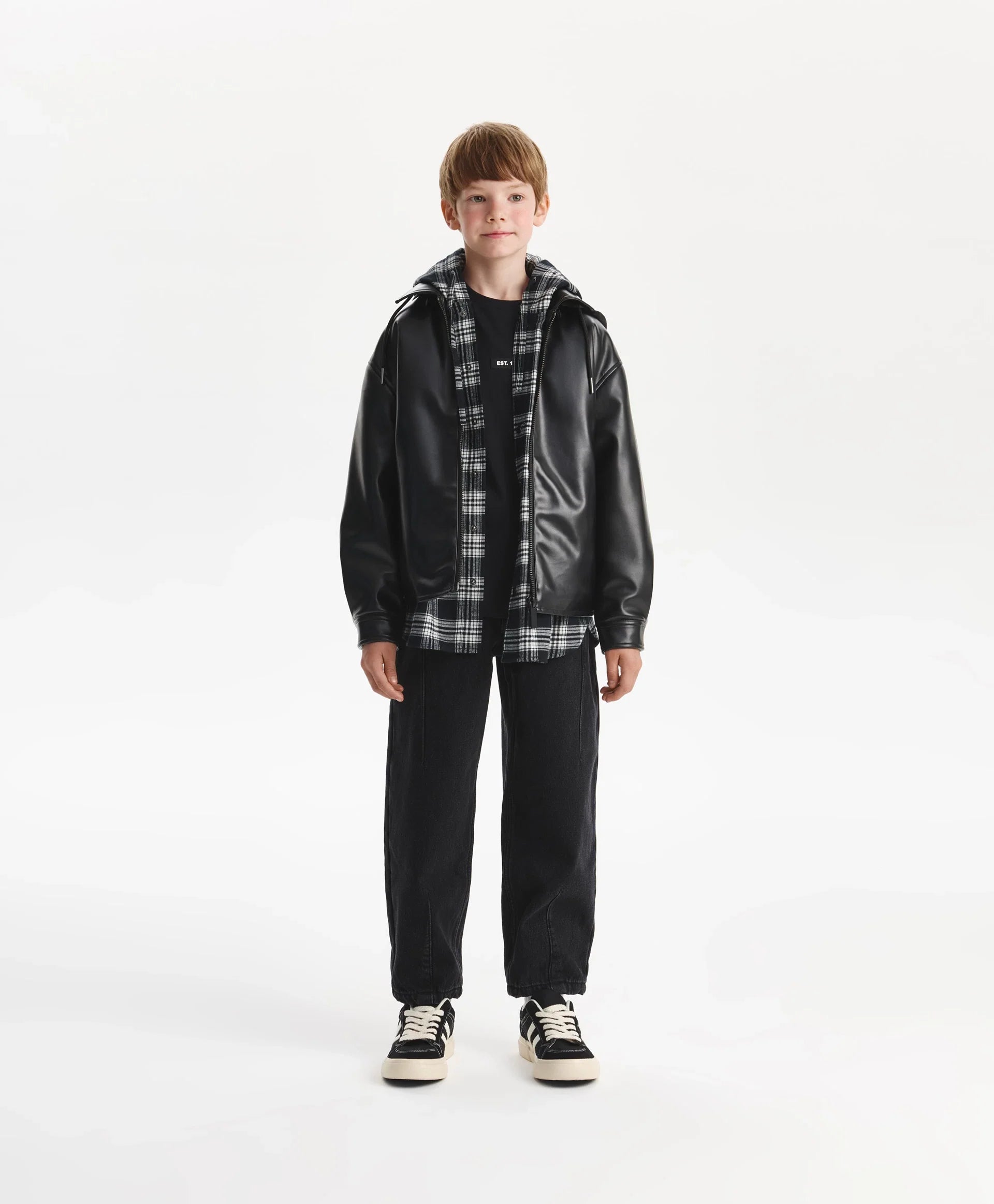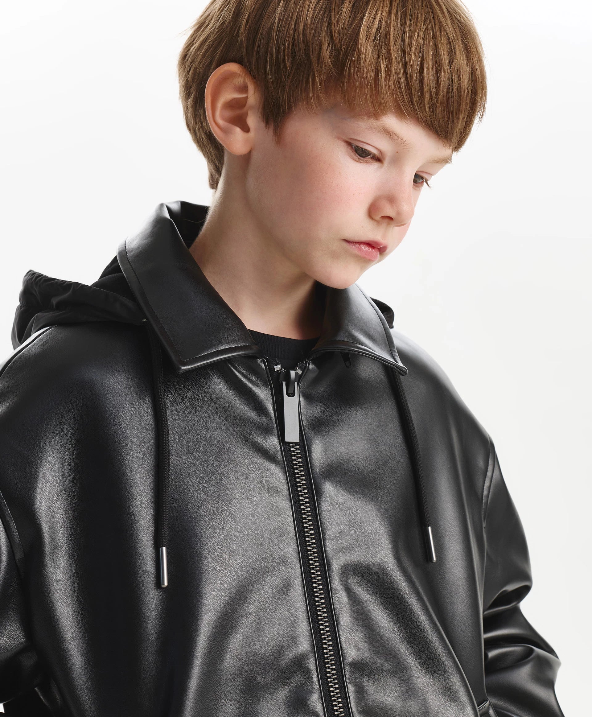 Geaca neagră, cu croială lejeră și confortabilă, din piele ecologică, cu un strat subțire de vatelină, va adăuga dinamism și energie ținutei de toamnă a băiatului. Designul minimalist o face stilată, cu atitudine rebelă, și reflectă gustul adolescentului. Gluga detașabilă din material impermeabil, cu șnururi, completează gulerul și creează un joc interesant de texturi, sporind funcționalitatea. Buzunarele tip paspoal și manșetele cu capse oferă confort. Se închide cu fermoar.