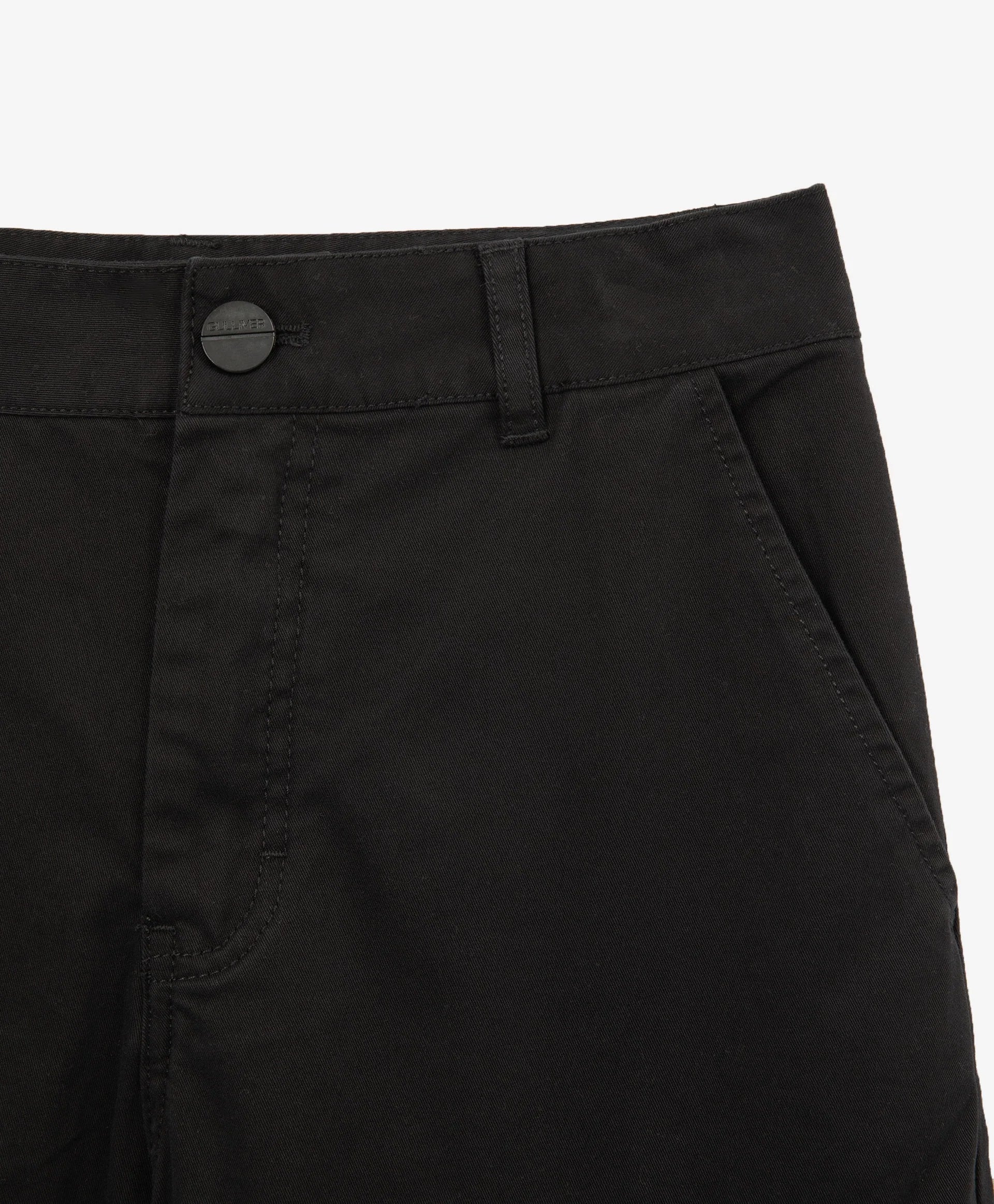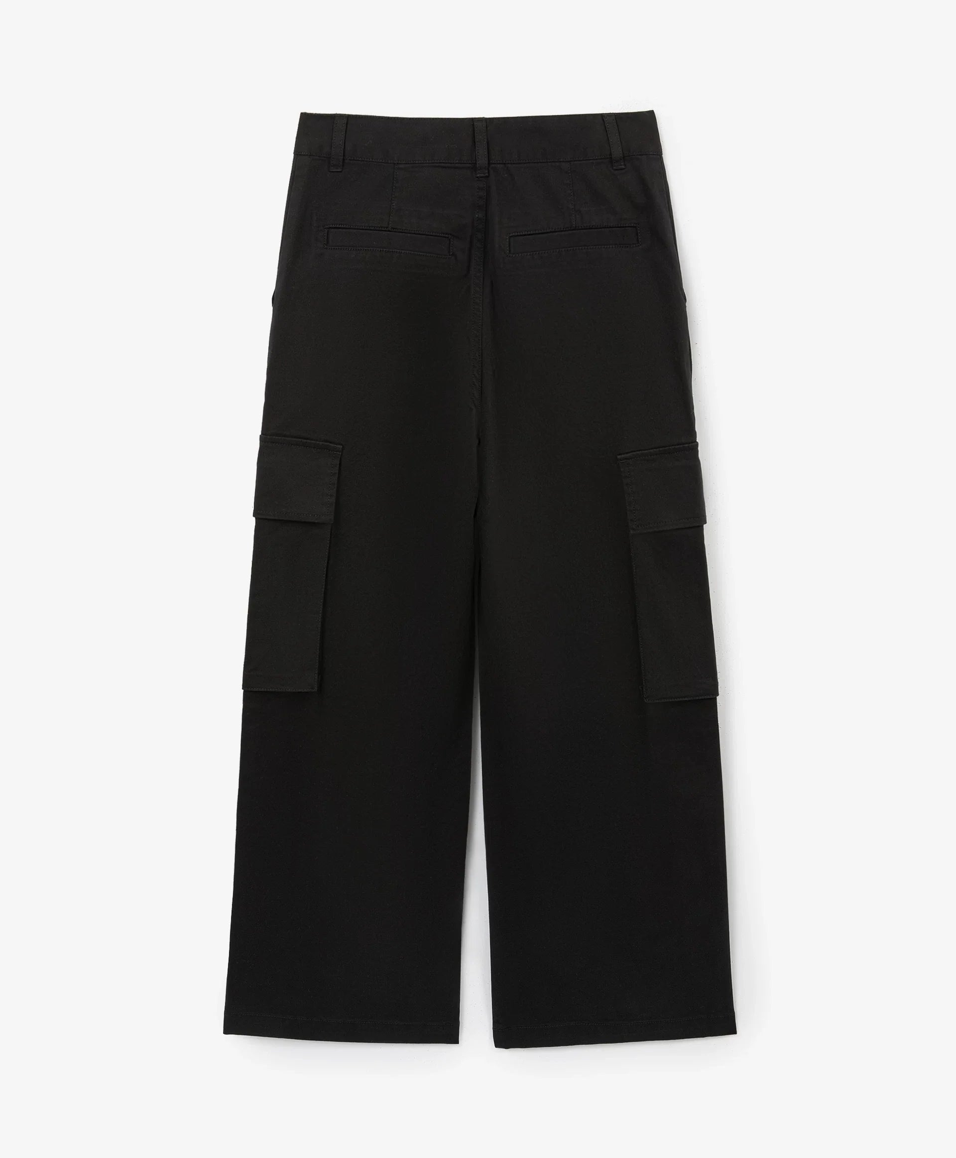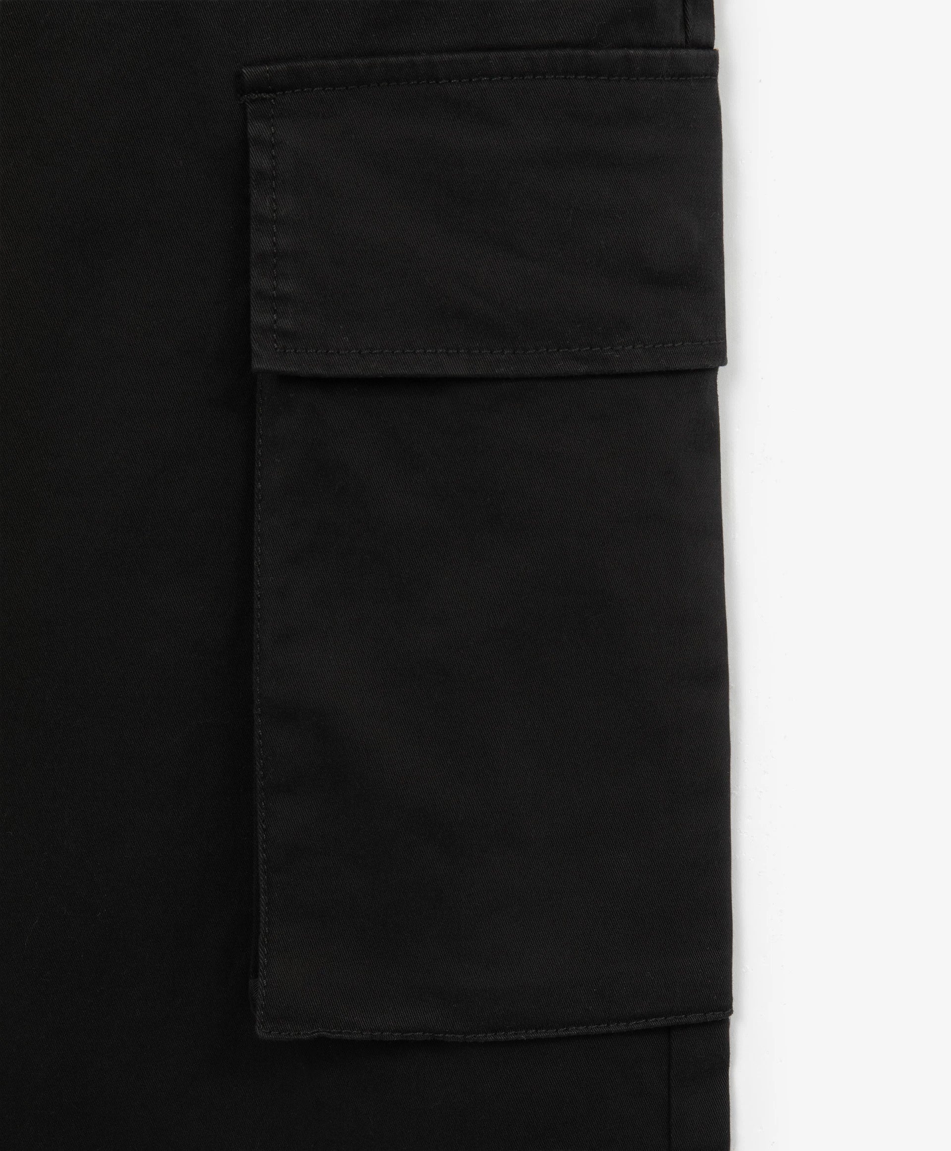 Pantalonii negri largi cu buzunare cargo sunt baza unei garderobe de toamnă practice și funcționale pentru băiat. Sunt realizați din twill moale și neted, cu elastan, foarte plăcut la atingere. Croiala dreaptă și lejeră, buzunarele oblice și buzunarele cargo mari cu clapă conferă un plus de atitudine, dinamism și un streetstyle relaxat, popular printre adolescenții stilati. Partea din spate a beteliei este elastică pentru confort suplimentar. Se închid cu fermoar și nasture.