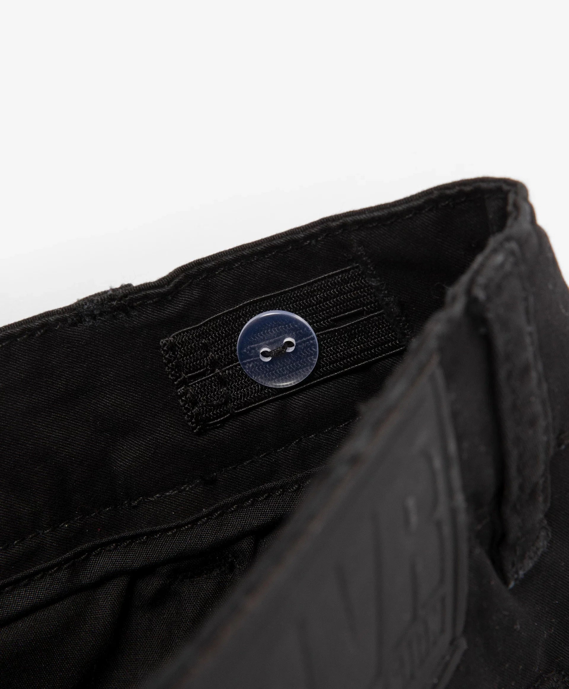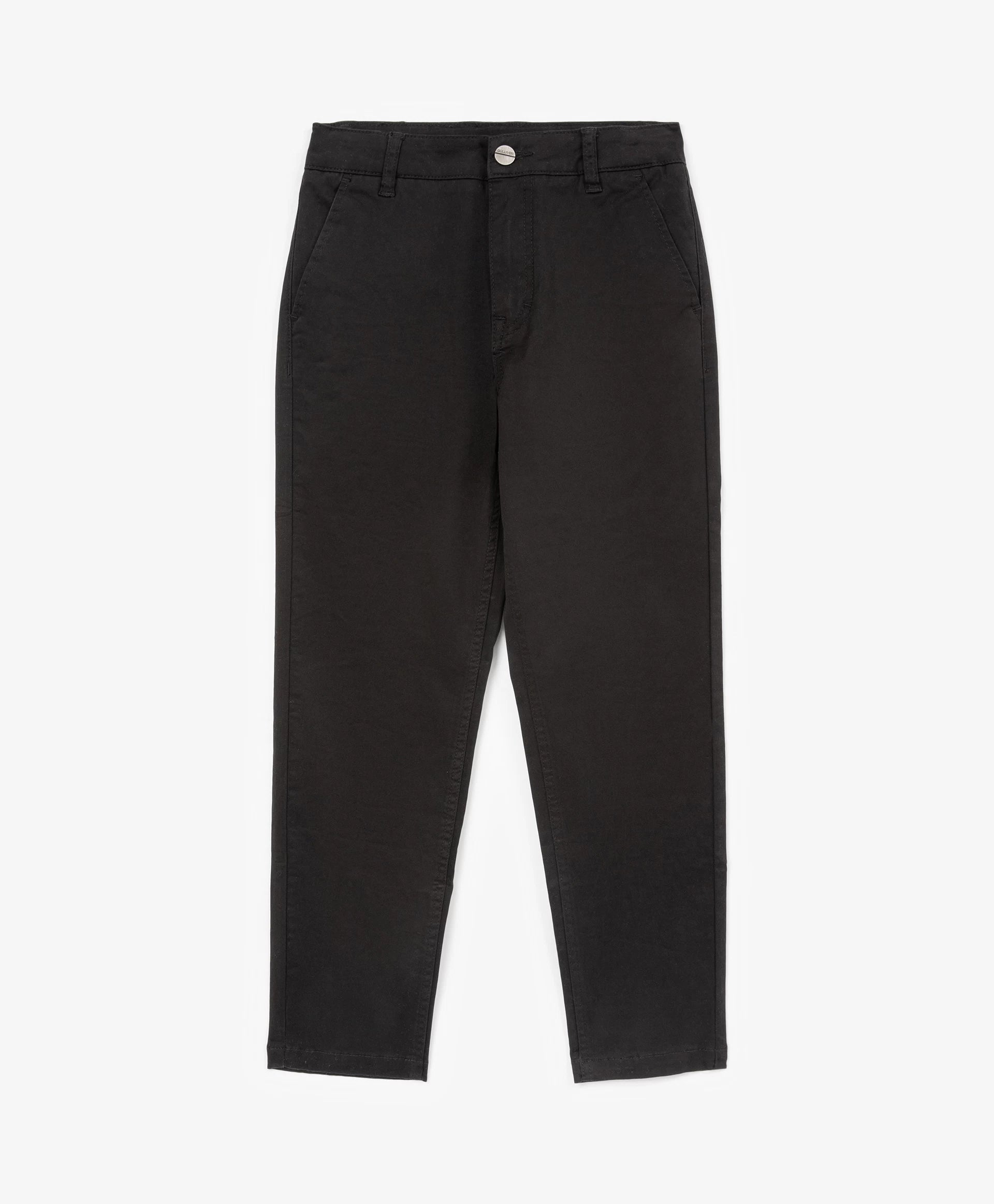 Pantalonii negri conici sunt baza unei ținute de toamnă în stil smart-casual. Pantalonii chino sunt realizați din twill de bumbac dens, cu elastan, cu suprafață netedă și mată. Au buzunare frontale oblice și buzunare spate tip paspoal, iar închiderea este cu fermoar și nasture. Banda elastică interioară pentru reglarea taliei permite o potrivire ideală pentru băieții mai slabi.