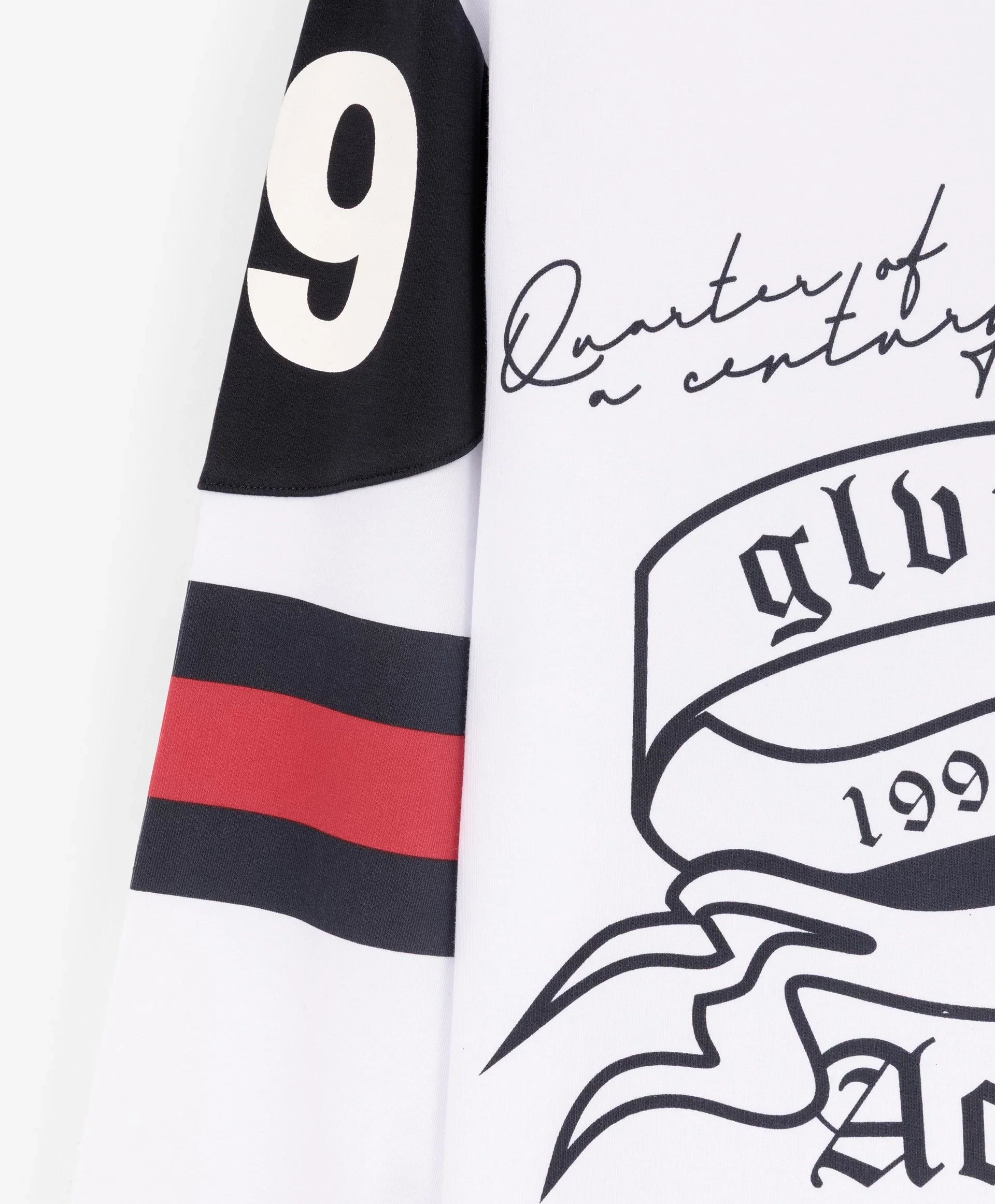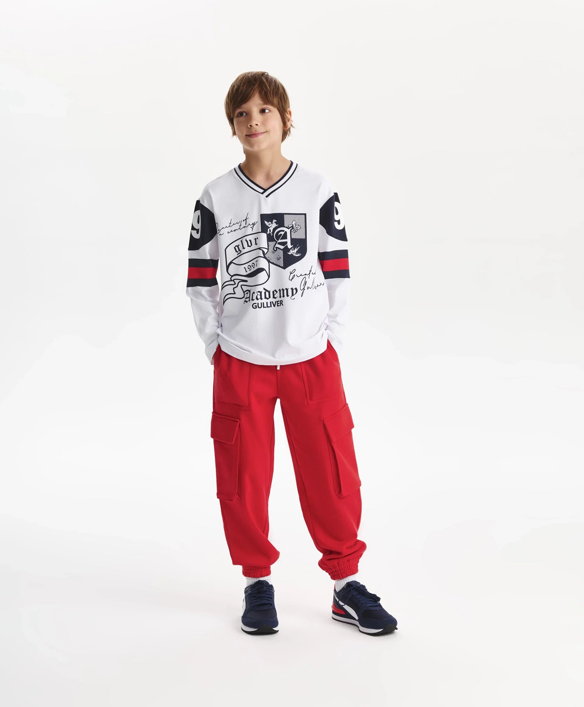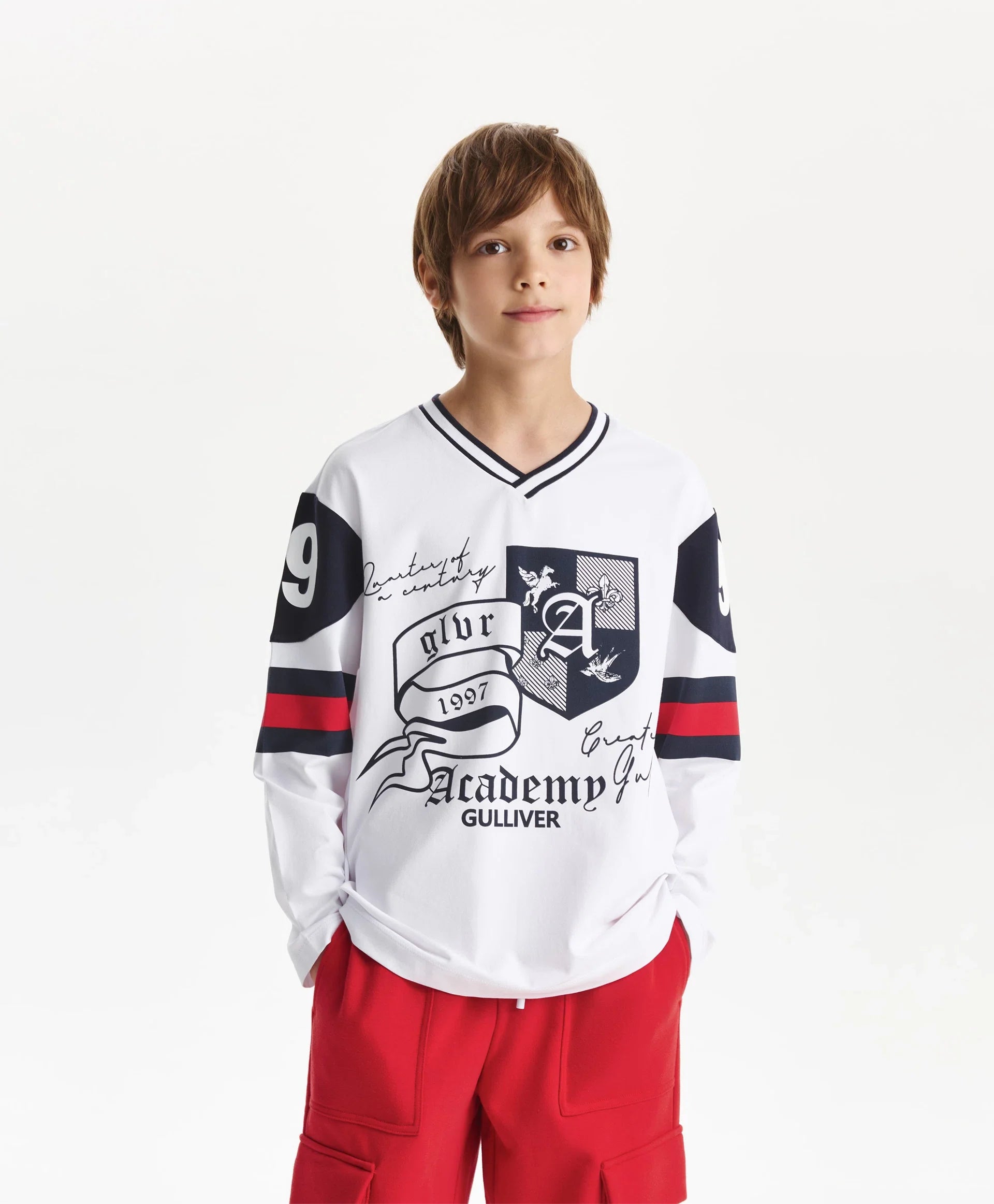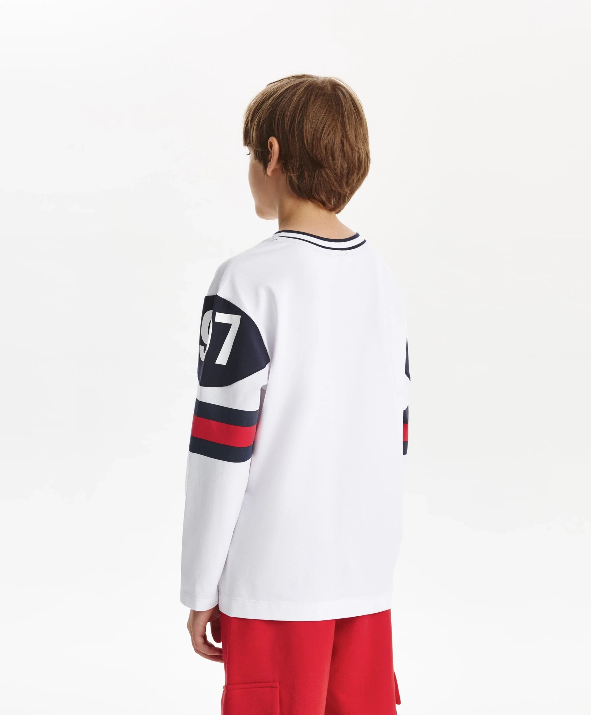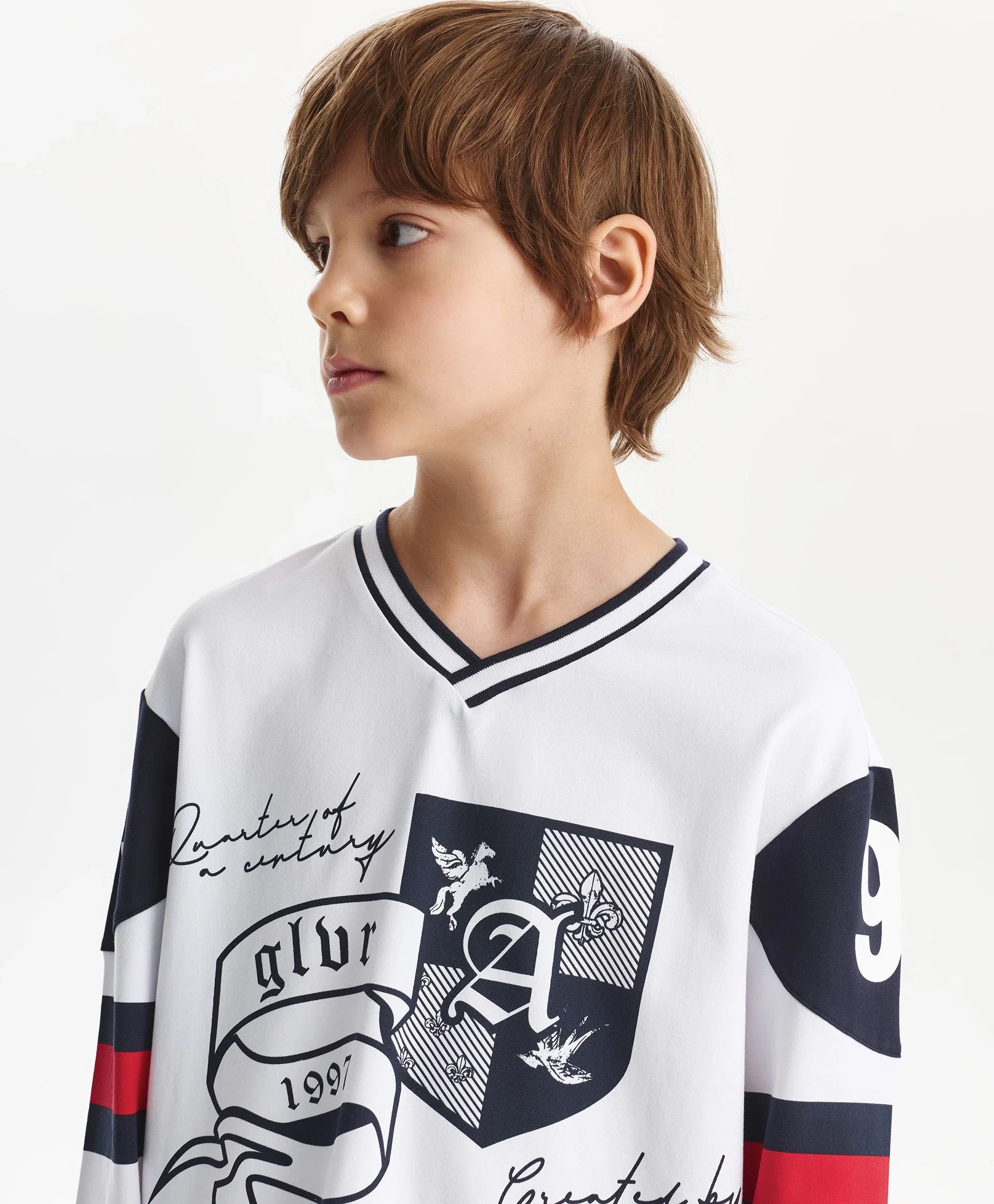 Longsleeve-ul cu croială dreaptă lejeră și linia umerilor coborâtă este o piesă interesantă, care va face ținuta de toamnă a adolescentului vibrantă și energică. Designul combină printuri accent, decorațiuni contrastante și blocuri de culoare – trăsături tipice stilului sport. Elementele tipografice, cifrele mari și emblemele îi dau expresivitate, transformând longsleeve-ul într-o întruchipare a tendințelor modei. Gulerul din rib cu decolteu în V completează această piesă dinamică, creând imaginea unui adolescent stilat și liber. Este realizat din bumbac moale cu elastan, foarte plăcut la atingere.