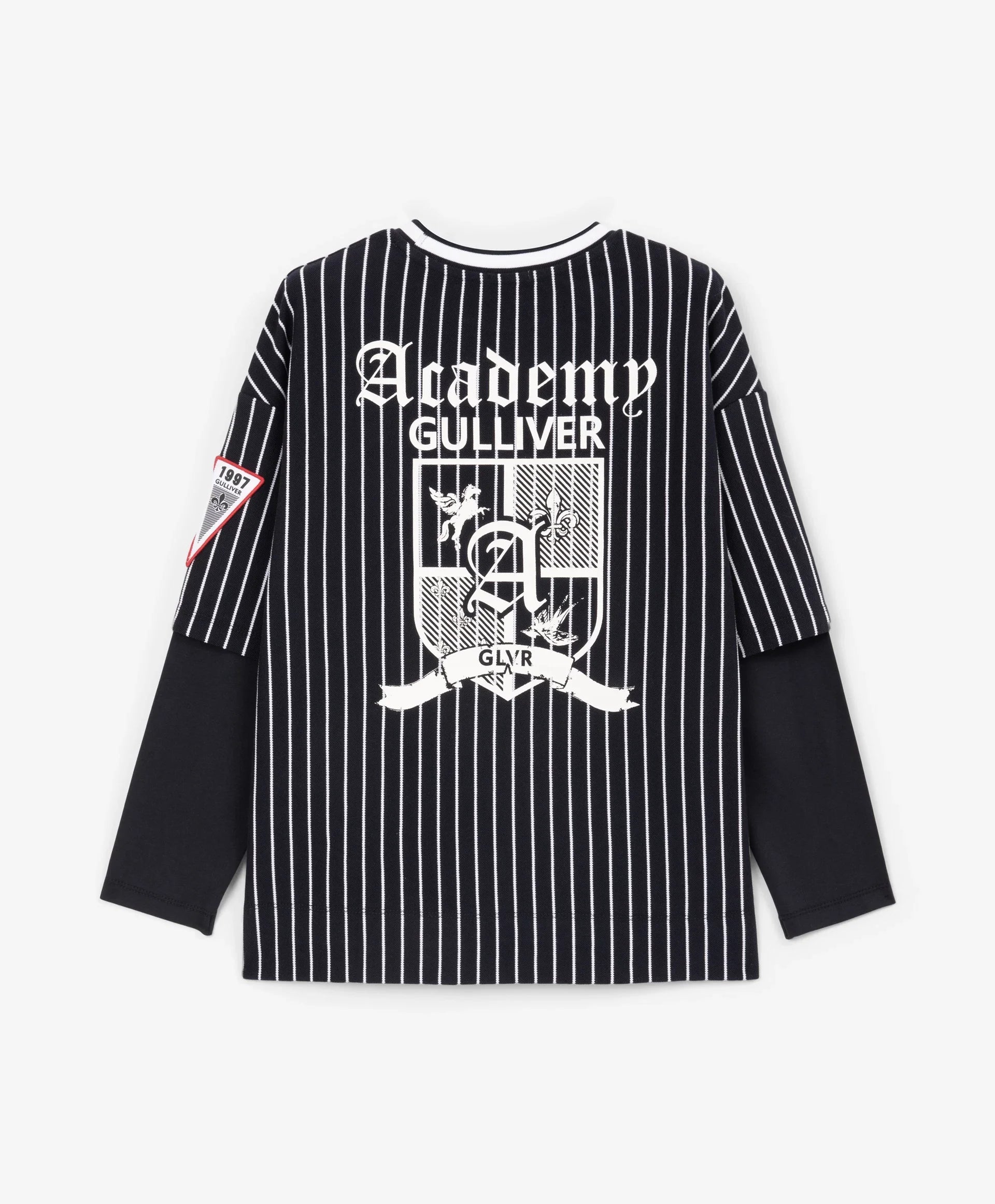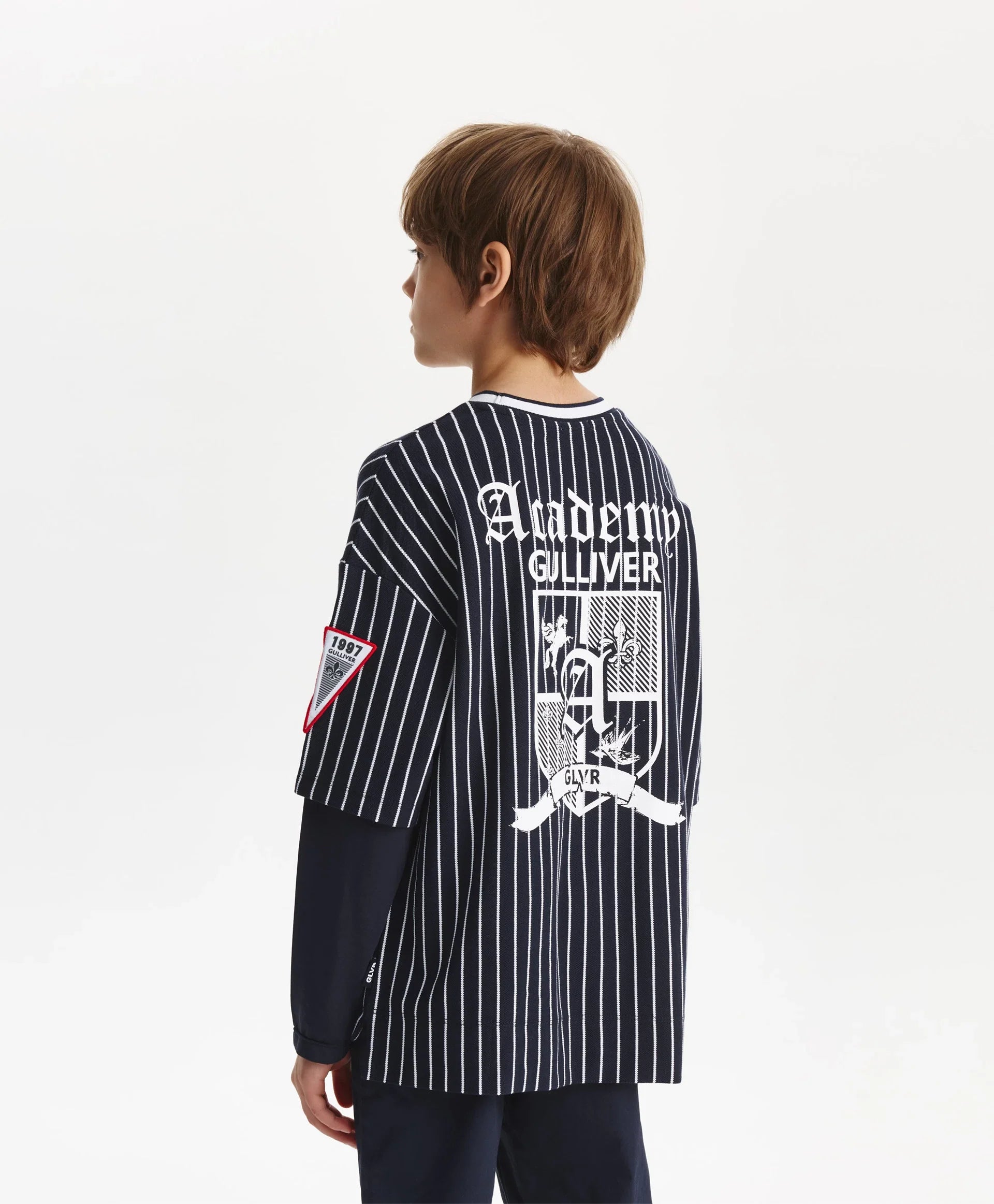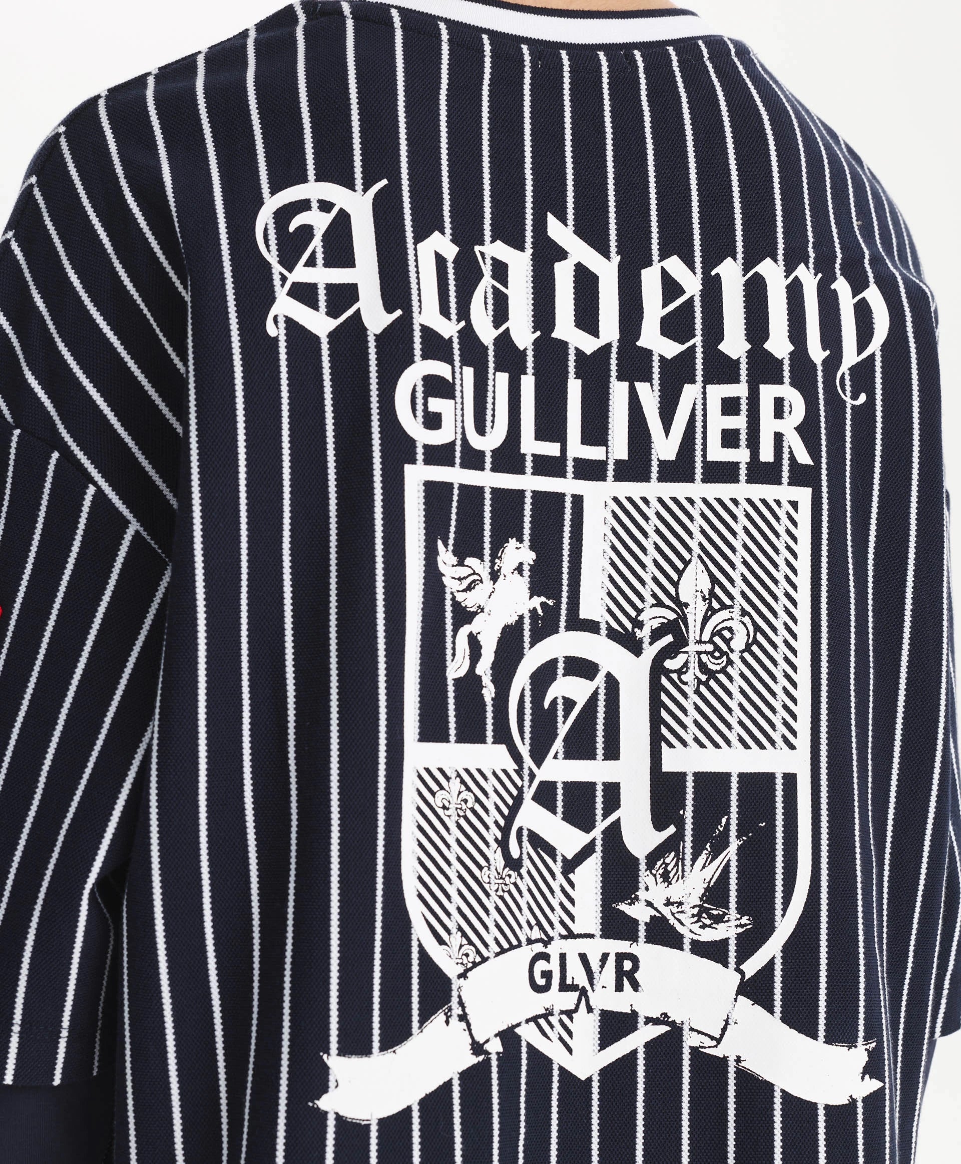 Longsleeve-ul albastru cu siluetă oversize și spate alungit este un element modern, cu atitudine și interesant în garderoba de timp liber a băiatului. Designul se bazează pe stratificare și pe semne puternice ale stilului sport. Combină pique din bumbac cu dungi verticale și tricot uni, grafică tipografică, motive heraldice, aplicații și guler rotund din rib cu paspoal contrastant – toate reflectă vibe-ul colecției Gulliver „College”, inspirată de atmosfera școlilor private și a echipelor sportive.