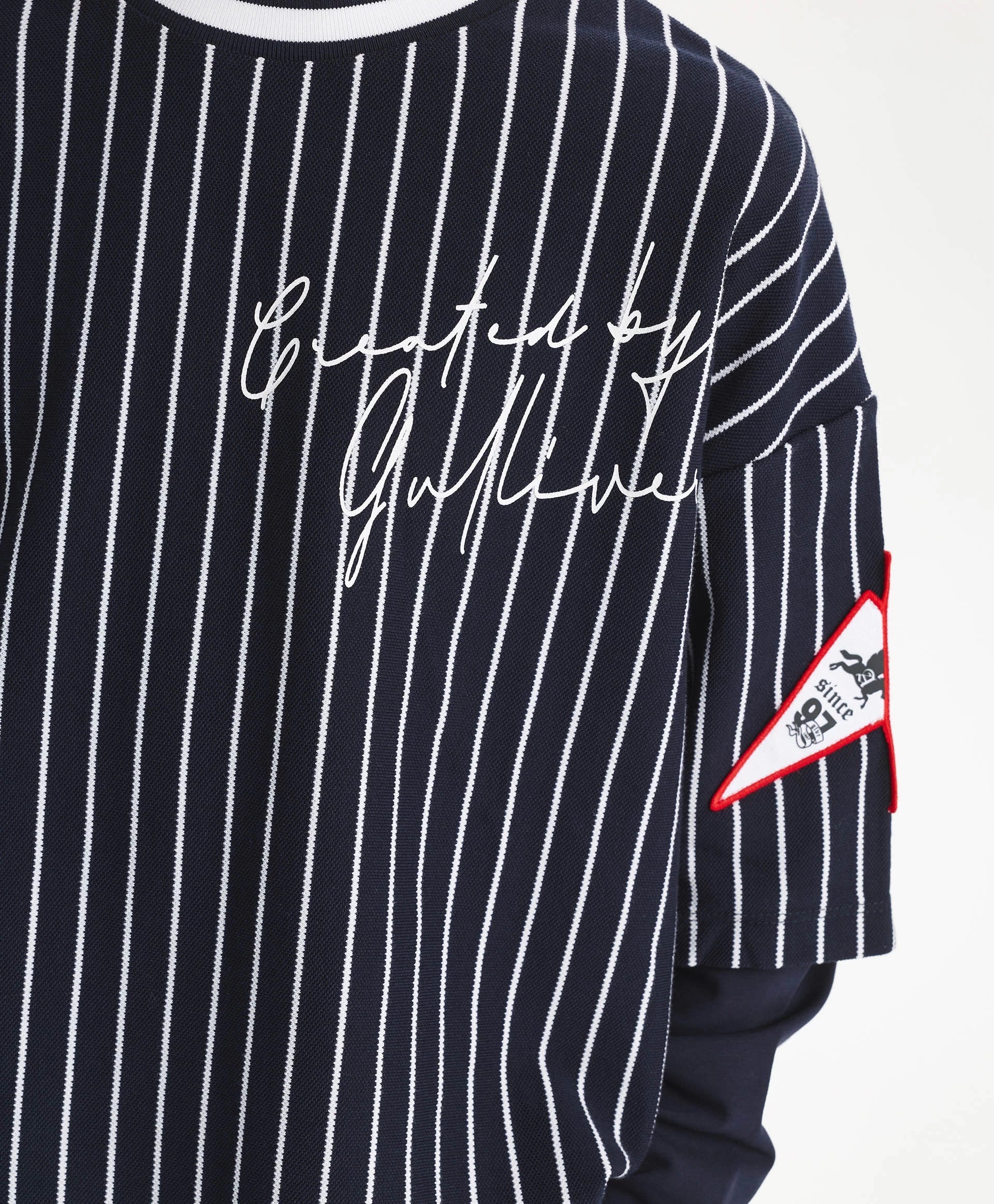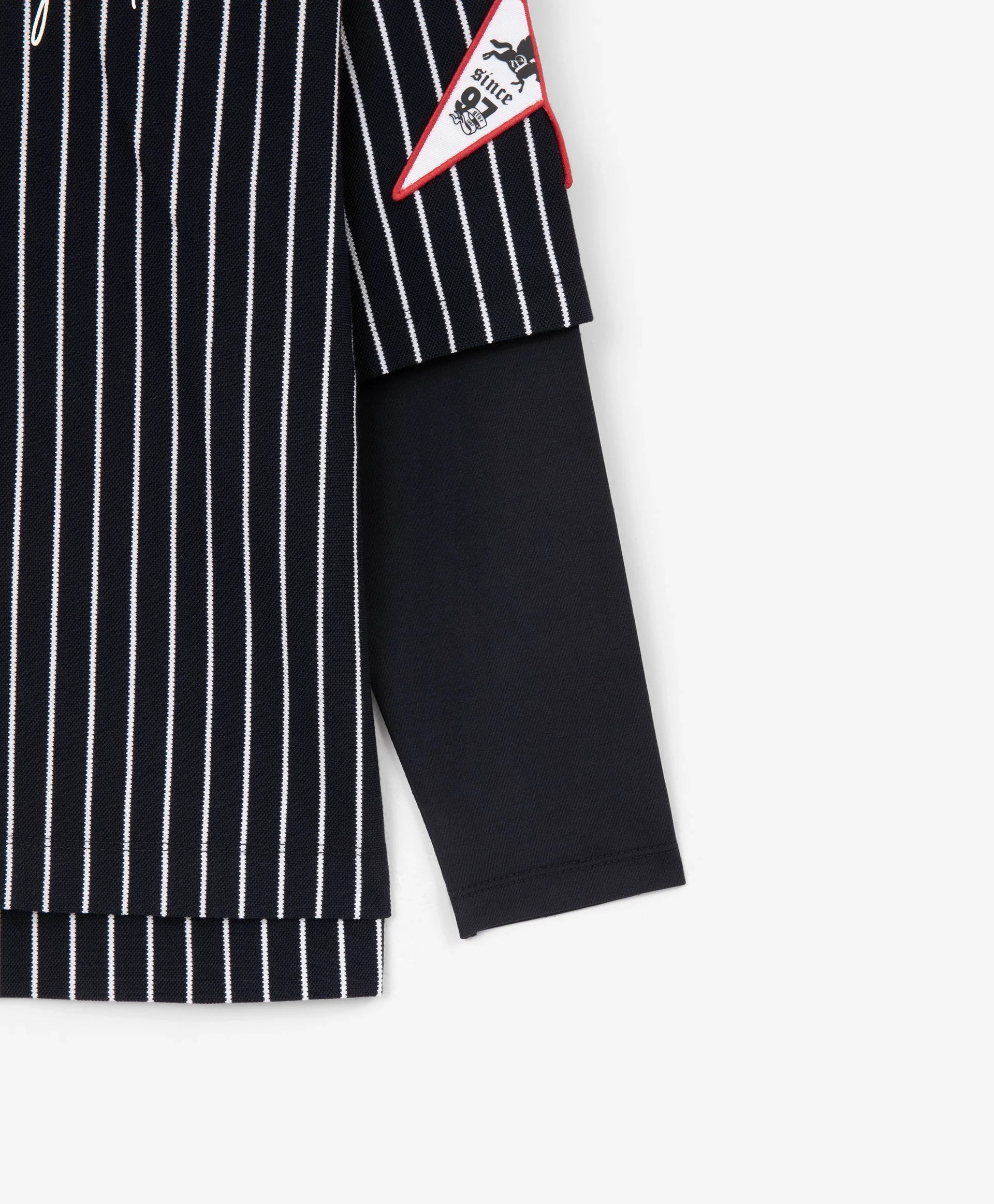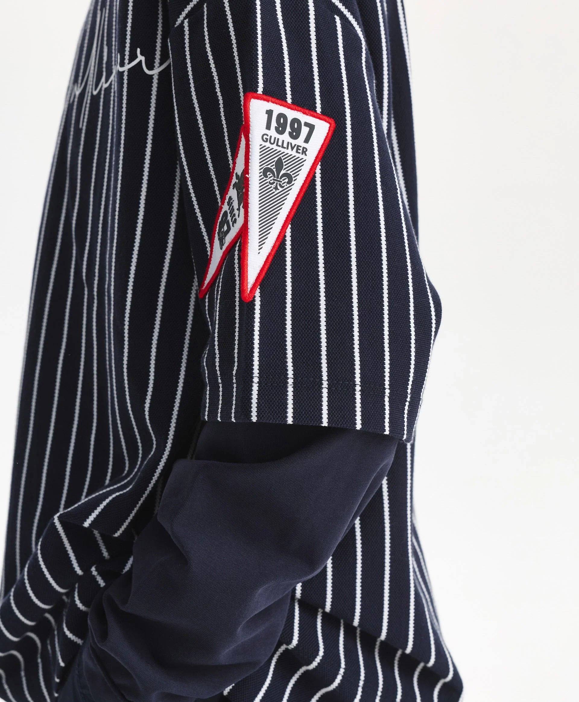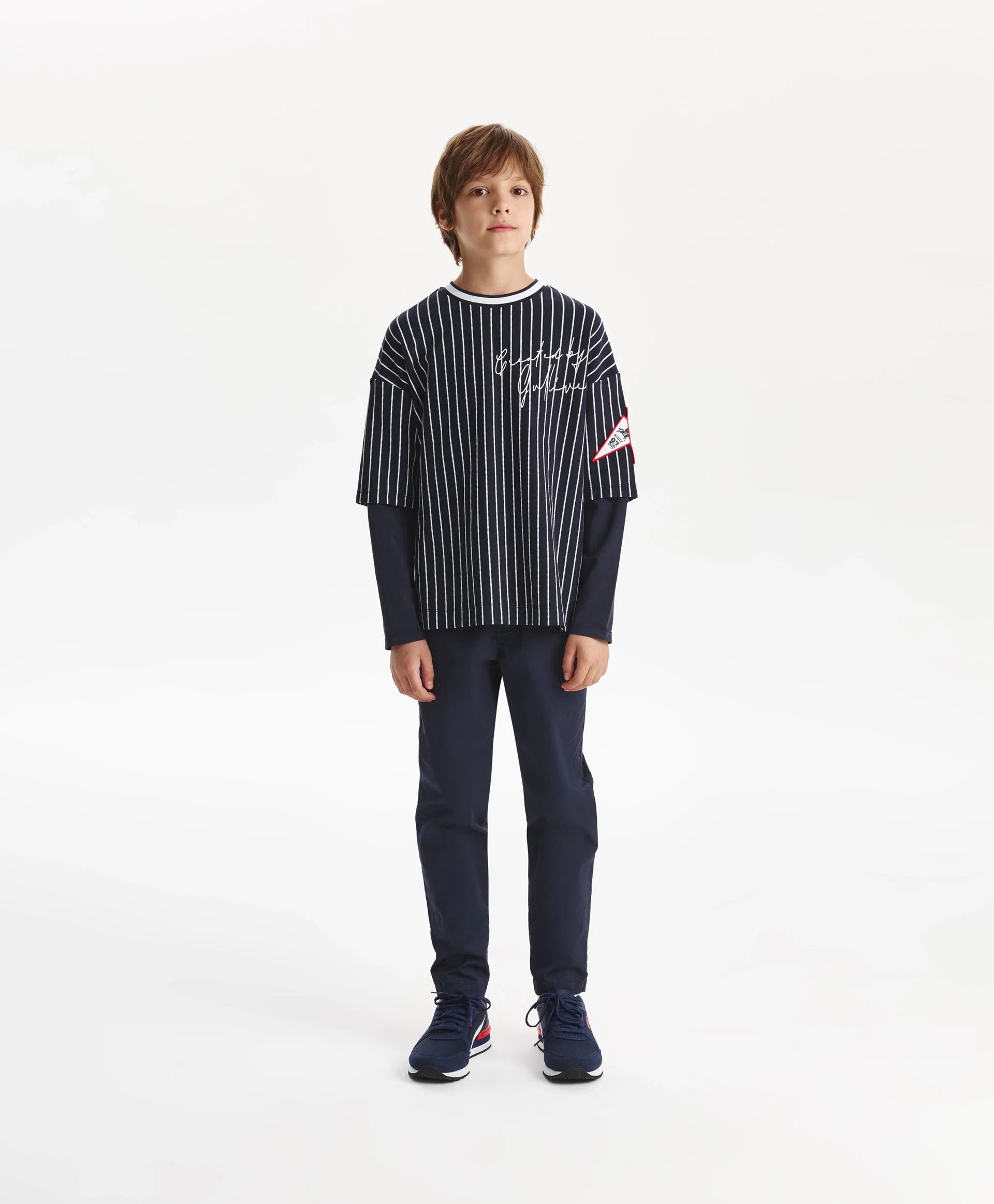Longsleeve-ul albastru cu siluetă oversize și spate alungit este un element modern, cu atitudine și interesant în garderoba de timp liber a băiatului. Designul se bazează pe stratificare și pe semne puternice ale stilului sport. Combină pique din bumbac cu dungi verticale și tricot uni, grafică tipografică, motive heraldice, aplicații și guler rotund din rib cu paspoal contrastant – toate reflectă vibe-ul colecției Gulliver „College”, inspirată de atmosfera școlilor private și a echipelor sportive.