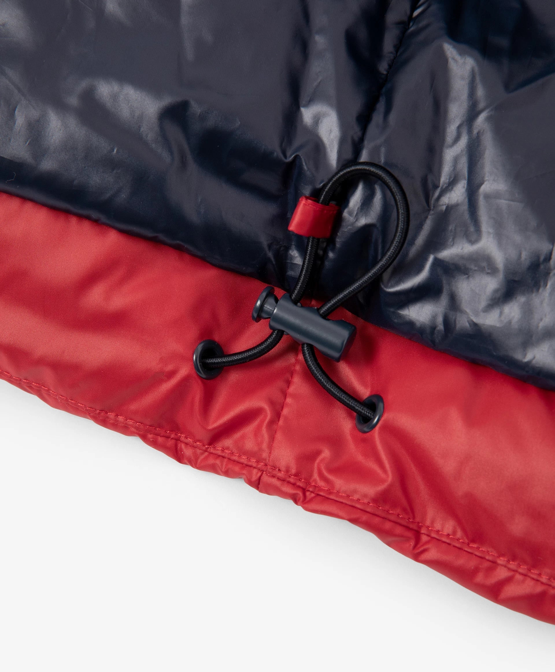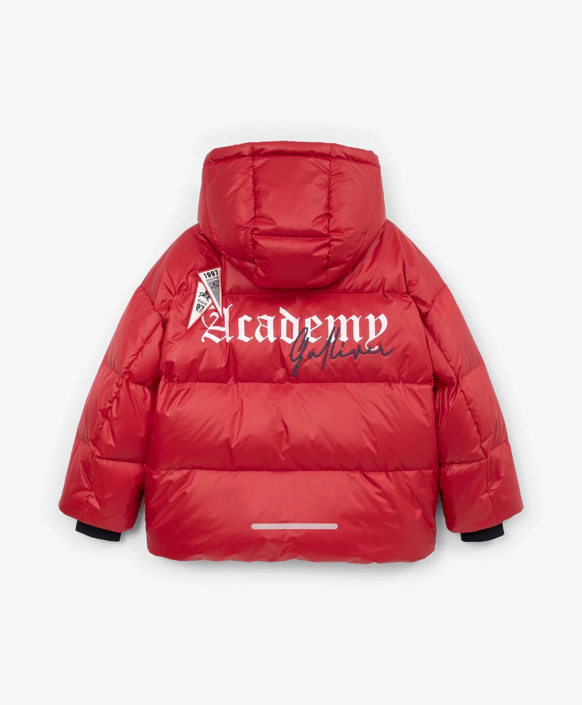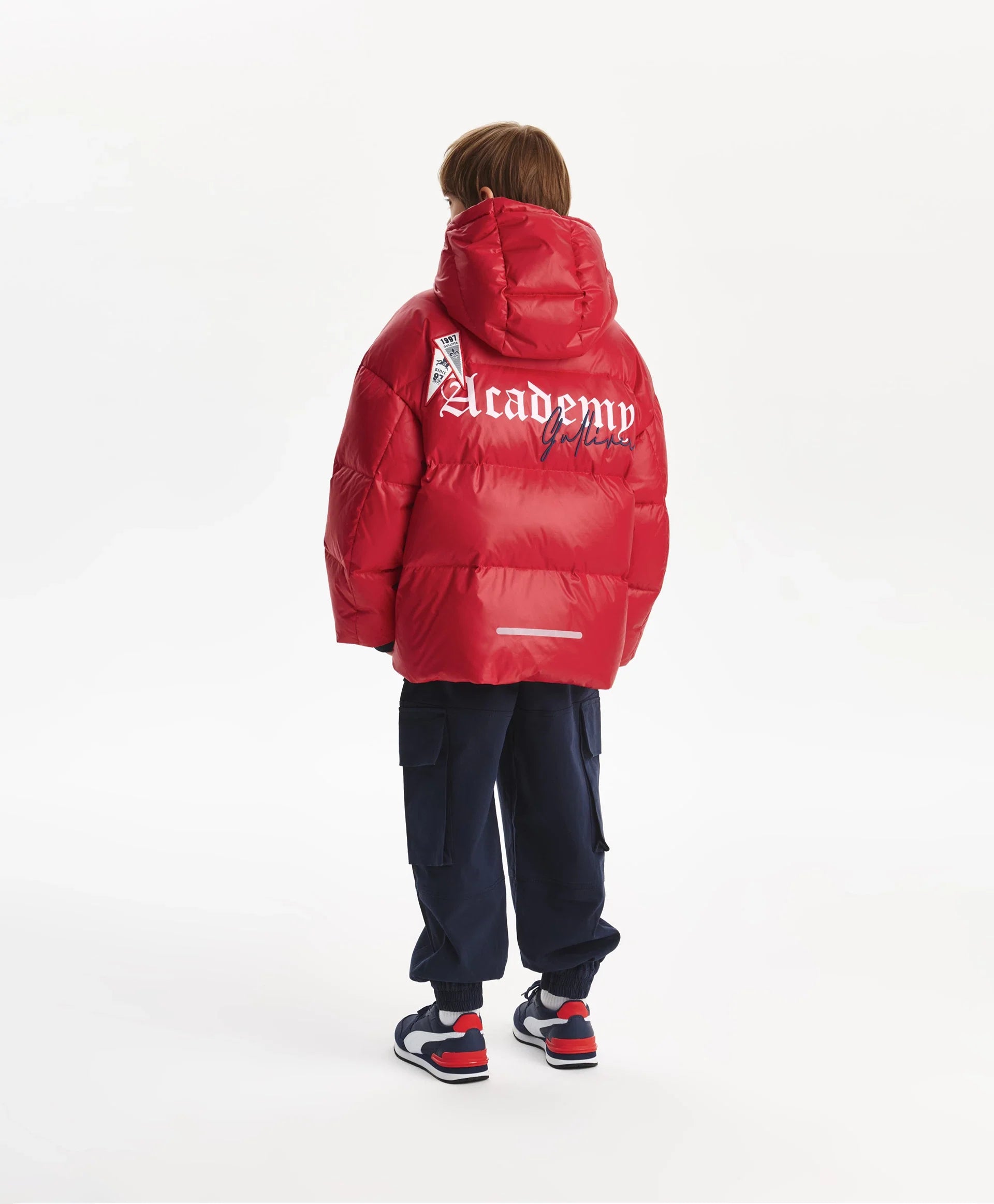 Geaca roșie matlasată din puf natural se va comporta excelent în condiții aspre de iarnă! Realizată din material impermeabil lucios, cu căptușeală moale, geaca îmbină estetica și eleganța unei piese ușoare de iarnă în stil preppy. Designul combină blocuri de culoare și detalii vibrante care adaugă dinamism. Contrastul dintre materialul exterior și căptușeală, manșetele din rib, fermoarele tip tractor, printurile tipografice și aplicațiile conferă gecii un aspect modern și premium. Dispune de șnururi interioare la glugă și la tivul inferior și se închide cu fermoar tip tractor pe bandă contrastantă colorată, cu cursor original. Pe spate este aplicat un print reflectorizant.