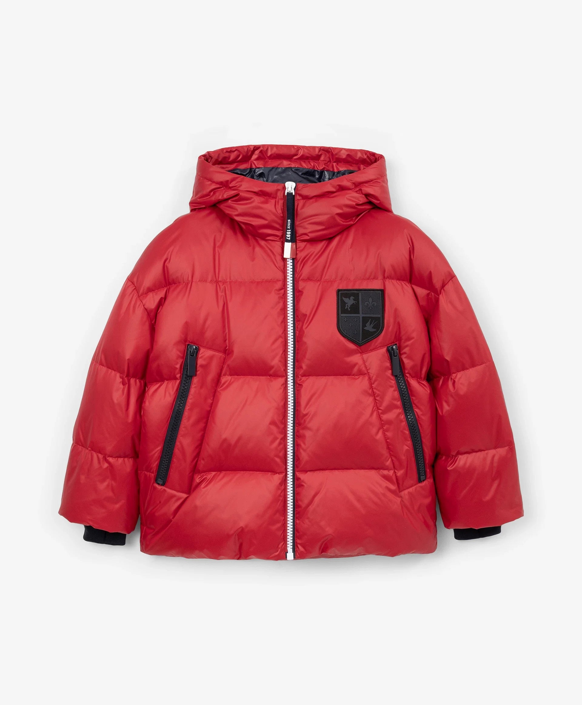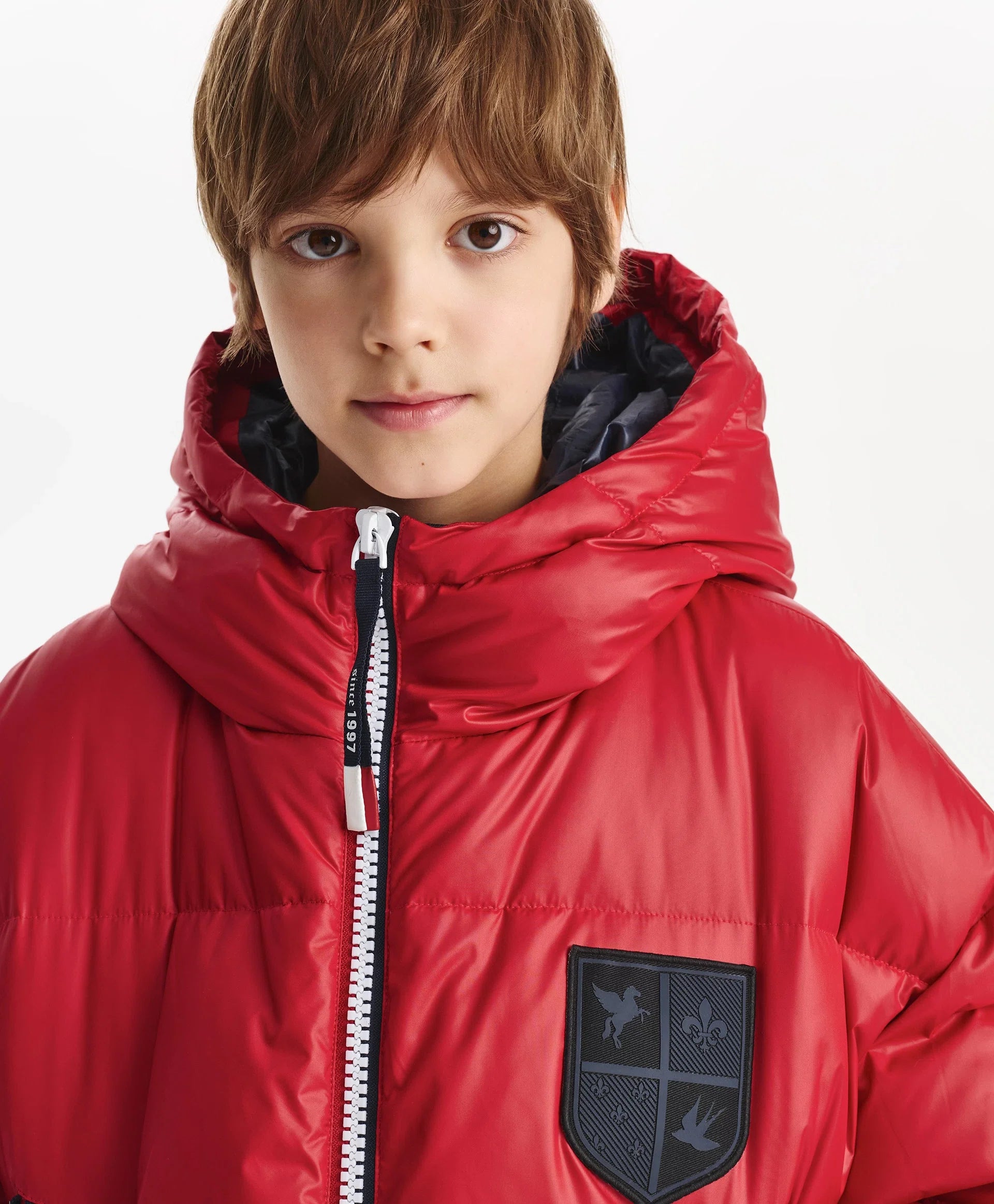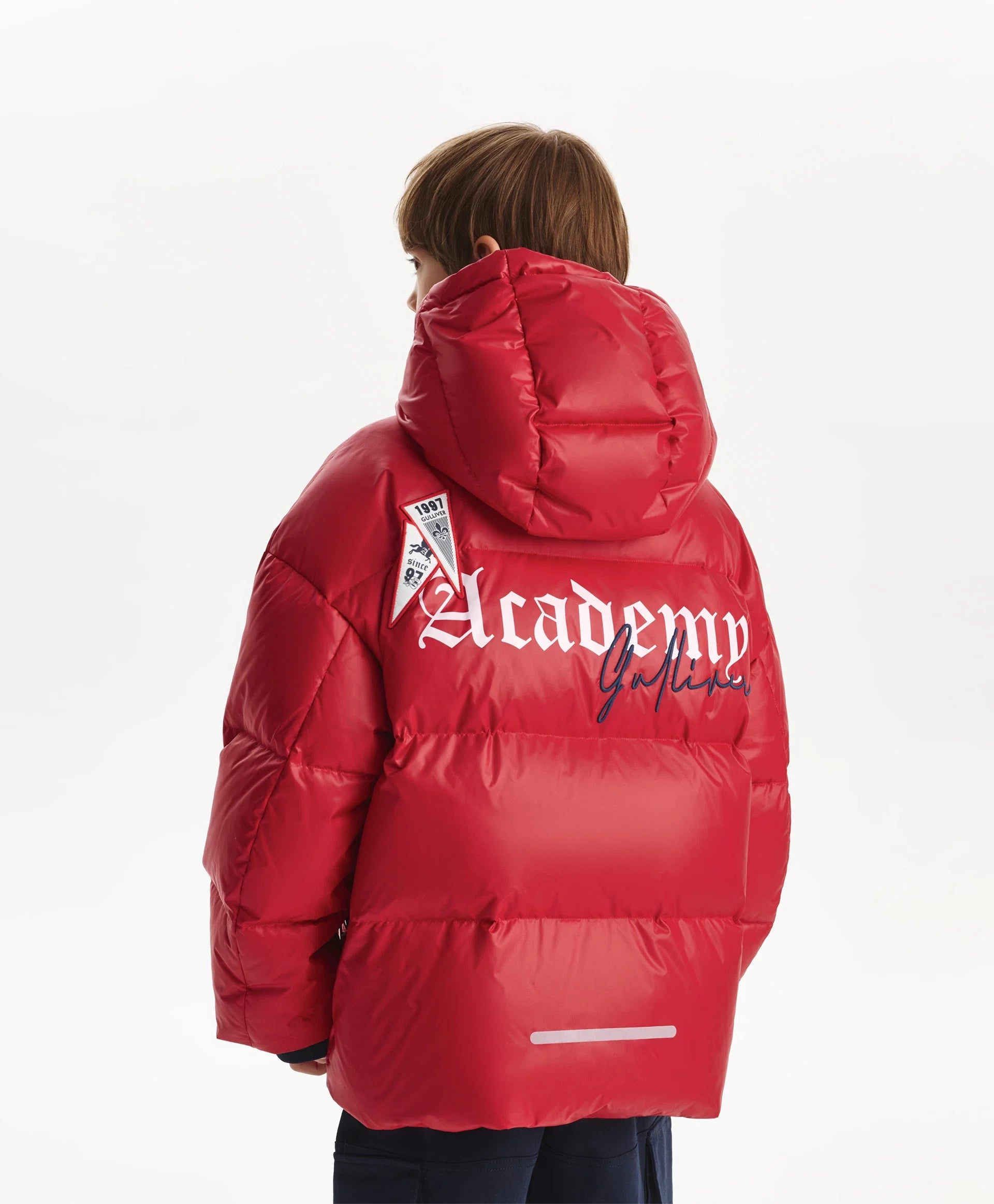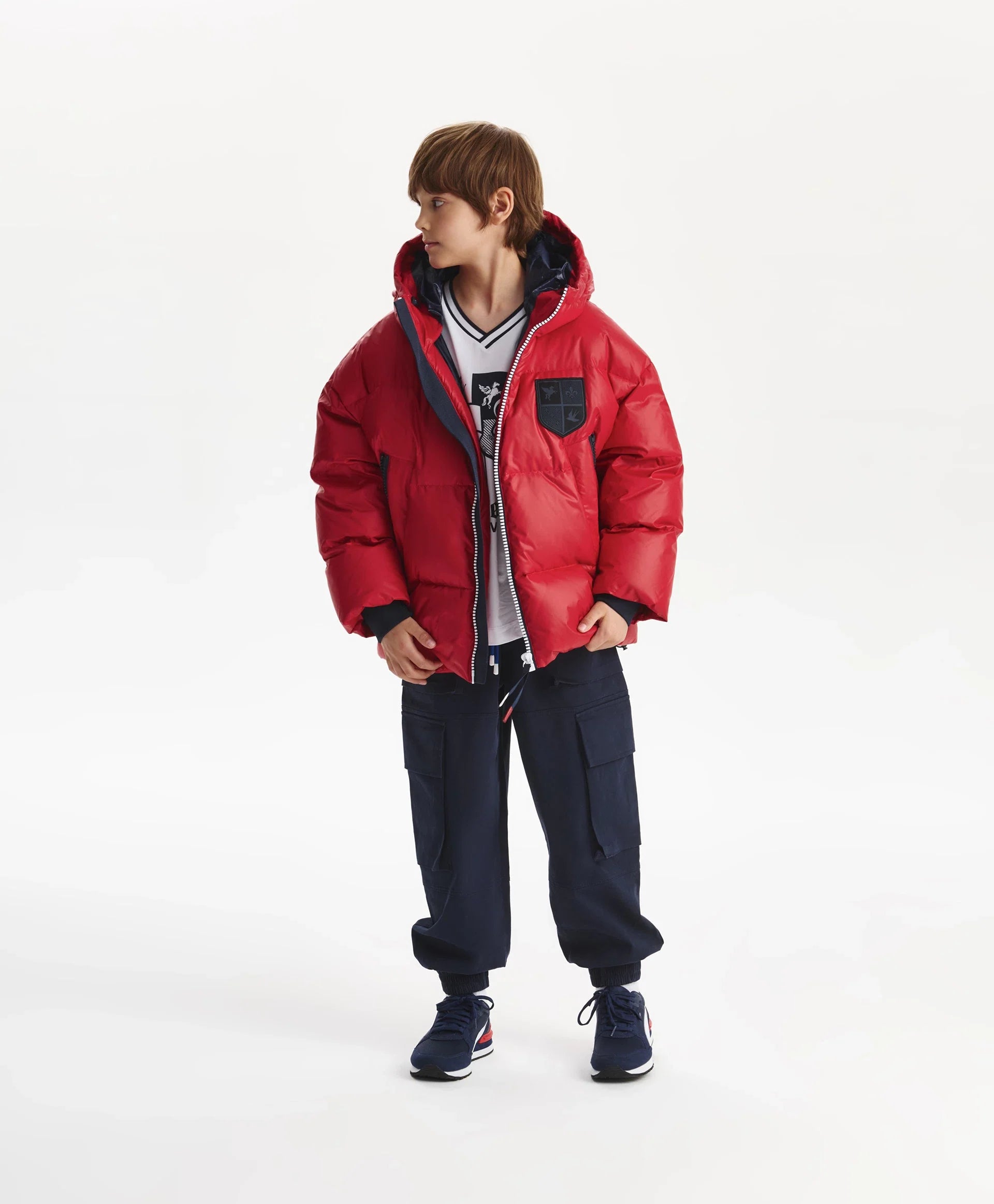 Geaca roșie matlasată din puf natural se va comporta excelent în condiții aspre de iarnă! Realizată din material impermeabil lucios, cu căptușeală moale, geaca îmbină estetica și eleganța unei piese ușoare de iarnă în stil preppy. Designul combină blocuri de culoare și detalii vibrante care adaugă dinamism. Contrastul dintre materialul exterior și căptușeală, manșetele din rib, fermoarele tip tractor, printurile tipografice și aplicațiile conferă gecii un aspect modern și premium. Dispune de șnururi interioare la glugă și la tivul inferior și se închide cu fermoar tip tractor pe bandă contrastantă colorată, cu cursor original. Pe spate este aplicat un print reflectorizant.