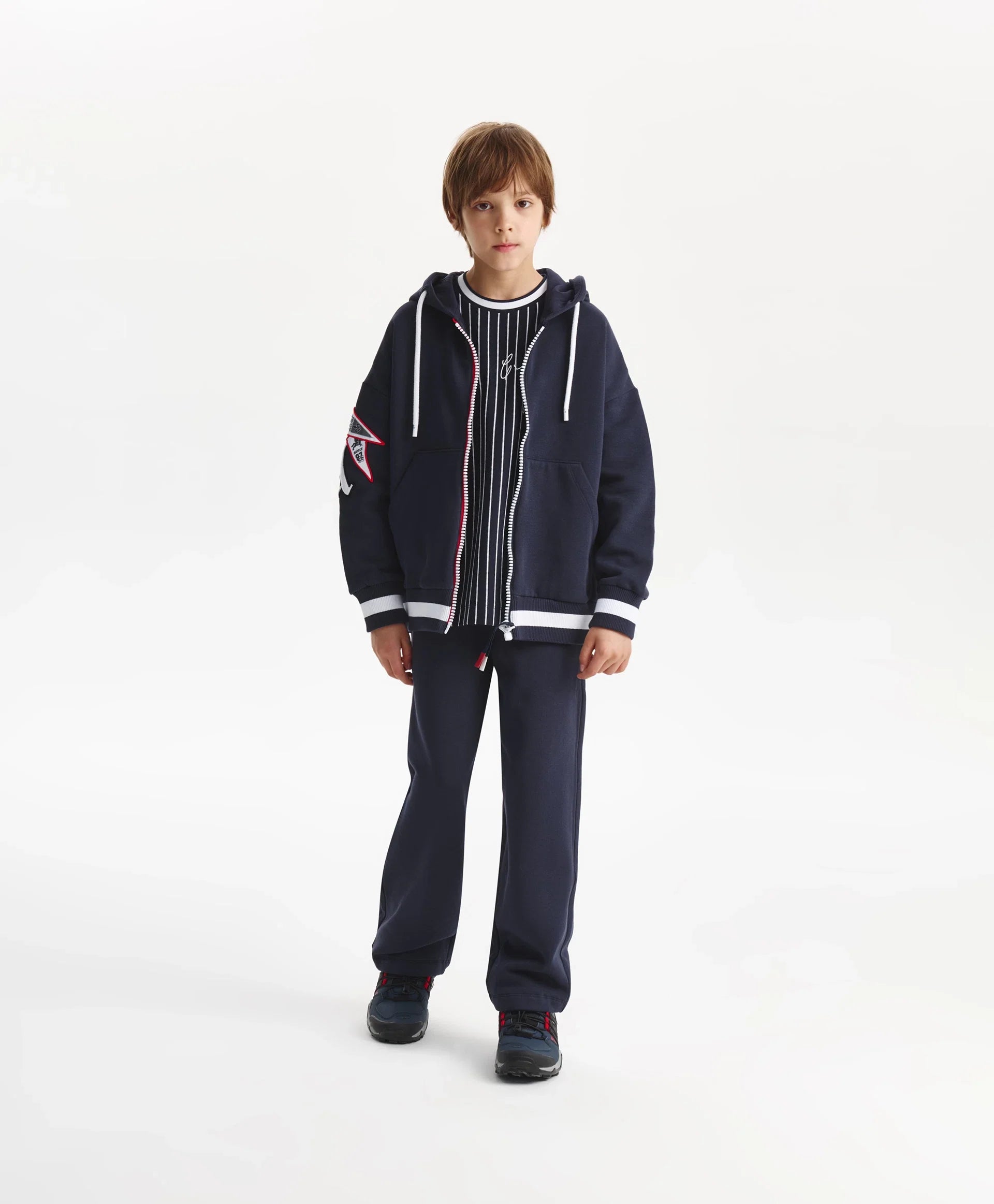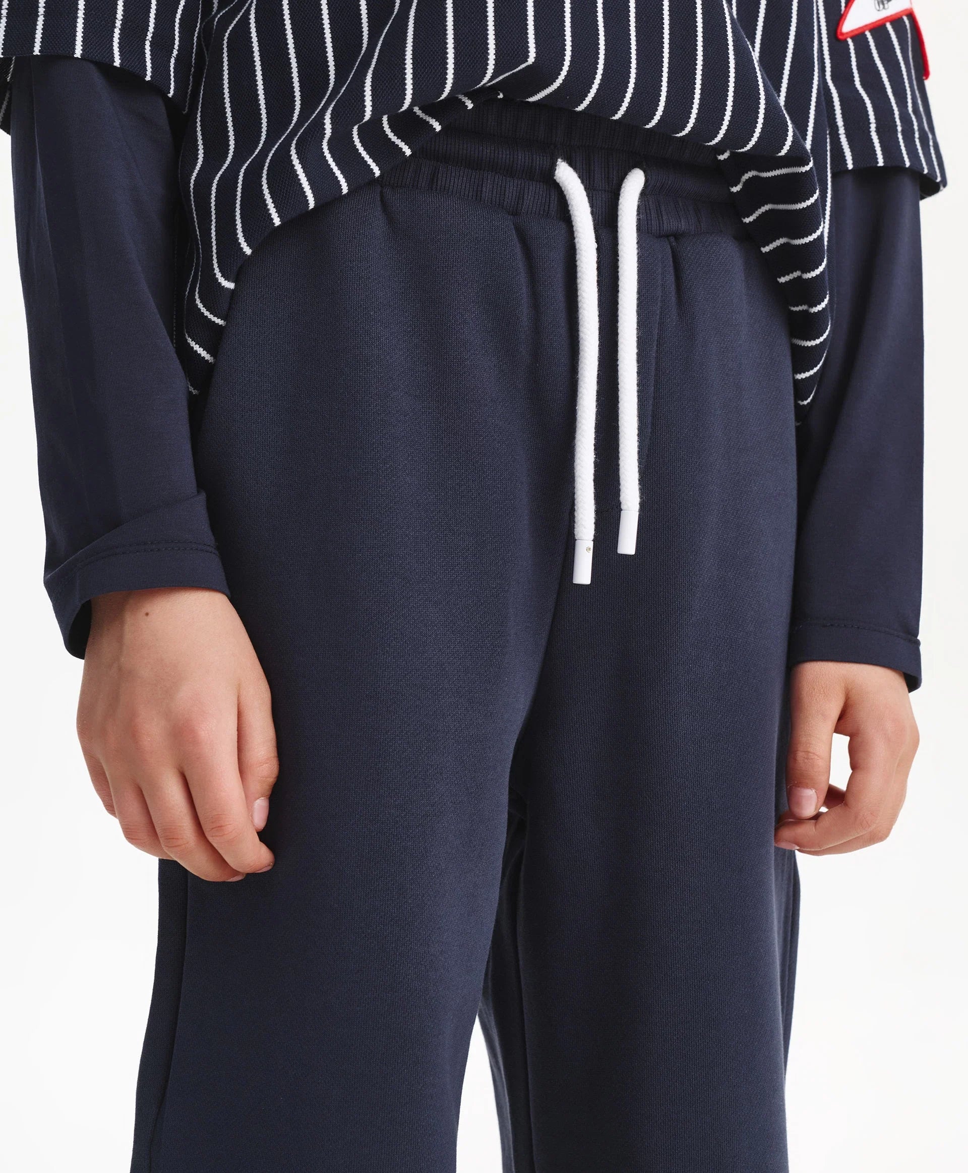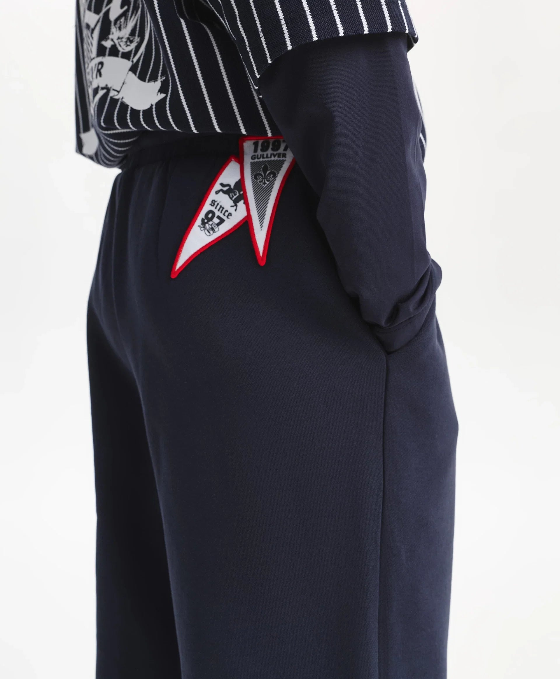 Pantalonii albaștri, cu croială dreaptă și lejeră, din futter de bumbac cu interior flaușat, sunt un must-have în garderoba practică de toamnă-iarnă. Talia elastică cu șnururi asigură o potrivire confortabilă, iar buzunarele laterale oblice sporesc funcționalitatea. Pe spate este aplicată o mică etichetă în stilul colecției Gulliver „College”.