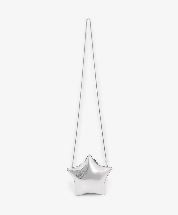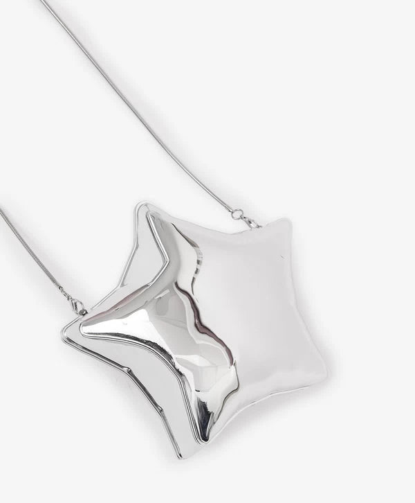 Un accesoriu perfect pentru orice ținută de sărbătoare este această geantă argintie, rigidă, în formă de stea, care se suspendă cu o lanț și un carabiner, iar interiorul este format dintr-un singur compartiment. Poate fi purtată ca geantă crossbody, cu lanț de umar prins cu carabiner.