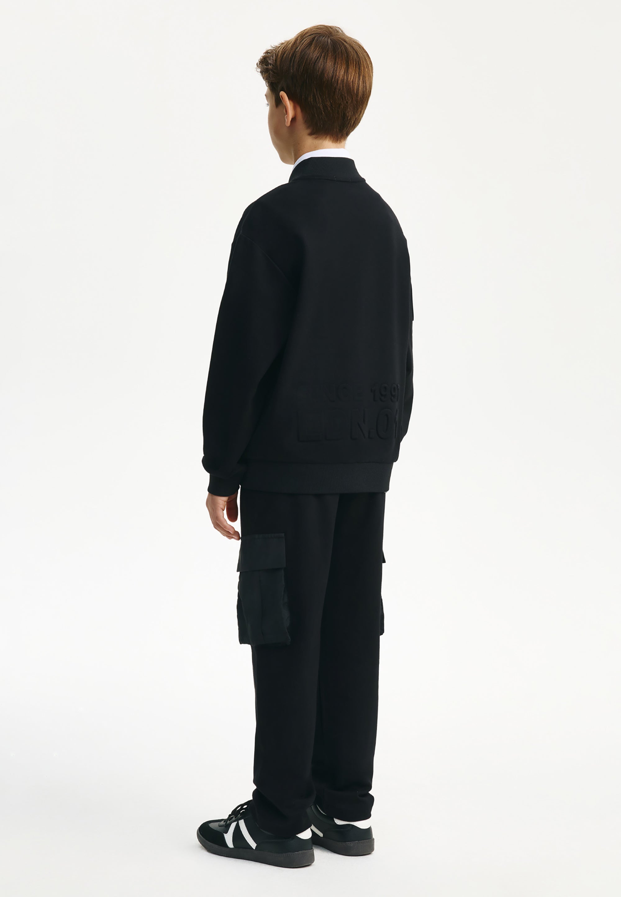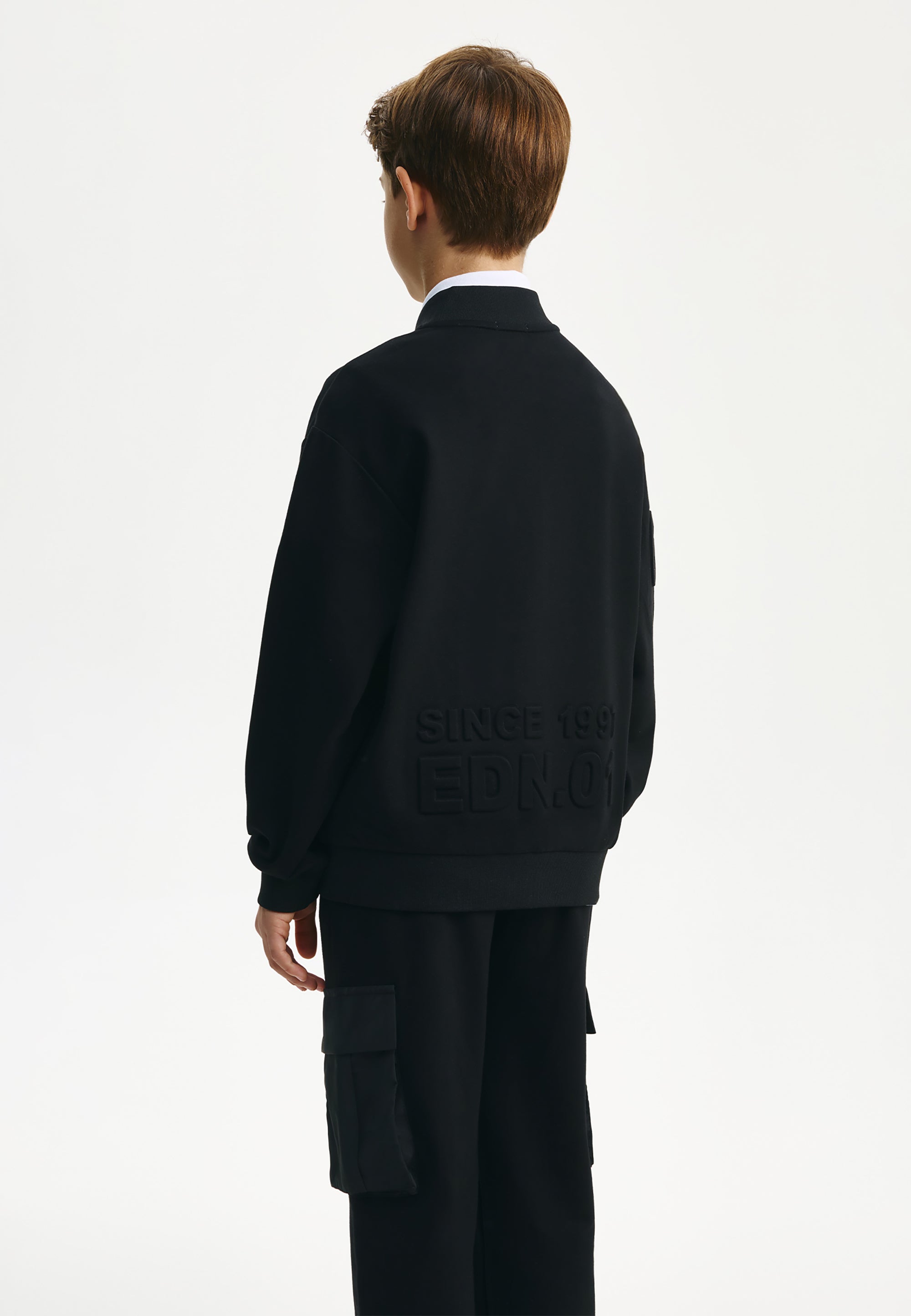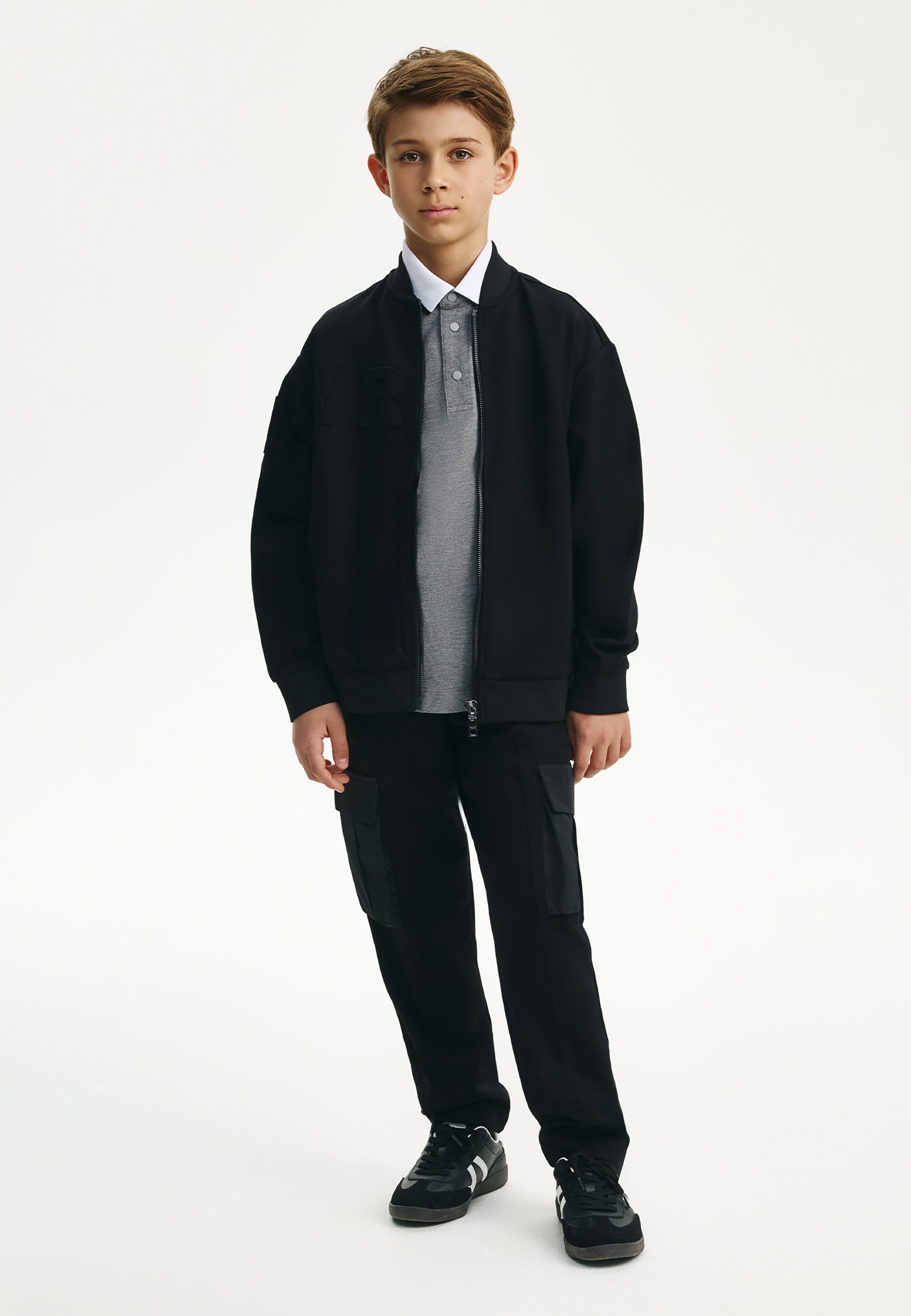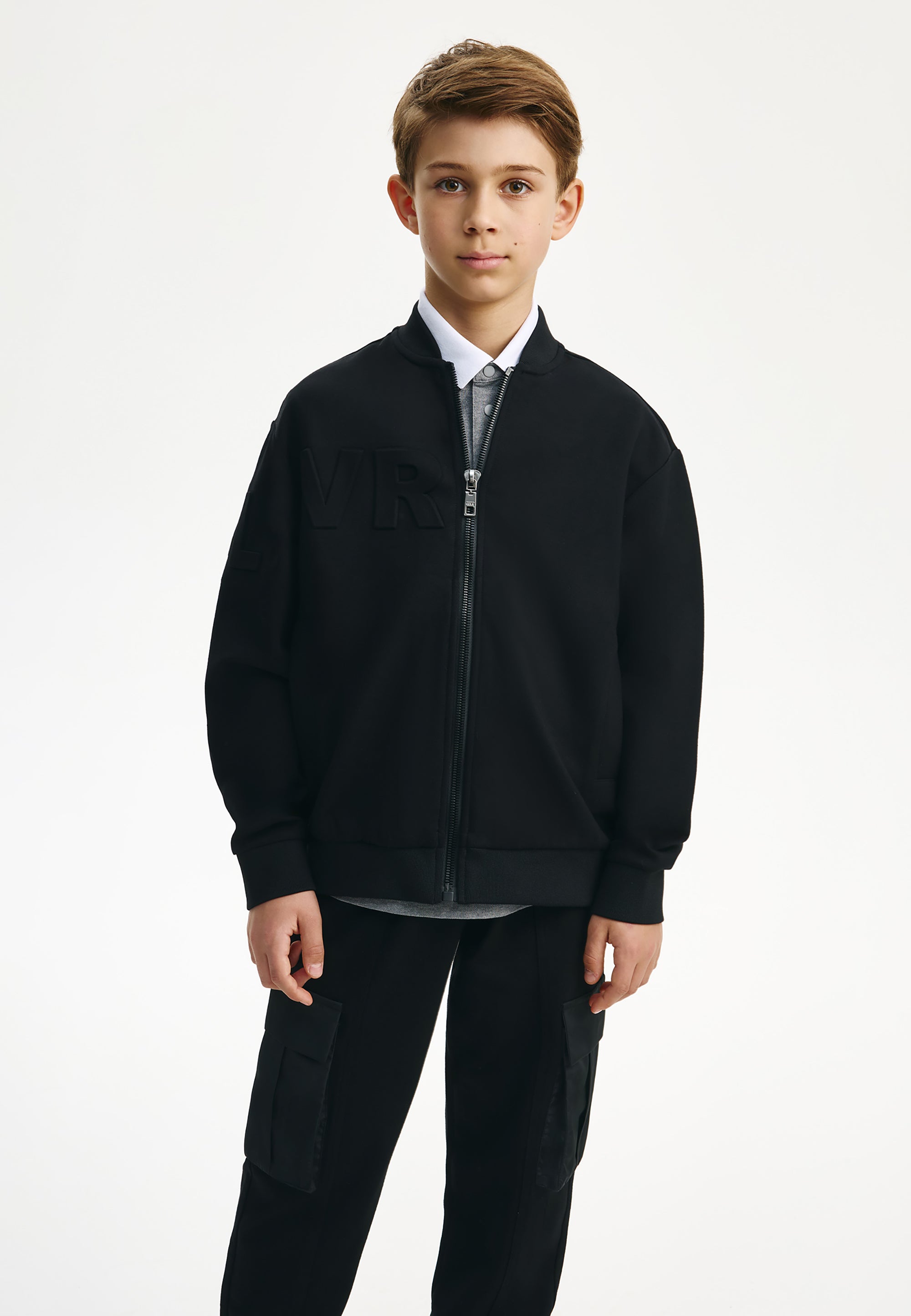 Черният суитшърт тип бомбър е идеално допълнение към стилните училищни визии на момчето. Бомбърът е изработен от меко трикомпонентно меланжирано джерси на основата на вискоза. Особеност на модела е релефното тиснение с едри елементи на шрифт в предната част, на ръкава и на гърба, което придава на суитшърта модерен облик. В същото време той изглежда минималистично и строго, вписвайки се отлично в училищния дрескод. Той се комбинира отлично с текстилни и трикотажни панталони, чино панталони, карго модели, дънки и джогъри, създавайки модерни и практични визии за училище, разходки и извънкласни занимания. Суитшъртът-бомбър ще се превърне в прекрасна алтернатива на сакото, жилетката или елека, ставайки основен атрибут на комфортните училищни визии в стил кежуал (casual). Суитшъртът се закопчава с цип.