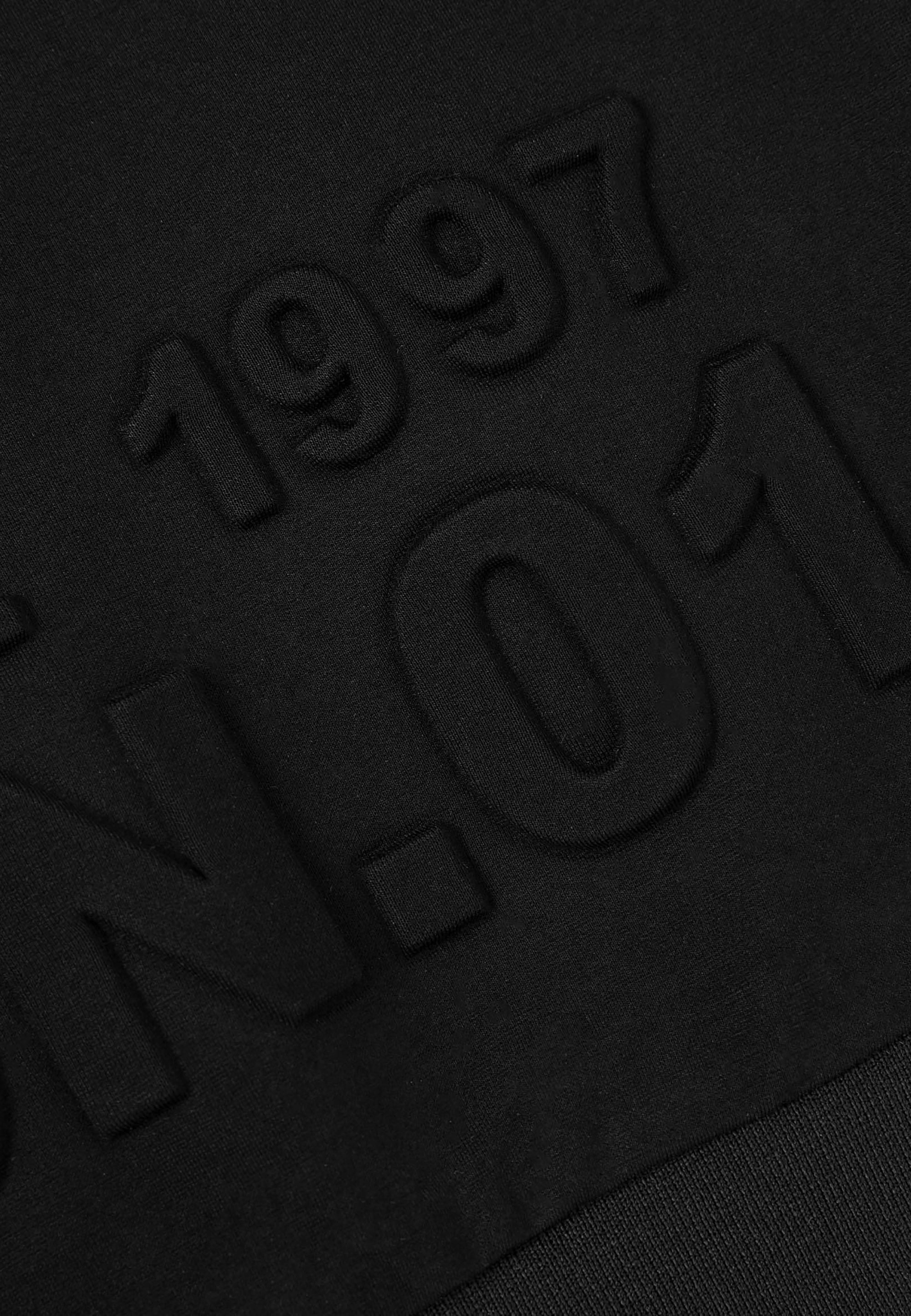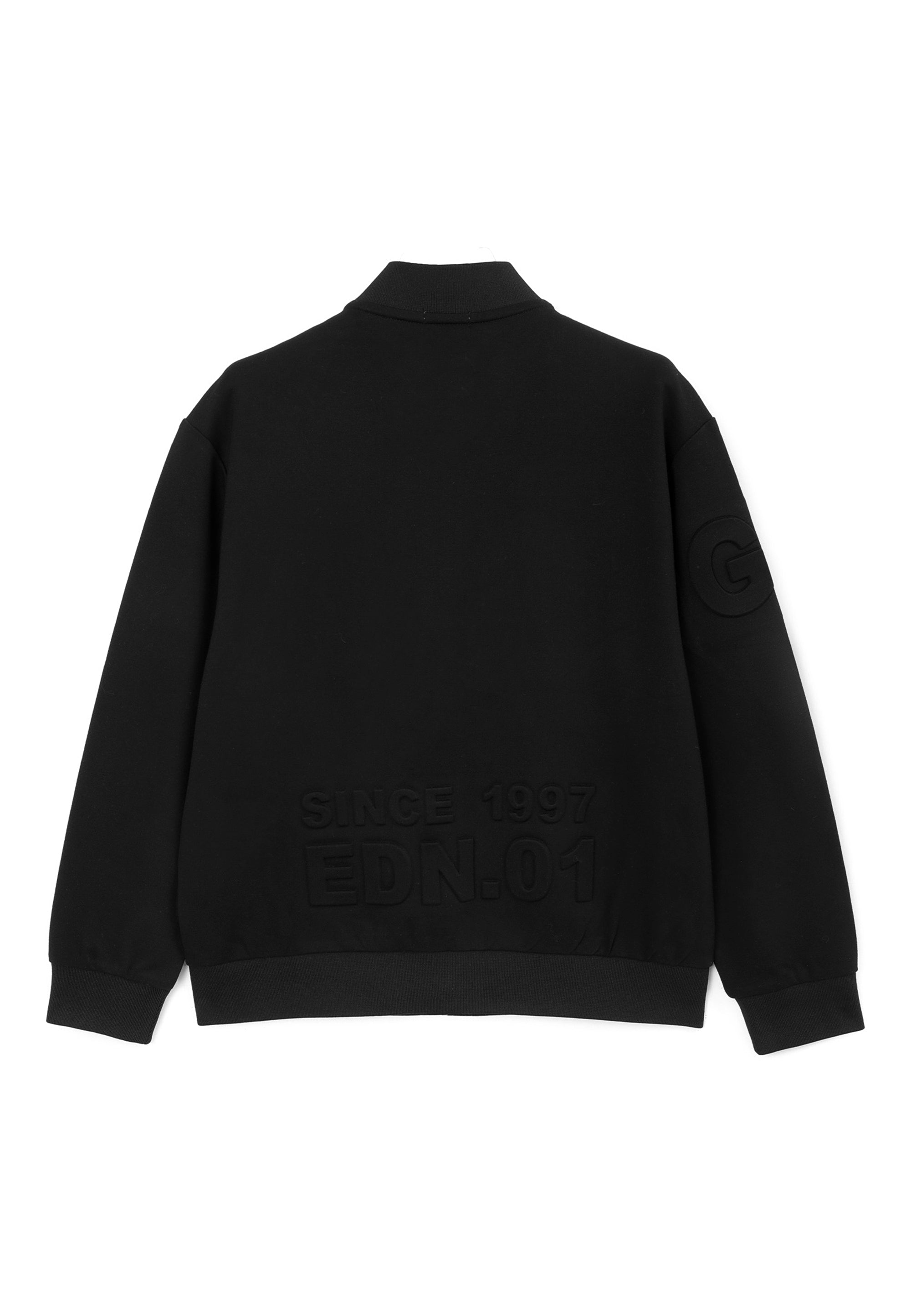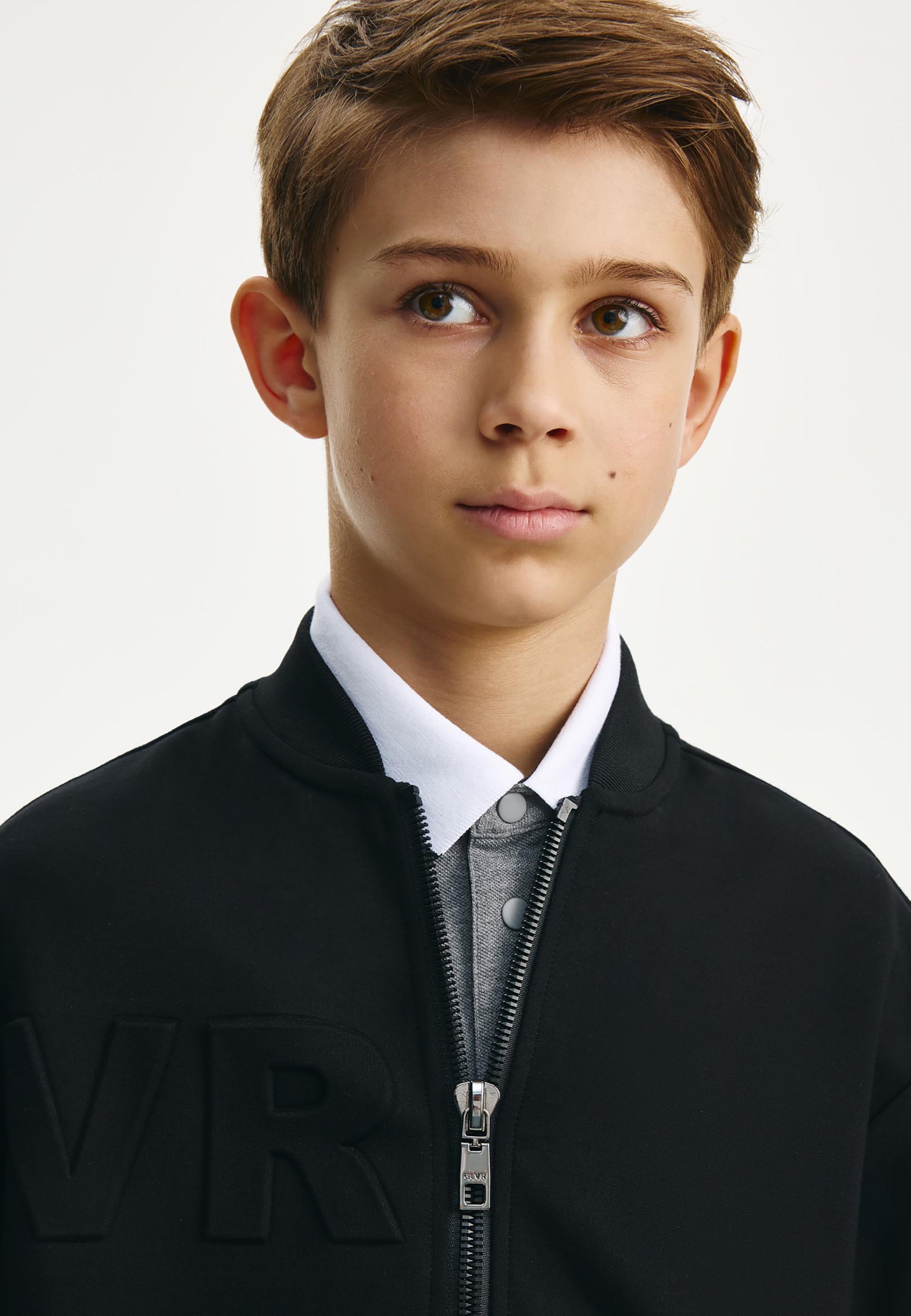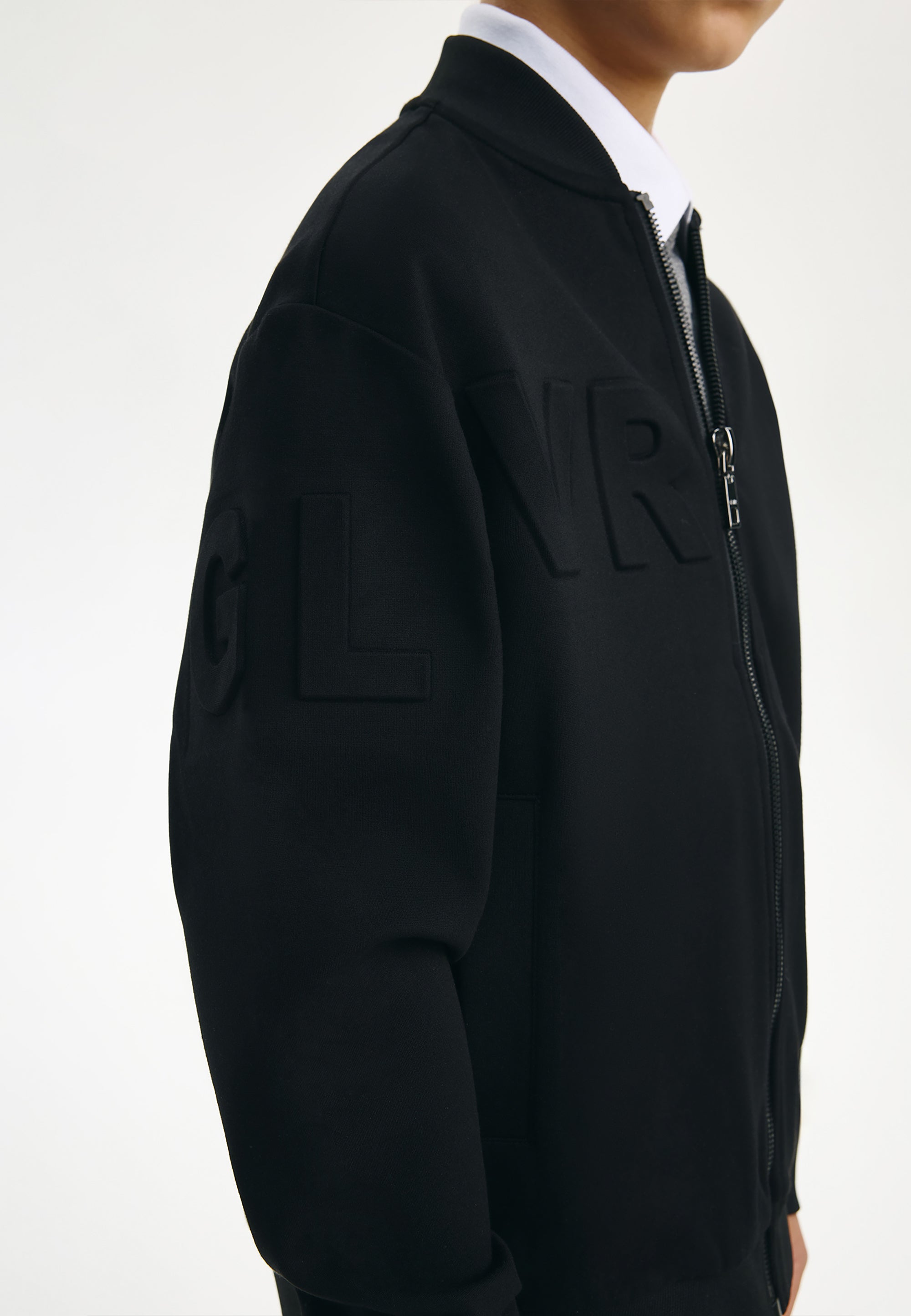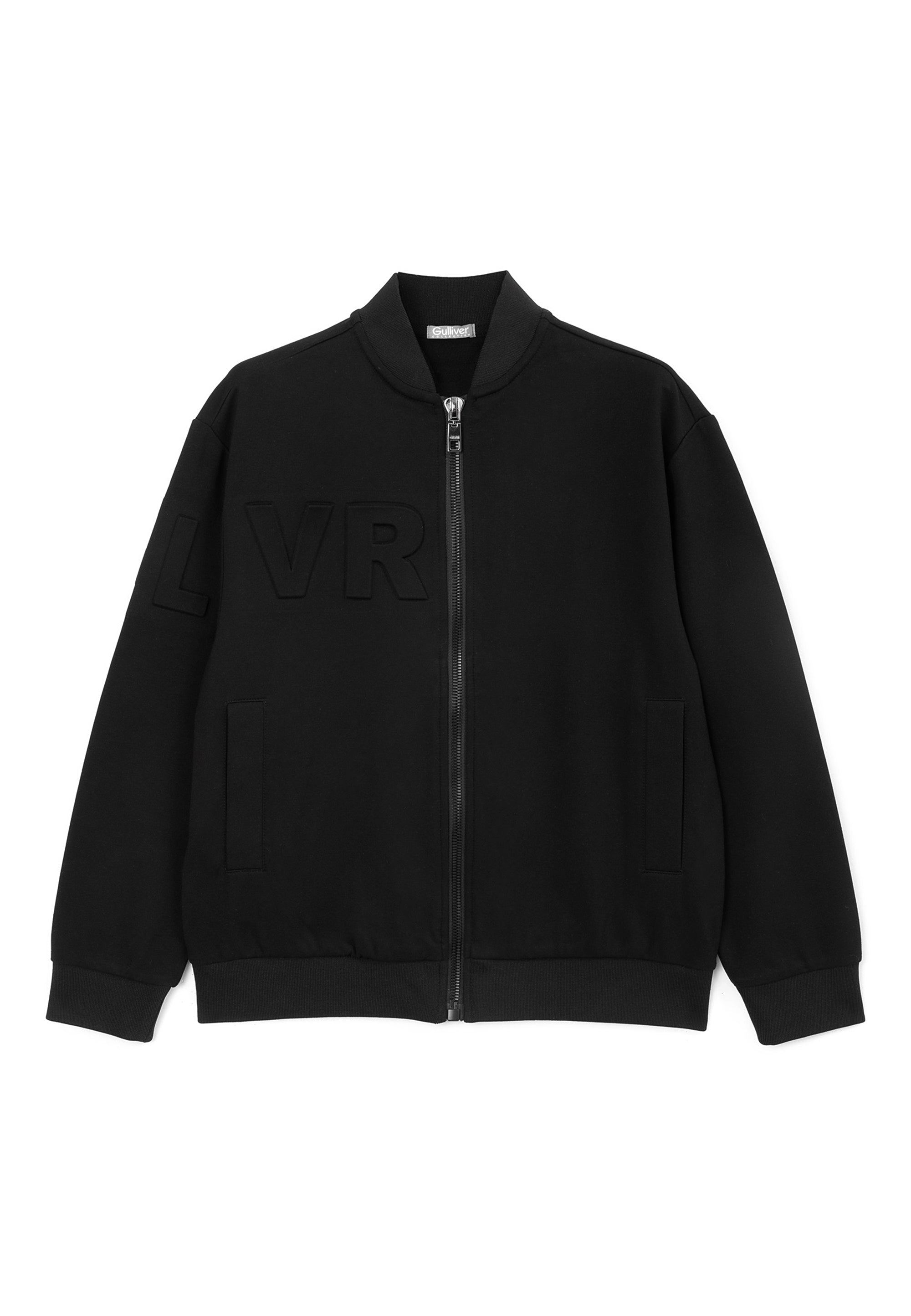 Черният суитшърт тип бомбър е идеално допълнение към стилните училищни визии на момчето. Бомбърът е изработен от меко трикомпонентно меланжирано джерси на основата на вискоза. Особеност на модела е релефното тиснение с едри елементи на шрифт в предната част, на ръкава и на гърба, което придава на суитшърта модерен облик. В същото време той изглежда минималистично и строго, вписвайки се отлично в училищния дрескод. Той се комбинира отлично с текстилни и трикотажни панталони, чино панталони, карго модели, дънки и джогъри, създавайки модерни и практични визии за училище, разходки и извънкласни занимания. Суитшъртът-бомбър ще се превърне в прекрасна алтернатива на сакото, жилетката или елека, ставайки основен атрибут на комфортните училищни визии в стил кежуал (casual). Суитшъртът се закопчава с цип.