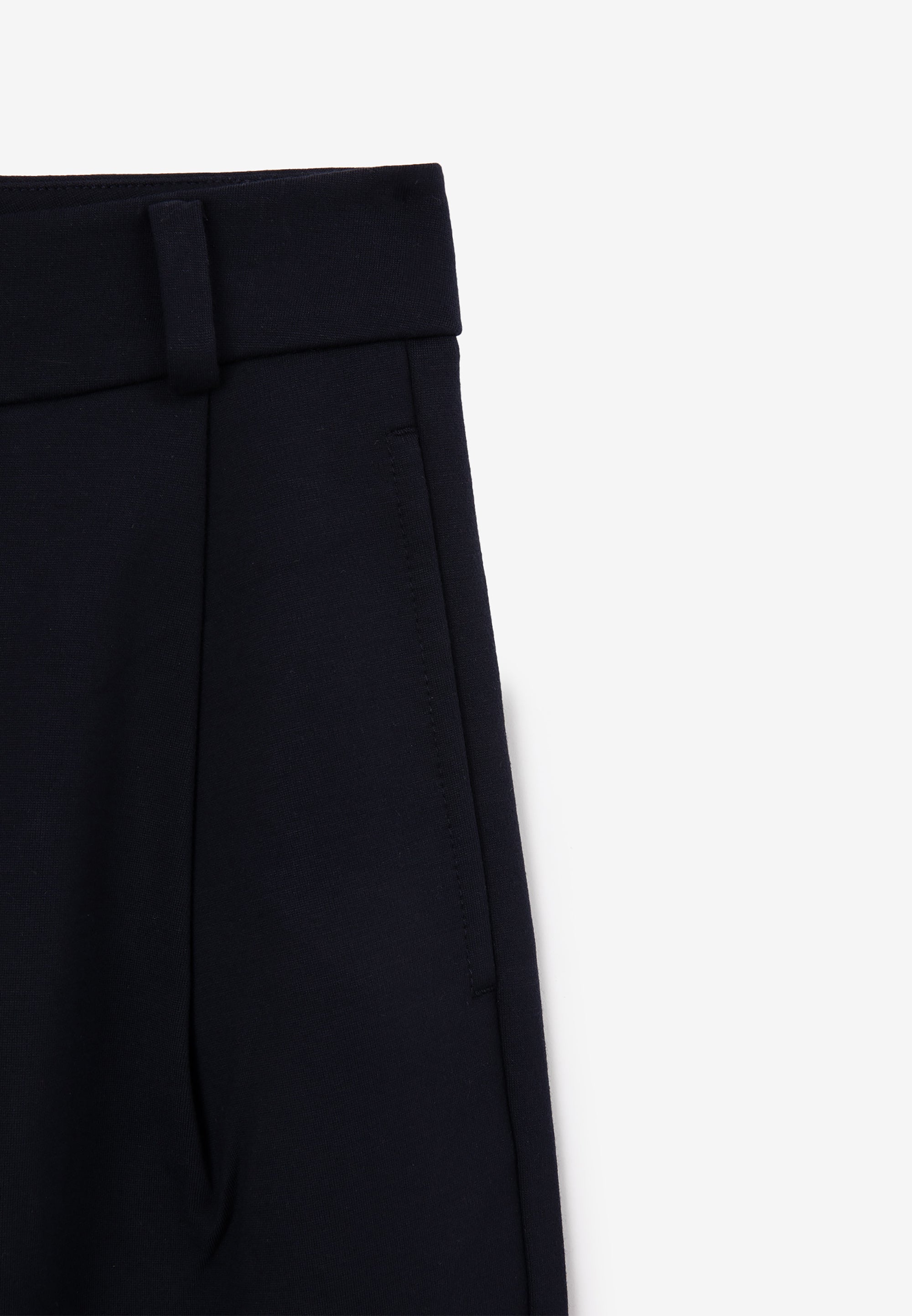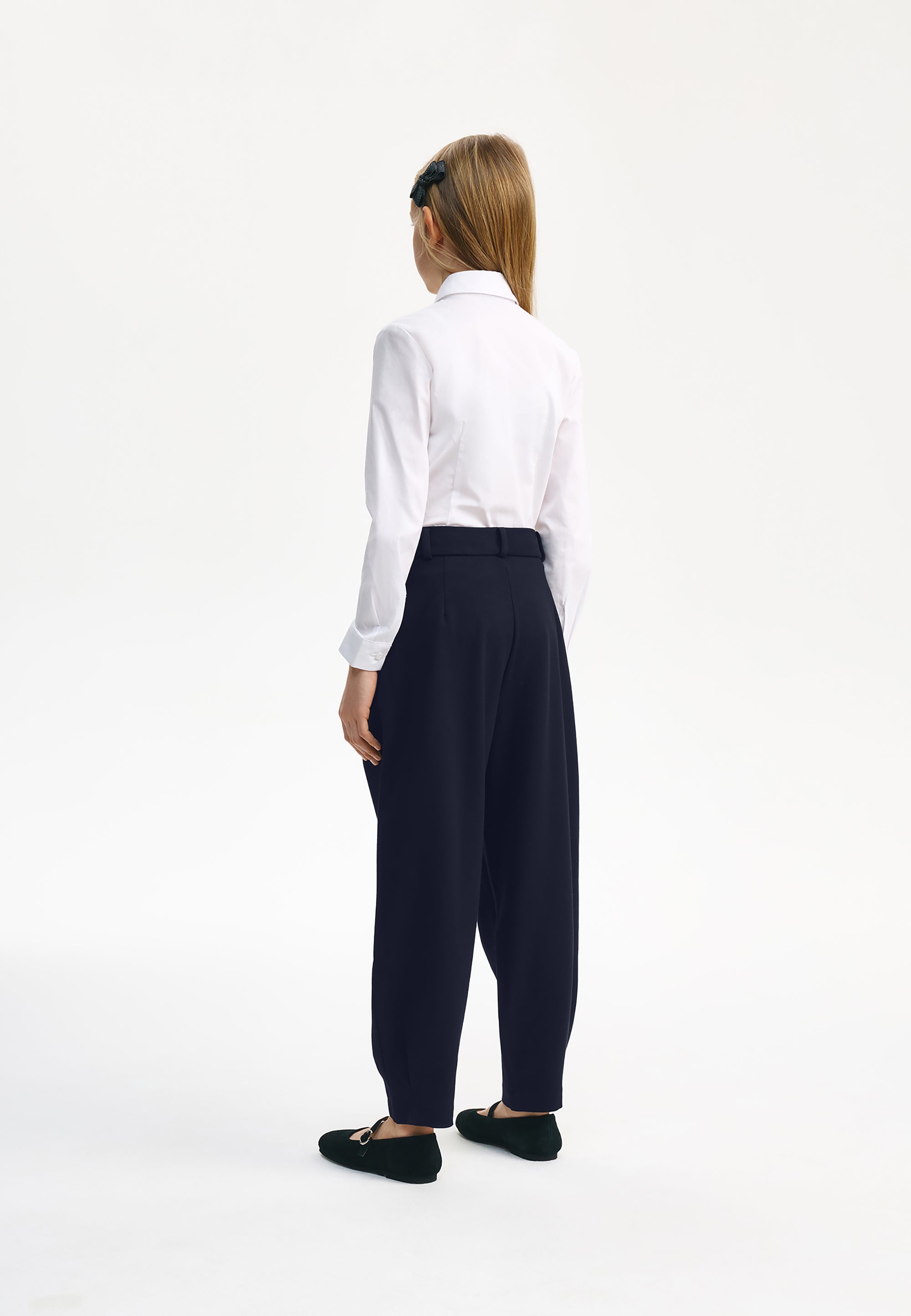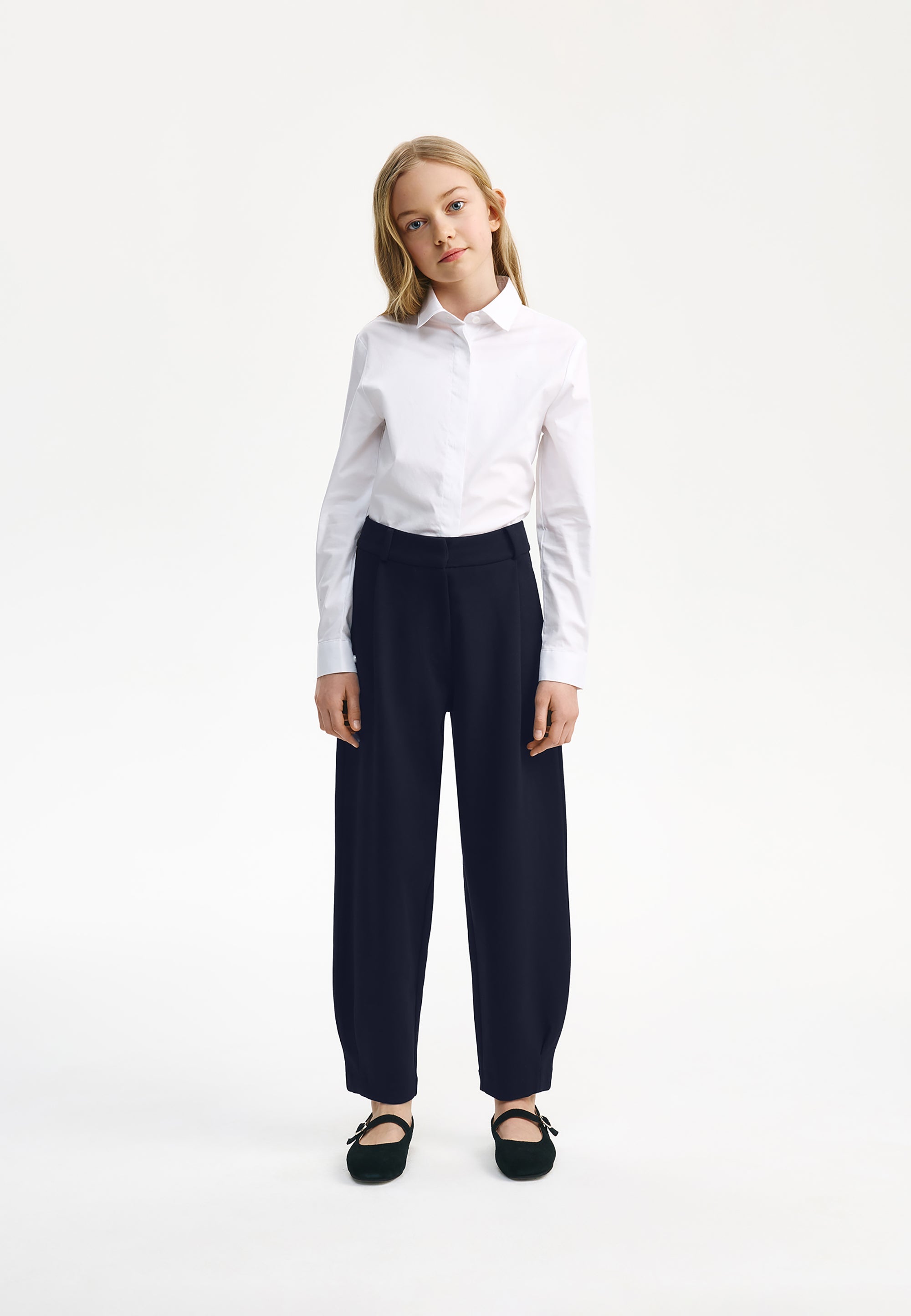 Сините трикотажни панталони тип „слоучи“ (от англ. slouchy — свободни, широки) са тренди елемент от училищния гардероб! Панталоните са изработени от меко и устойчиво на деформация джерси на основата на вискоза, което има гладка матова повърхност, много приятна при допир. Високата талия и характерната форма със силно стесняване към глезена, подобна на панталоните тип „банан“, създават отчетлив модерен облик. Панталоните имат джобове в страничните шевове, необходими за комфортна експлоатация. Коланът с вътрешно регулиране на ширината помага за напасване на модела по фигурата. Панталоните се закопчава с цип, скрито копче-кукичка и вътрешно копче. Гайките на колана позволяват добавянето на колан като аксесоар. Училищните „слоучи“ панталони се съчетават прекрасно с класически и скъсени блузи, с всякакви трикотажни и плетени изделия, с жилетки и жакети в овърсайз силует и с блузи с дълъг ръкав със свободна кройка, създавайки актуални училищни визии.