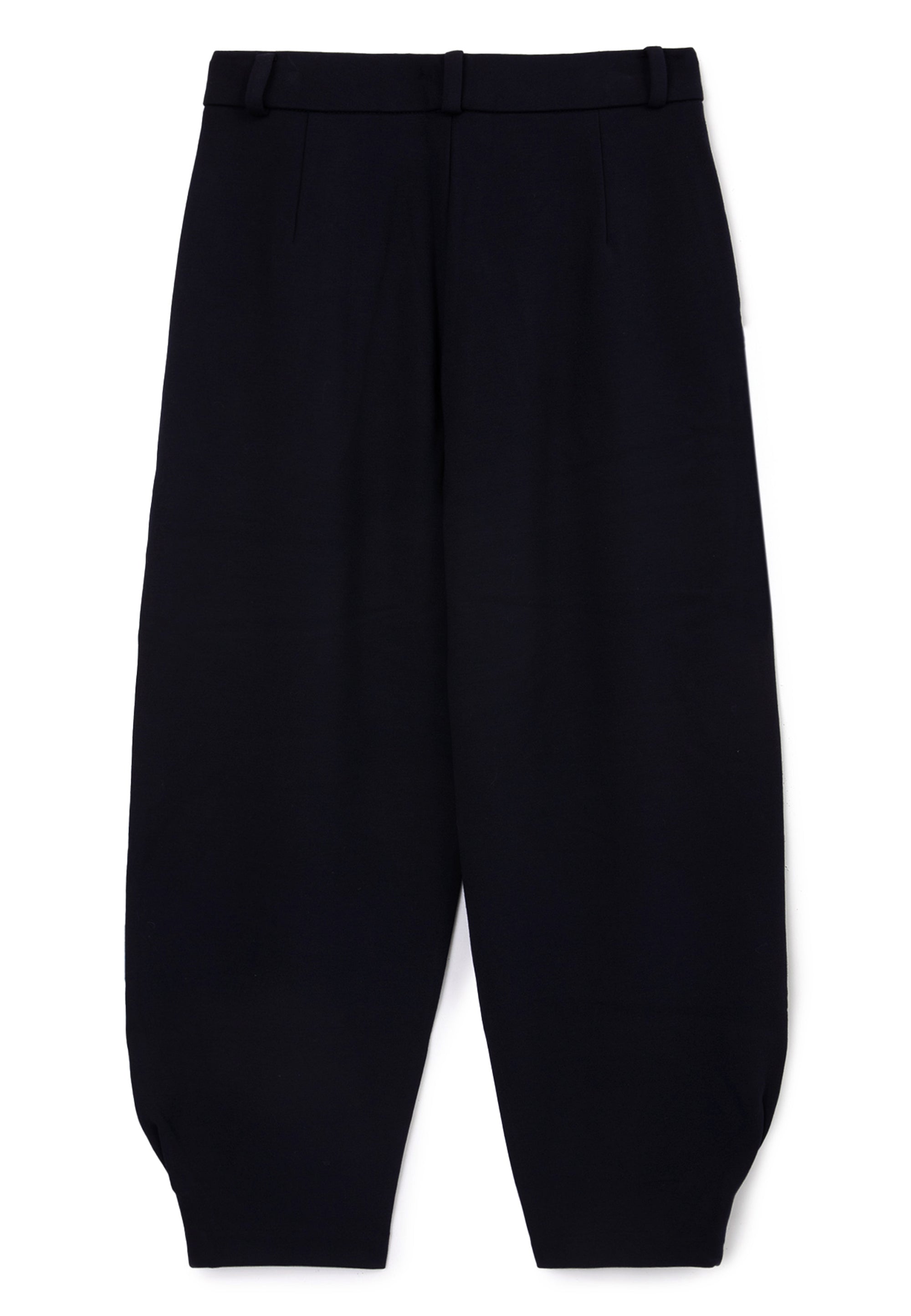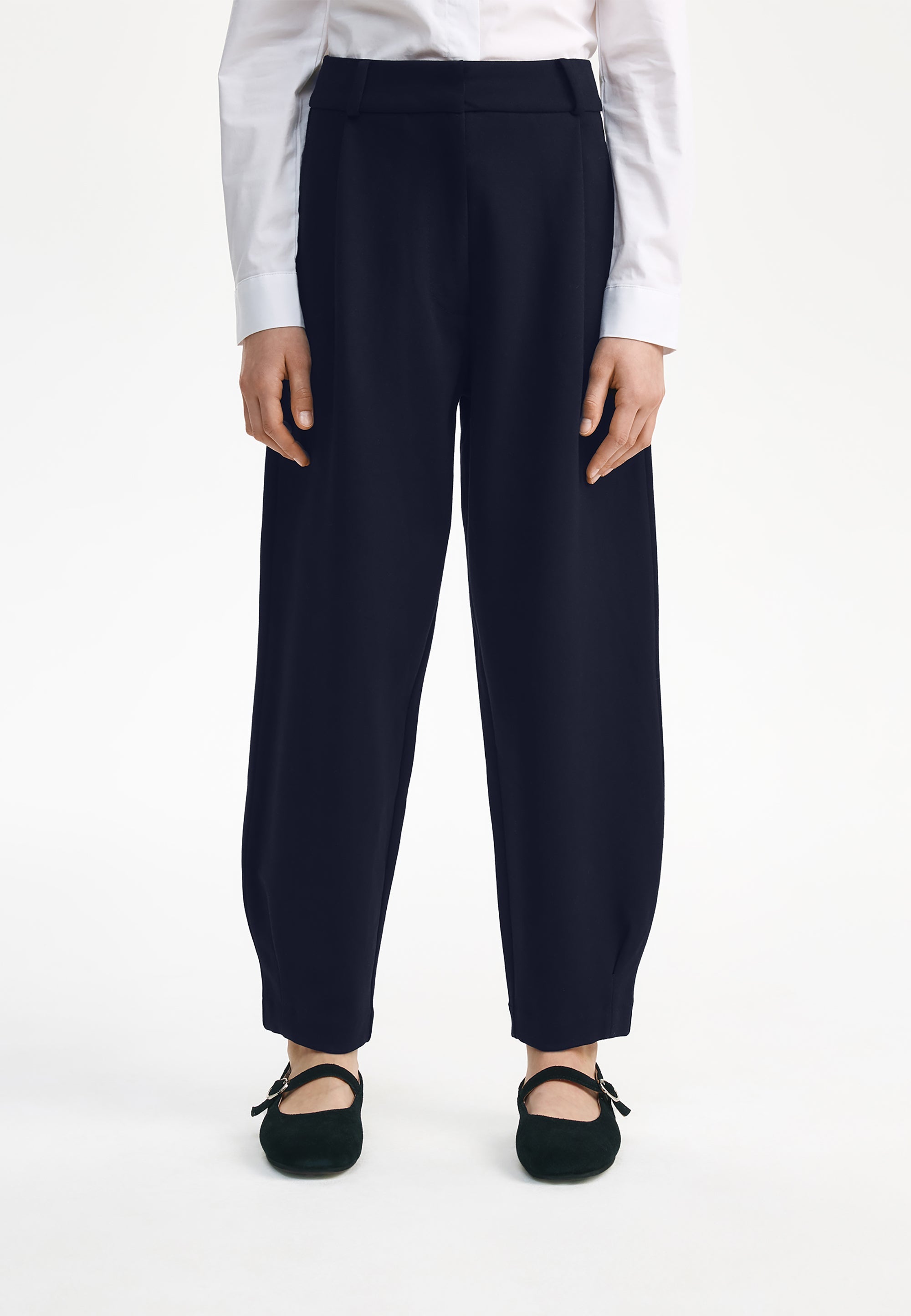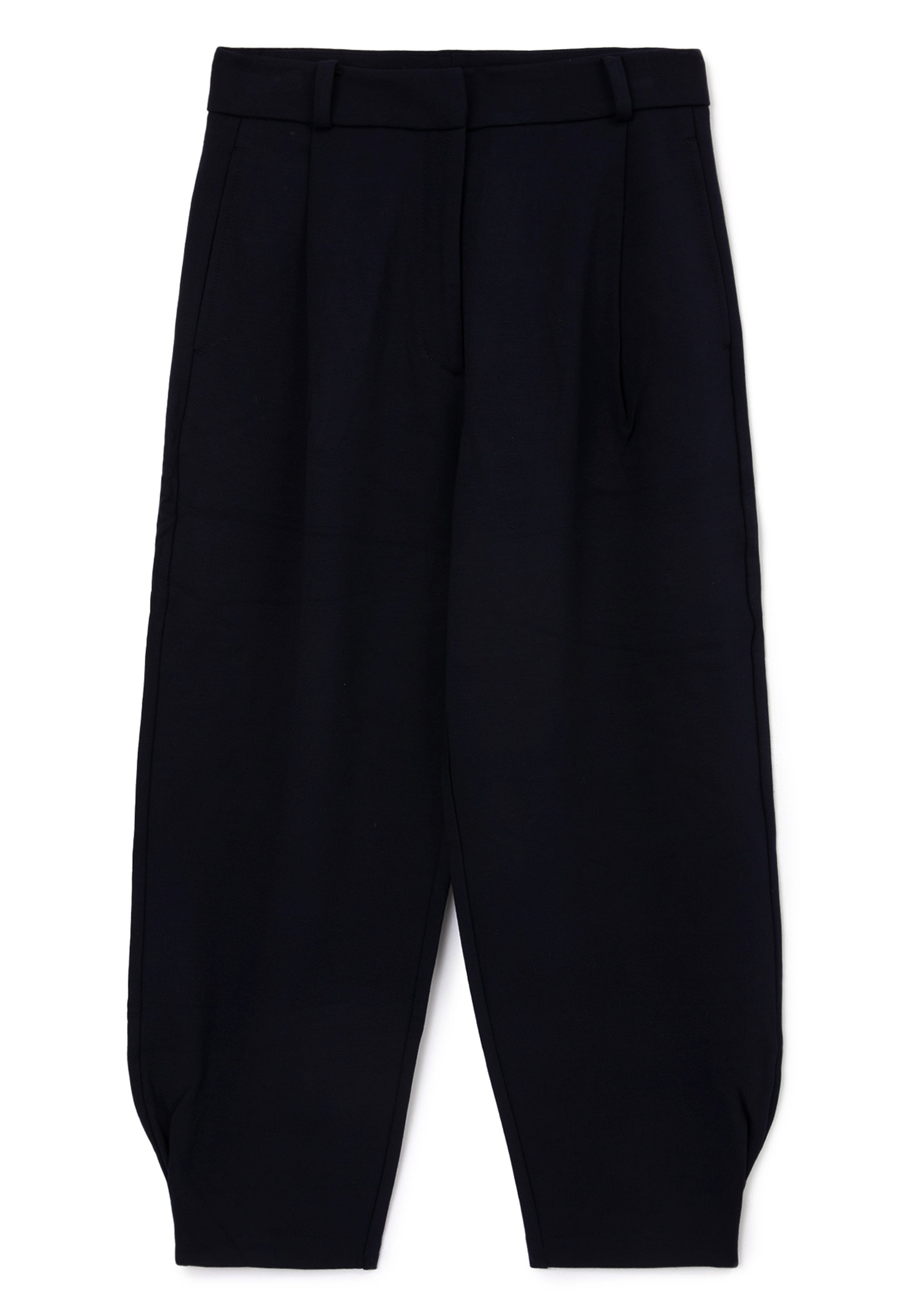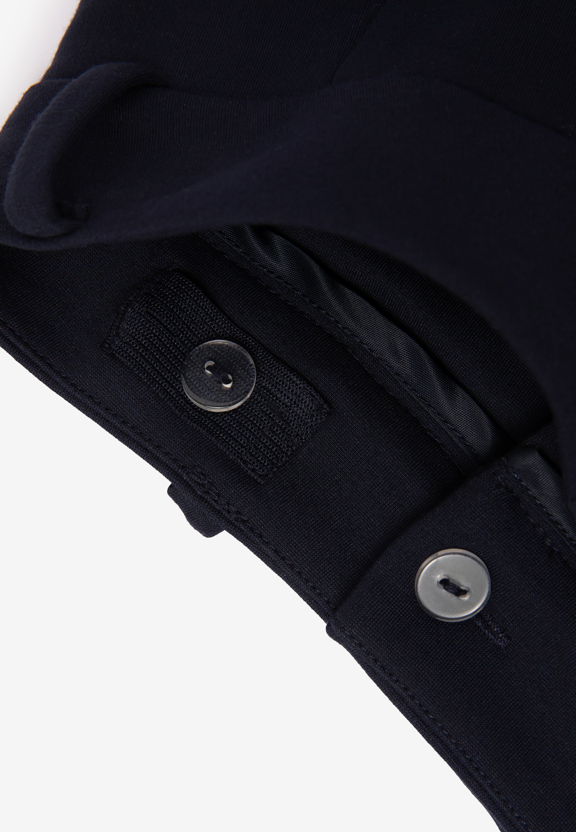 Сините трикотажни панталони тип „слоучи“ (от англ. slouchy — свободни, широки) са тренди елемент от училищния гардероб! Панталоните са изработени от меко и устойчиво на деформация джерси на основата на вискоза, което има гладка матова повърхност, много приятна при допир. Високата талия и характерната форма със силно стесняване към глезена, подобна на панталоните тип „банан“, създават отчетлив модерен облик. Панталоните имат джобове в страничните шевове, необходими за комфортна експлоатация. Коланът с вътрешно регулиране на ширината помага за напасване на модела по фигурата. Панталоните се закопчава с цип, скрито копче-кукичка и вътрешно копче. Гайките на колана позволяват добавянето на колан като аксесоар. Училищните „слоучи“ панталони се съчетават прекрасно с класически и скъсени блузи, с всякакви трикотажни и плетени изделия, с жилетки и жакети в овърсайз силует и с блузи с дълъг ръкав със свободна кройка, създавайки актуални училищни визии.