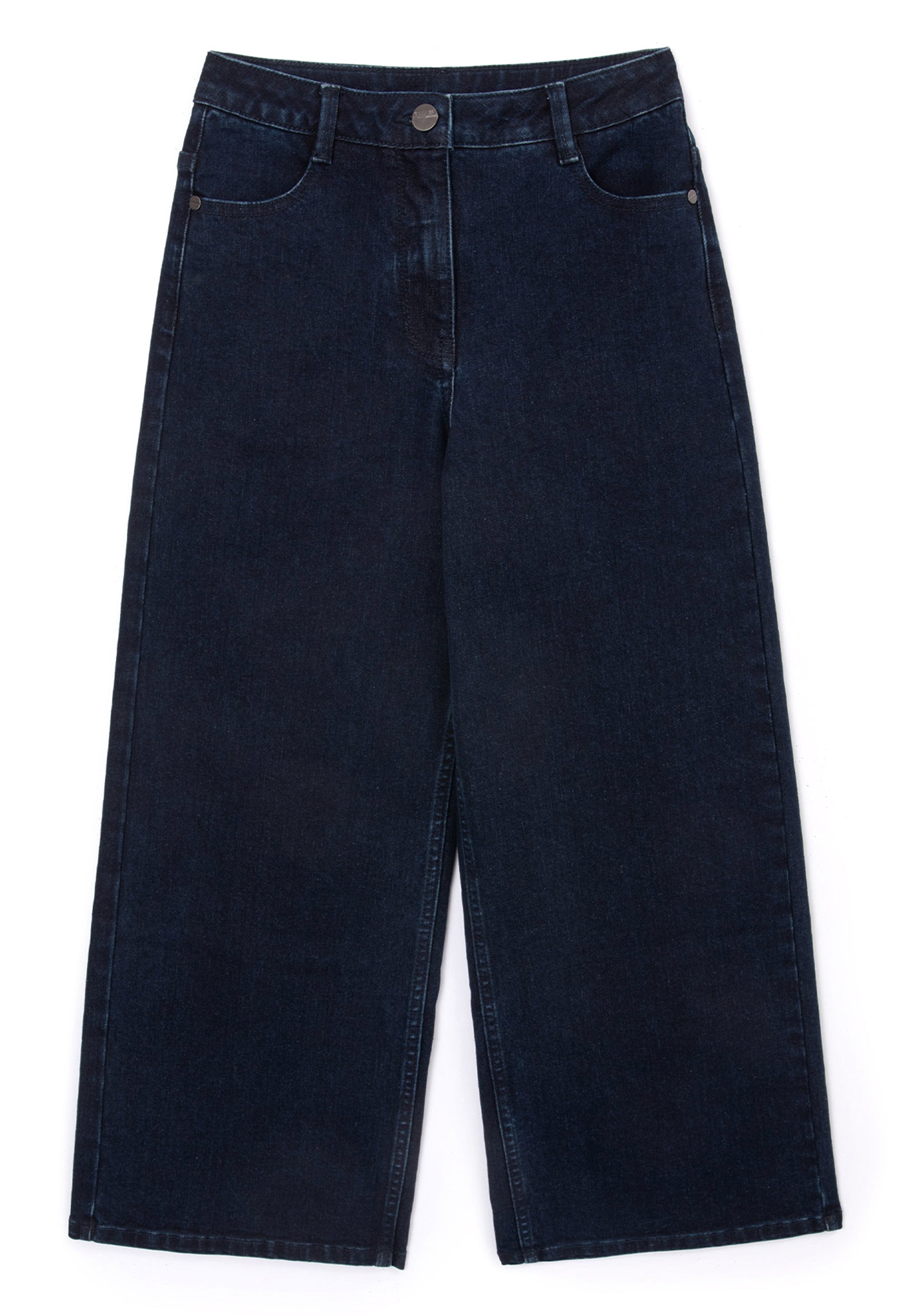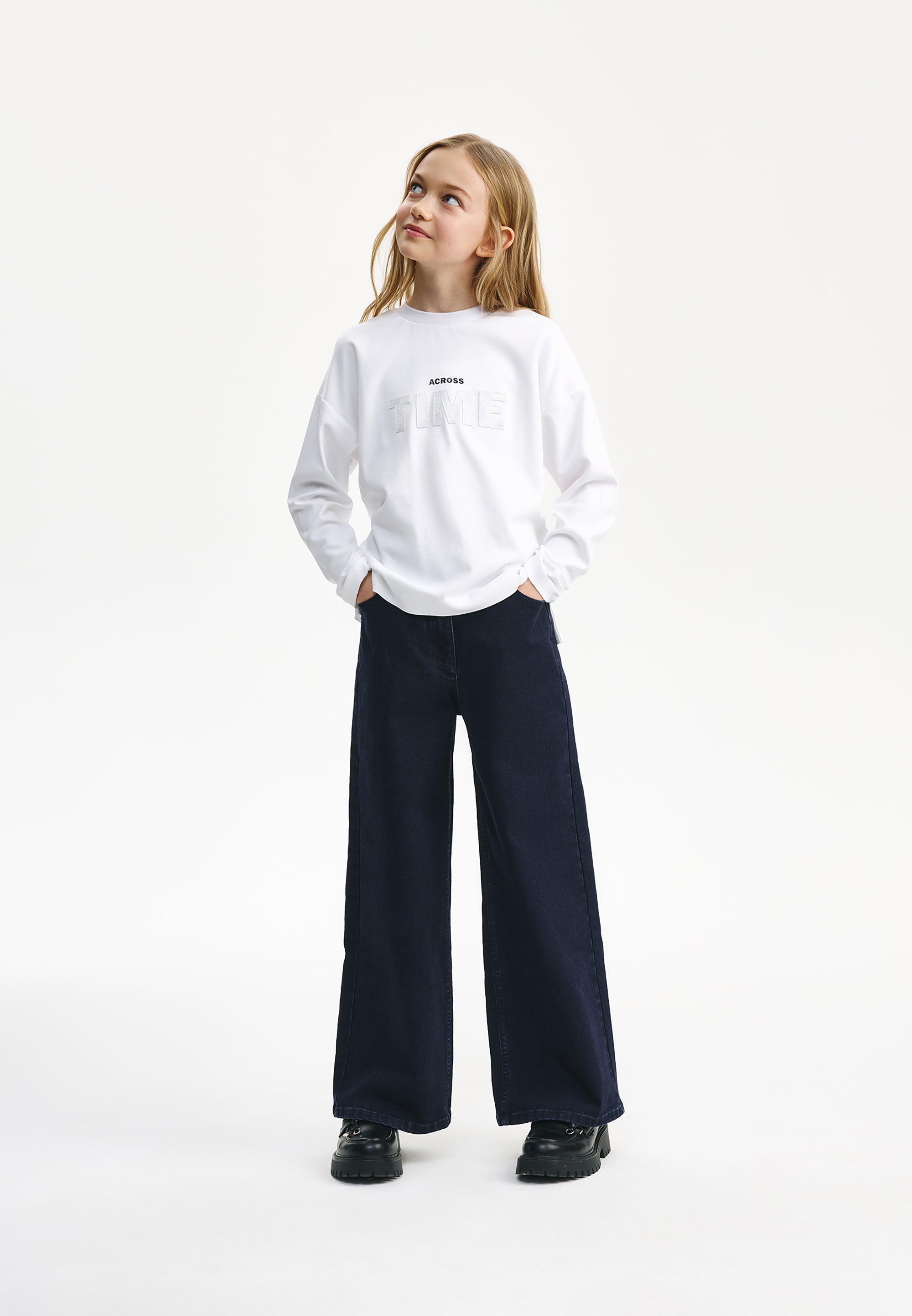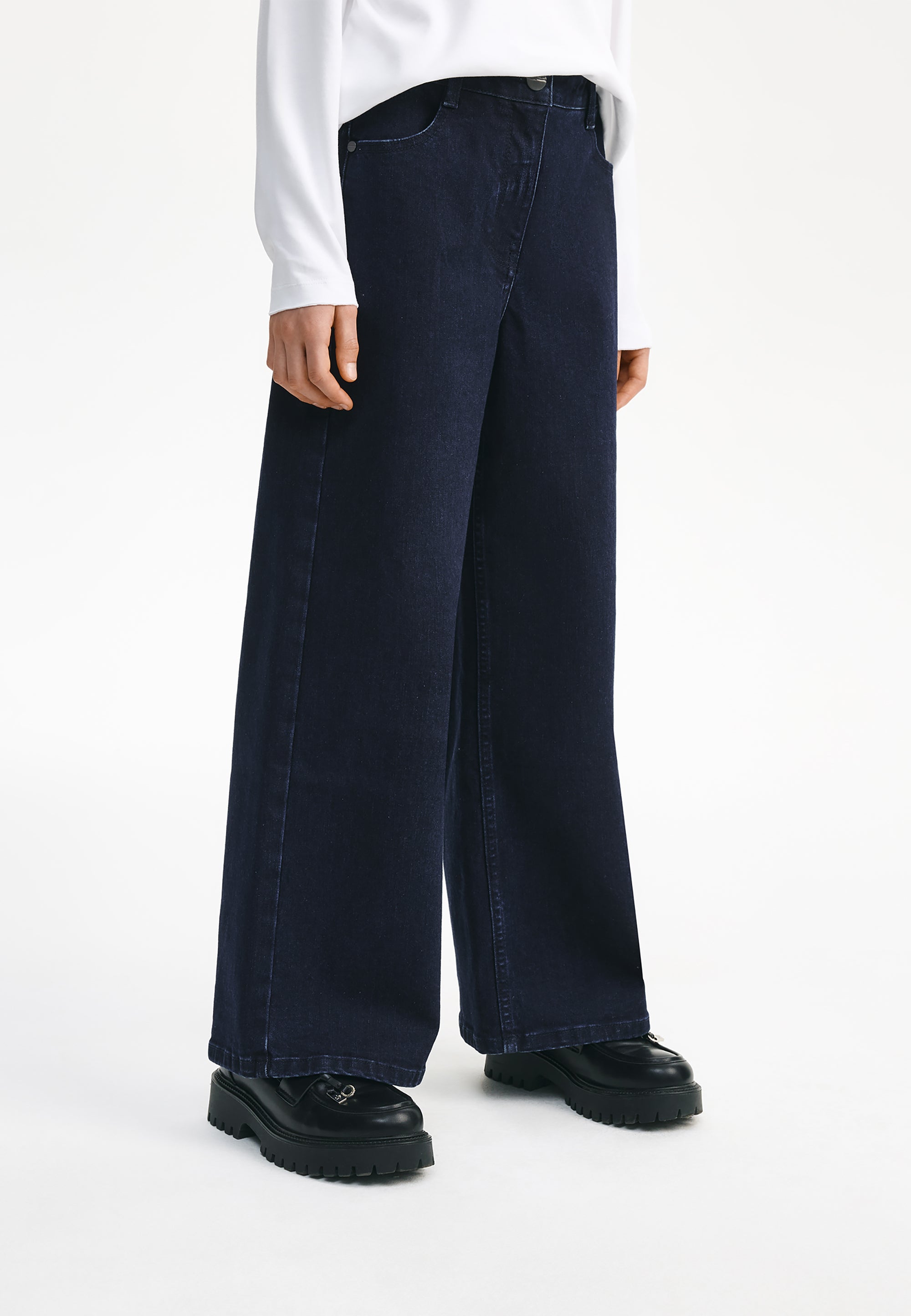 Сините дънки със силует „палацо“ са универсален модел, който лесно ще се впише както в училищния, така и в ежедневния гардероб на момичето. Дънките са изработени от здрав и плътен памучен деним с еластан. Специалната обработка е създала омекотяващ ефект, придавайки на изделието леко, едва забележимо изтриване по шевовете, което не пречи на създаването на визии в съответствие с училищния дрескод. Те се съчетават прекрасно с делово сако и жилетка, с блуза и елек, с поло блуза и блуза с дълъг ръкав. Петте стандартни джоба правят училищните дънки практични и функционални. Модната форма допринася за тяхната популярност сред тийнейджърките.