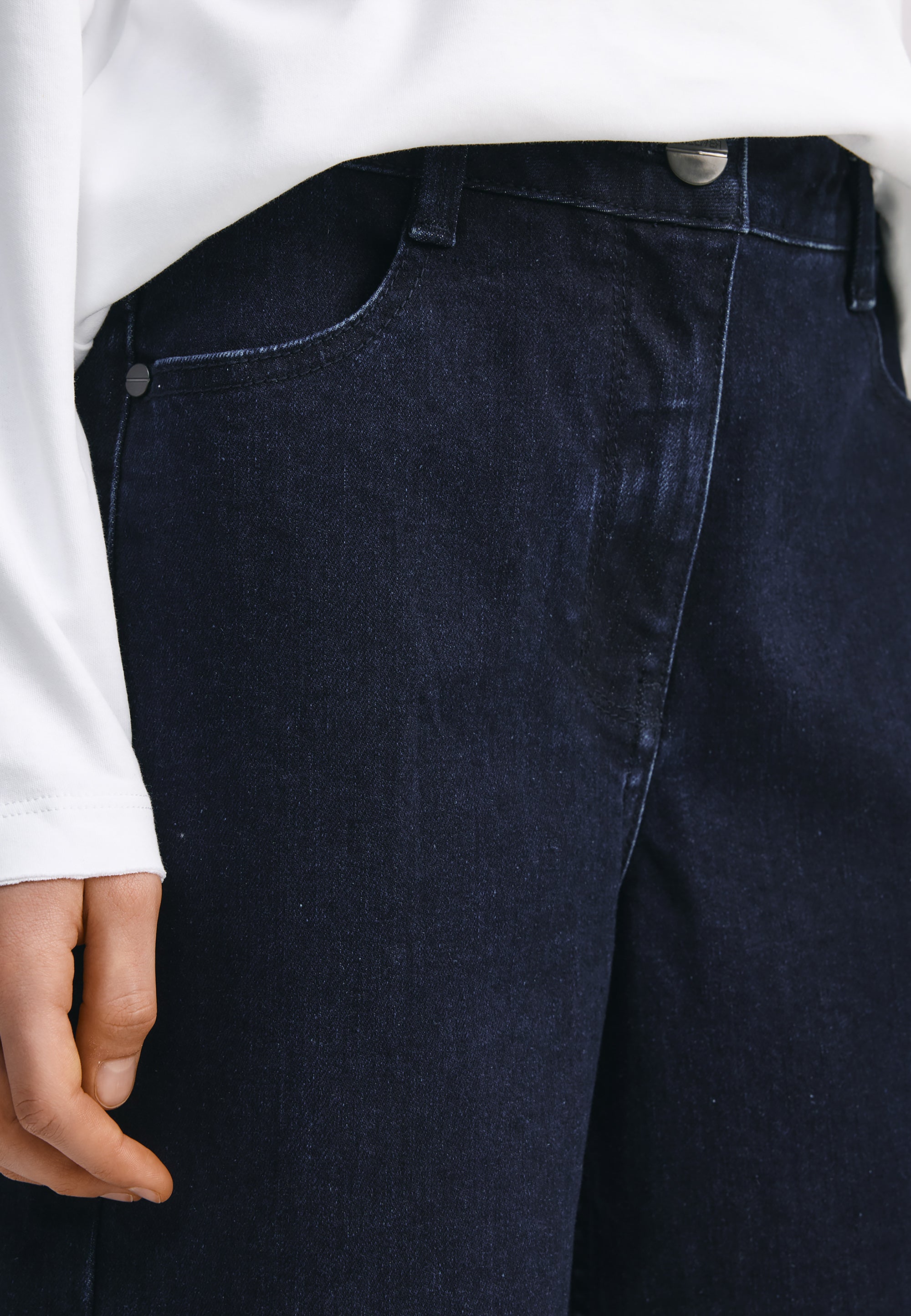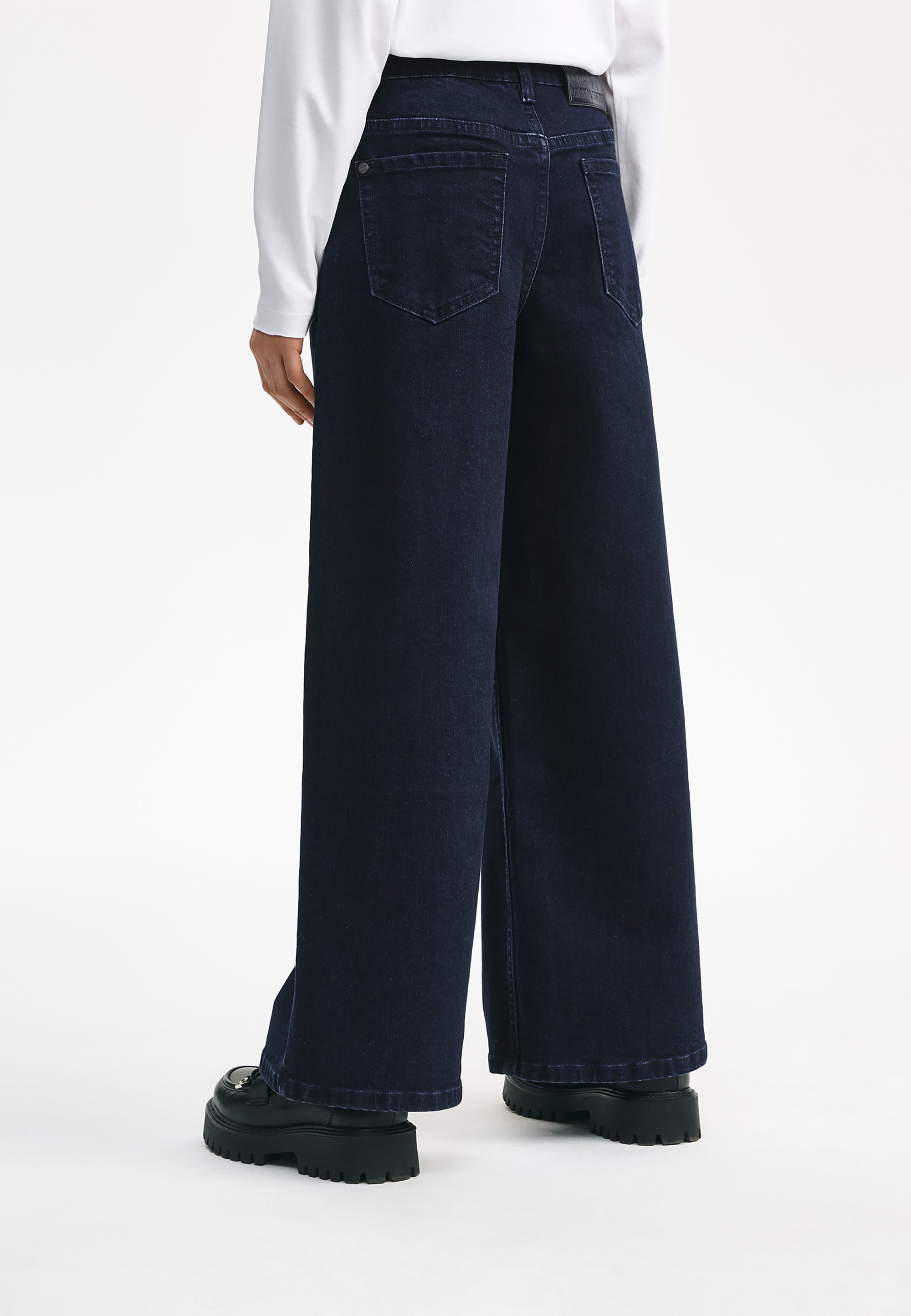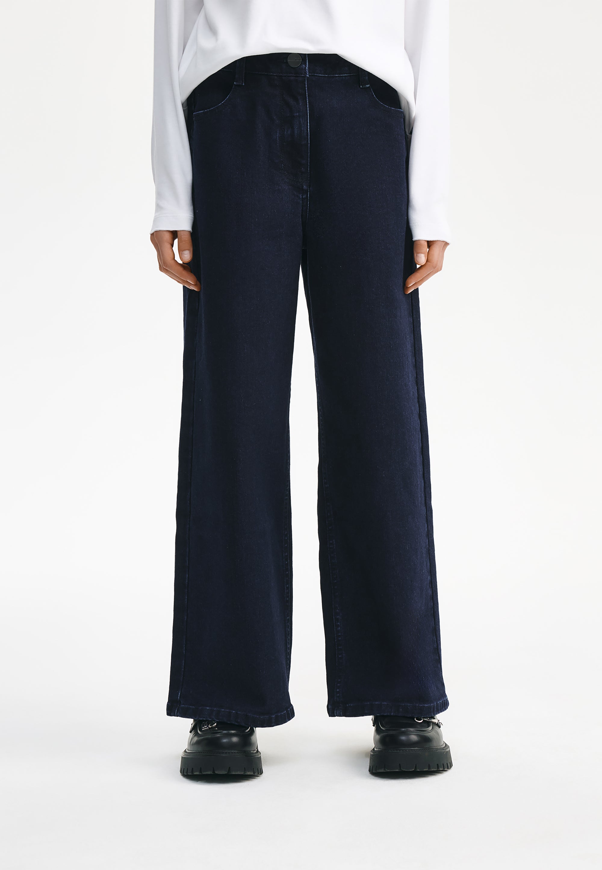 Сините дънки със силует „палацо“ са универсален модел, който лесно ще се впише както в училищния, така и в ежедневния гардероб на момичето. Дънките са изработени от здрав и плътен памучен деним с еластан. Специалната обработка е създала омекотяващ ефект, придавайки на изделието леко, едва забележимо изтриване по шевовете, което не пречи на създаването на визии в съответствие с училищния дрескод. Те се съчетават прекрасно с делово сако и жилетка, с блуза и елек, с поло блуза и блуза с дълъг ръкав. Петте стандартни джоба правят училищните дънки практични и функционални. Модната форма допринася за тяхната популярност сред тийнейджърките.