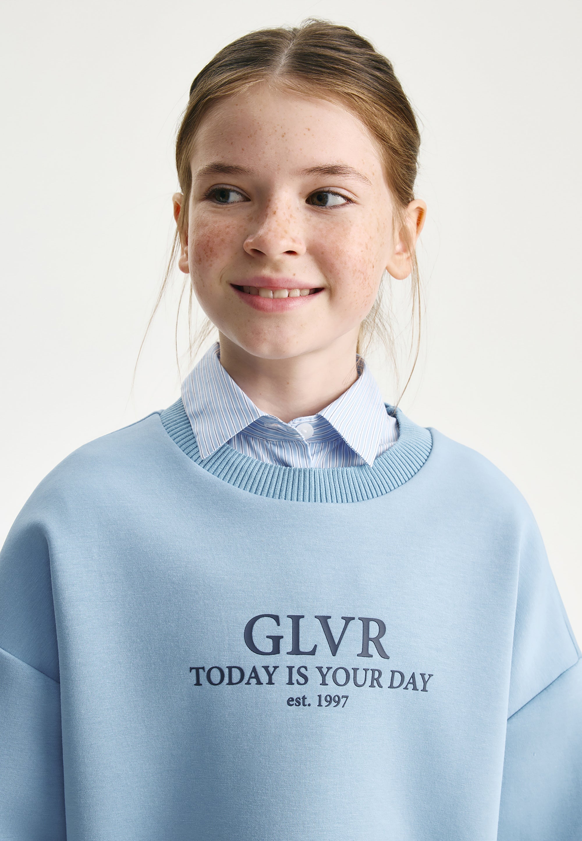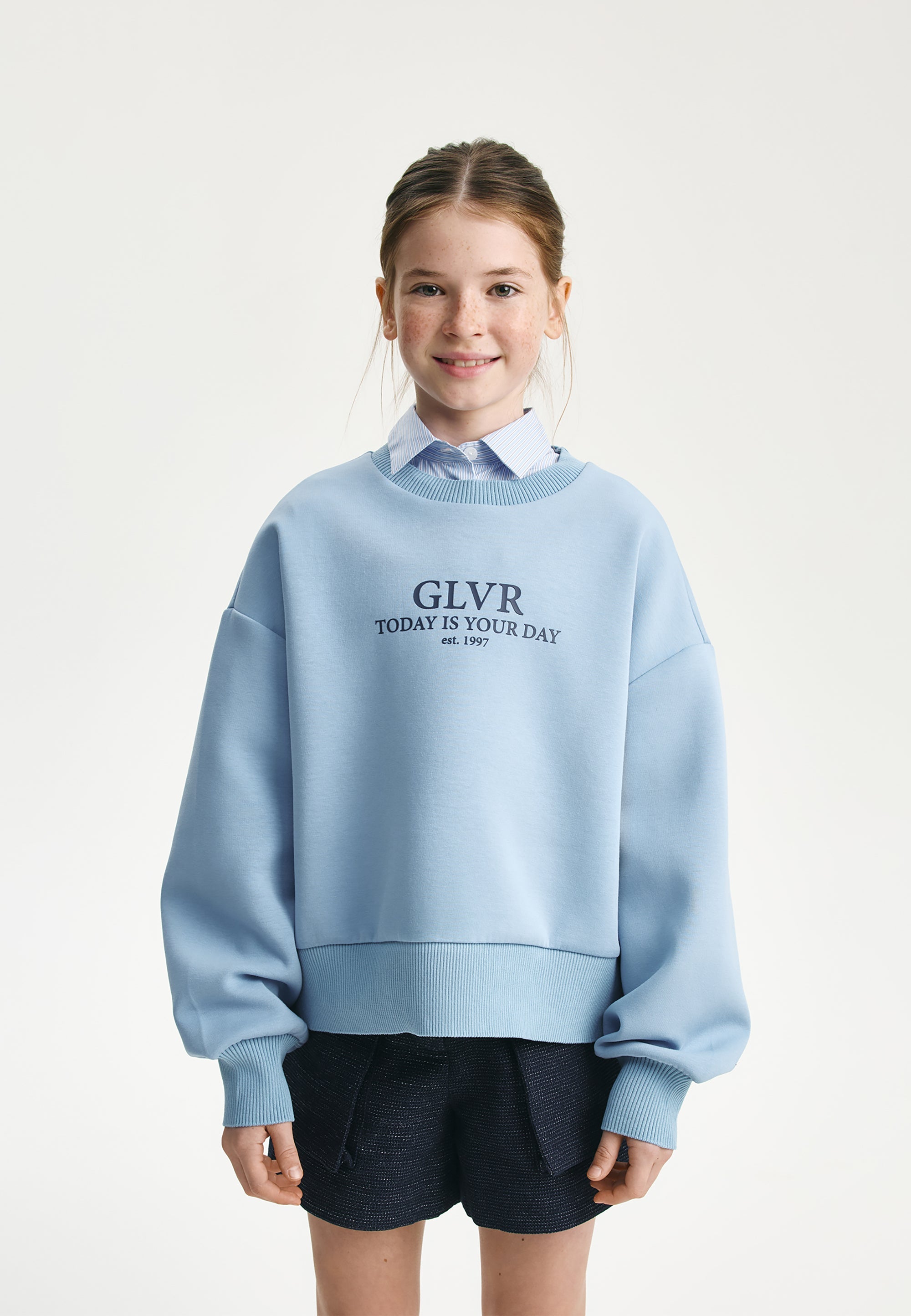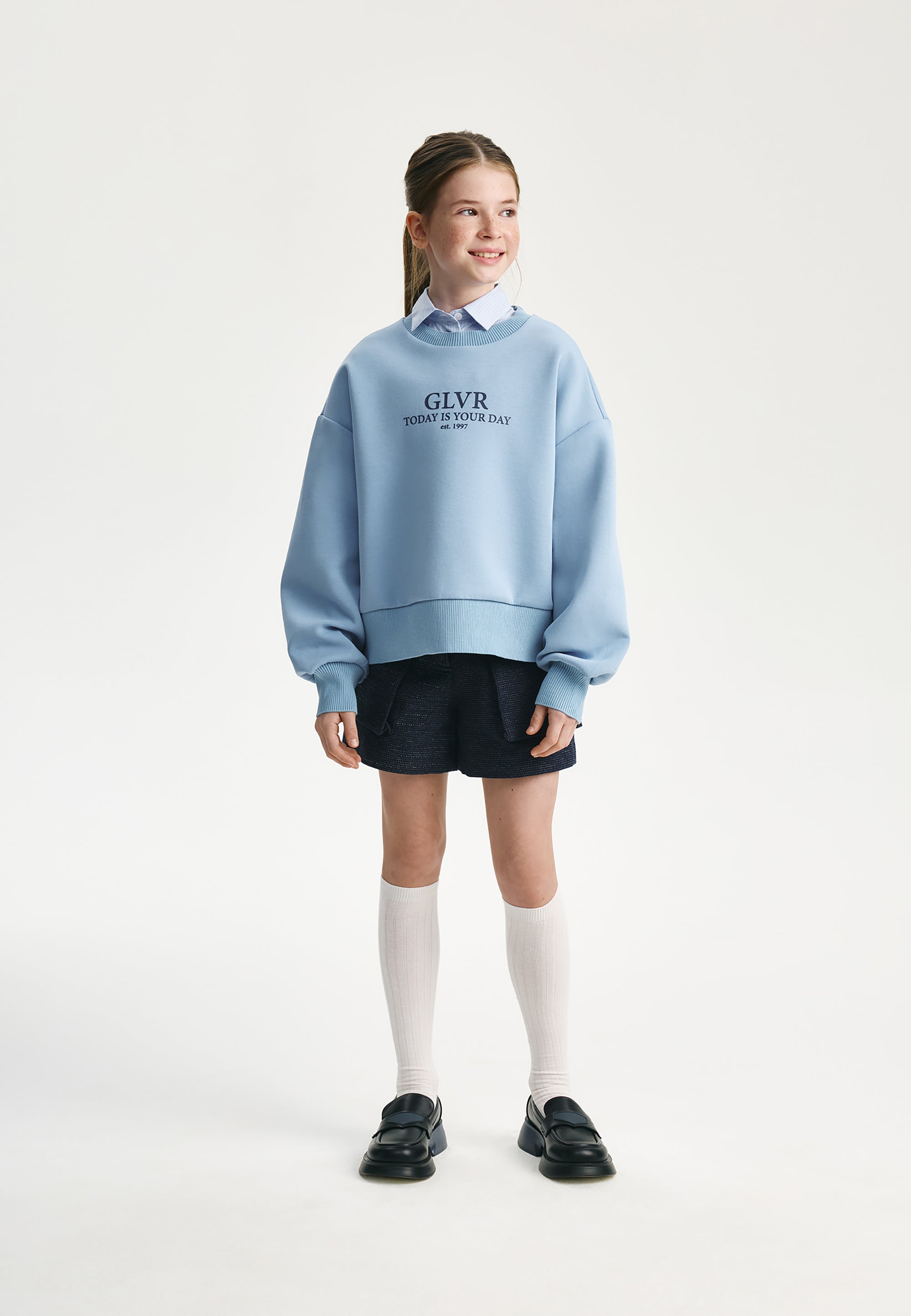 Синьото (светлосиньо) худи е прекрасен начин да се разнообразят училищните визии на ученичката! Суитшъртът за момиче е изработен от мек памучен интерлок, осигуряващ приятни тактилни усещания и уют през целия ден. Силуетът умерен овърсайз и падналото рамо правят суитшърта стилен, съвременен и много комфортен за детето. Лаконичният текстов декор в предната част създава малък акцент, който отличава училищния суитшърт от едноцветните аналози. Той лесно се комбинира с текстилни и трикотажни панталони и поли с всякаква дължина, талия и форма.