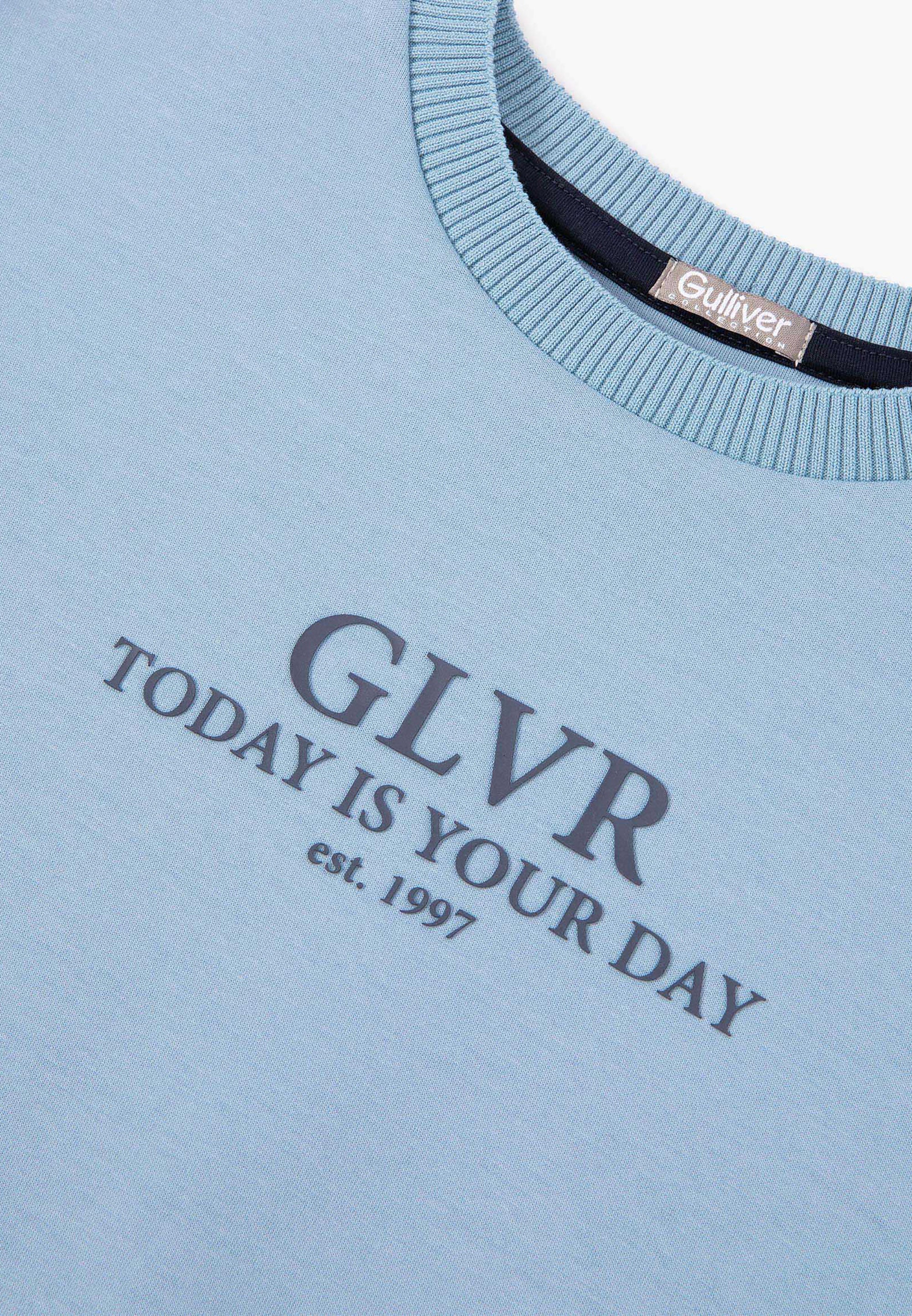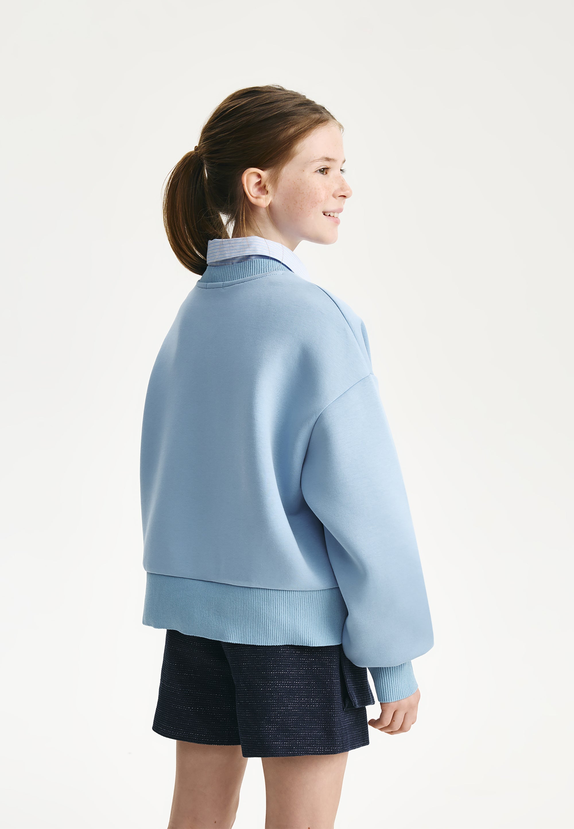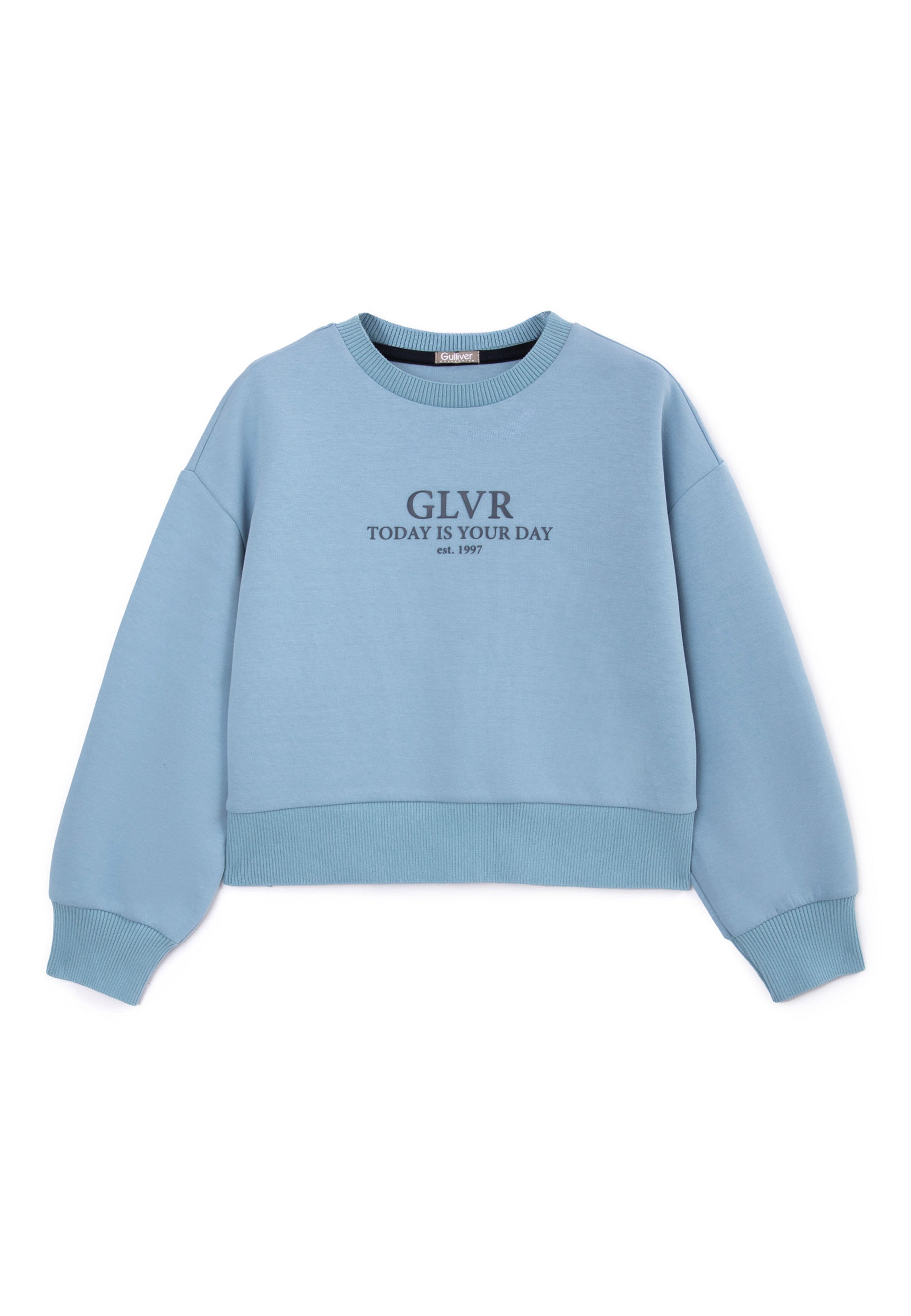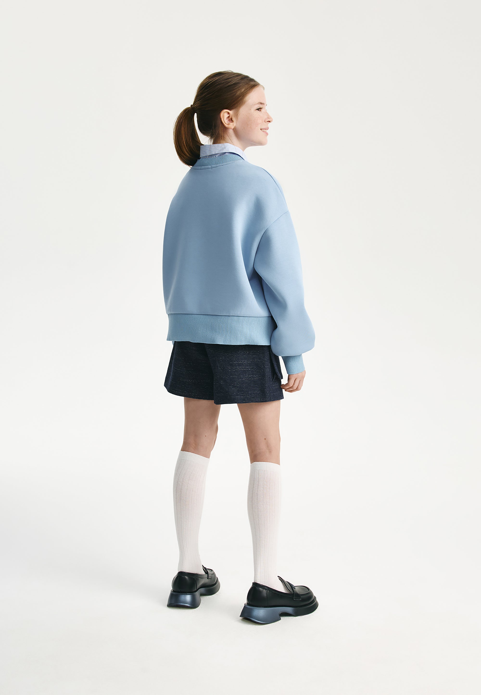Синьото (светлосиньо) худи е прекрасен начин да се разнообразят училищните визии на ученичката! Суитшъртът за момиче е изработен от мек памучен интерлок, осигуряващ приятни тактилни усещания и уют през целия ден. Силуетът умерен овърсайз и падналото рамо правят суитшърта стилен, съвременен и много комфортен за детето. Лаконичният текстов декор в предната част създава малък акцент, който отличава училищния суитшърт от едноцветните аналози. Той лесно се комбинира с текстилни и трикотажни панталони и поли с всякаква дължина, талия и форма.