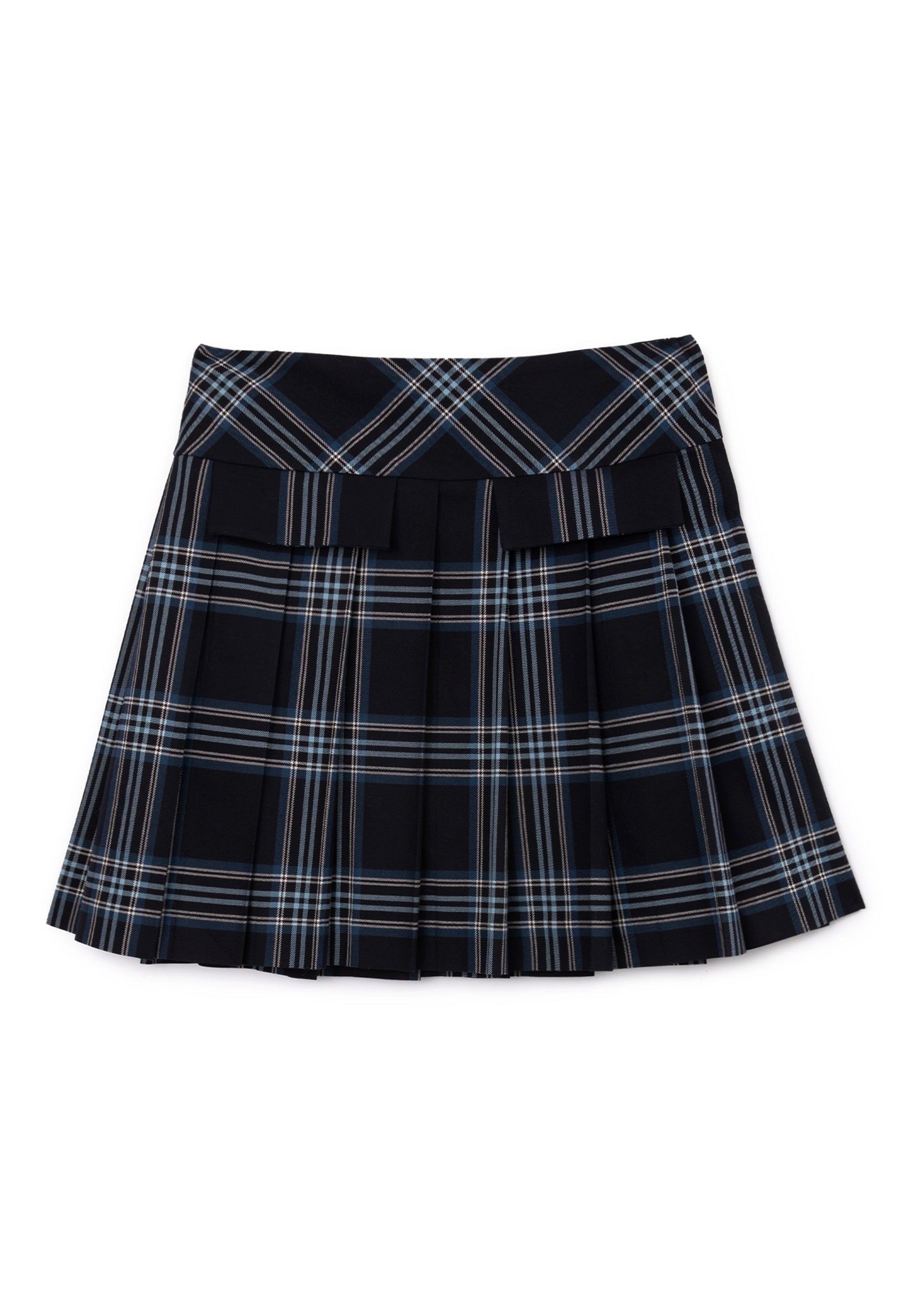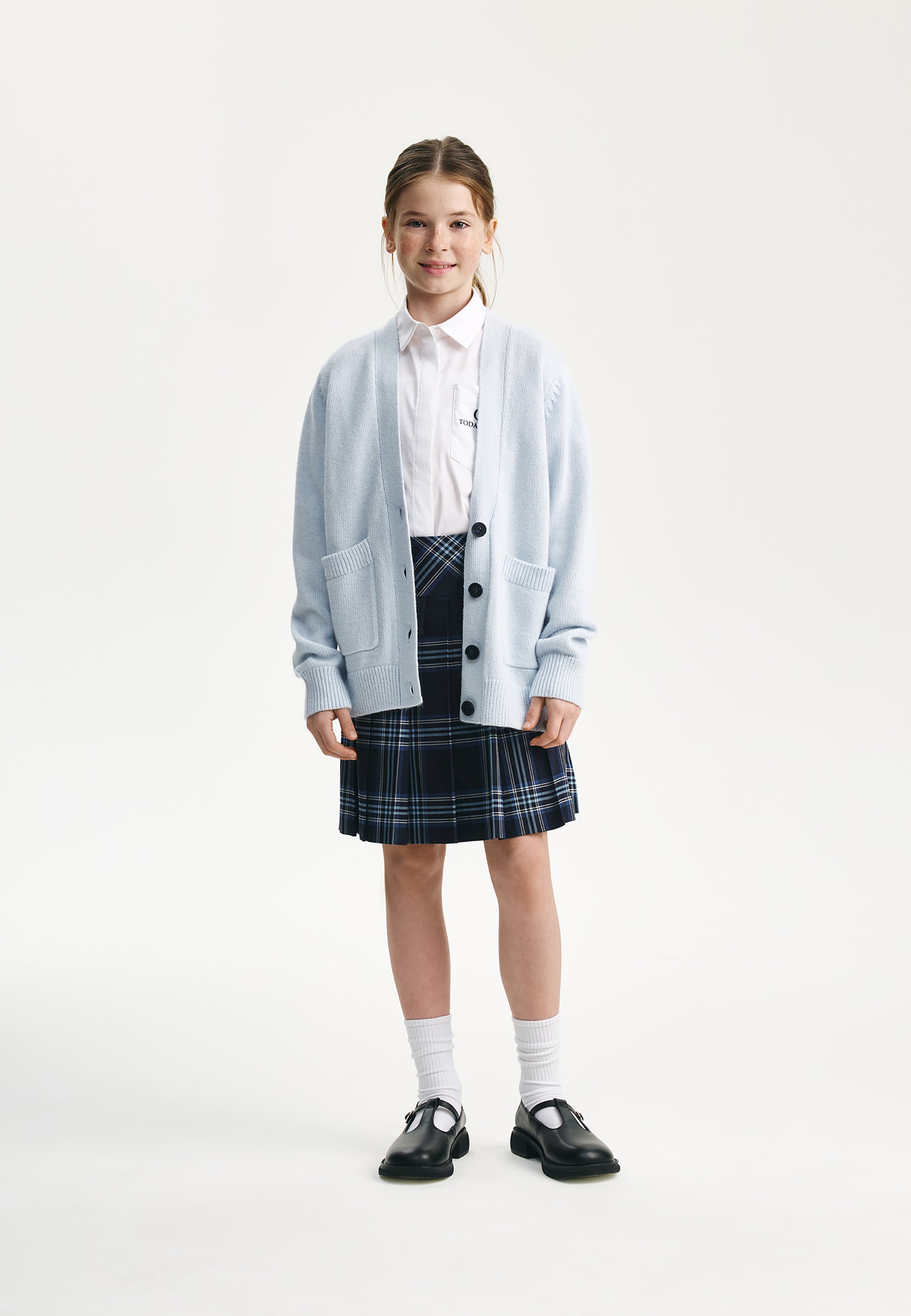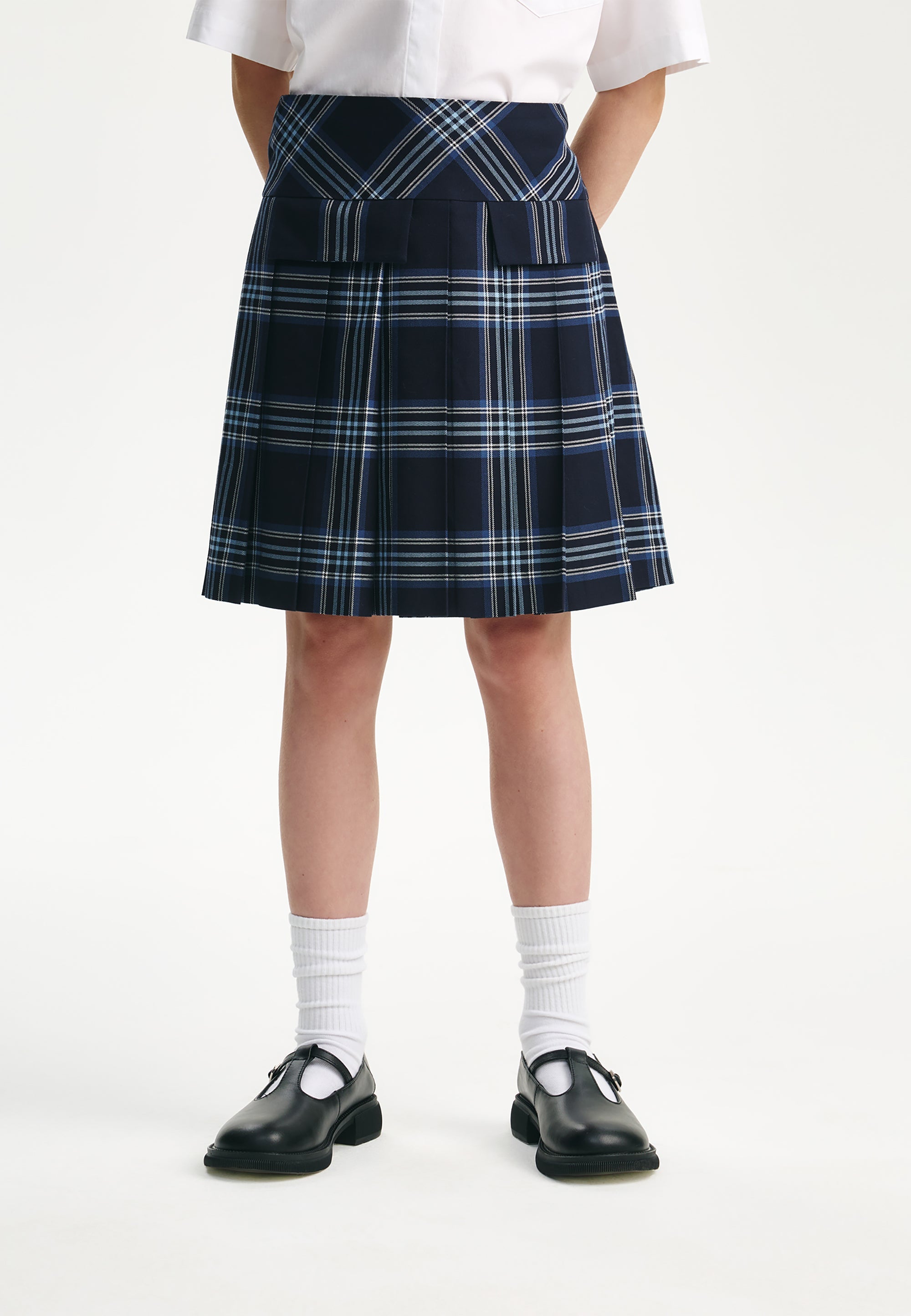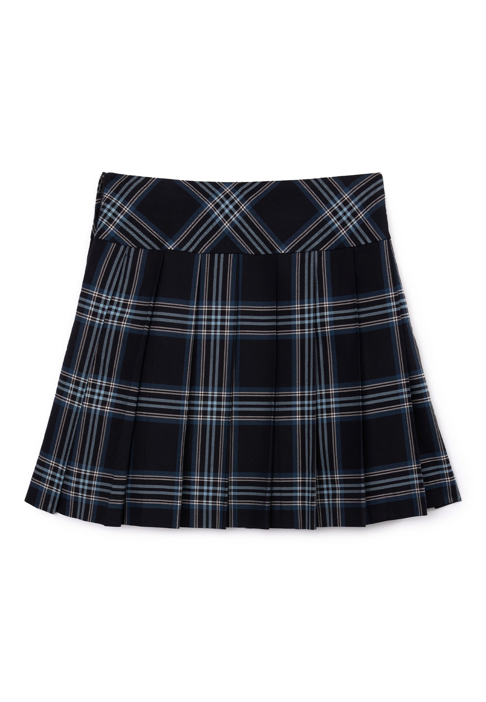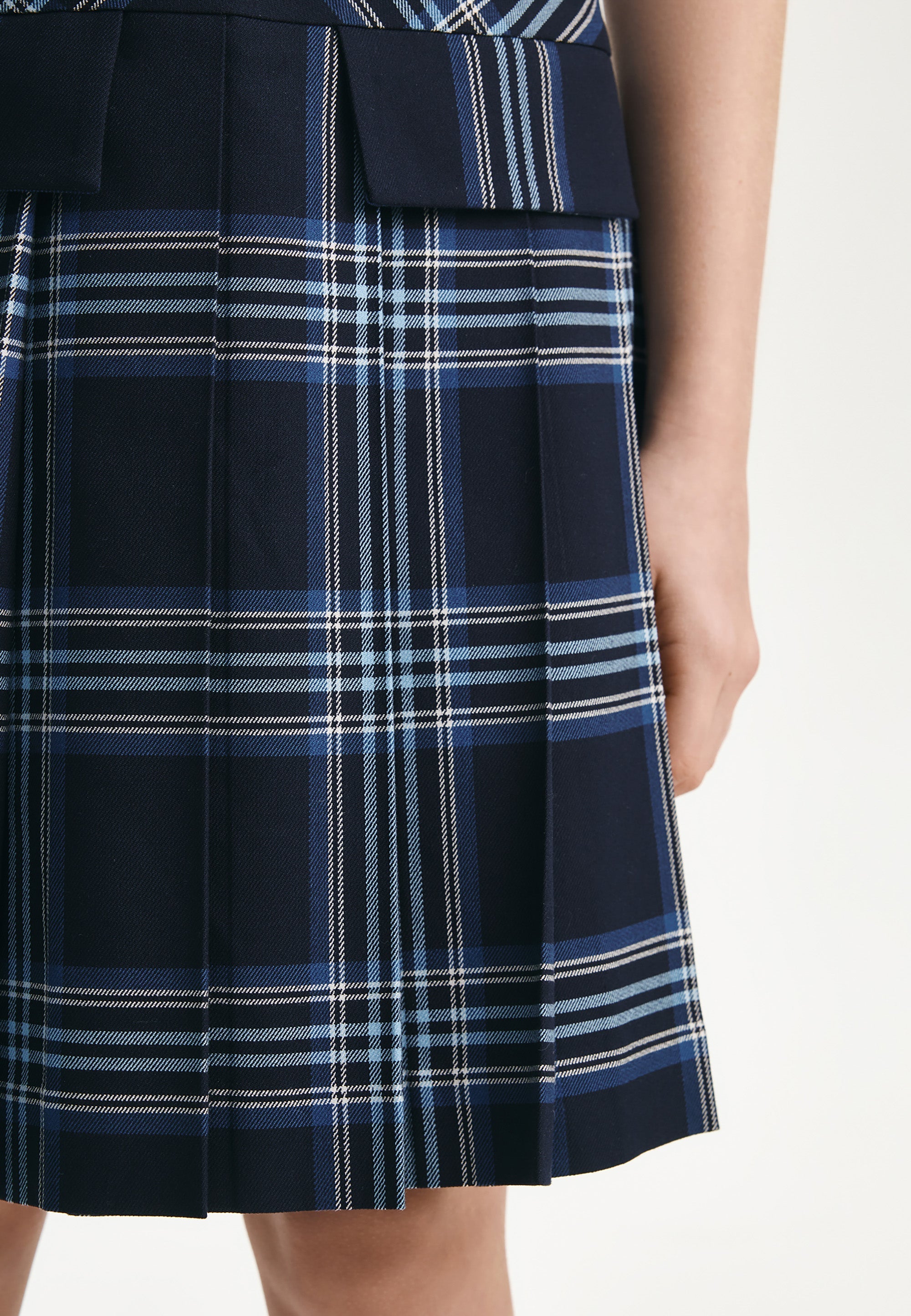 Синята училищна пола на каре е основа за елегантните визии на момичето. Полата е изработена от плътна костюмна поливискоза, благодарение на което поддържа отлично формата си, притежава мекота, практичност и износоустойчивост. Класическият кариран десен тип „тартан“ подчертава връзката между традициите и съвремието. Широката платка, скроена по диагонал, и основната част на полата с едри плохи създават елегантна трапецовидна форма. Двата декоративни капака, имитиращи входове на джобове, придават завършен вид на полата. Копринената подплата създава приятно плъзгане при движение. Полата се закопчава с цип в страничния шев и има вътрешно регулиране на талията за комфортно прилягане при по-слаби момичета. Училищната карирана пола с плохи се съчетава прекрасно с блузи, поло блузи, блузи с дълъг ръкав и всякакви плетени изделия, създавайки стилни и интелигентни визии.