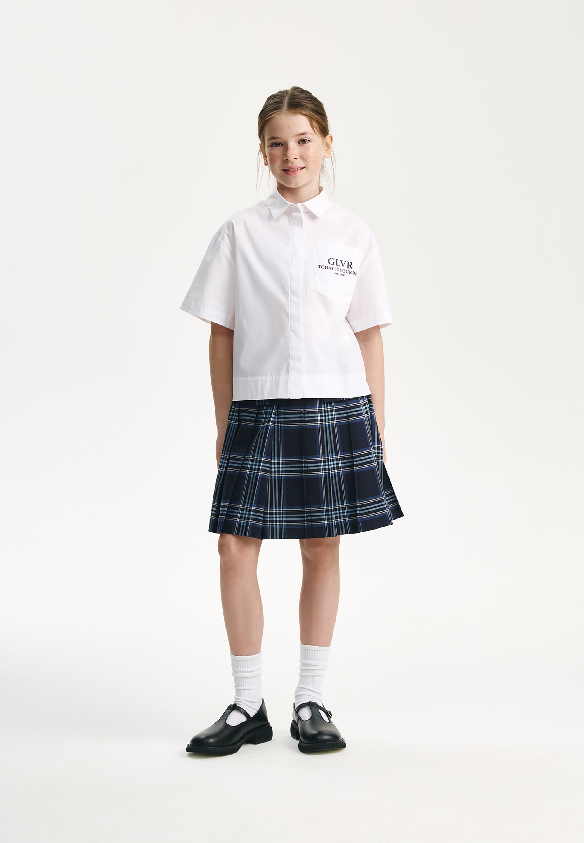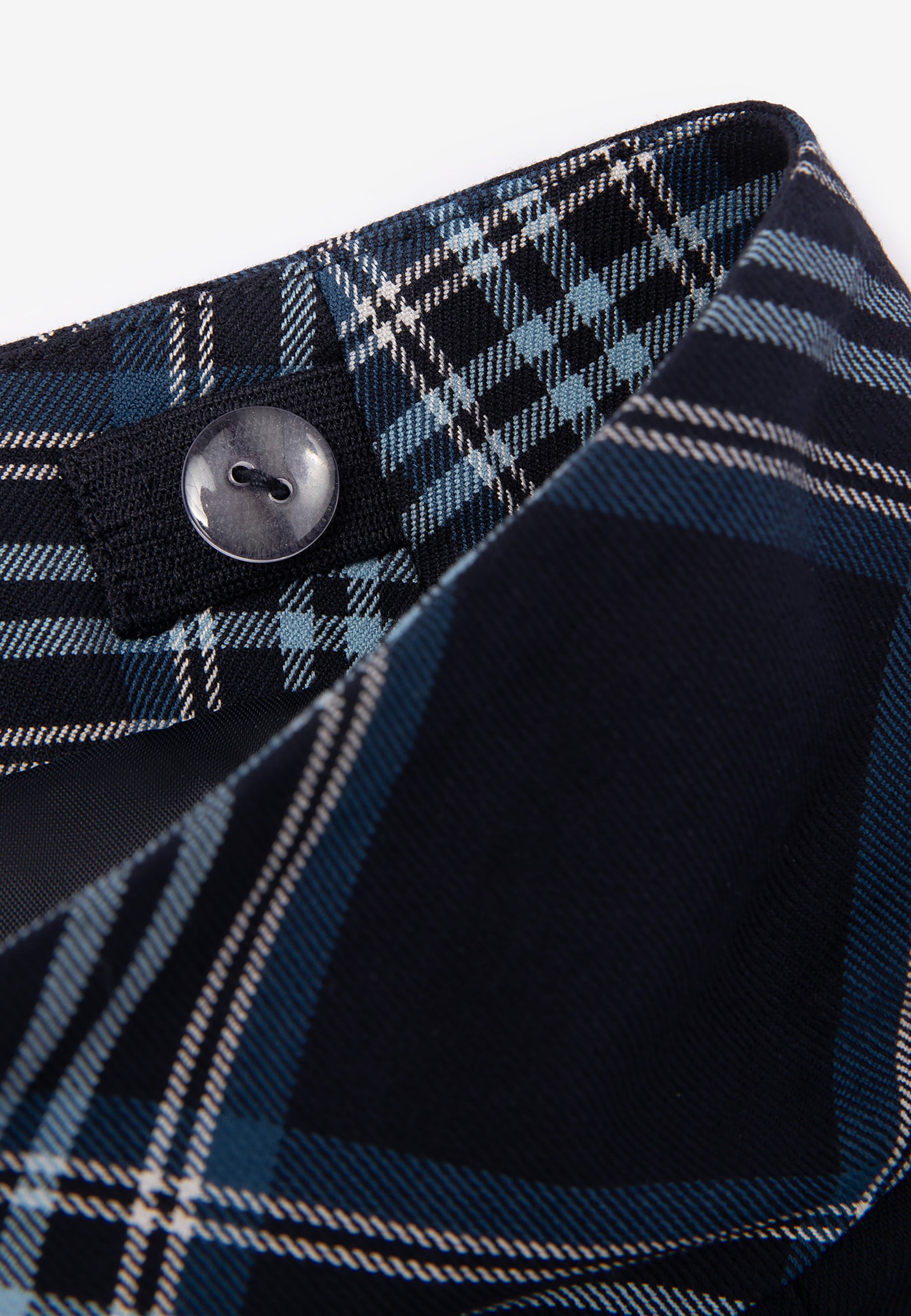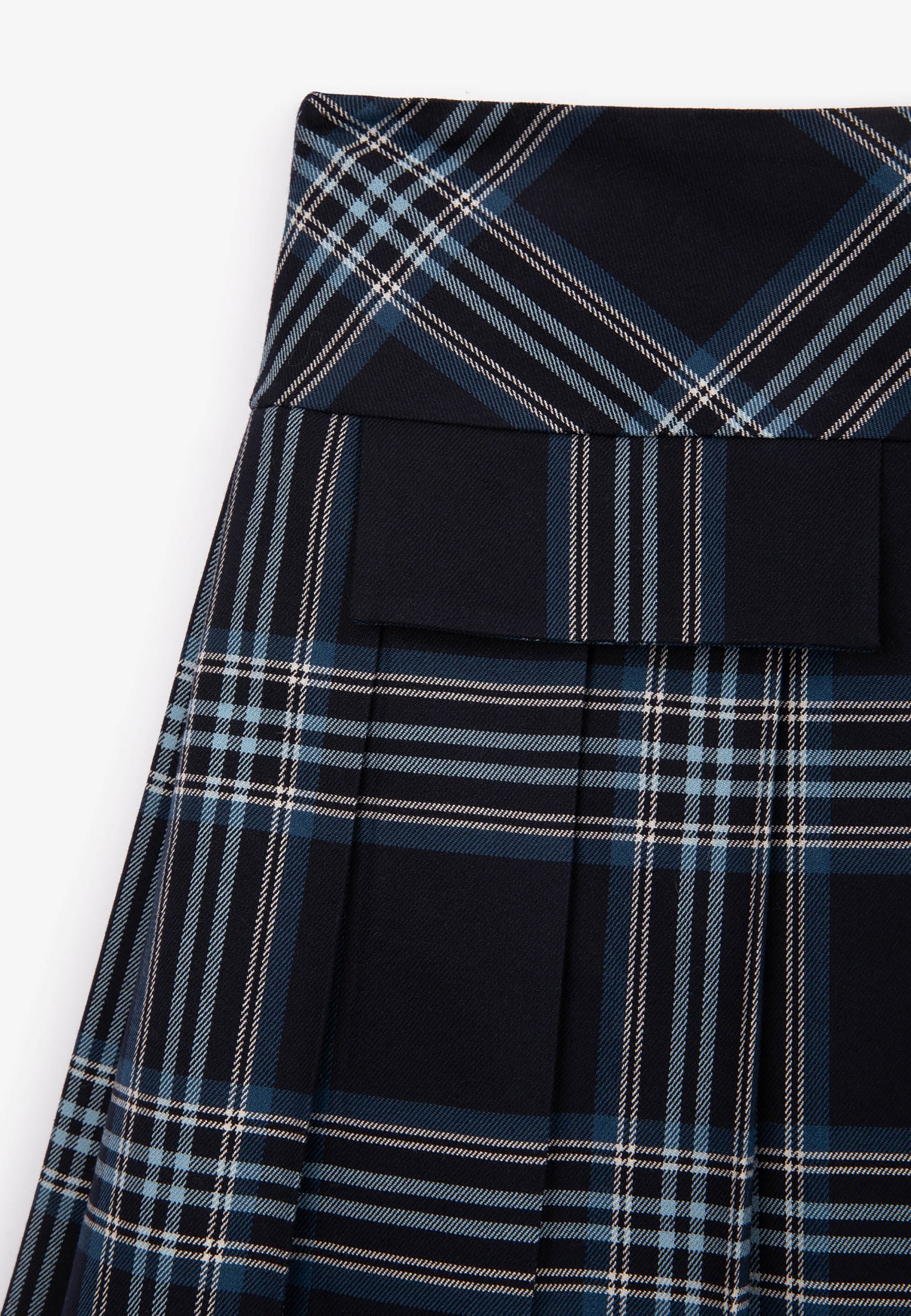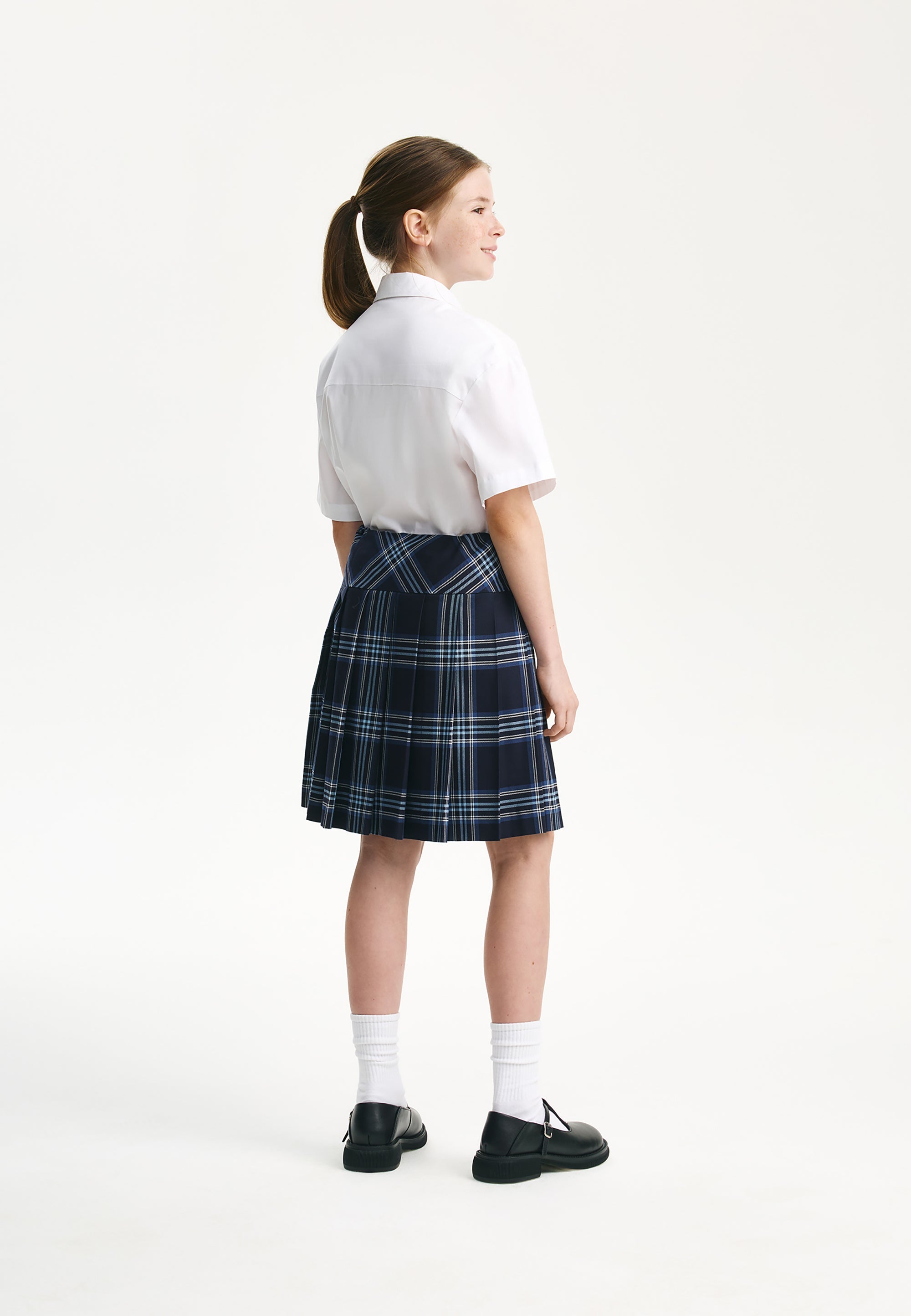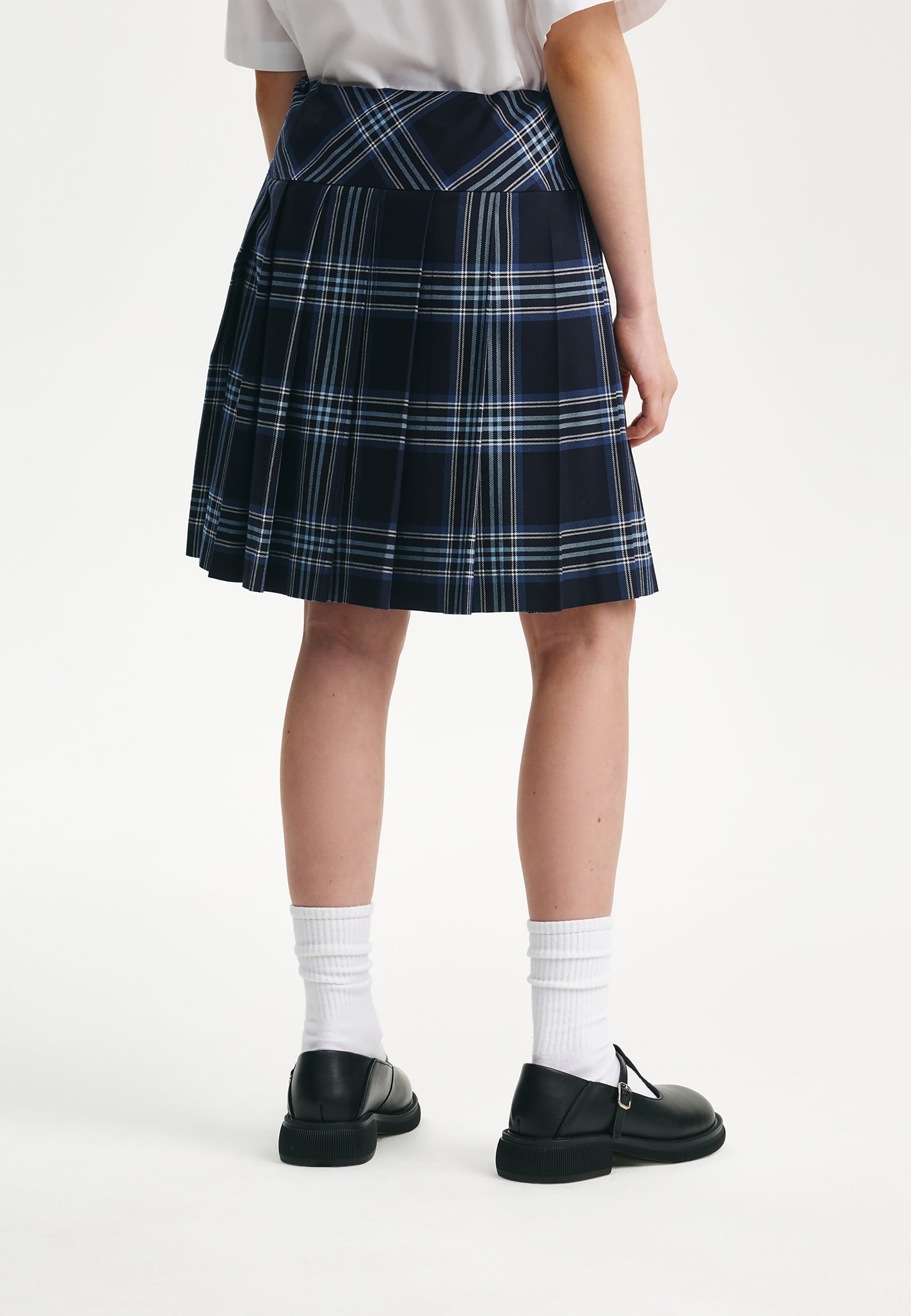 Синята училищна пола на каре е основа за елегантните визии на момичето. Полата е изработена от плътна костюмна поливискоза, благодарение на което поддържа отлично формата си, притежава мекота, практичност и износоустойчивост. Класическият кариран десен тип „тартан“ подчертава връзката между традициите и съвремието. Широката платка, скроена по диагонал, и основната част на полата с едри плохи създават елегантна трапецовидна форма. Двата декоративни капака, имитиращи входове на джобове, придават завършен вид на полата. Копринената подплата създава приятно плъзгане при движение. Полата се закопчава с цип в страничния шев и има вътрешно регулиране на талията за комфортно прилягане при по-слаби момичета. Училищната карирана пола с плохи се съчетава прекрасно с блузи, поло блузи, блузи с дълъг ръкав и всякакви плетени изделия, създавайки стилни и интелигентни визии.