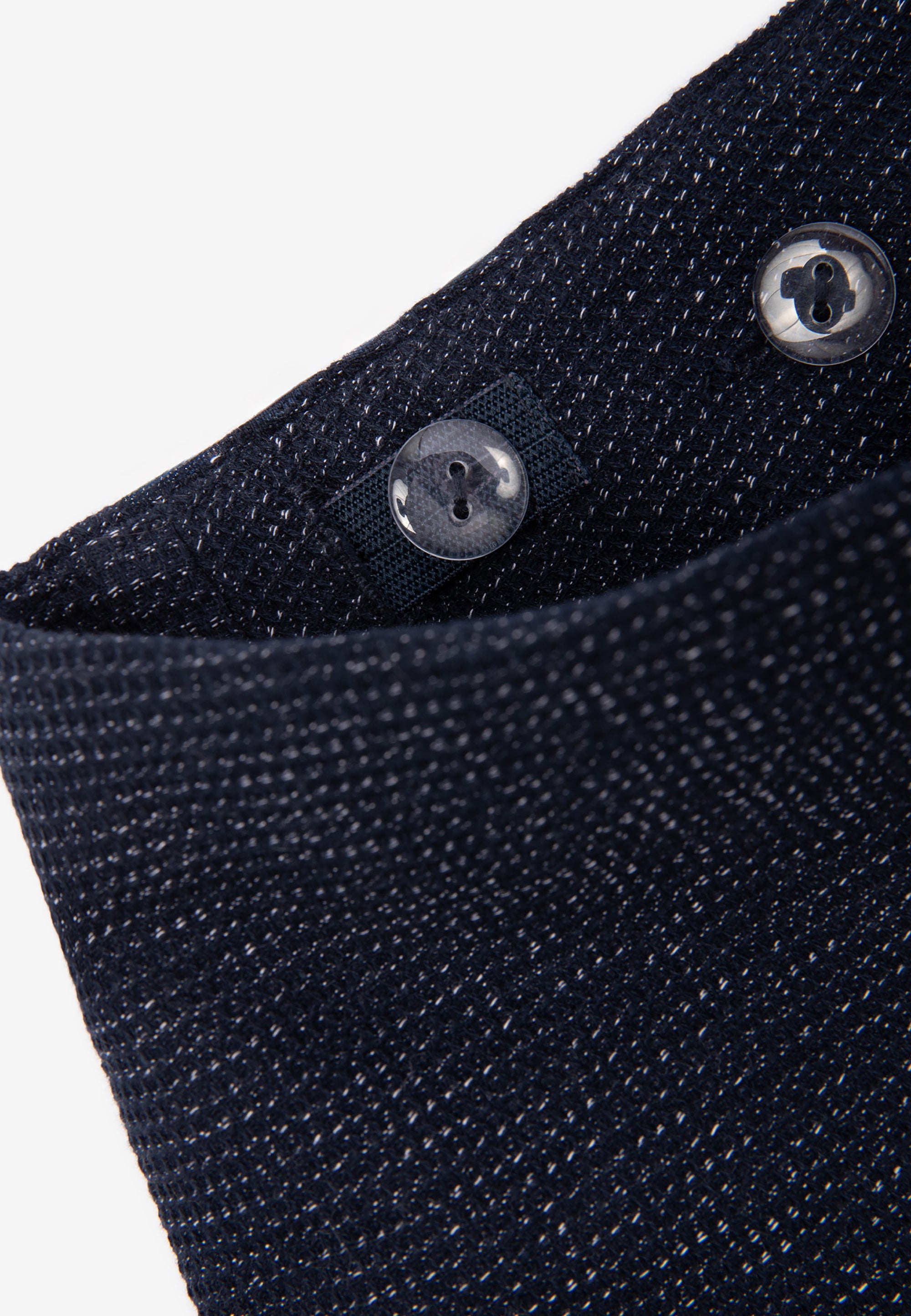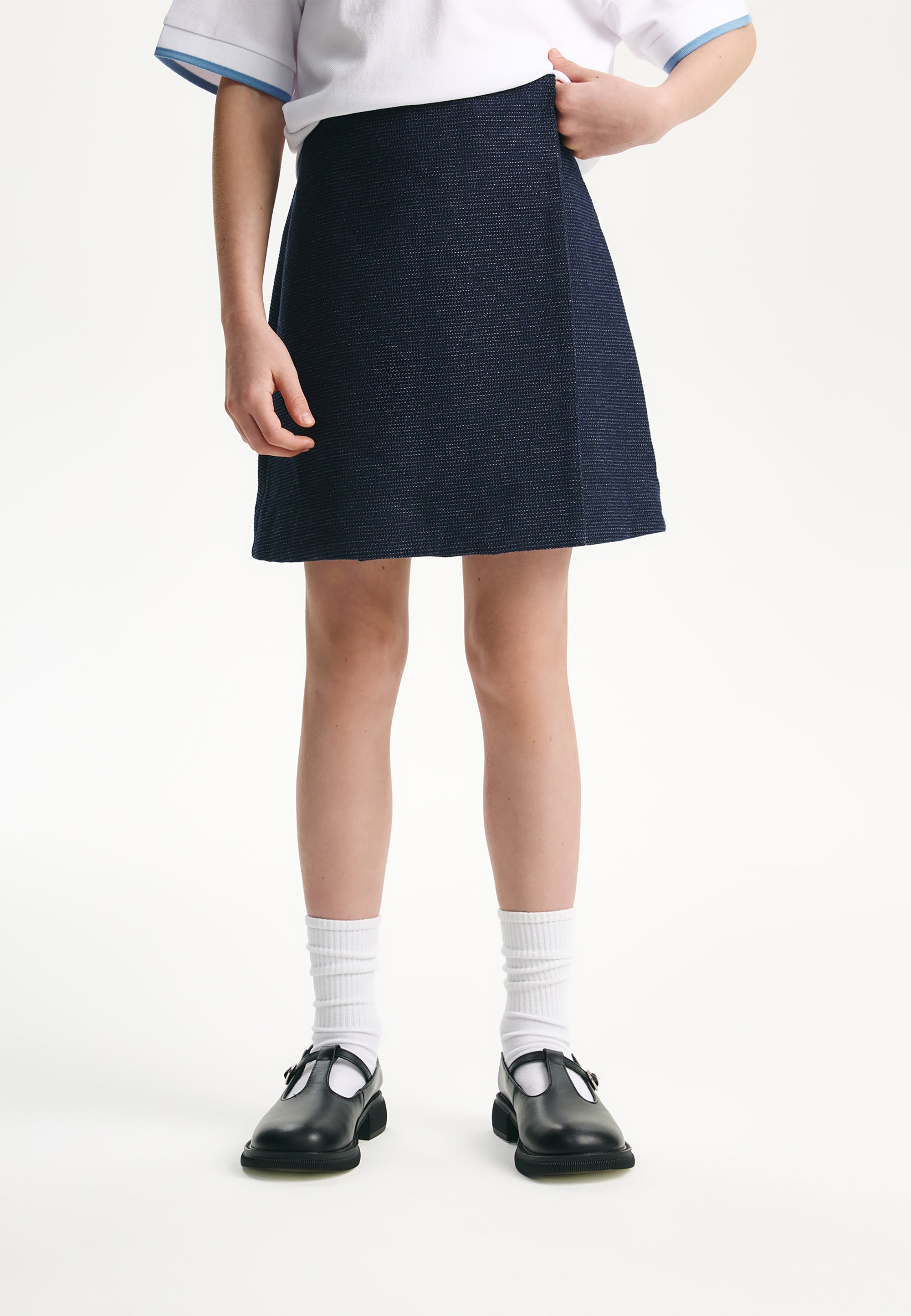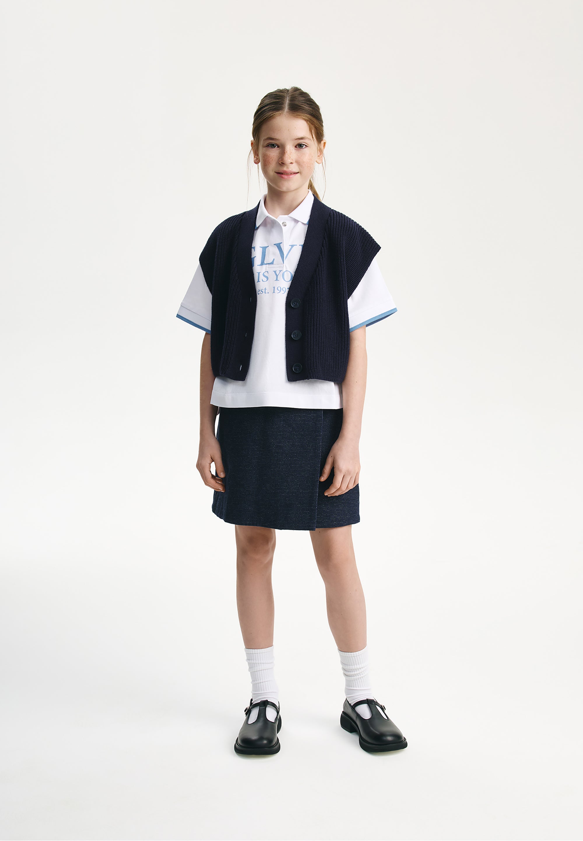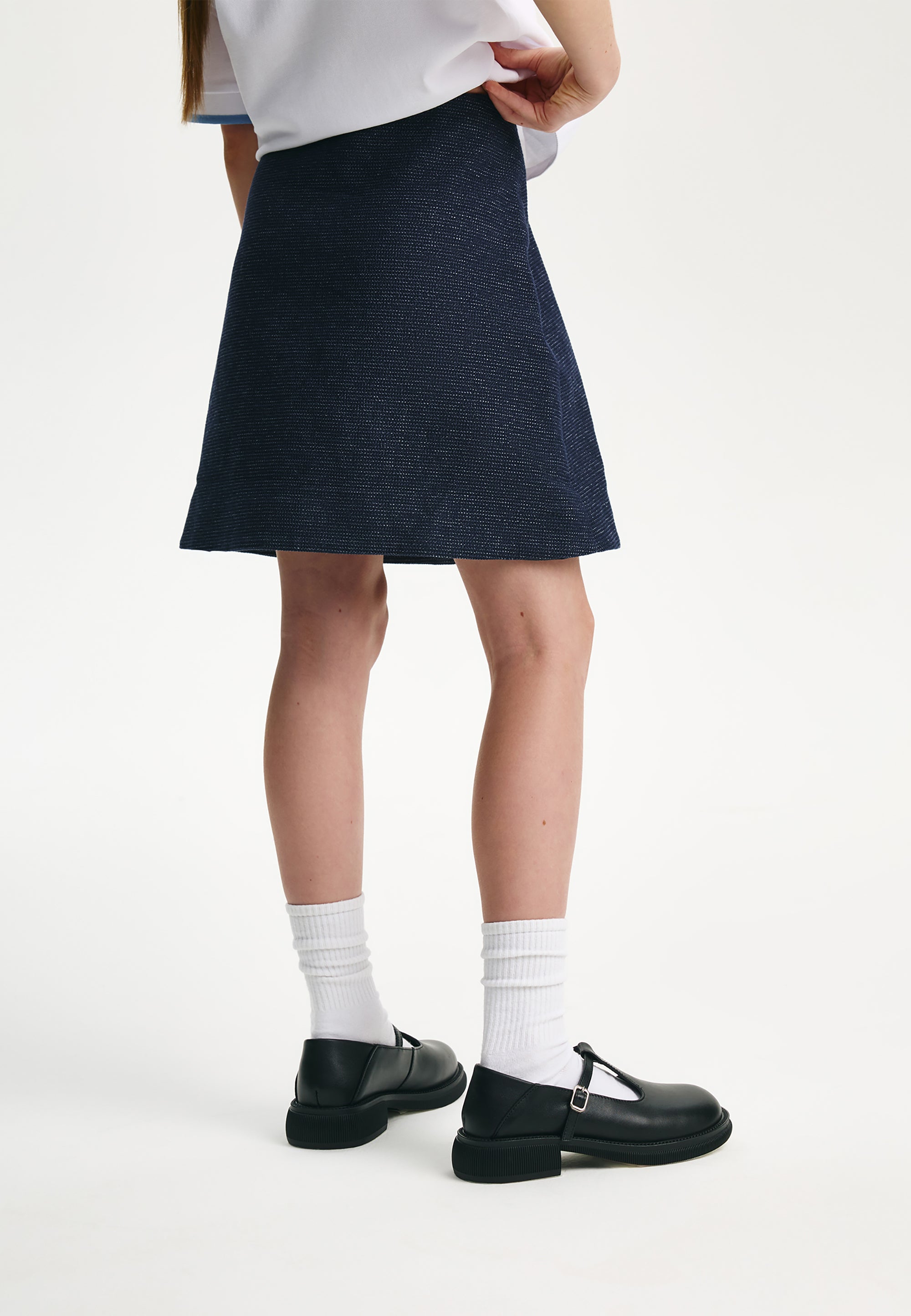 Синята училищна пола тип „прехвърли се“ (с застъпване) е стилна и лаконична дреха за формиране на строги интелигентни комплекти. Полата е изработена от памучен текстил с благородна туидова текстура и меланжирана сплитка, което я отличава от едноцветните аналози. Плътният текстил поддържа отлично формата си, практичен е и износоустойчив, като се съчетава красиво както с гладки копринени, така и с матови трикотажни или по-рехави плетени повърхности. Вискозната подплата осигурява удобство при носене. Застъпването се фиксира с копче, осигурявайки комфортно прилягане и възможност за регулиране на ширината на колана в зависимост от фигурата на детето.