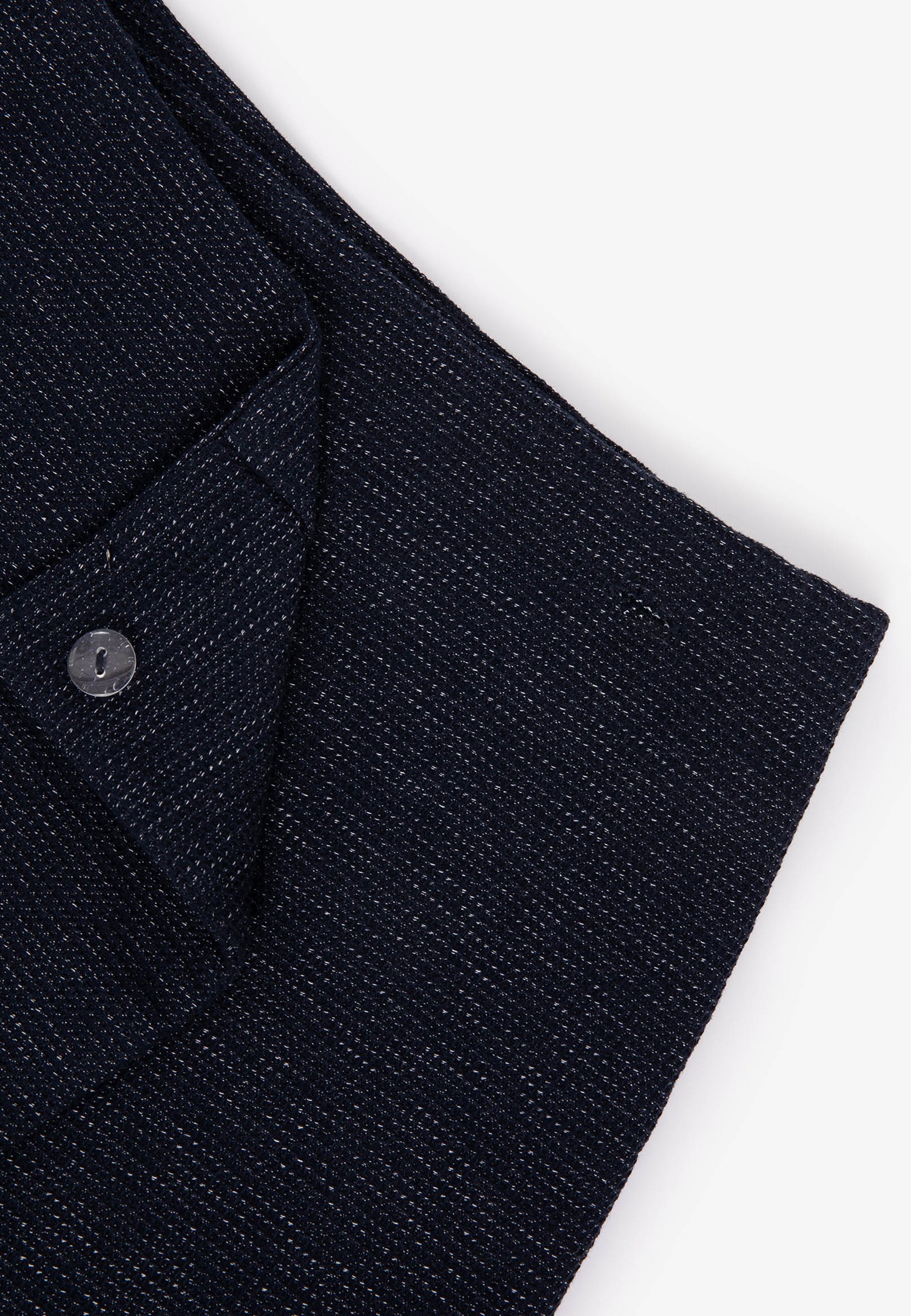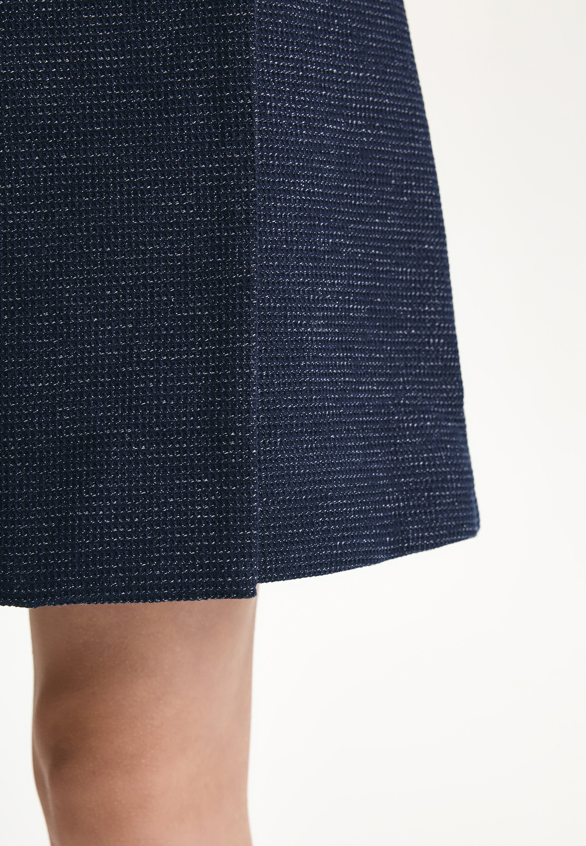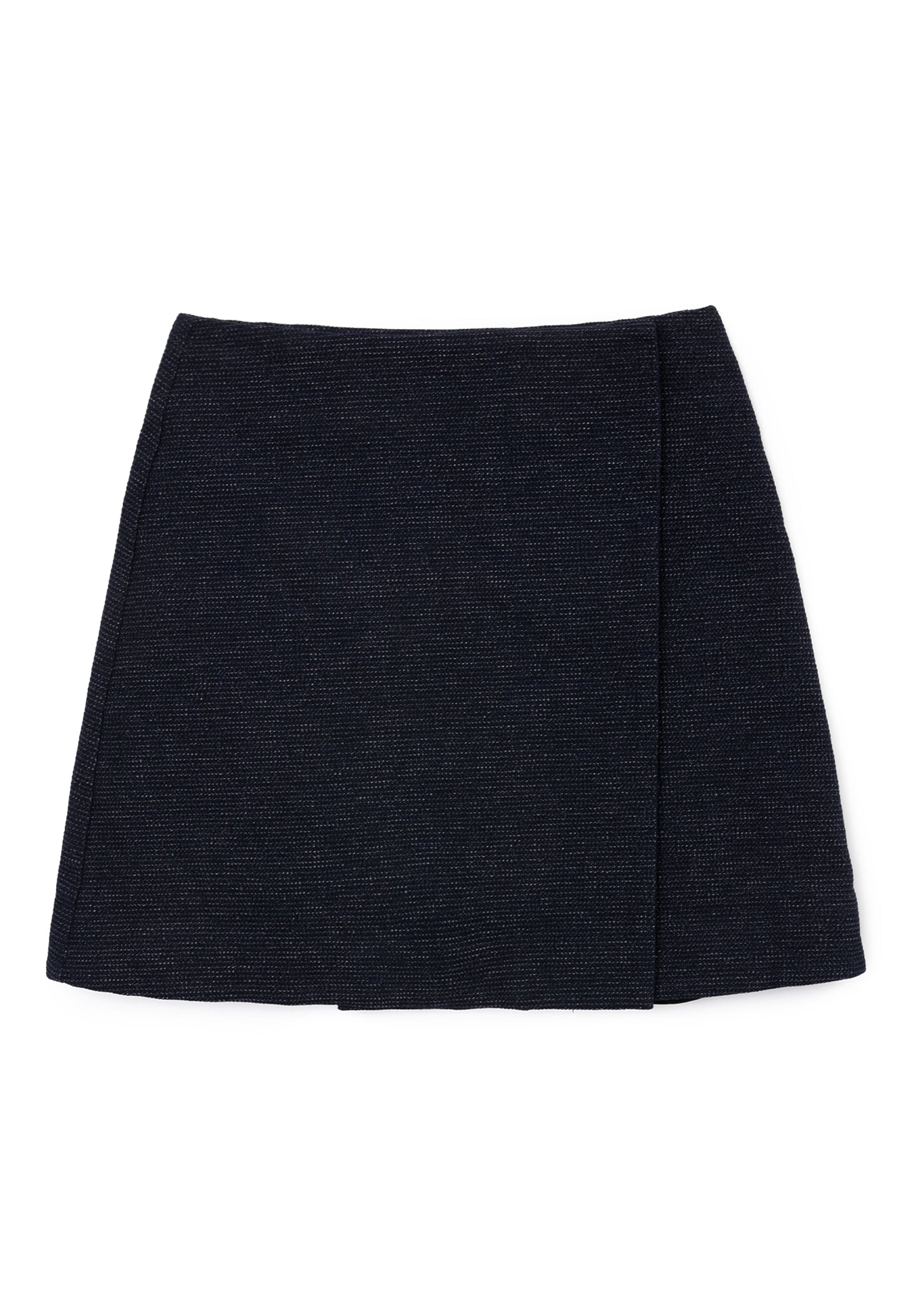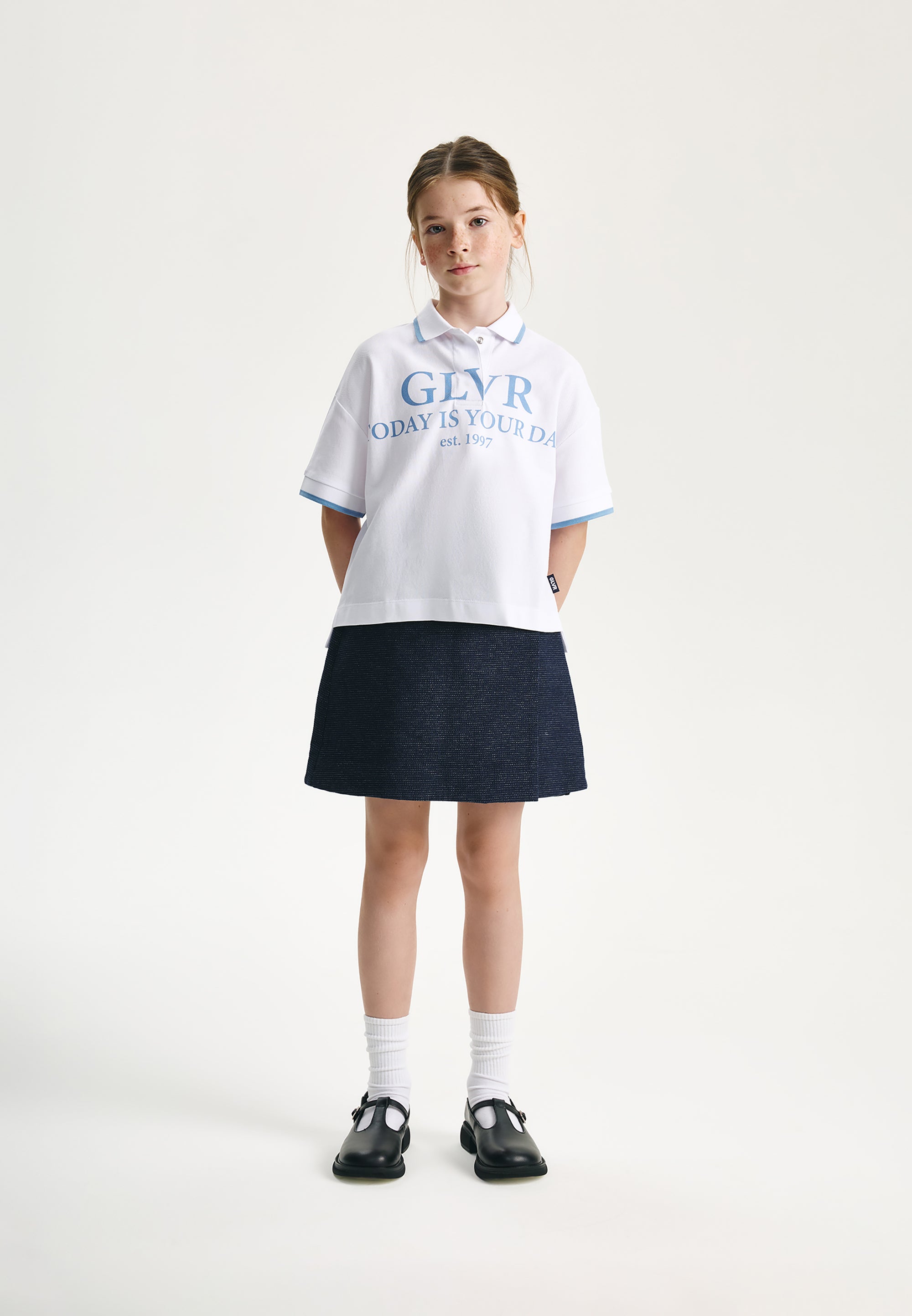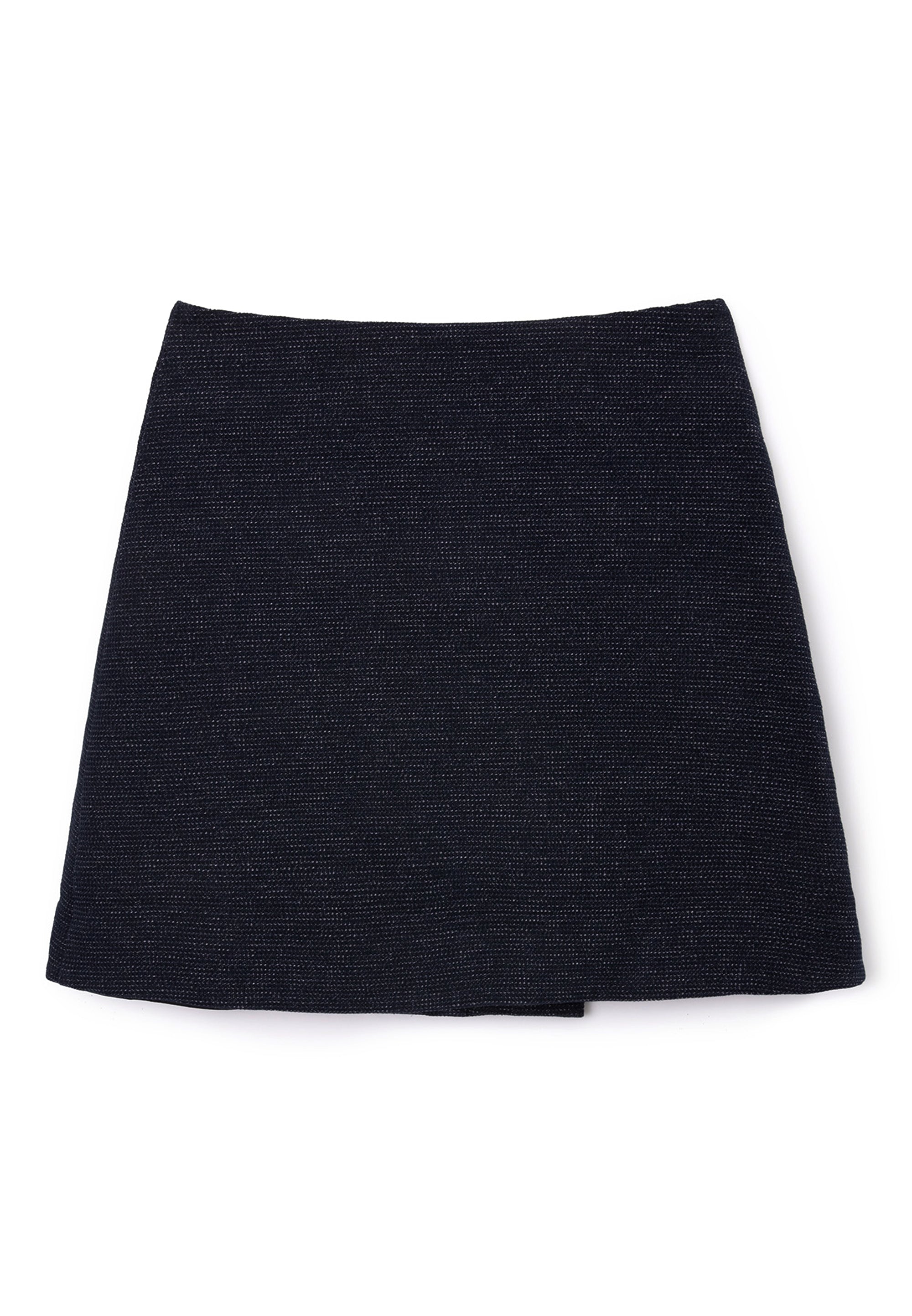 Синята училищна пола тип „прехвърли се“ (с застъпване) е стилна и лаконична дреха за формиране на строги интелигентни комплекти. Полата е изработена от памучен текстил с благородна туидова текстура и меланжирана сплитка, което я отличава от едноцветните аналози. Плътният текстил поддържа отлично формата си, практичен е и износоустойчив, като се съчетава красиво както с гладки копринени, така и с матови трикотажни или по-рехави плетени повърхности. Вискозната подплата осигурява удобство при носене. Застъпването се фиксира с копче, осигурявайки комфортно прилягане и възможност за регулиране на ширината на колана в зависимост от фигурата на детето.