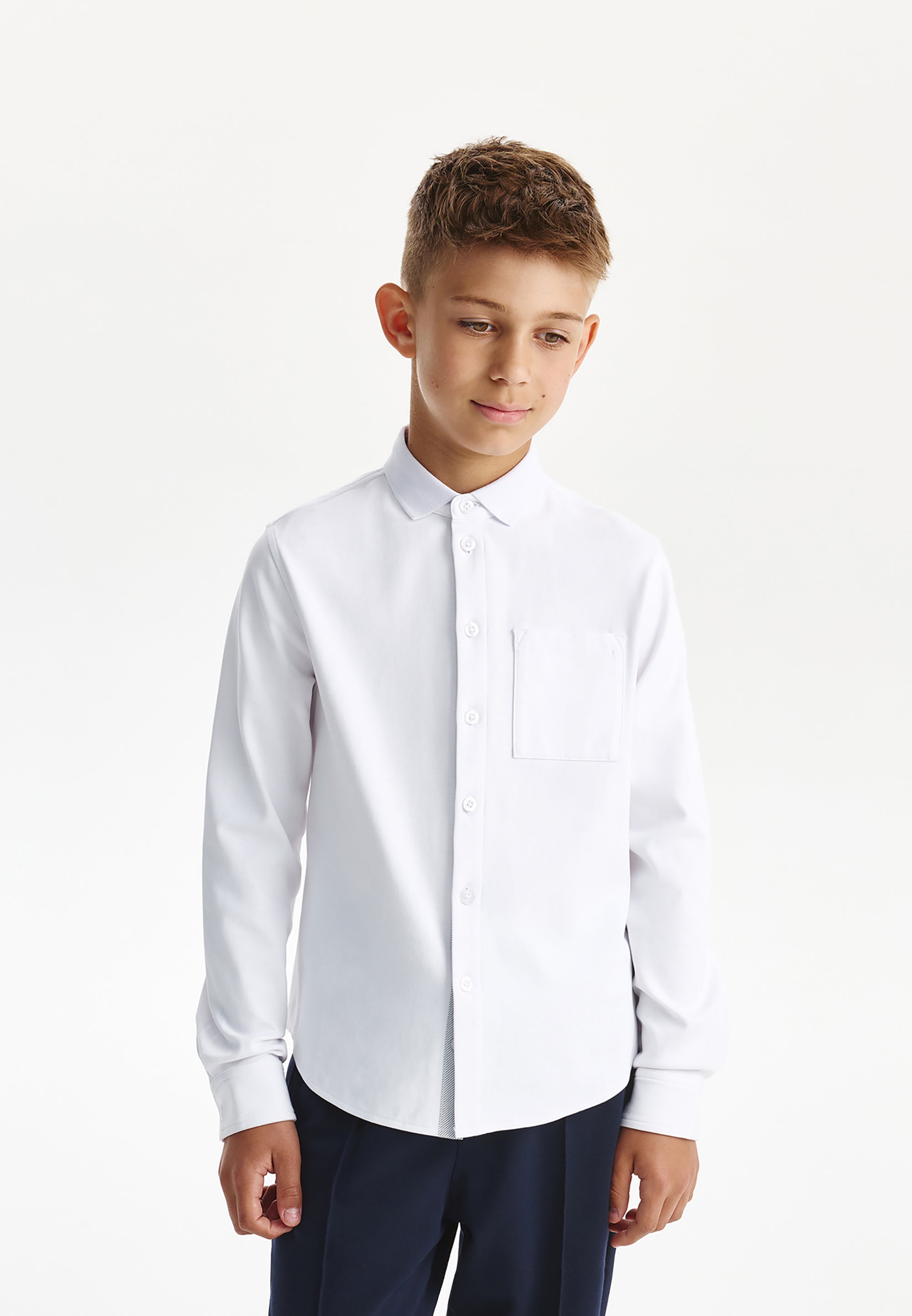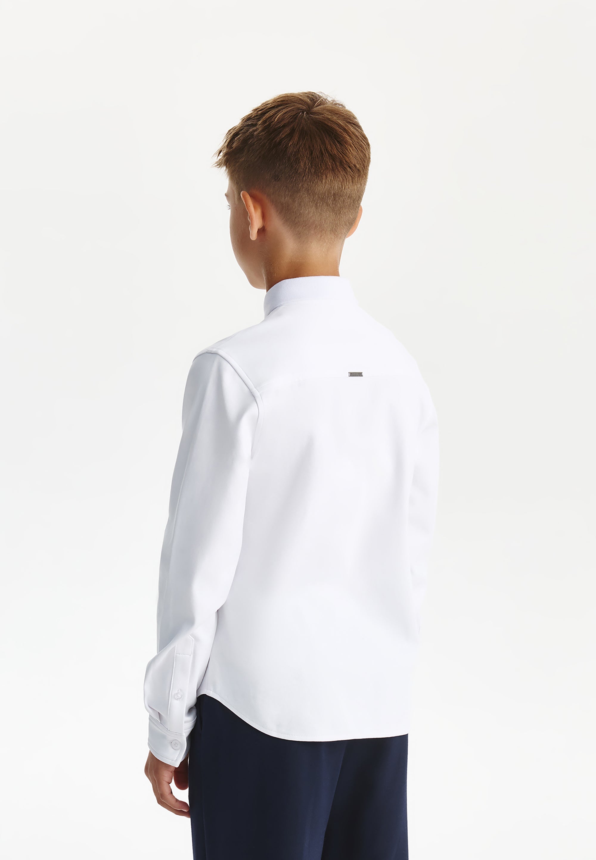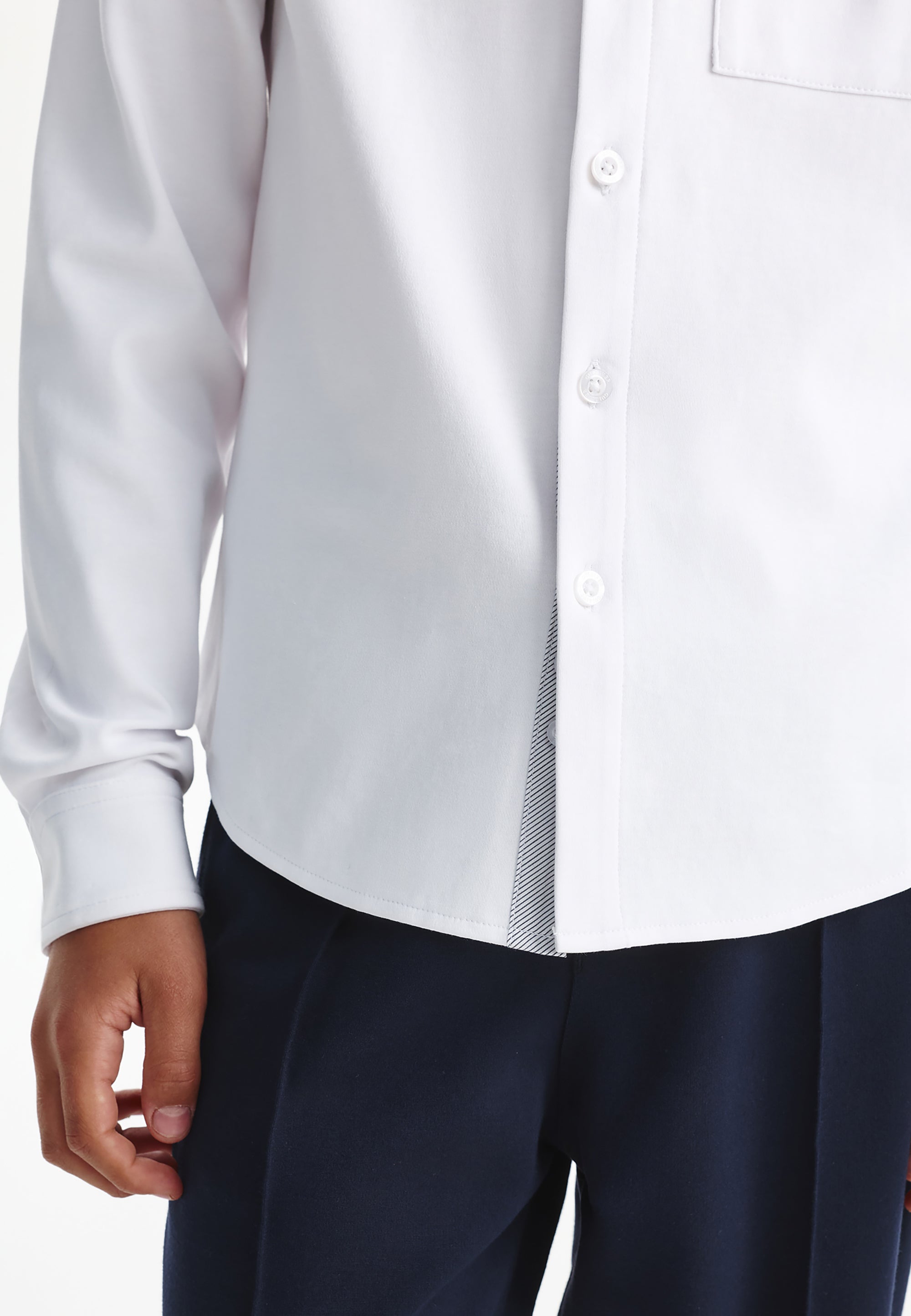 Бялата трикотажна риза с дълъг ръкав е най-добрият вариант за елегантни училищни визии за момчето. Ризата е изработена от мек, гладък и приятен на допир памучен интерлок. Класическата кройка, правата форма (regular fit), пришитият джоб и закопчаването с копчета превръщат ризата в еталон за стилна и комфортна базова дреха. Както за тържествени събития, така и за всеки ден, бялата трикотажна риза е свежо решение за поддържане на деловия имидж на ученика.