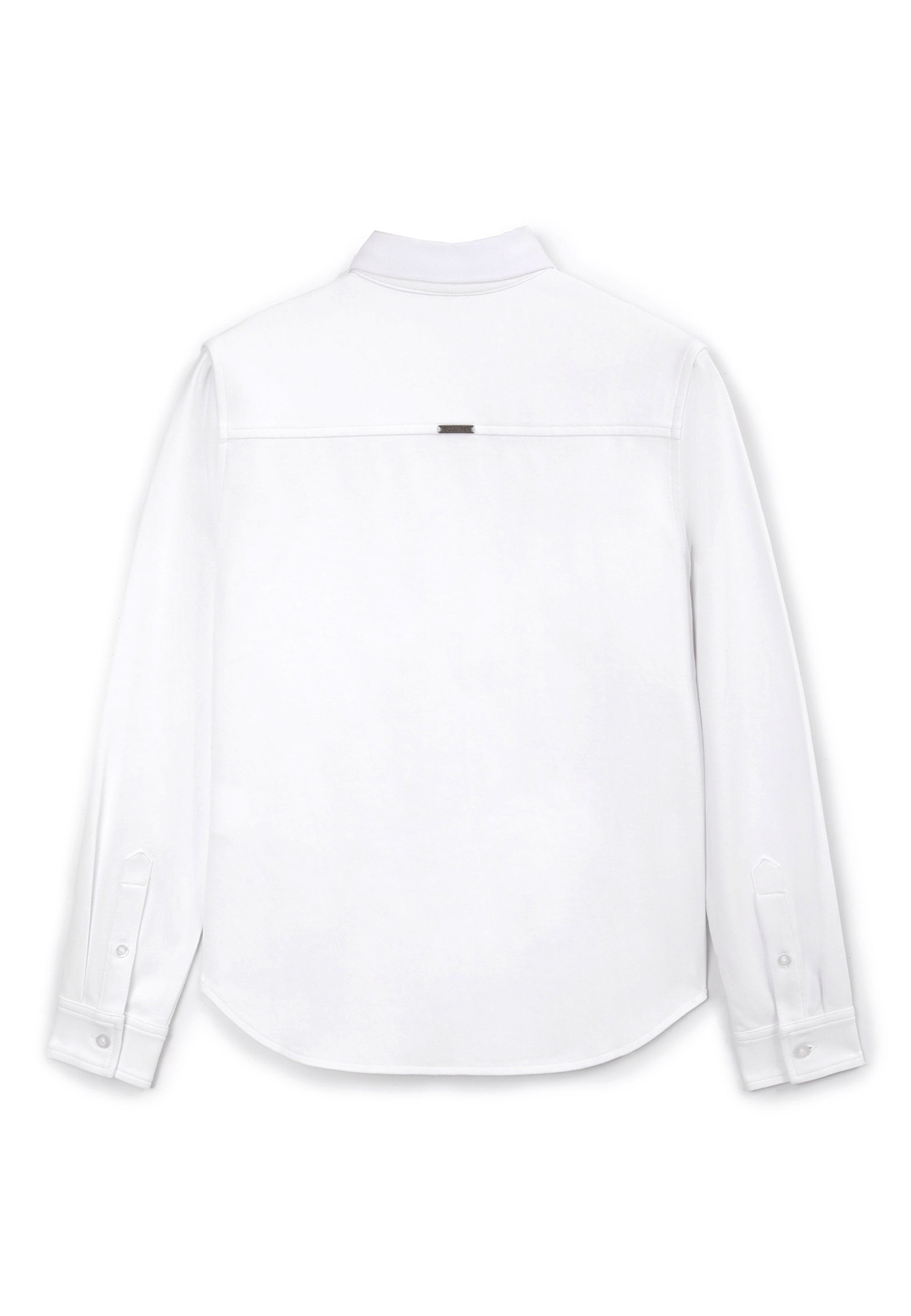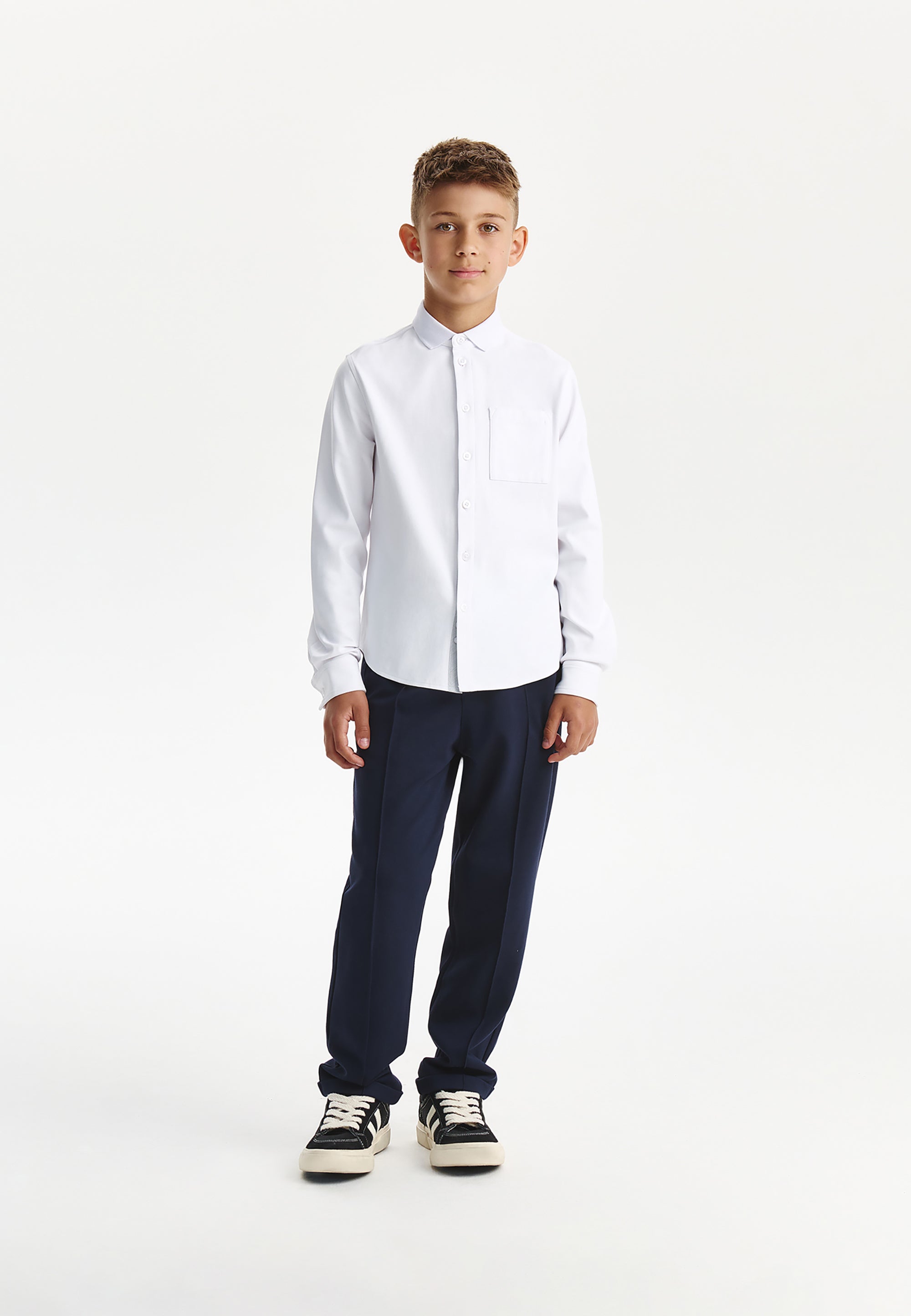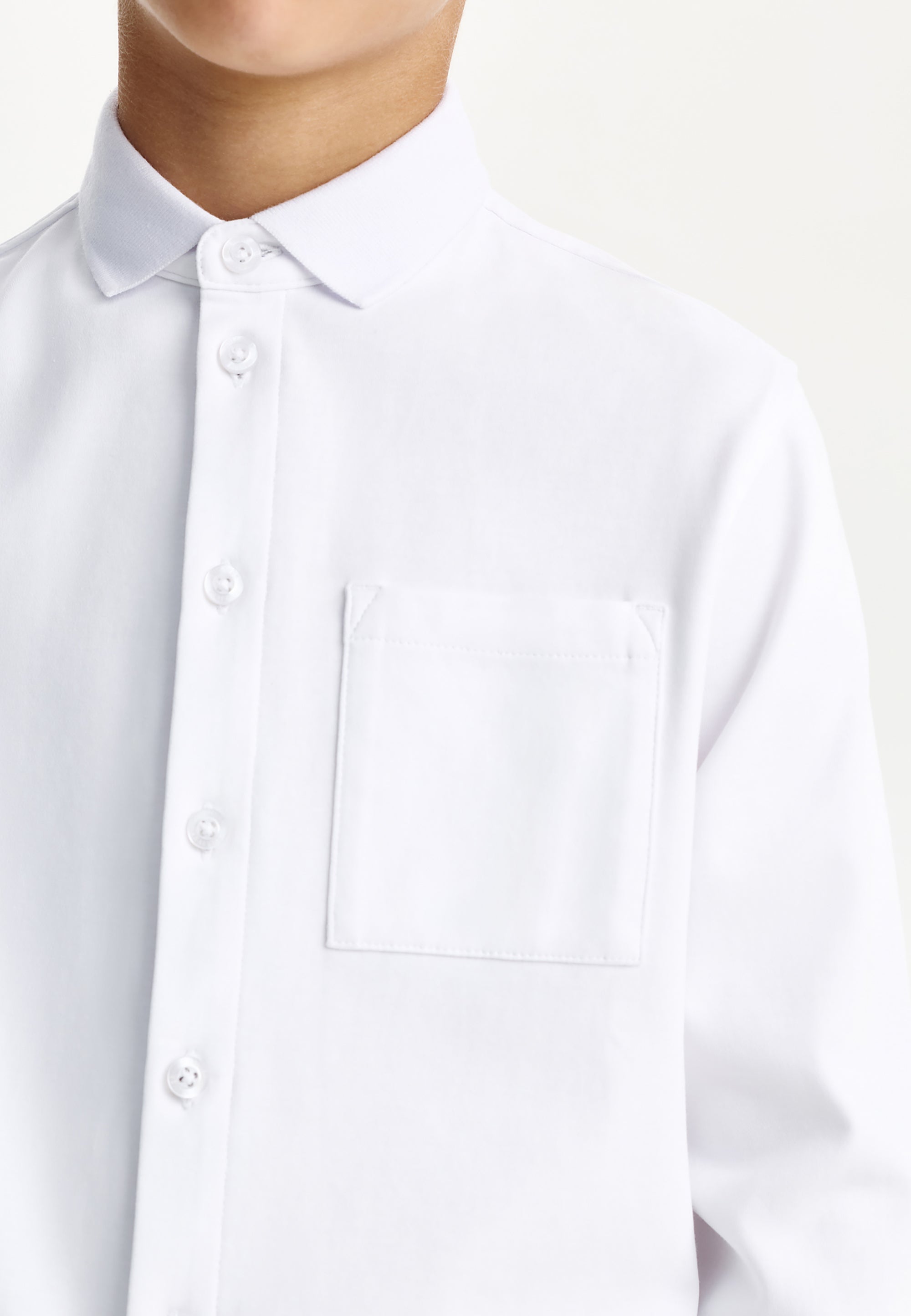Бялата трикотажна риза с дълъг ръкав е най-добрият вариант за елегантни училищни визии за момчето. Ризата е изработена от мек, гладък и приятен на допир памучен интерлок. Класическата кройка, правата форма (regular fit), пришитият джоб и закопчаването с копчета превръщат ризата в еталон за стилна и комфортна базова дреха. Както за тържествени събития, така и за всеки ден, бялата трикотажна риза е свежо решение за поддържане на деловия имидж на ученика.